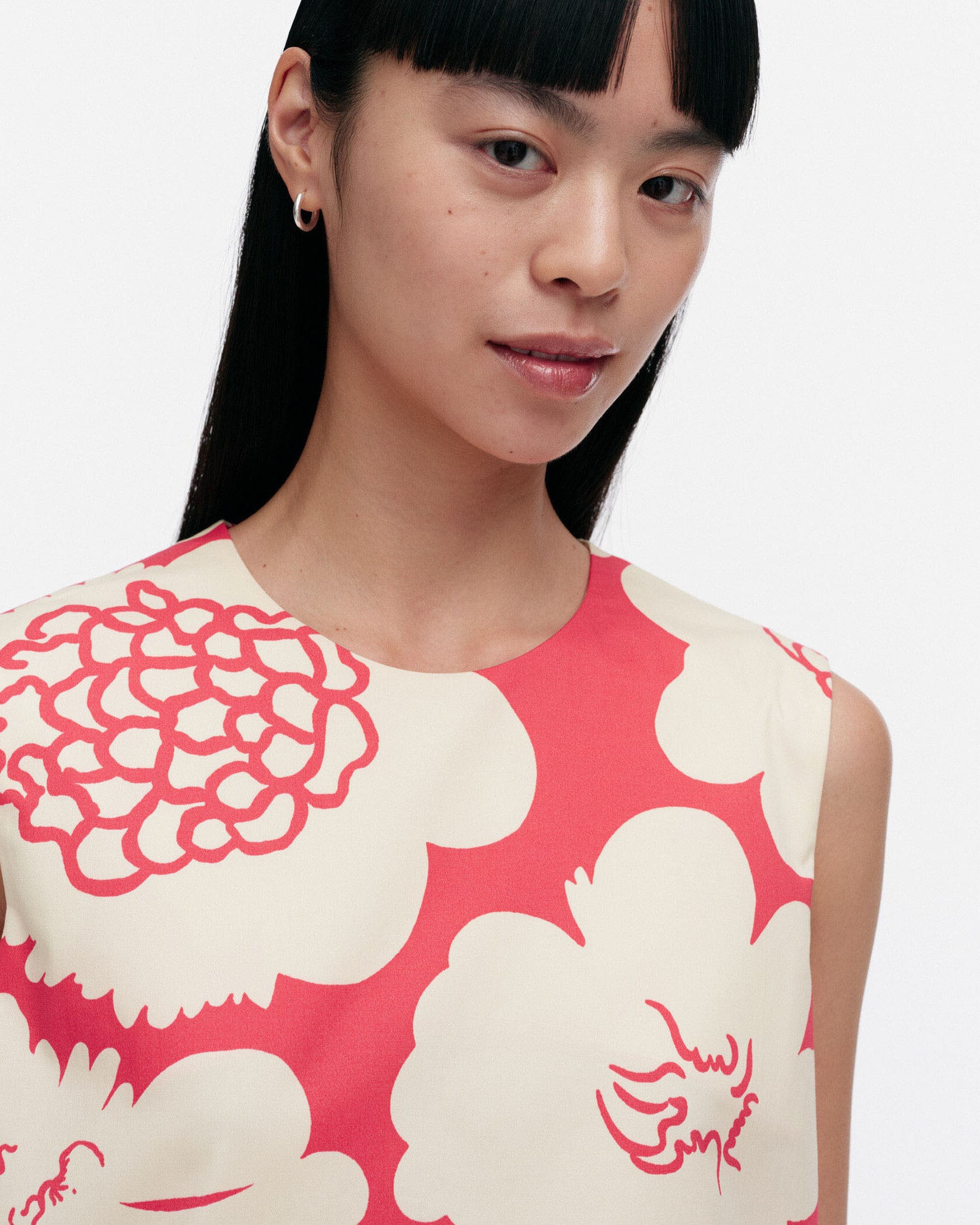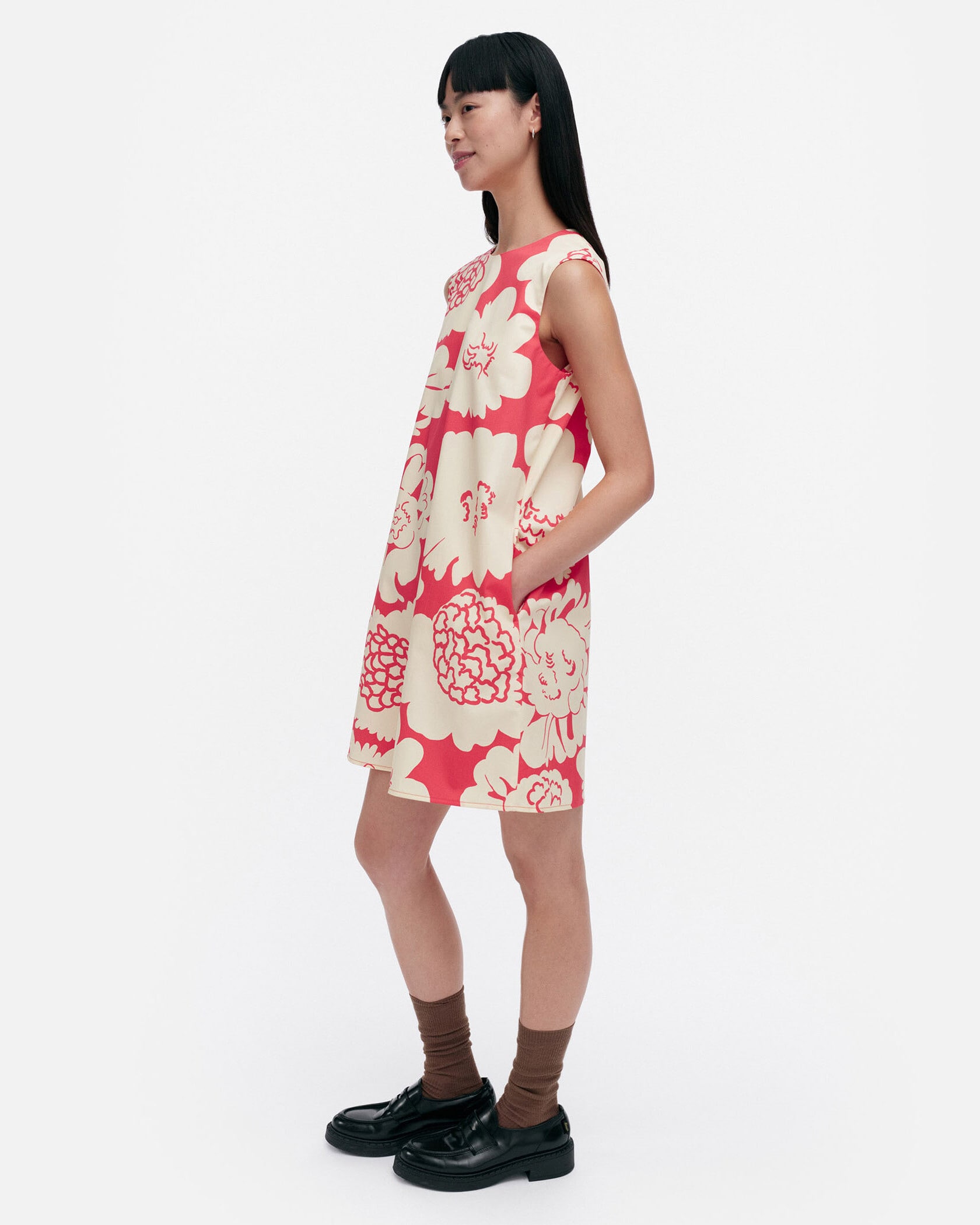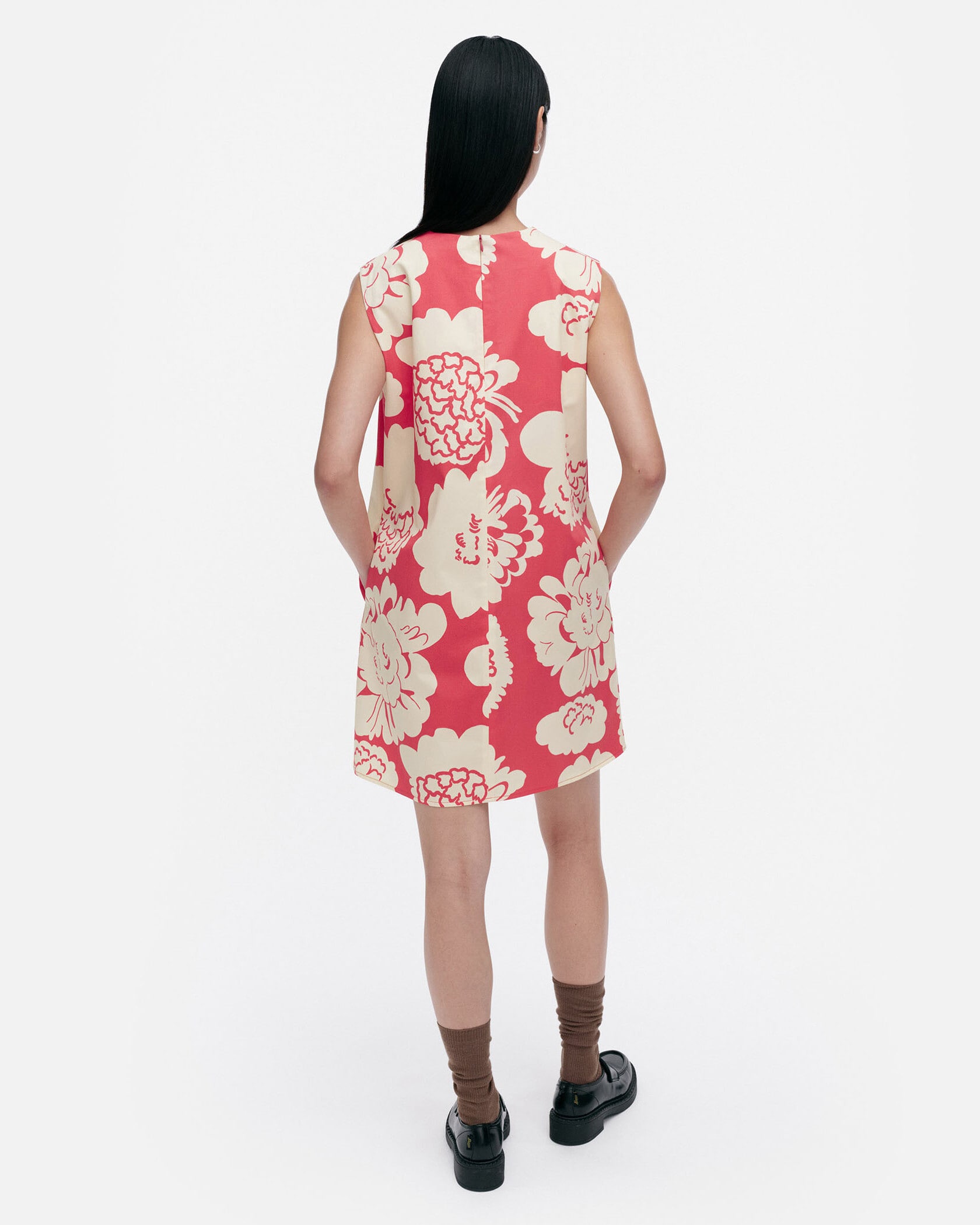 肩まわりはすっきりと、身頃はふんわりと膨らむようなシルエットに仕上げたワンピース。コットンにポリウレタンを織り交ぜ、伸縮性を持たせた素材を使用しています。大輪のピオニーが咲き誇るファブリックは、華やかさも満点。上からカーディガンやジャケットなどを羽織るスタイルにも活躍します。
