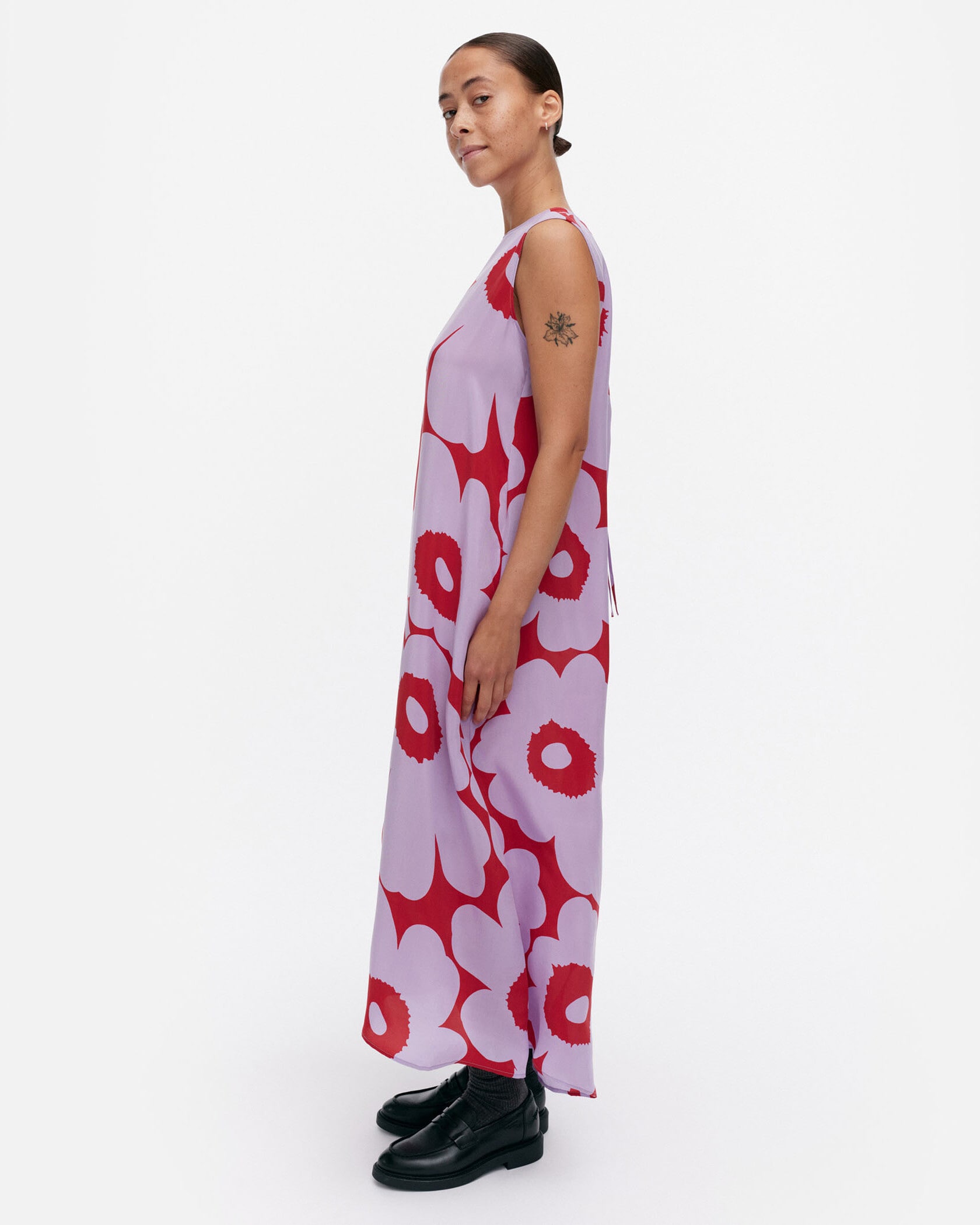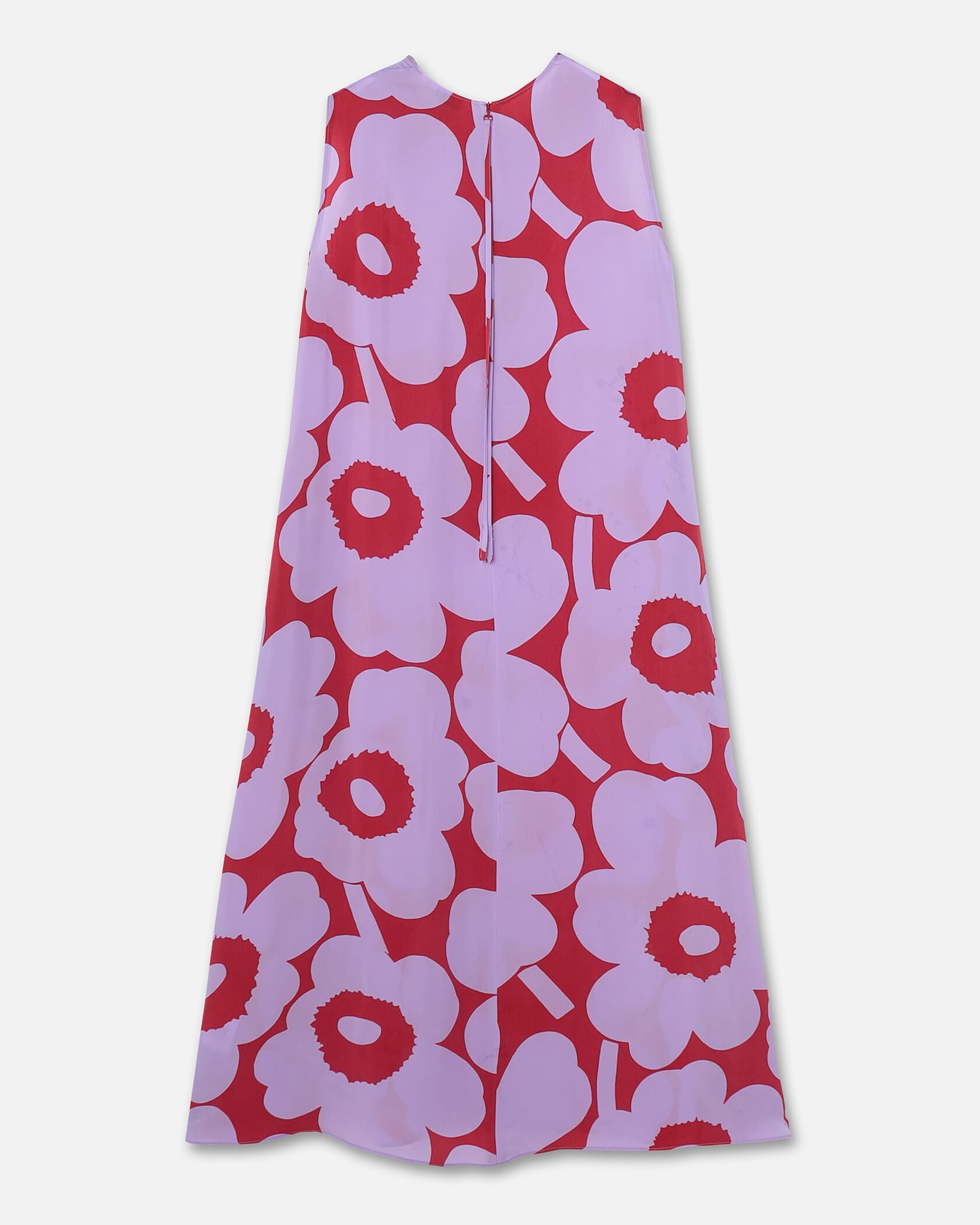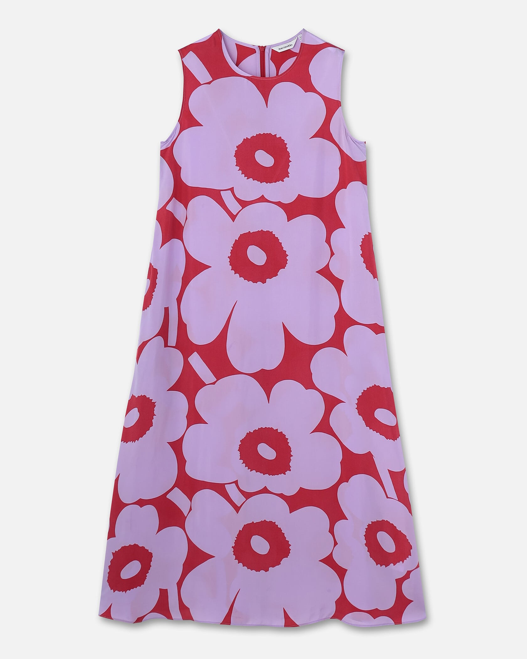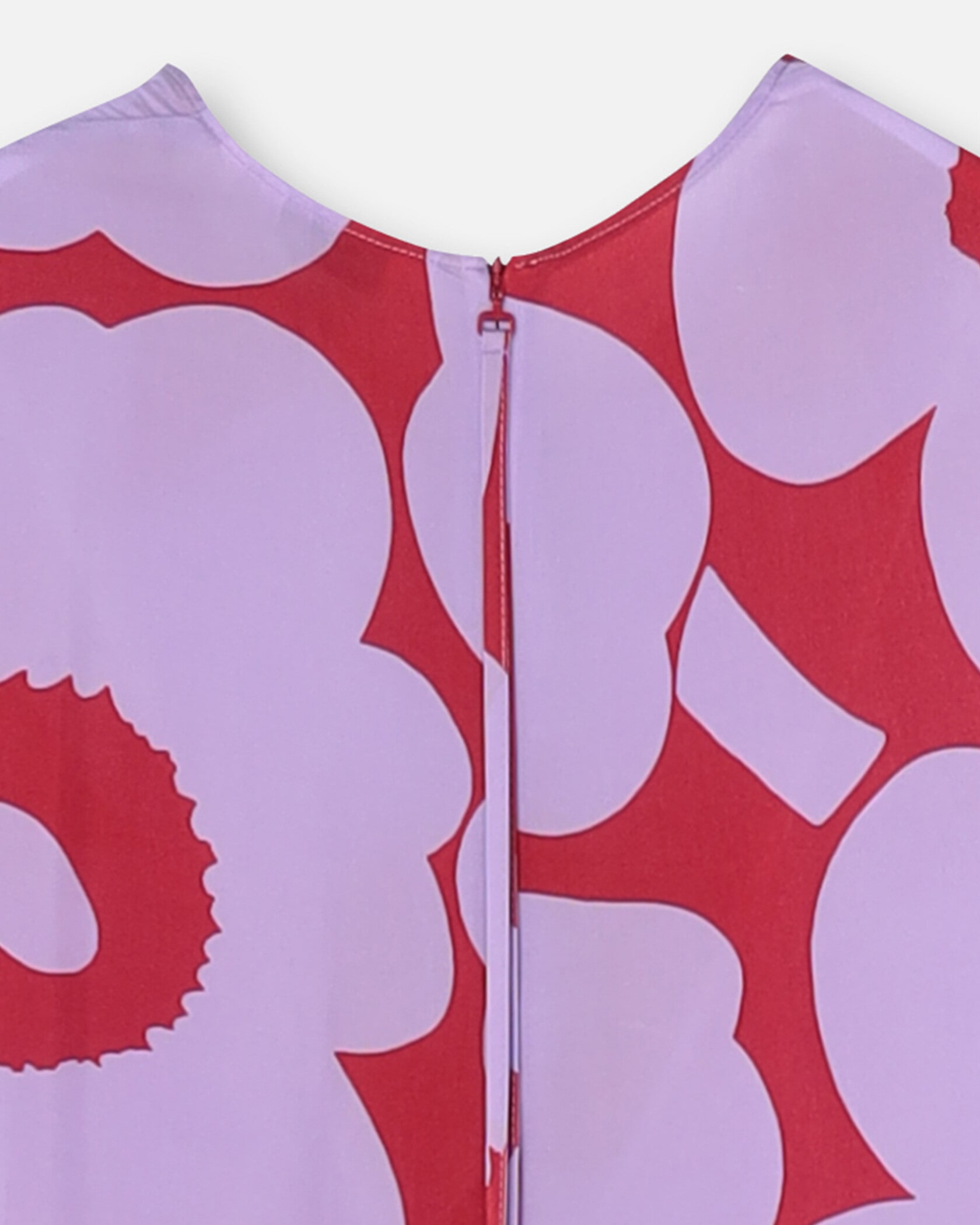 大胆かつ鮮やかな色使いで視線を誘うUnikko柄のワンピース。滑らかな落ち感のあるキュプラ素材で、綺麗なドレープを描き出す1点です。肩まわりはすっきりとしており、ジャケットなどを羽織るスタイリングにも活躍。背面のジップに添えた長いストラップもモダンなアクセントになっています。