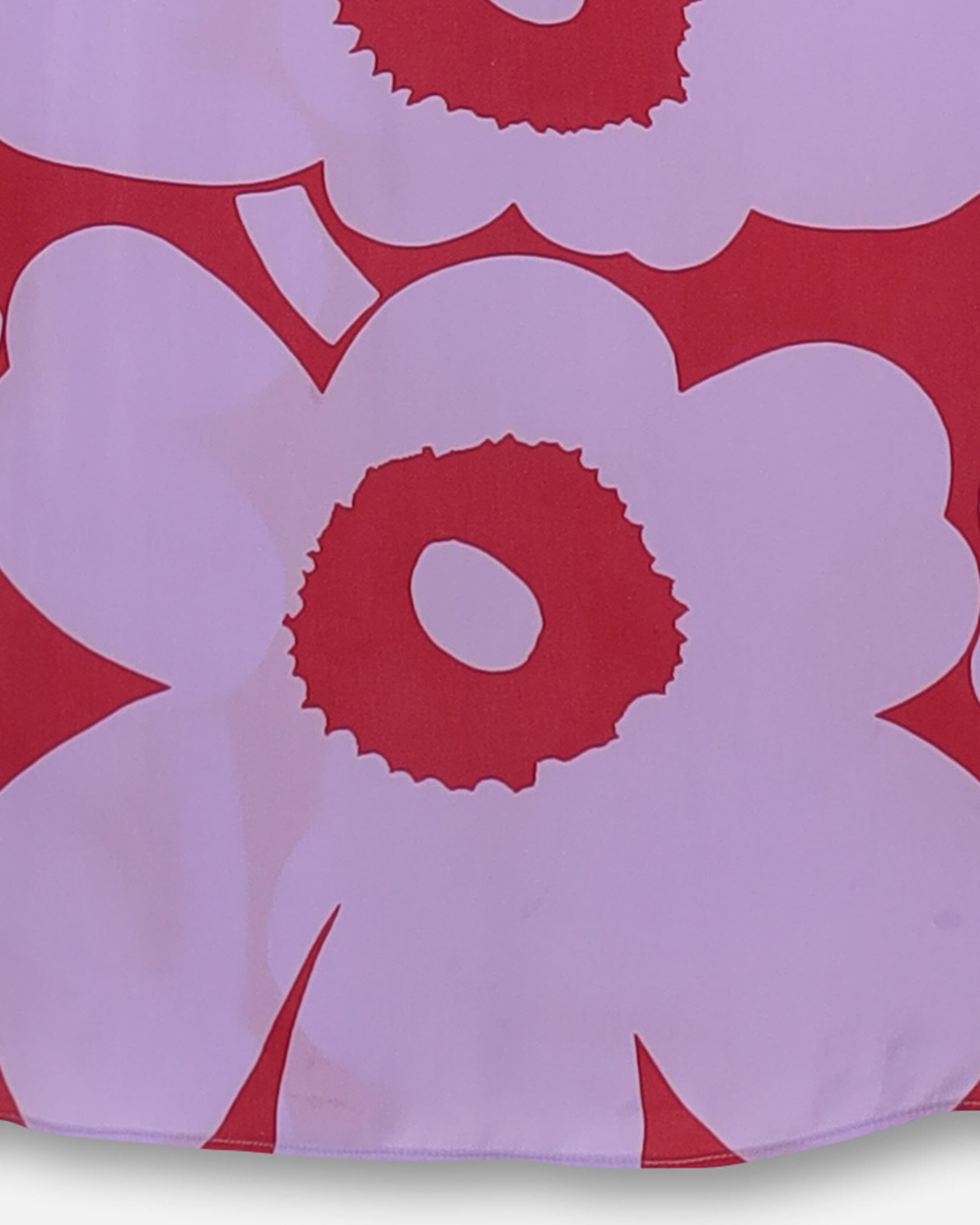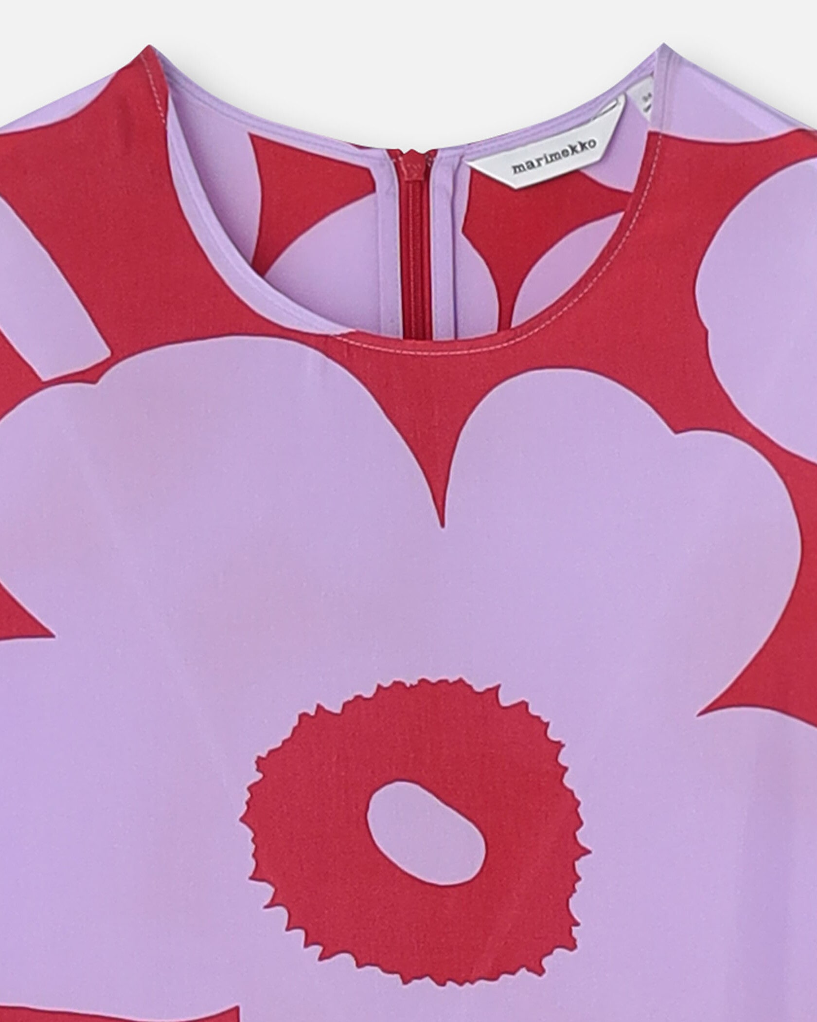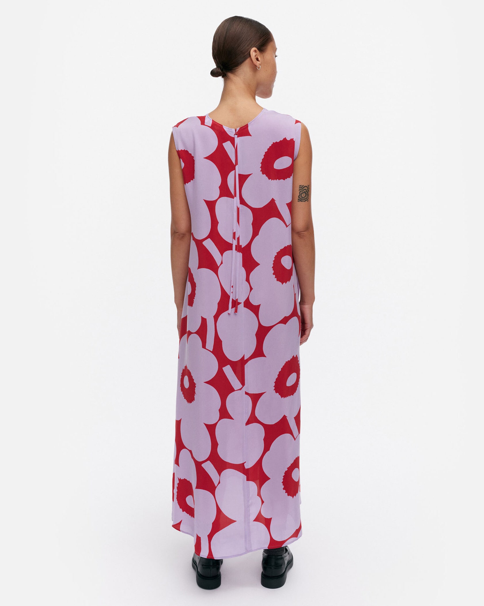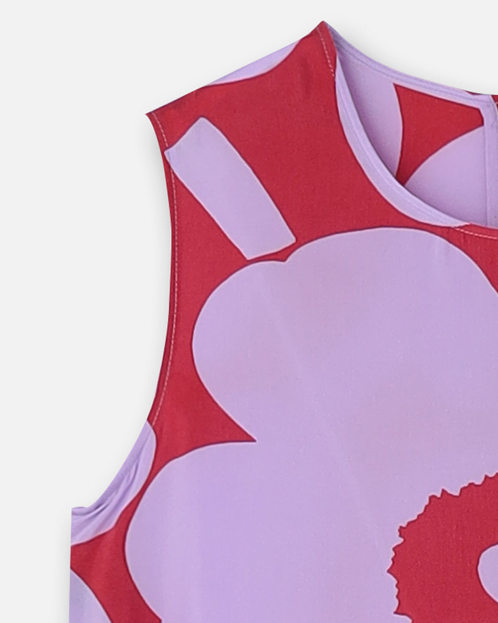 大胆かつ鮮やかな色使いで視線を誘うUnikko柄のワンピース。滑らかな落ち感のあるキュプラ素材で、綺麗なドレープを描き出す1点です。肩まわりはすっきりとしており、ジャケットなどを羽織るスタイリングにも活躍。背面のジップに添えた長いストラップもモダンなアクセントになっています。