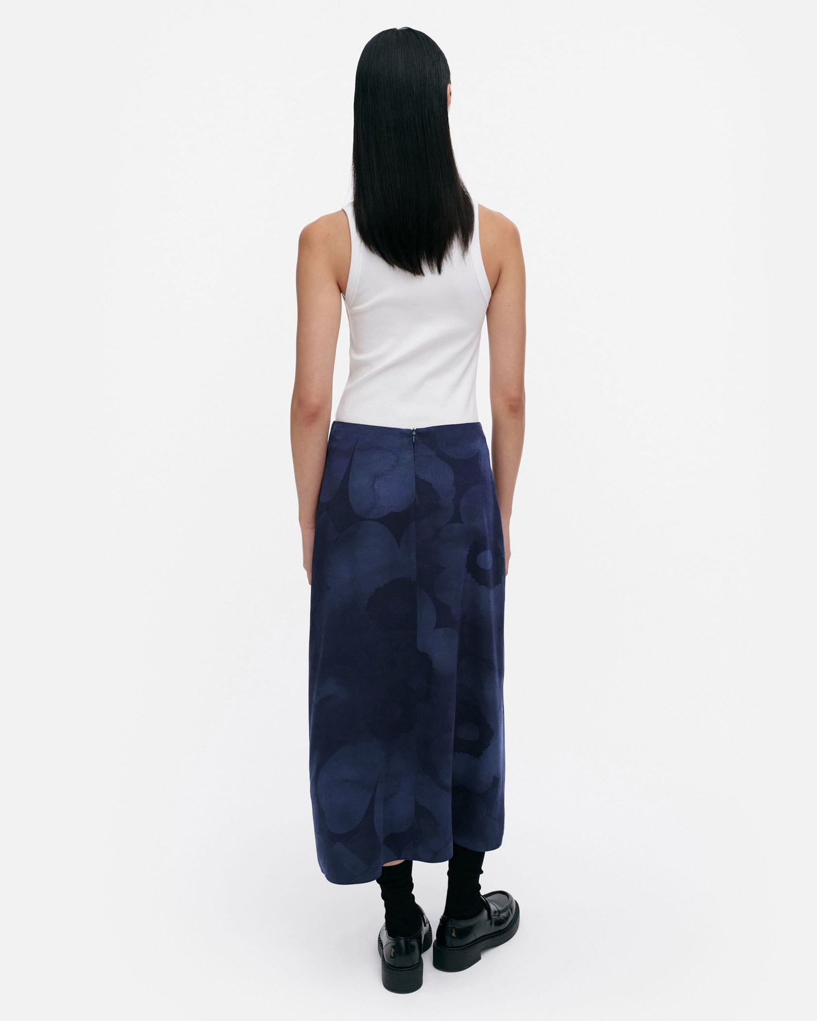 独特な陰影が印象的なUnikko柄のスカート。細身ながら裾に向かって緩やかに広がり、スッキリした印象と足さばきの良さを両立したシルエットです。着脱はバックファスナー式。カジュアル、きれいめ問わず様々なコーディネートに活躍し、同柄のブラウスを合わせるとセットアップスタイルも楽しめます。