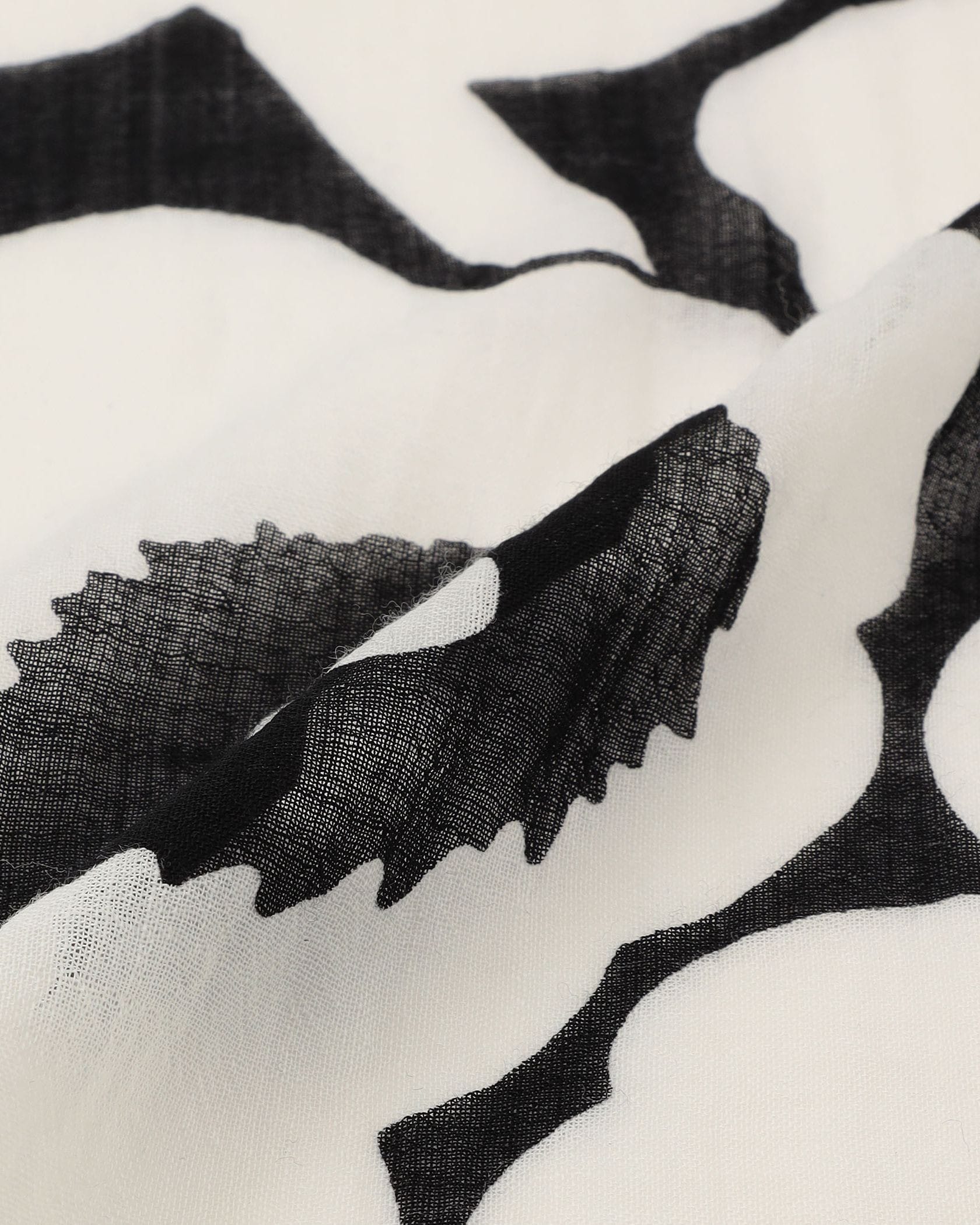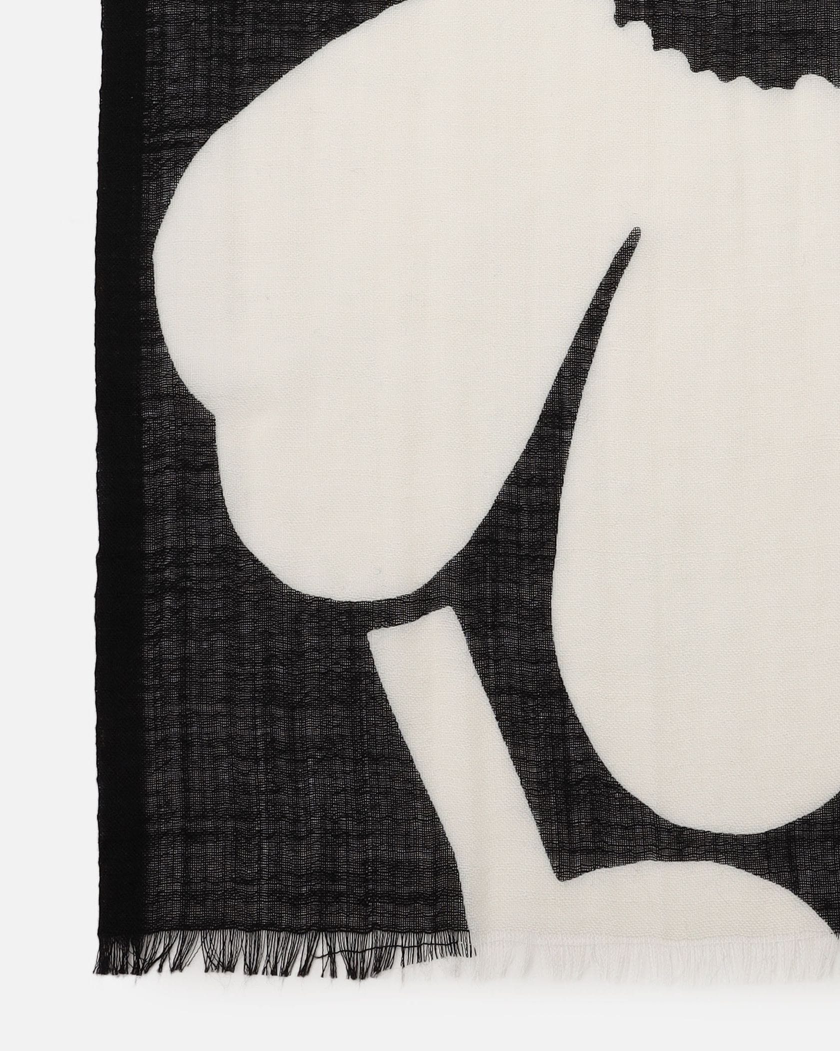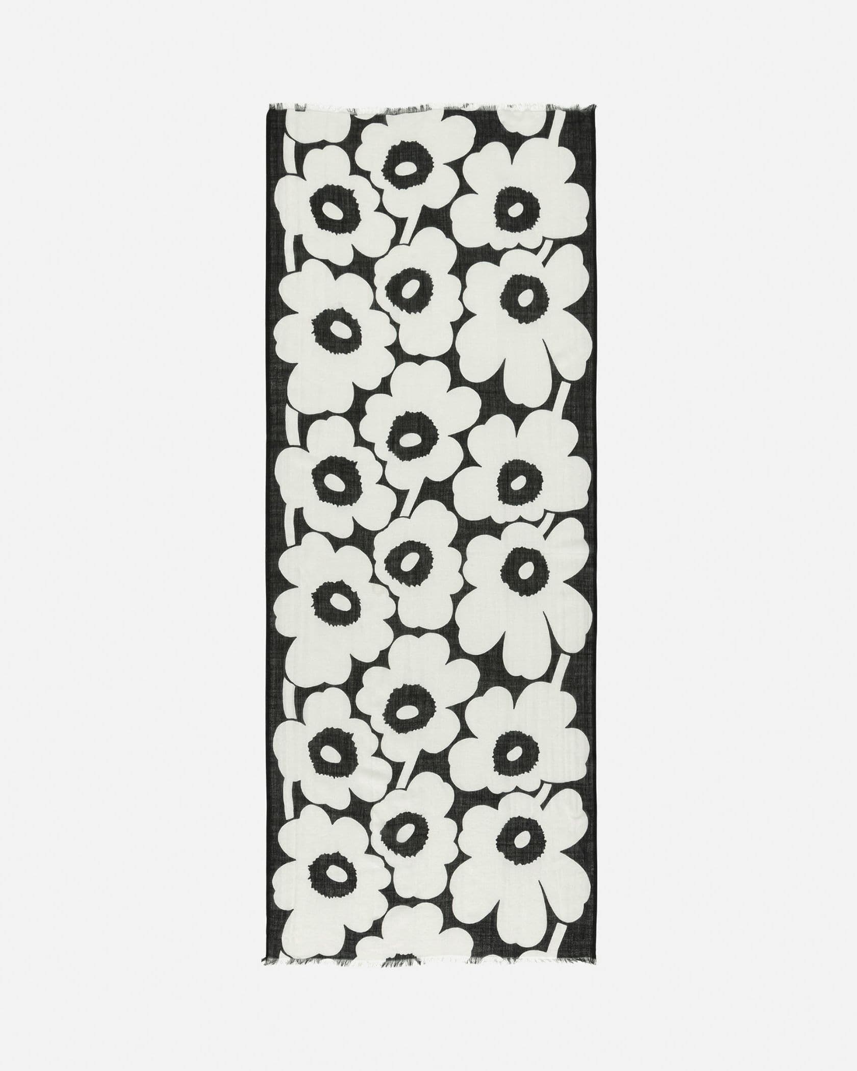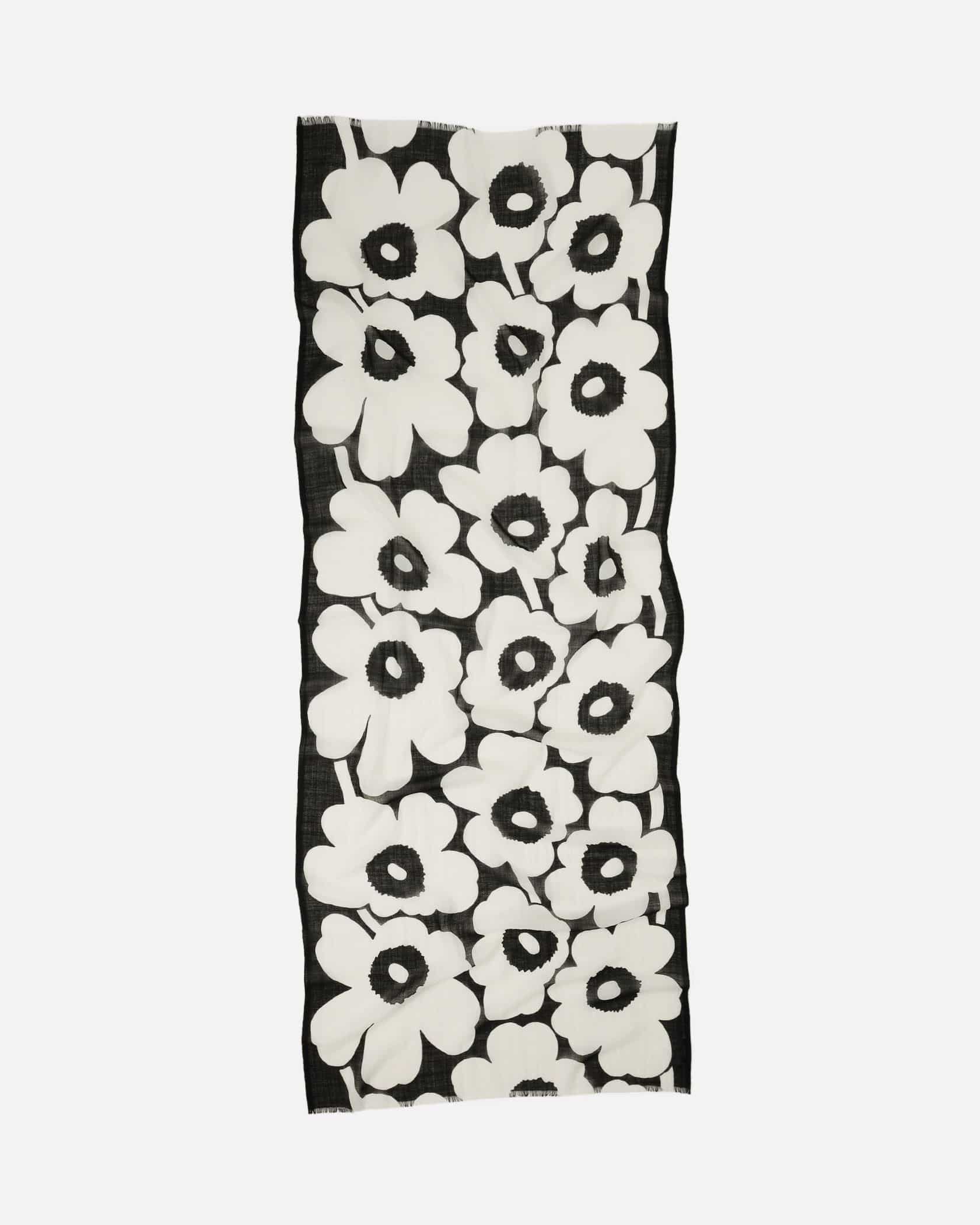 シックなモノトーンカラーで描いた、Marimekkoを象徴するUnikko柄のスカーフ。薄手で軽やかな毛100%素材により、幅広い季節にお使いいただけます。シルエットは大きめな長方形で、端部分はフリンジ仕立て。首元に巻いたり肩に掛けたりと、コーディネートの華やかなアクセントにおすすめのアイテムです。