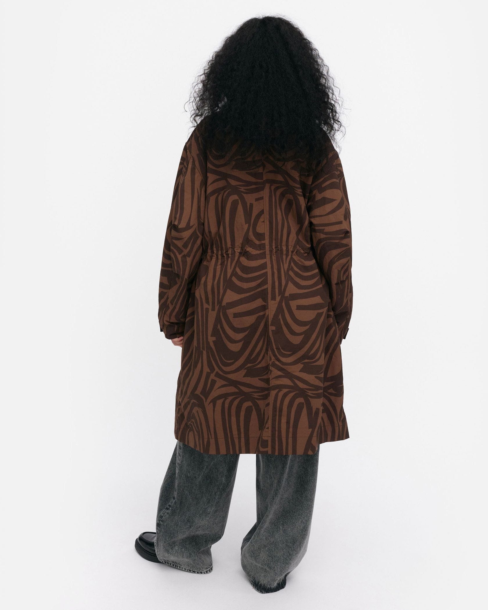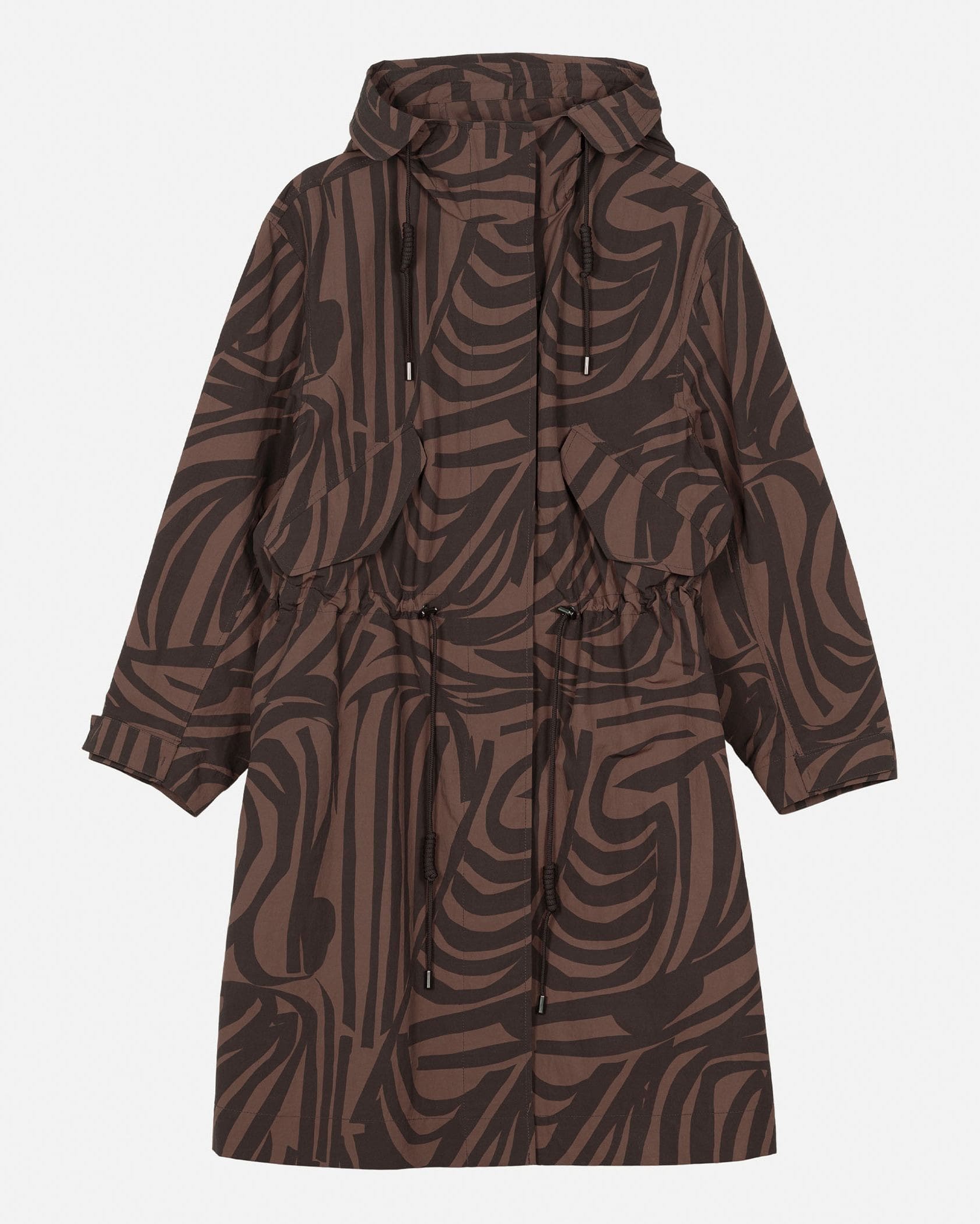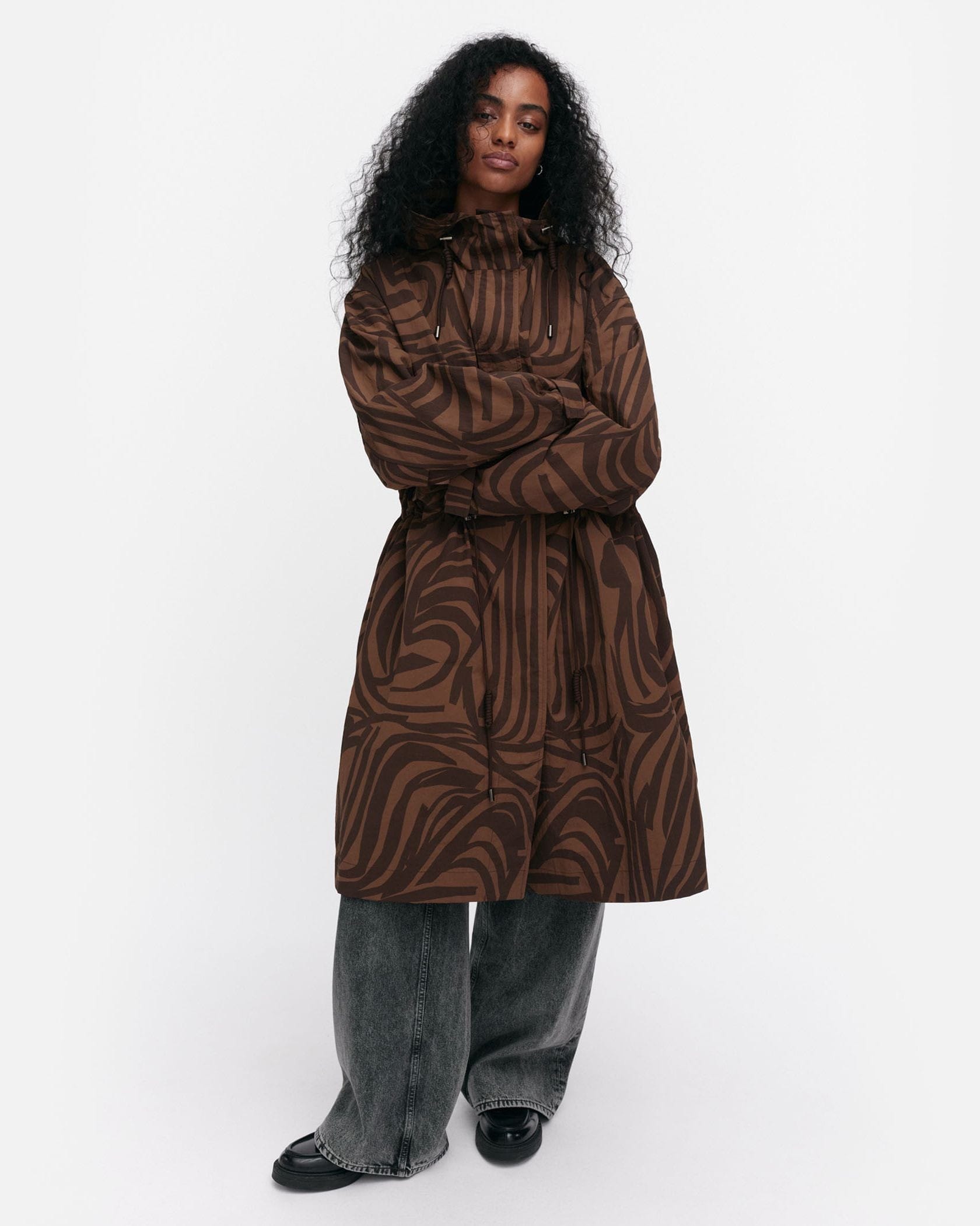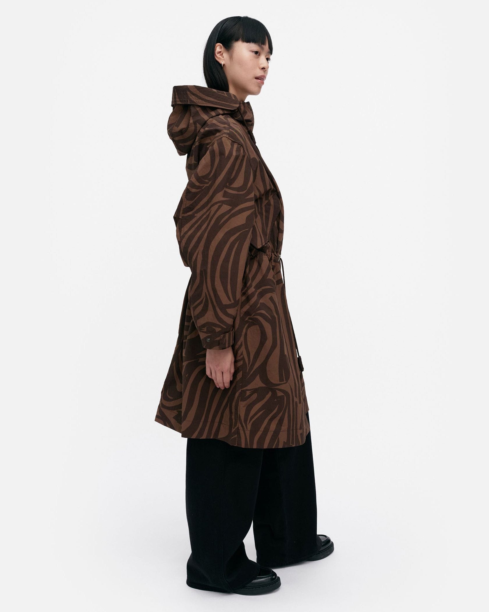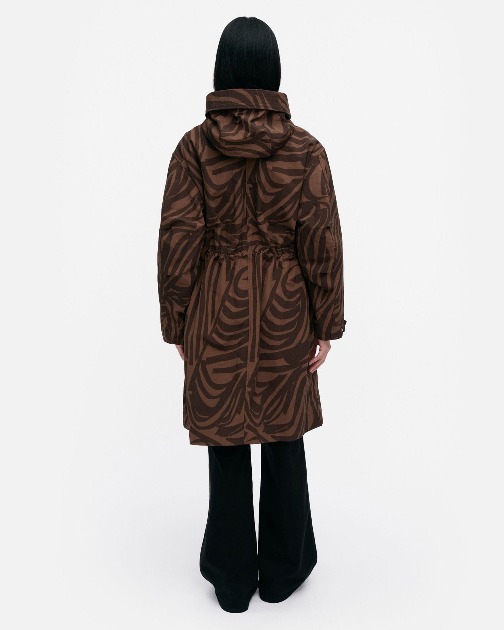 デザイナー Antti Kaleviが手掛けた、「いくつかのストライプ」を意味する「Jokuraita(ヨクライタ)」柄のフーデッドコートです。シックな配色ながら存在感を主張。軽量で取り扱いやすいナイロン素材を使用しています。ウエストのドローコードの絞り具合によって、シルエットに変化を付けられます。