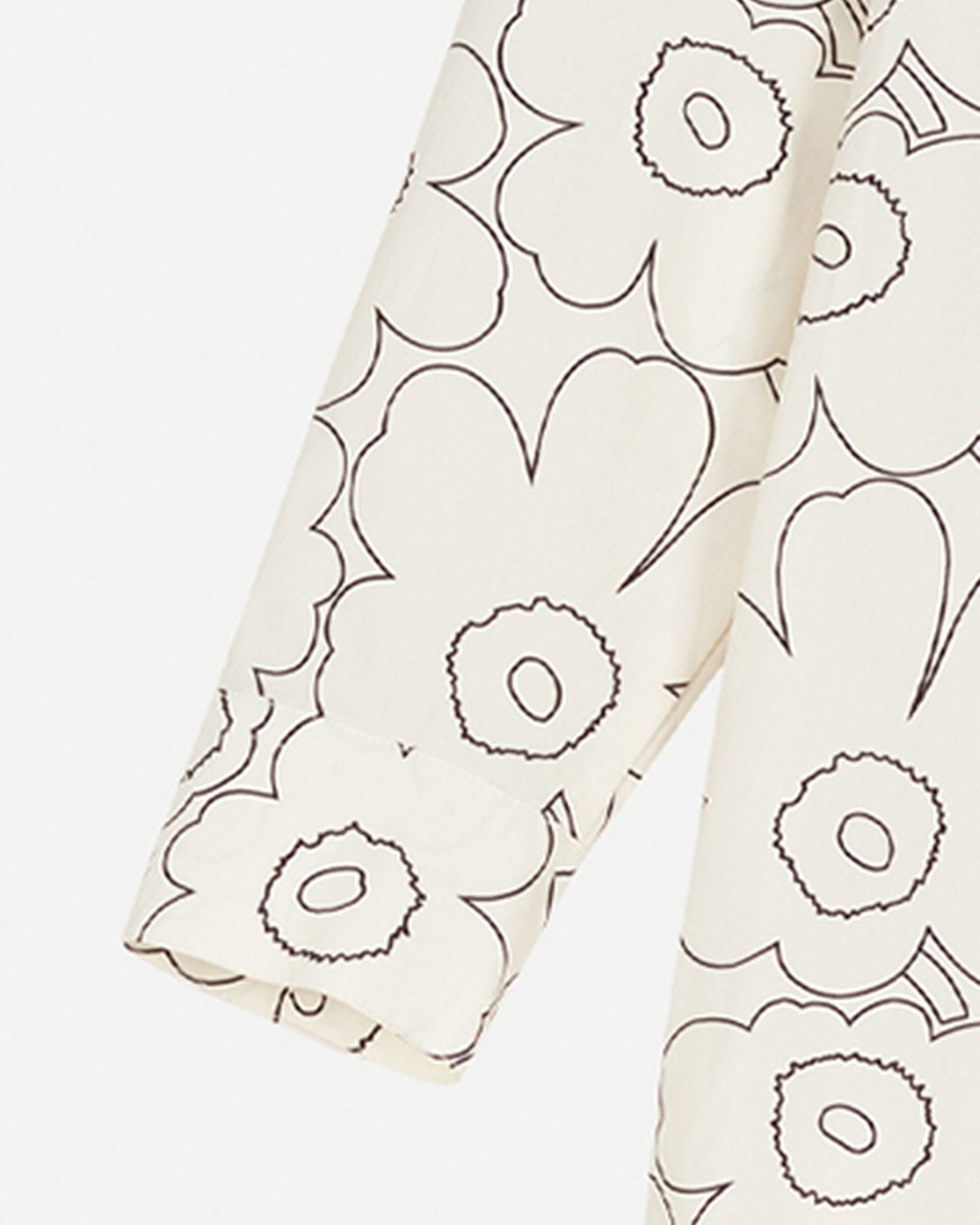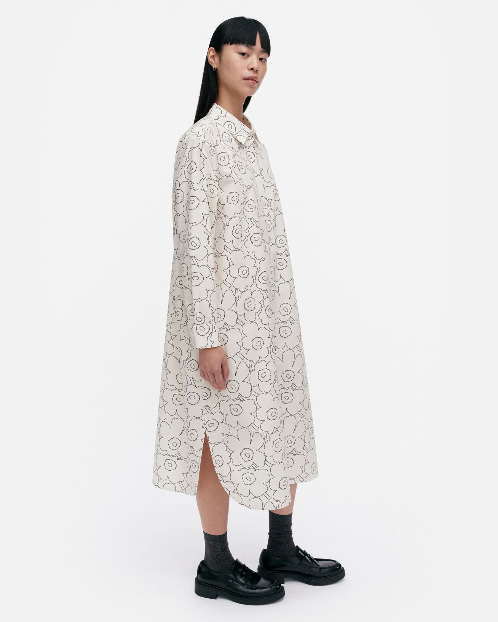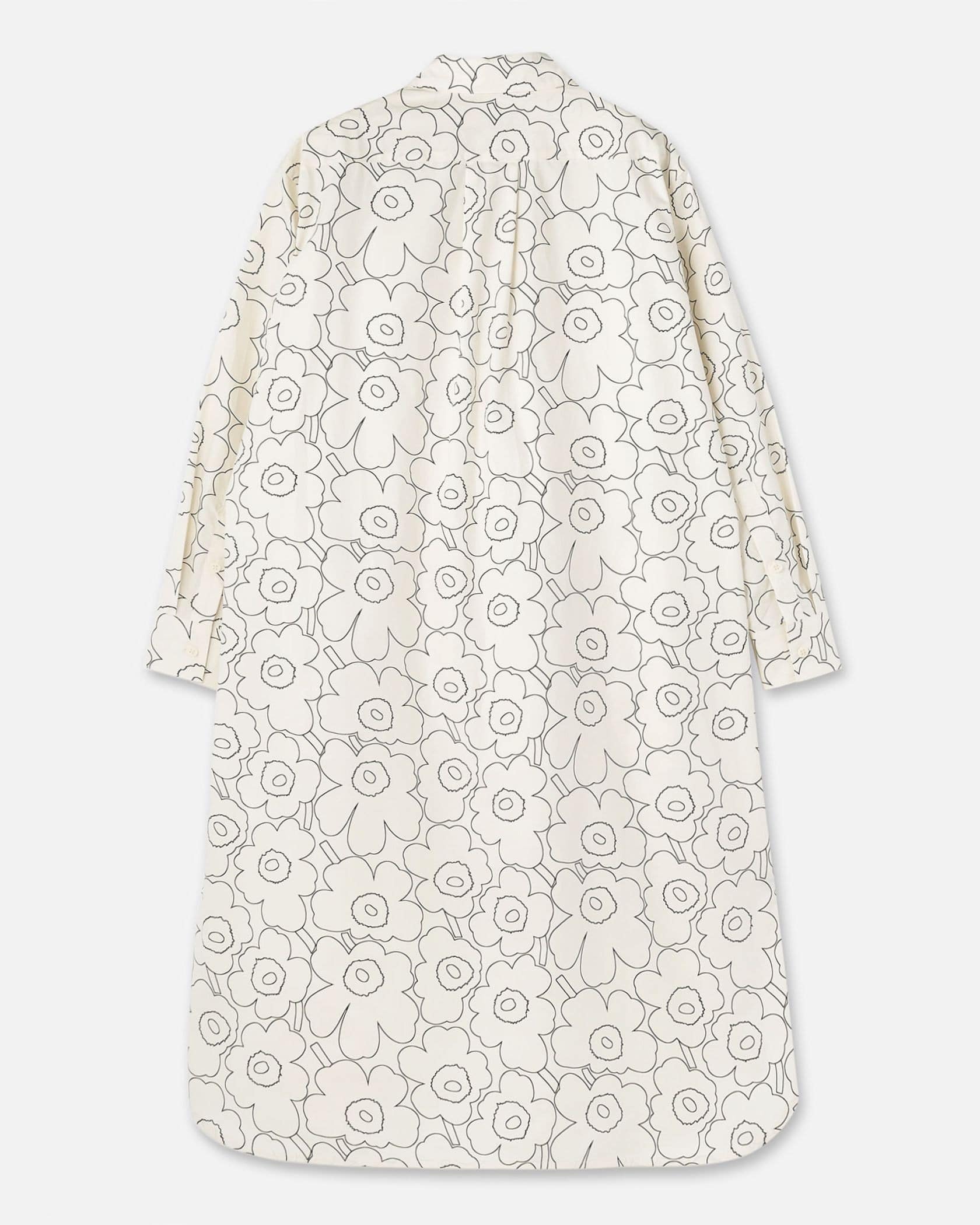 「ドローイングウニッコ」を意味する「Piirto Unikko(ピィイルト ウニッコ)」柄は、Maija Isolaがデザインを担当しました。ステンカラーのシャツワンピース。コットン100%素材で、オールシーズン着回し可能です。裾のサイドにはスリットを施し、足さばきの良さにも配慮しました。