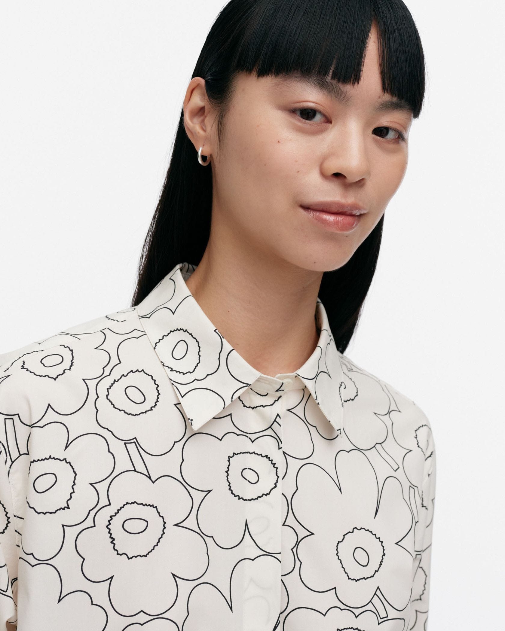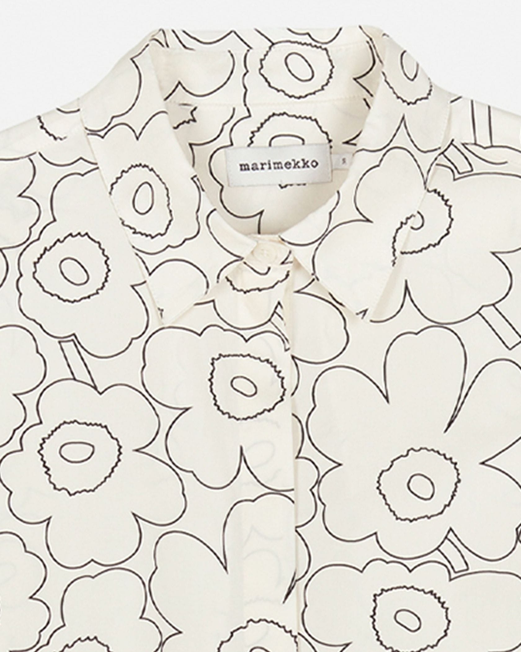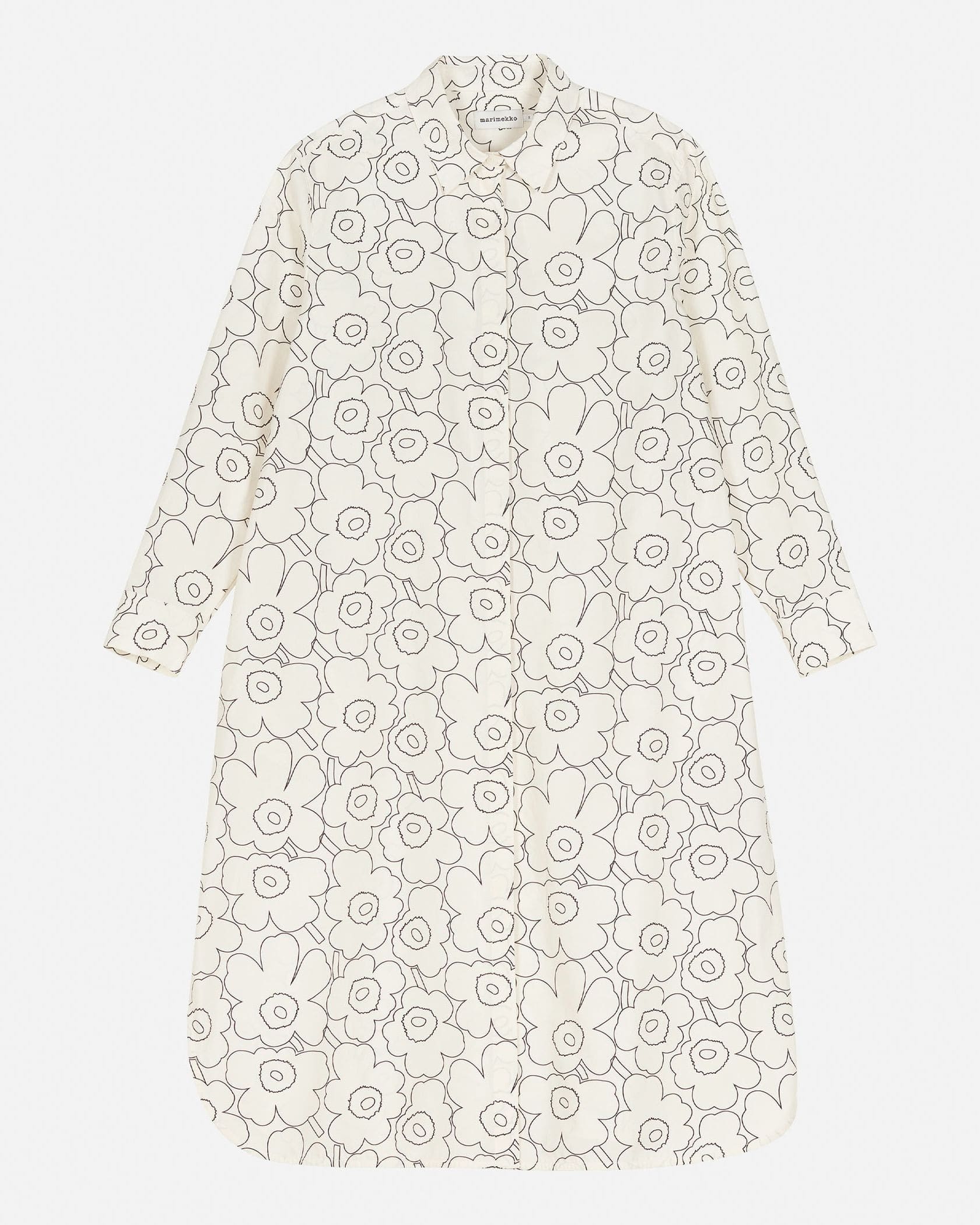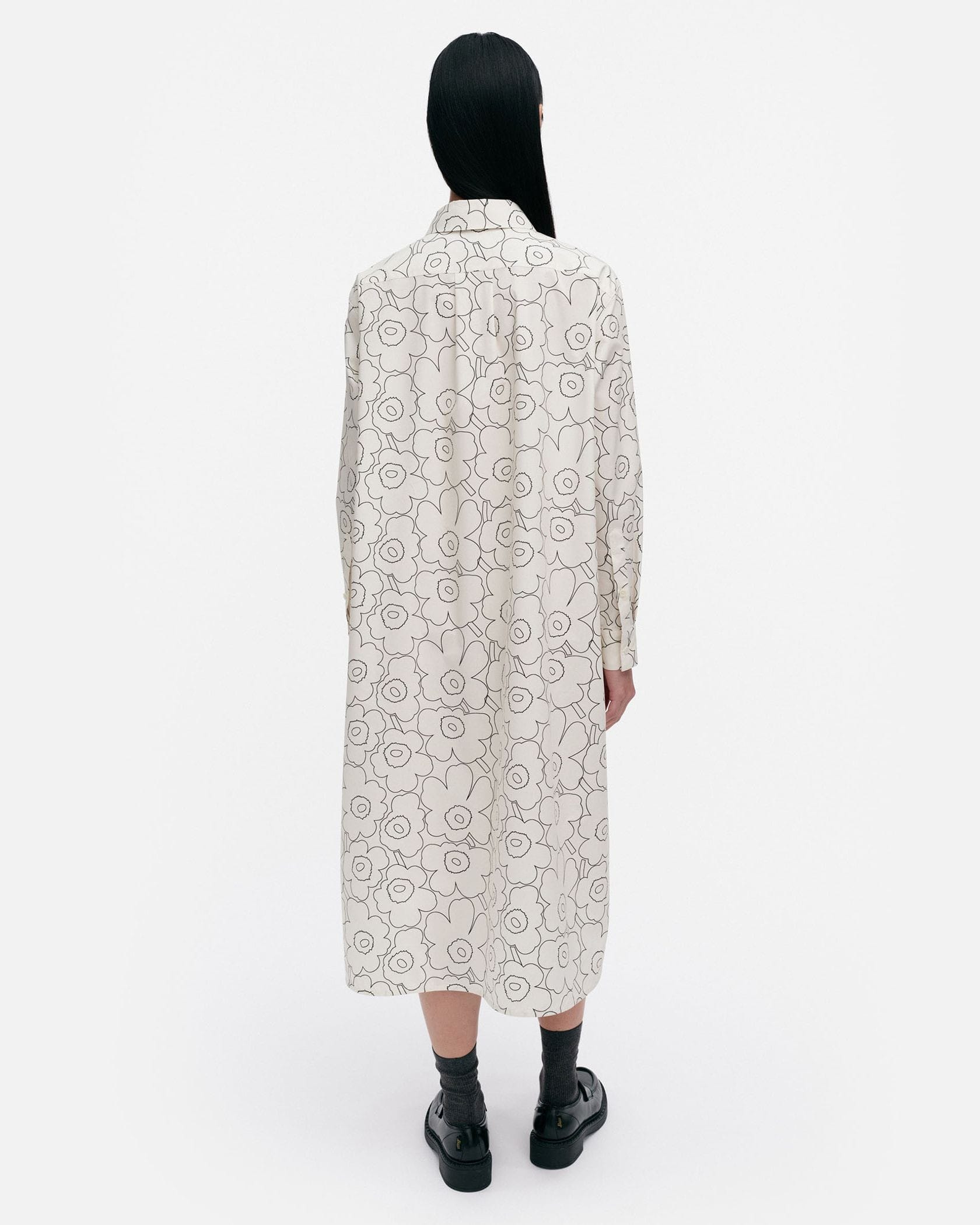「ドローイングウニッコ」を意味する「Piirto Unikko(ピィイルト ウニッコ)」柄は、Maija Isolaがデザインを担当しました。ステンカラーのシャツワンピース。コットン100%素材で、オールシーズン着回し可能です。裾のサイドにはスリットを施し、足さばきの良さにも配慮しました。
