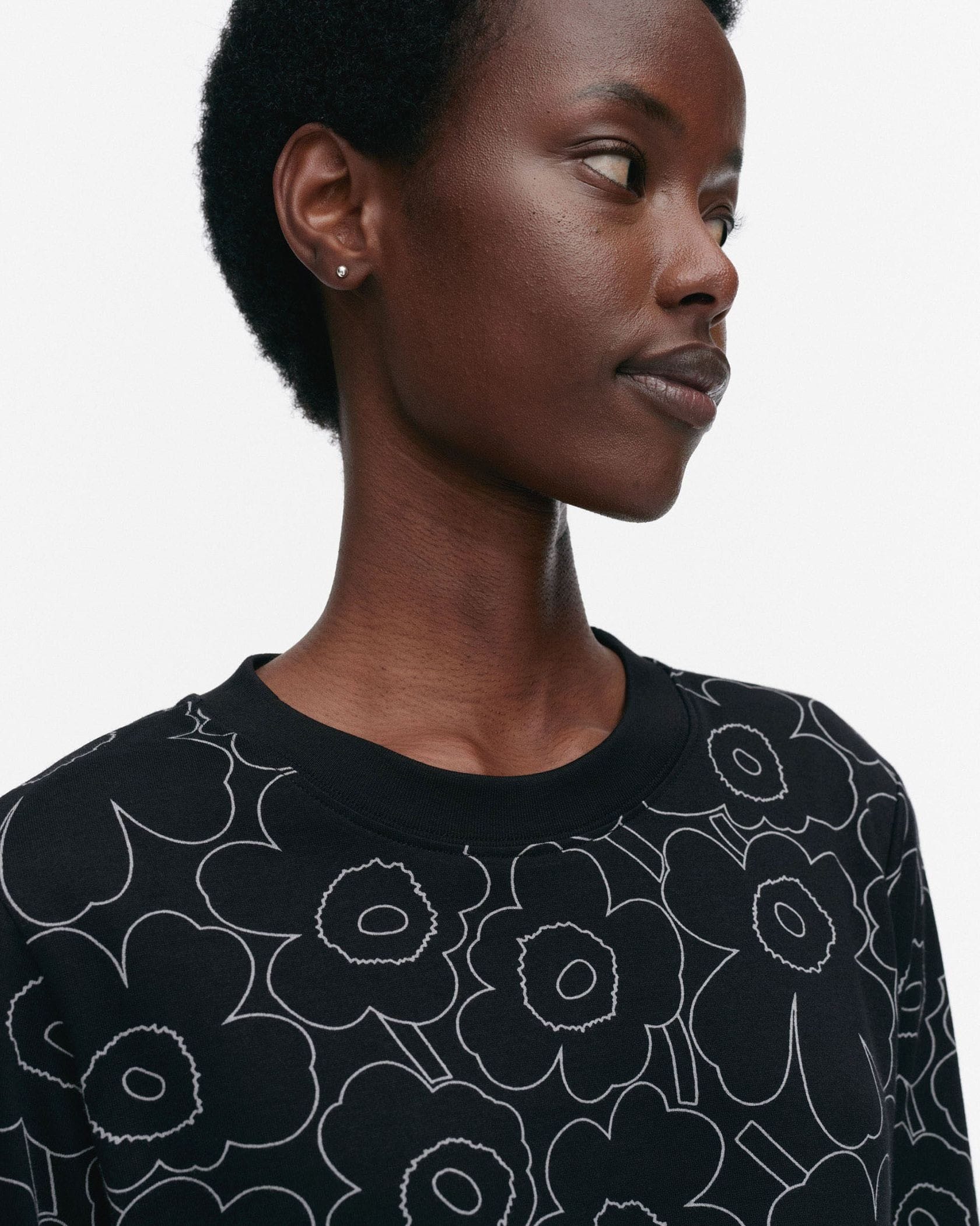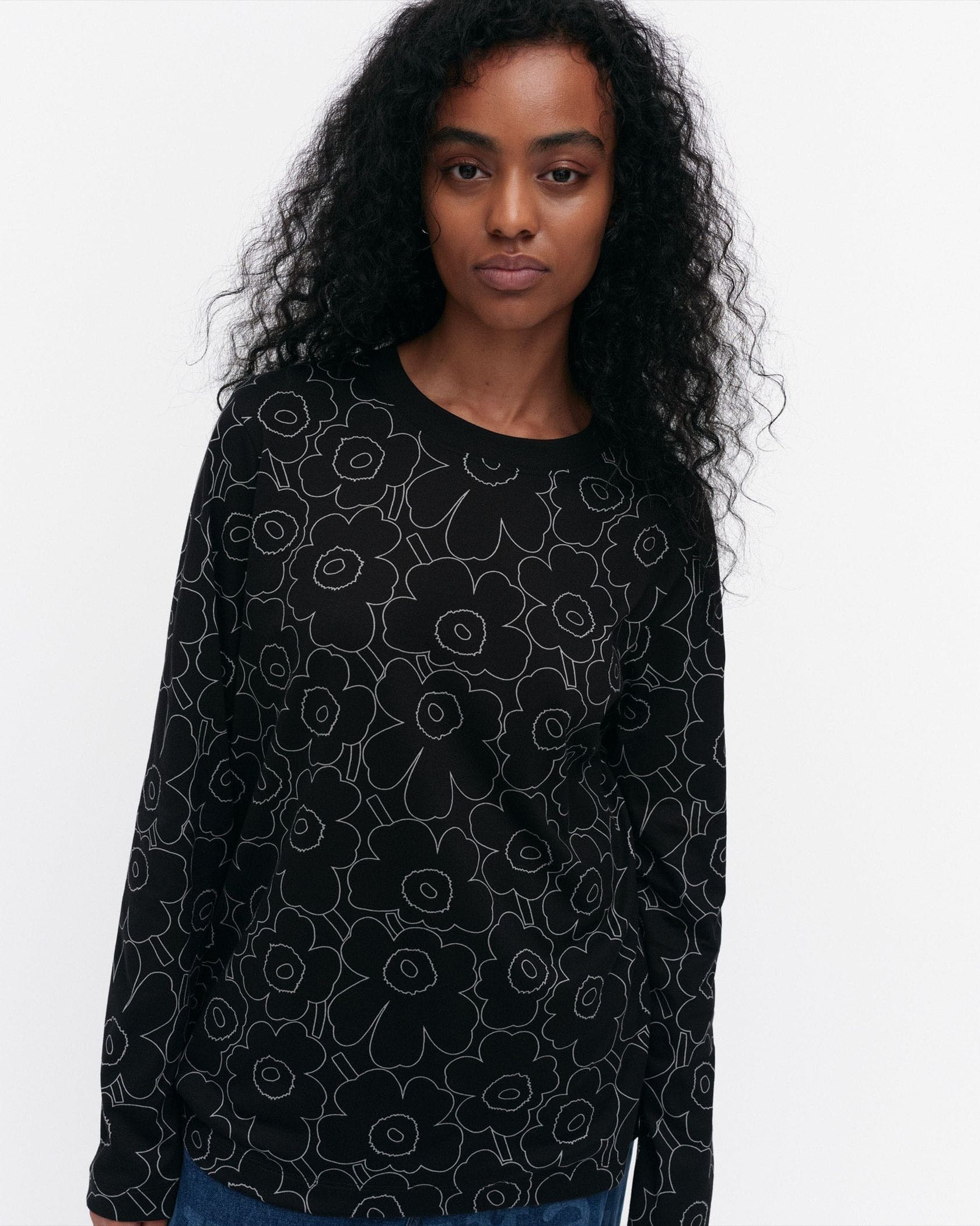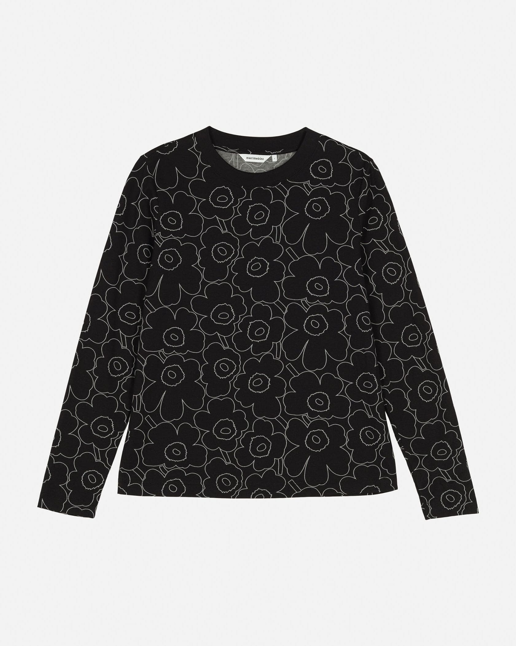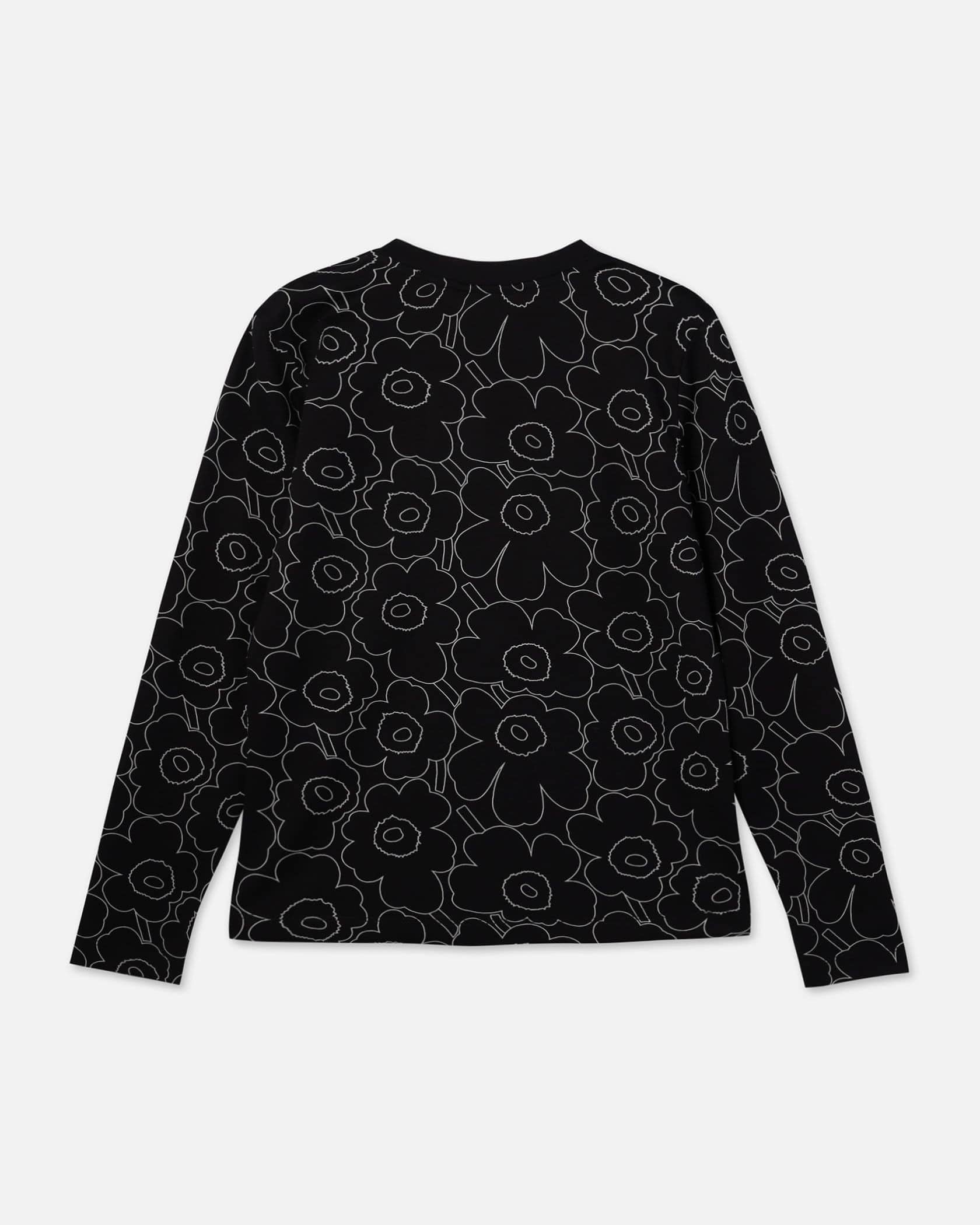 Marimekkoを代表するUnikko柄の総プリントが華やかなムードの長袖ラウンドネックブラックカットソー。フラワーモチーフをミニマルな白のラインで表現したモダンかつスタイリッシュなデザインが魅力。着こなしやすいリラックスフィットのシルエット。デイリーからお出かけまで幅広く活躍するアイテムです。