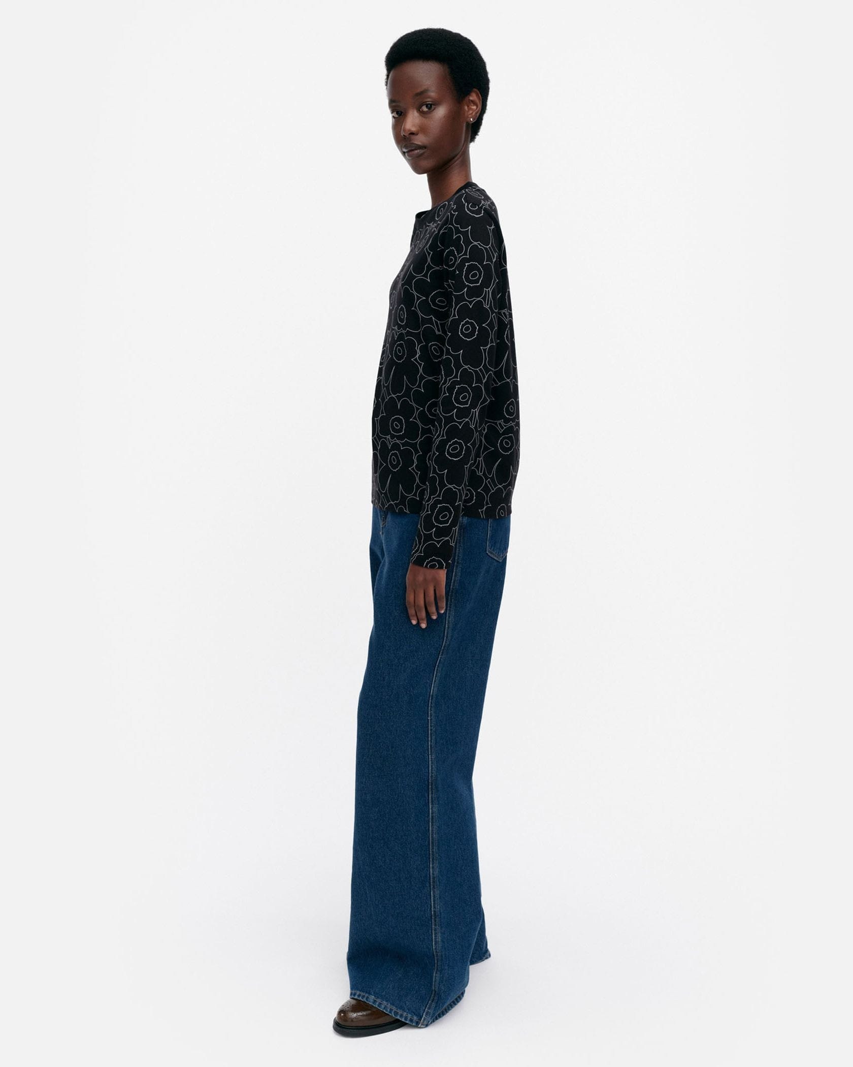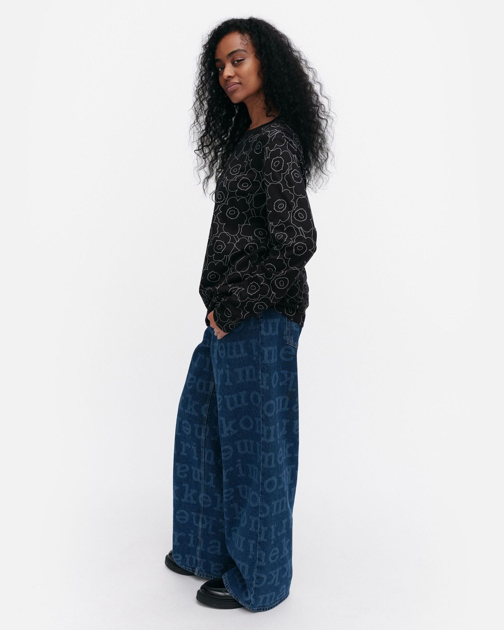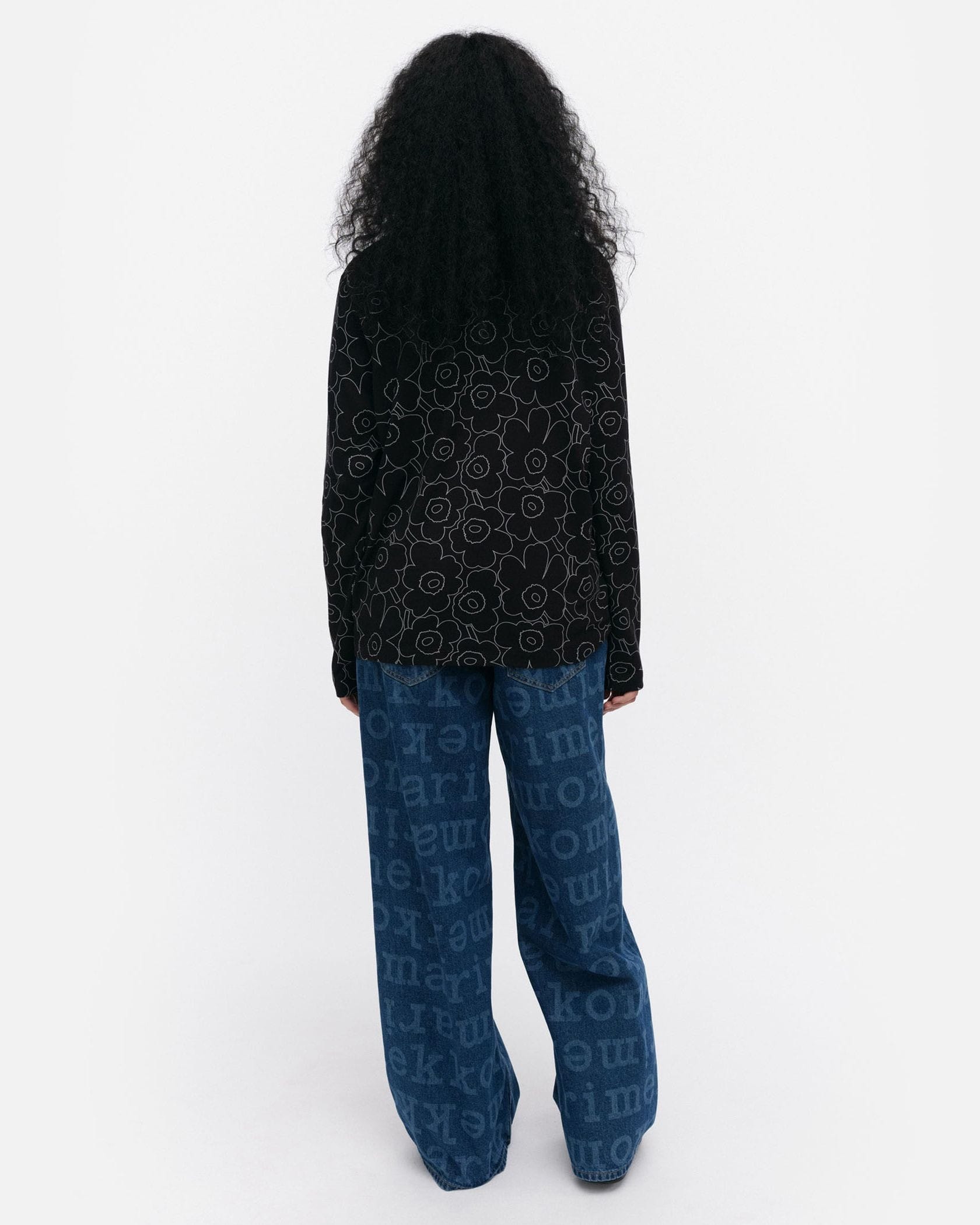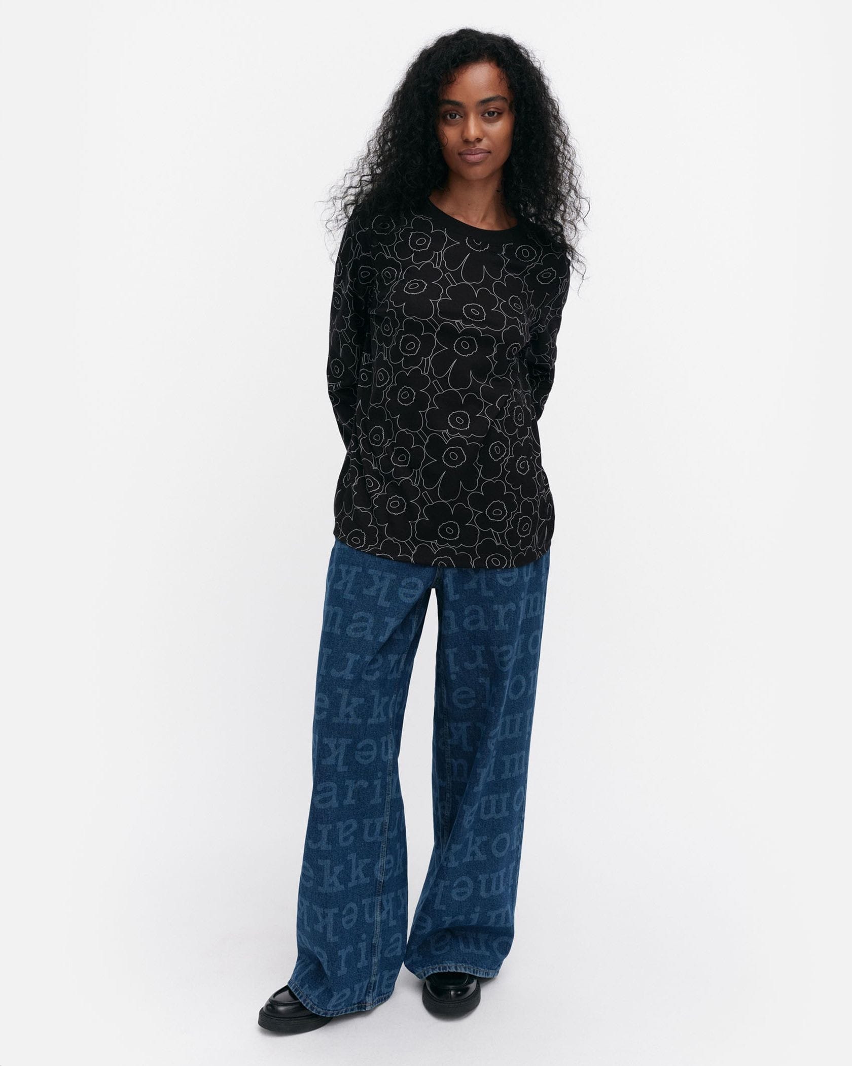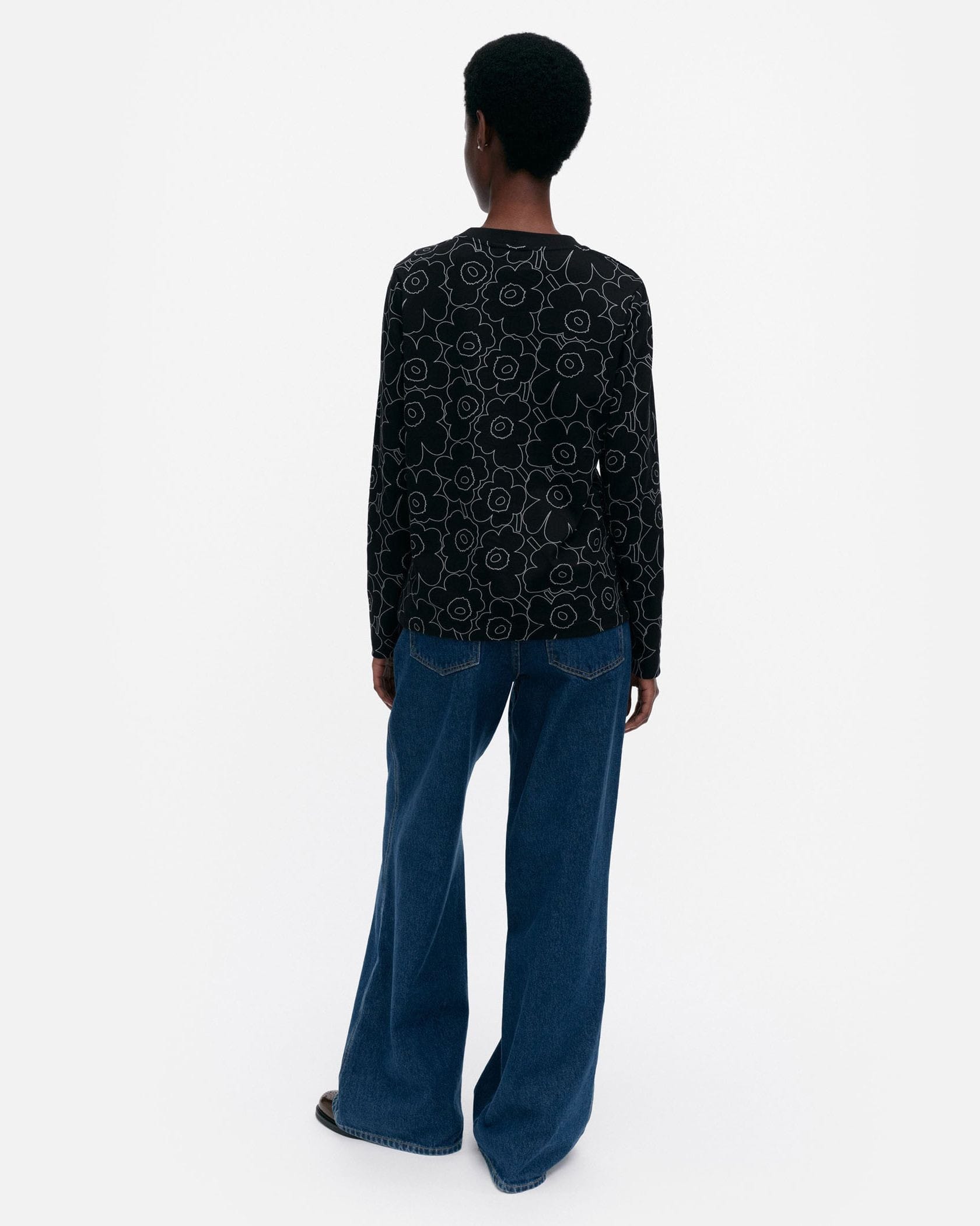 Marimekkoを代表するUnikko柄の総プリントが華やかなムードの長袖ラウンドネックブラックカットソー。フラワーモチーフをミニマルな白のラインで表現したモダンかつスタイリッシュなデザインが魅力。着こなしやすいリラックスフィットのシルエット。デイリーからお出かけまで幅広く活躍するアイテムです。