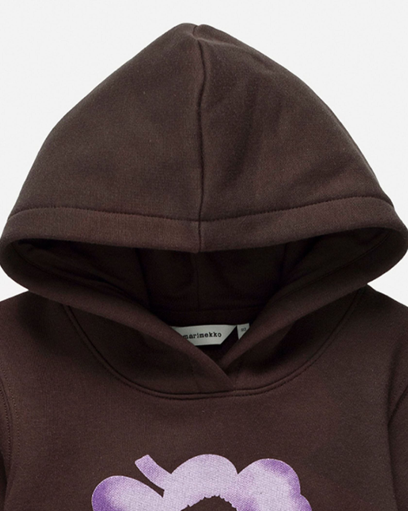 フロントにUnikko柄を配した、ほんのり大人っぽいフーディートップス。背中側は無地になっており、幅広いボトムとコーディネートしやすいのもポイントです。