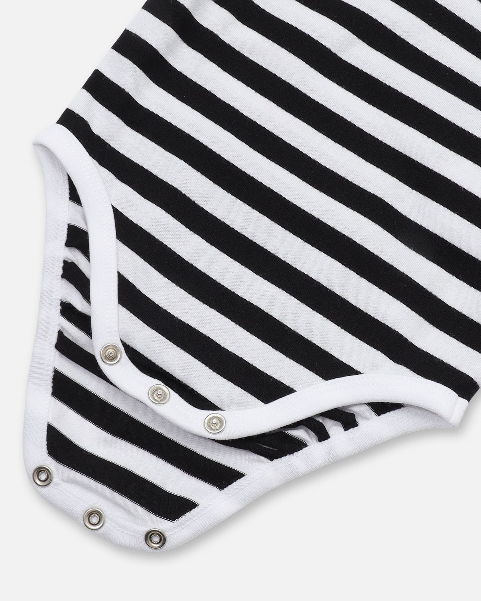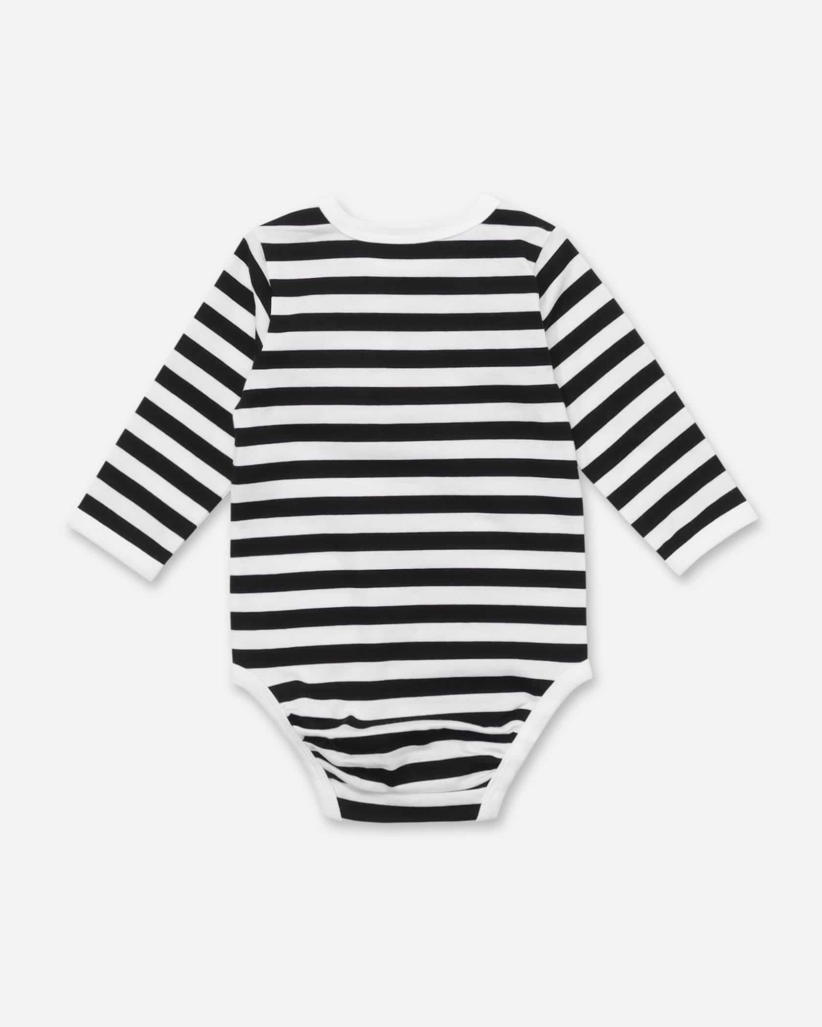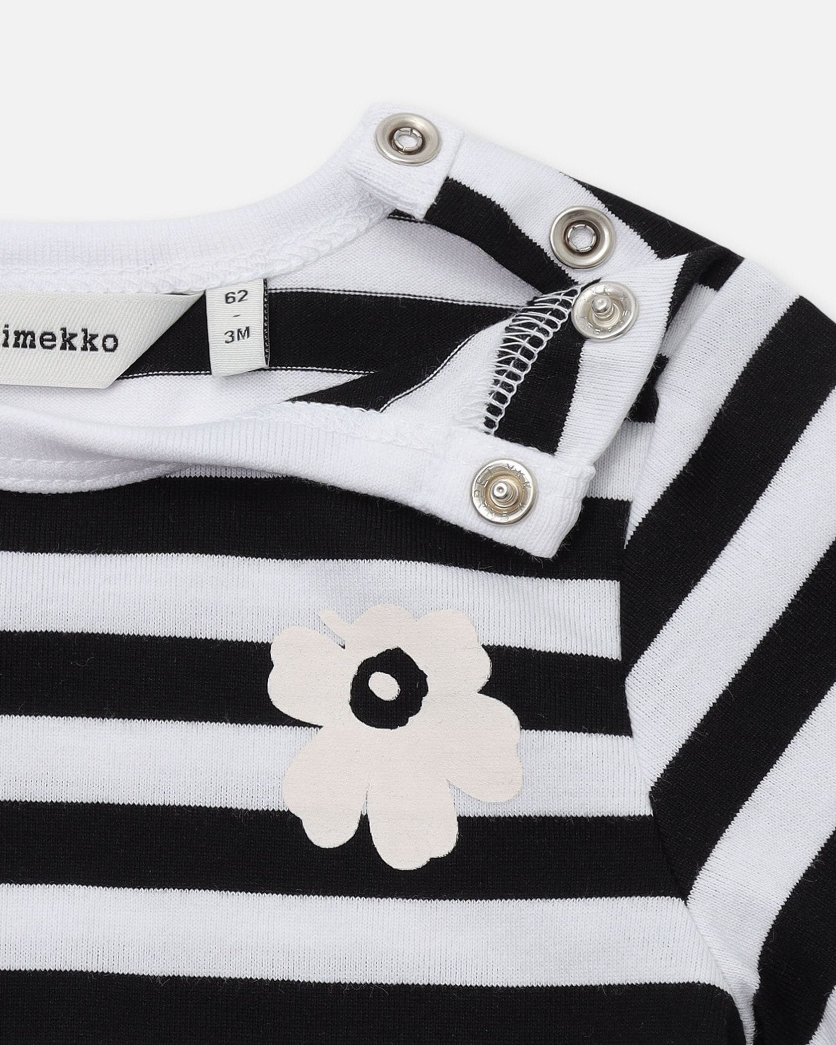 ボーダーにUnikko柄のワンポイントを加えたロンパース。ほど良くカジュアルなデザインは、デイリーユースにもおすすめです。コットン100%素材で、着心地良さにもこだわった一枚。