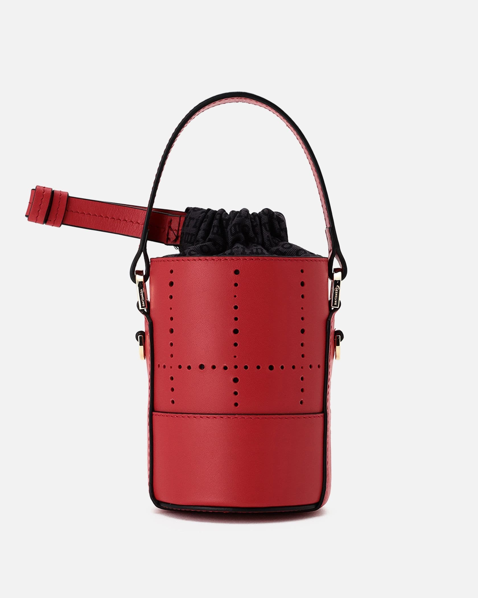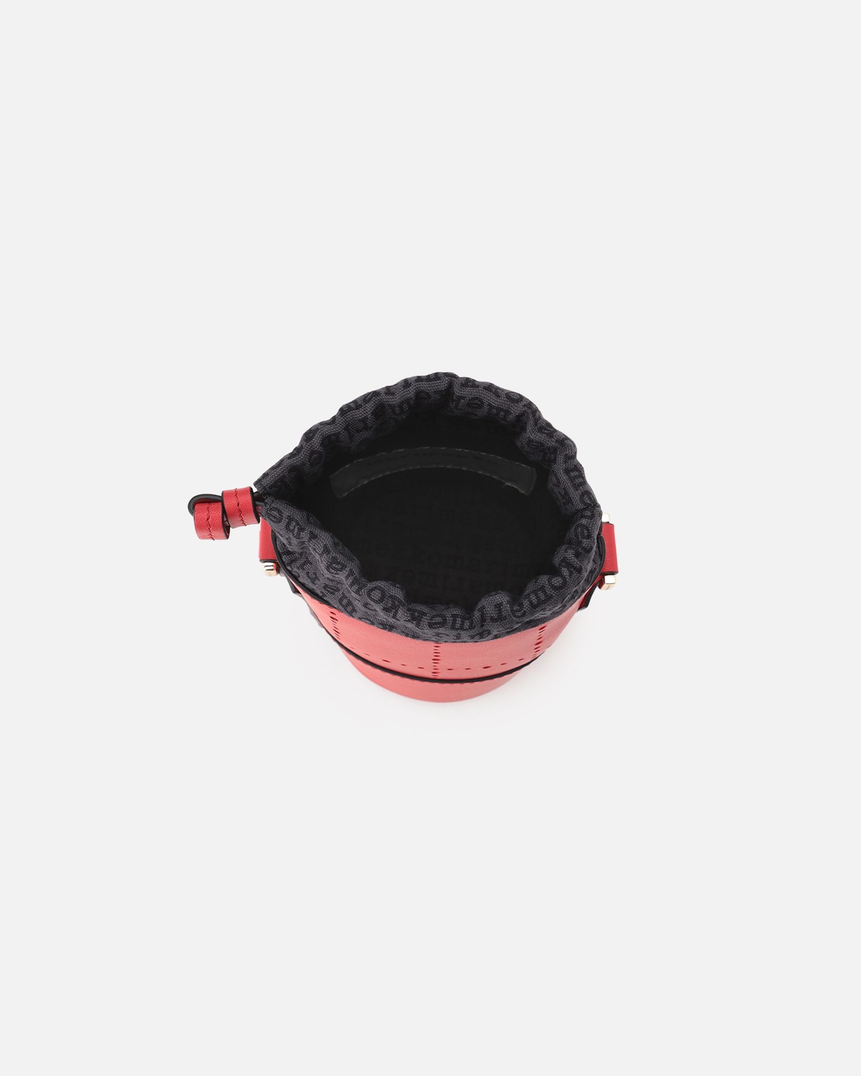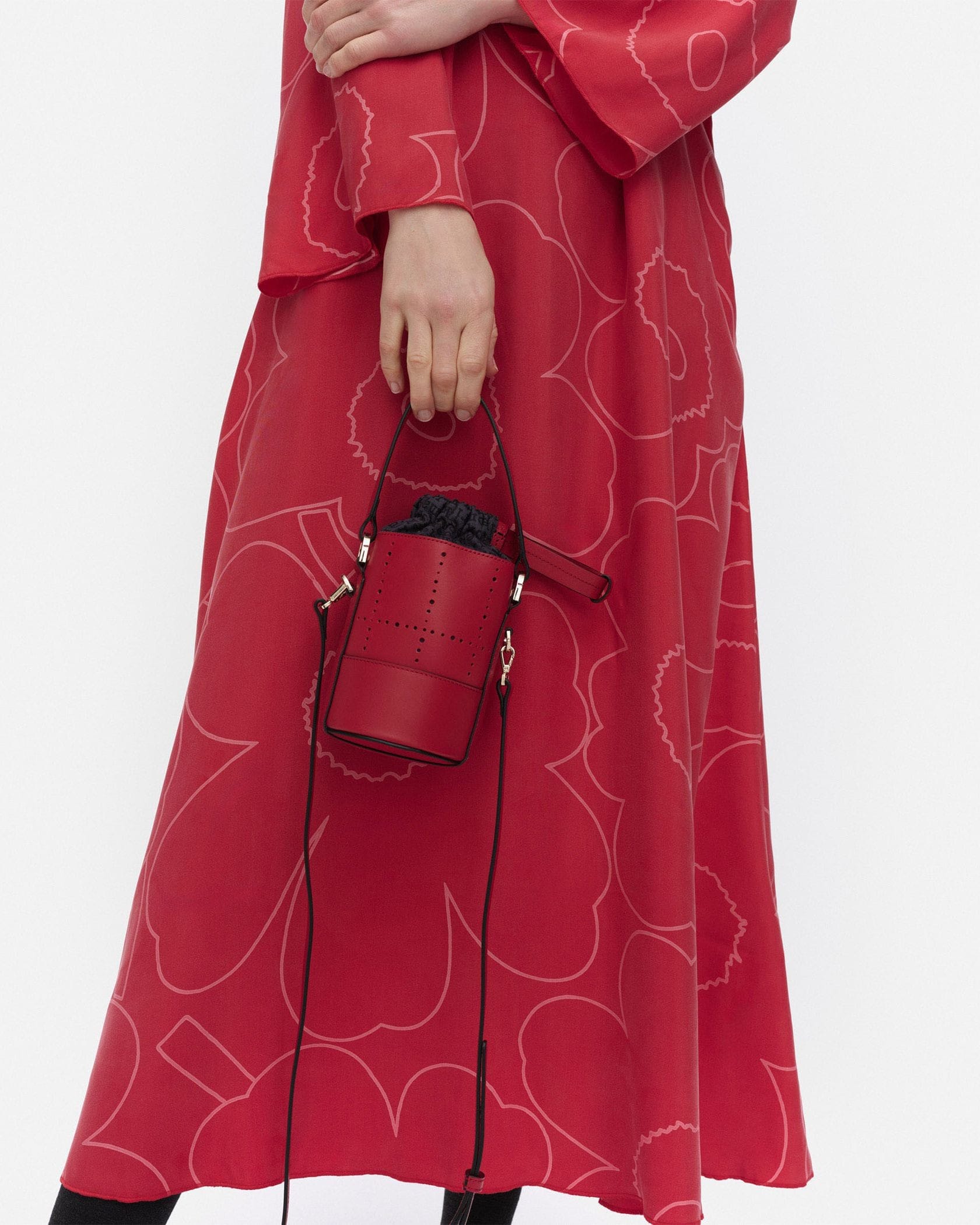 アクセサリー感覚で取り入れたい、可愛らしいミニサイズのバケットバッグ。ショルダーストラップ付きの2WAY仕様です。上質なレザー素材で、煉瓦を意味するテキスタイル「Tiiliskivi」をモチーフにデザイン。間口は巾着タイプで中身が見えず、安心してお使いいただけます。
