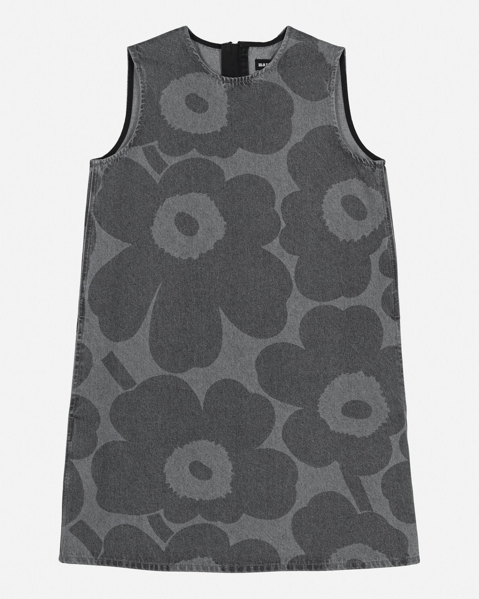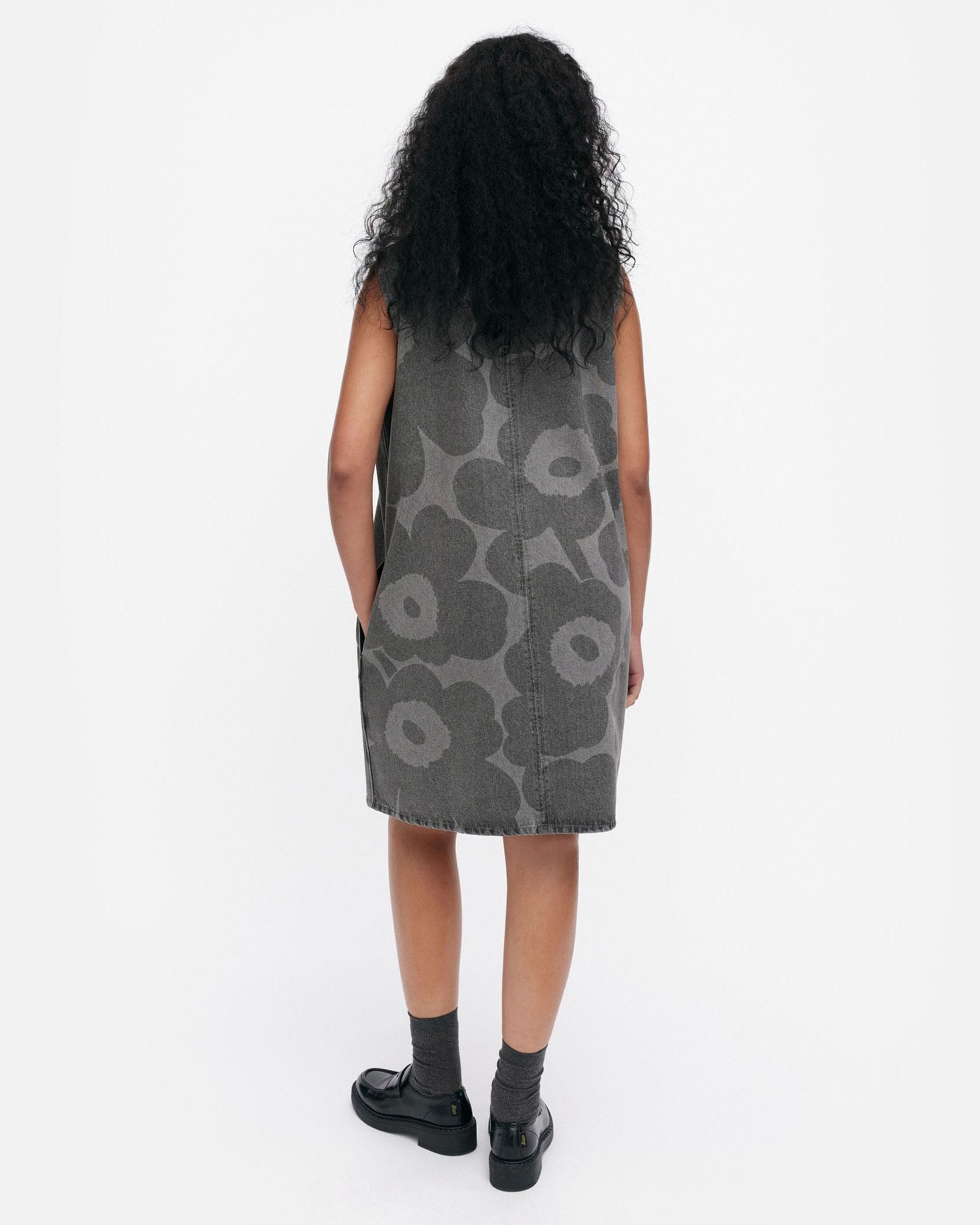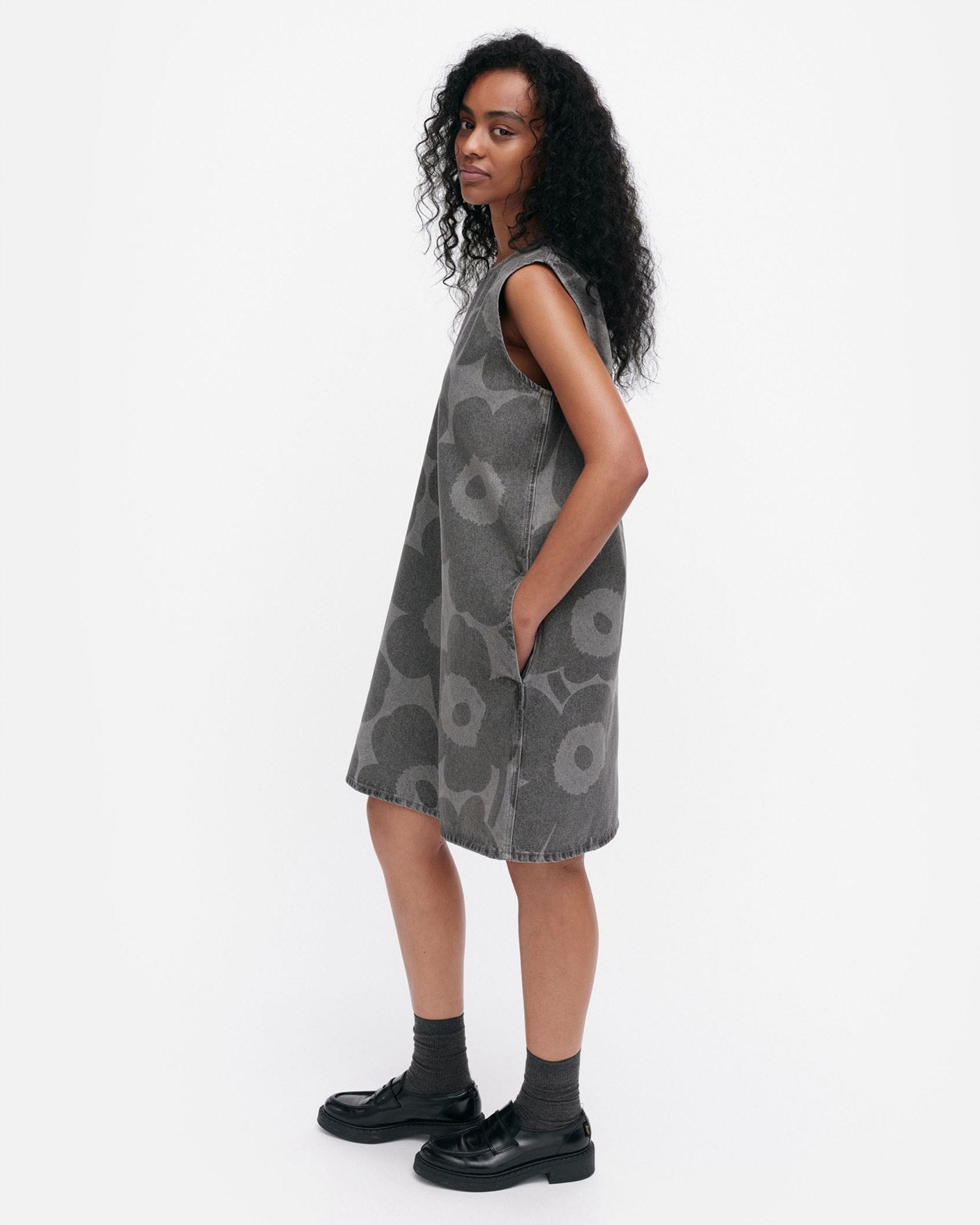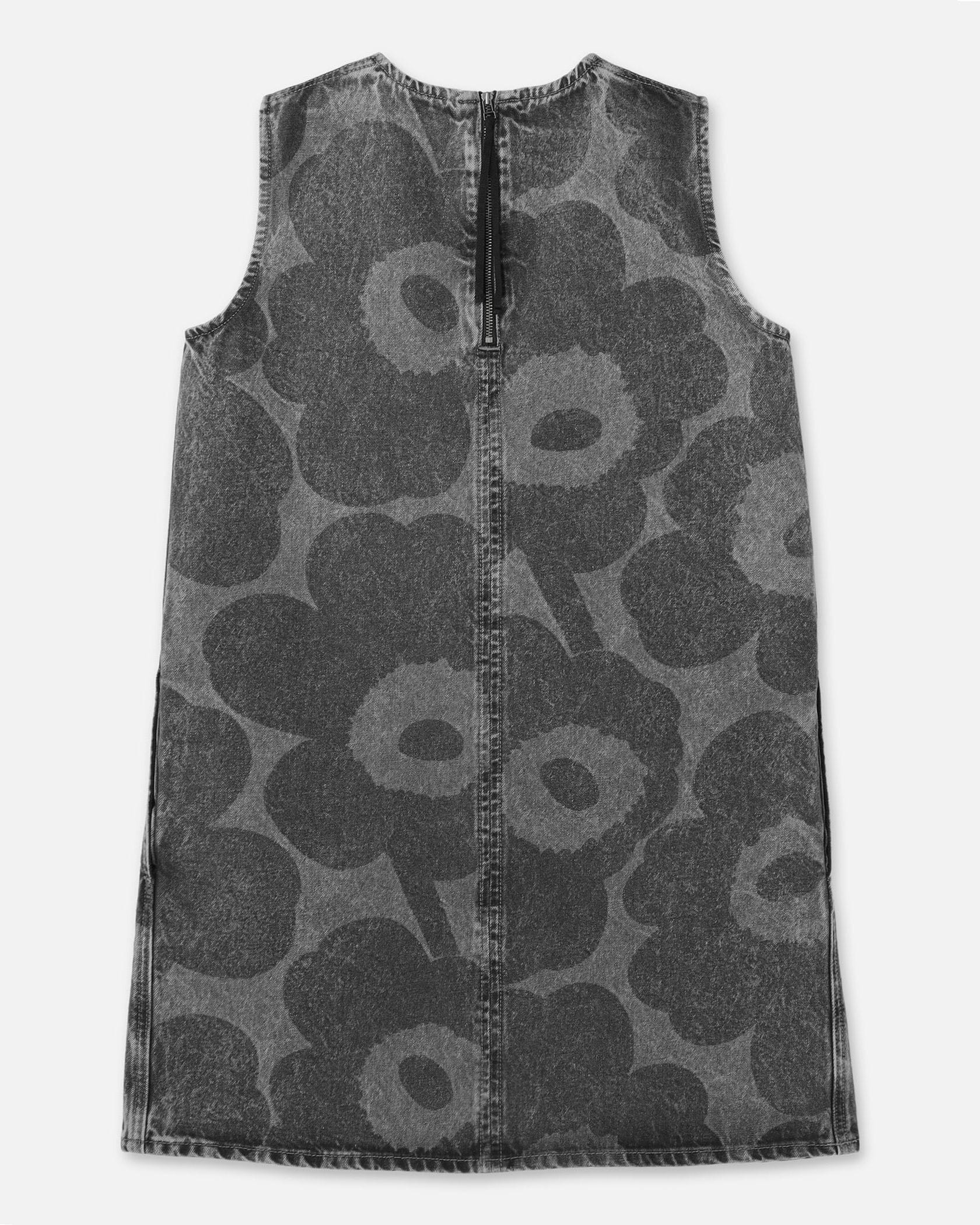 コットンデニムのミニワンピース。色の濃淡で表現された、大胆な「Unikko」柄が目を惹きます。軽快な膝上丈で、体のラインを拾いにくいAラインシルエット。シンプルな一枚着のほか、トップはカットソーや薄手のニットを、ボトムはレギンスやパンツを重ねて、レイヤードスタイルも楽しめます。便利なサイドポケット付きです。