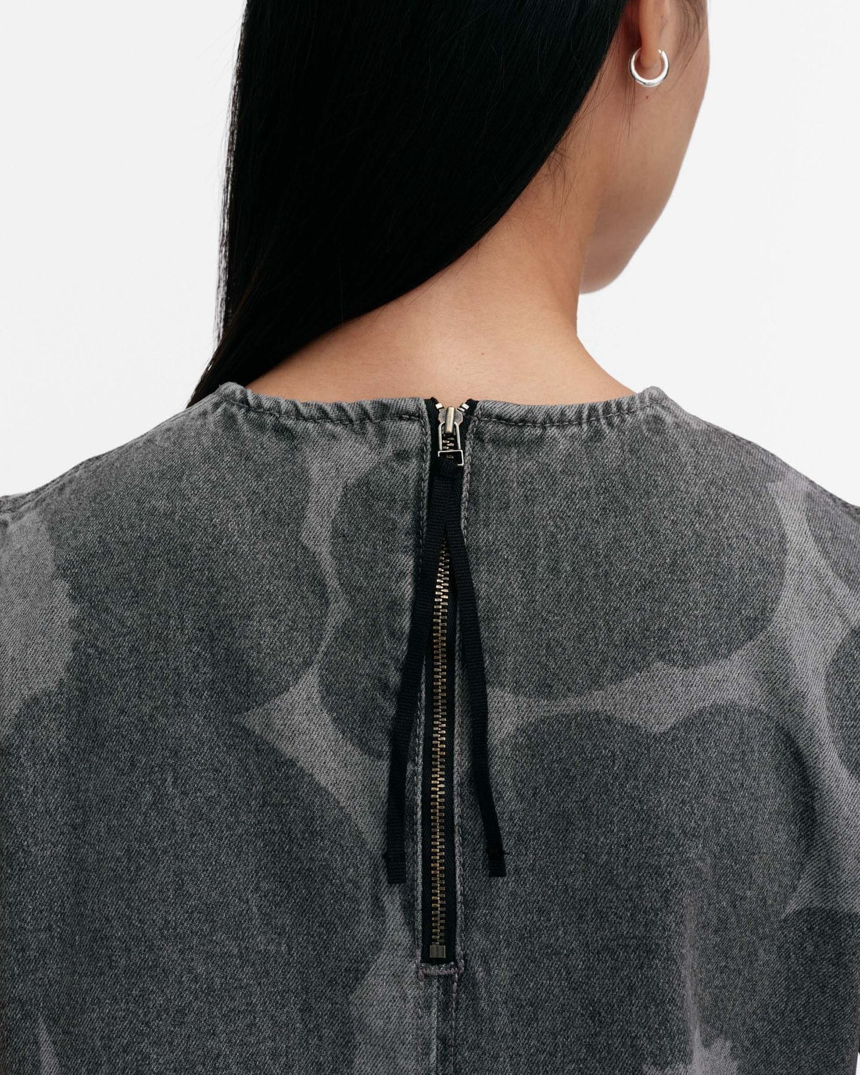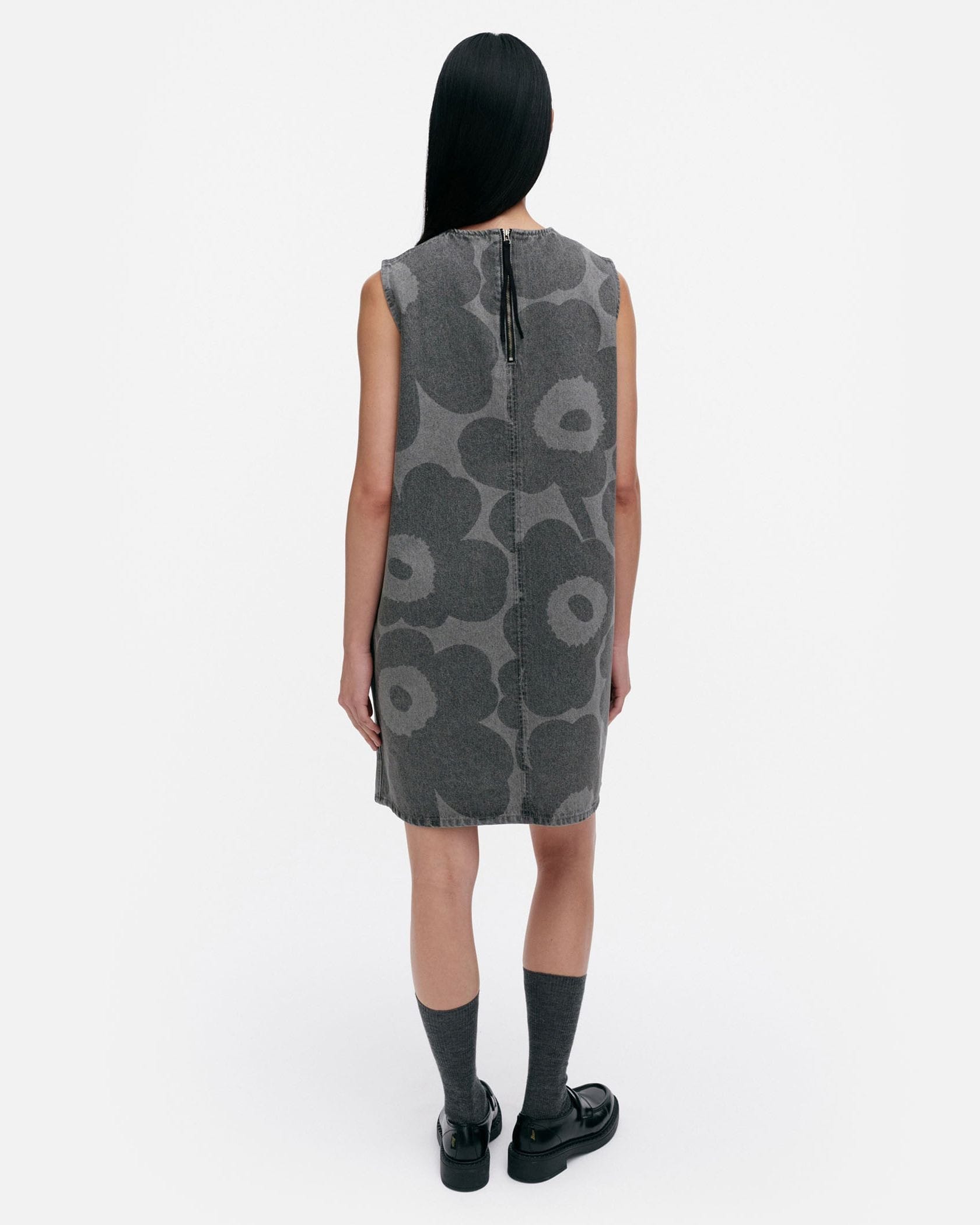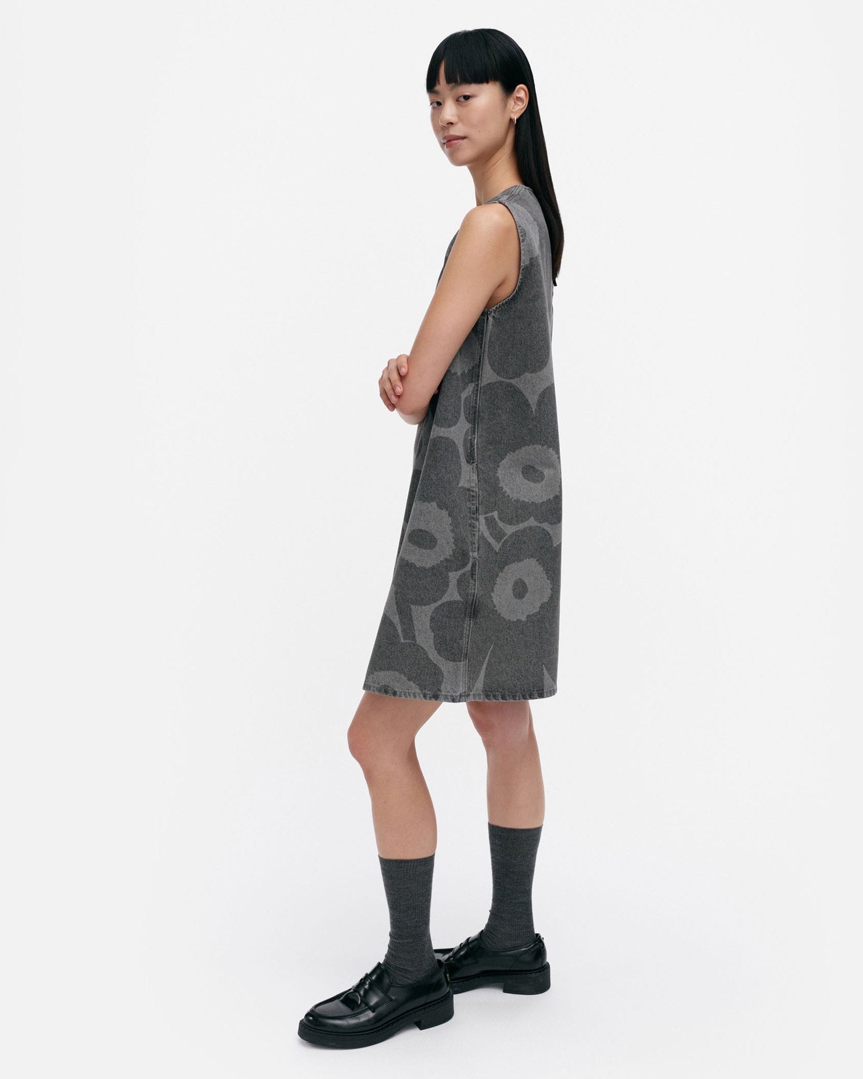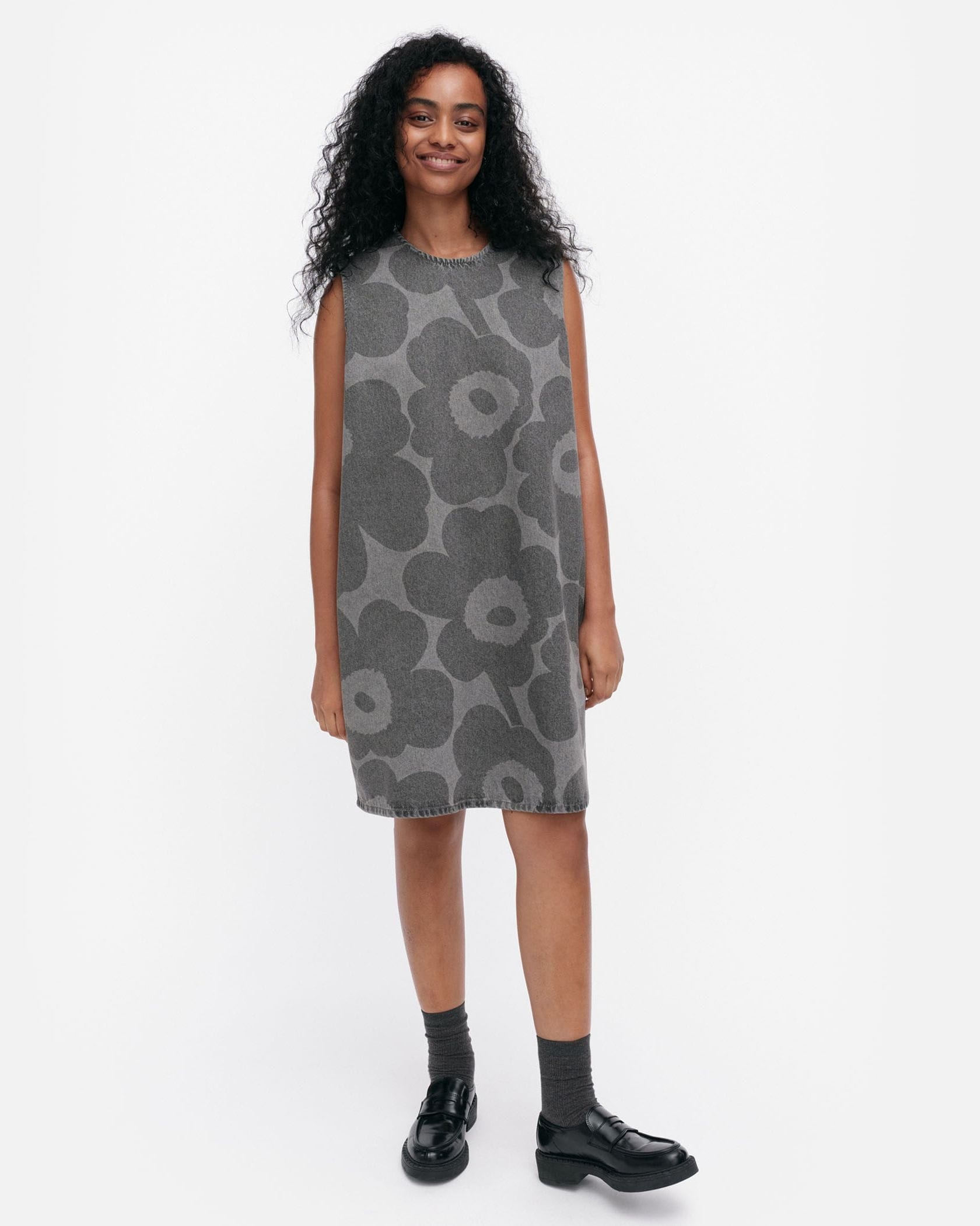 コットンデニムのミニワンピース。色の濃淡で表現された、大胆な「Unikko」柄が目を惹きます。軽快な膝上丈で、体のラインを拾いにくいAラインシルエット。シンプルな一枚着のほか、トップはカットソーや薄手のニットを、ボトムはレギンスやパンツを重ねて、レイヤードスタイルも楽しめます。便利なサイドポケット付きです。