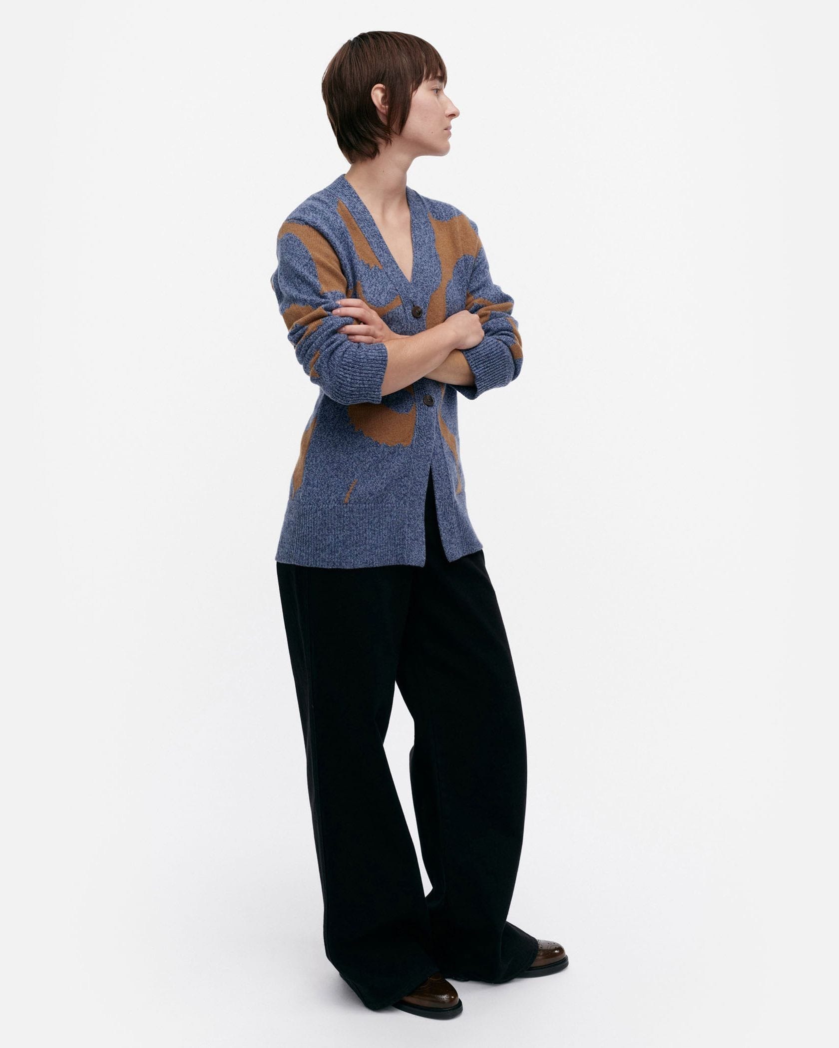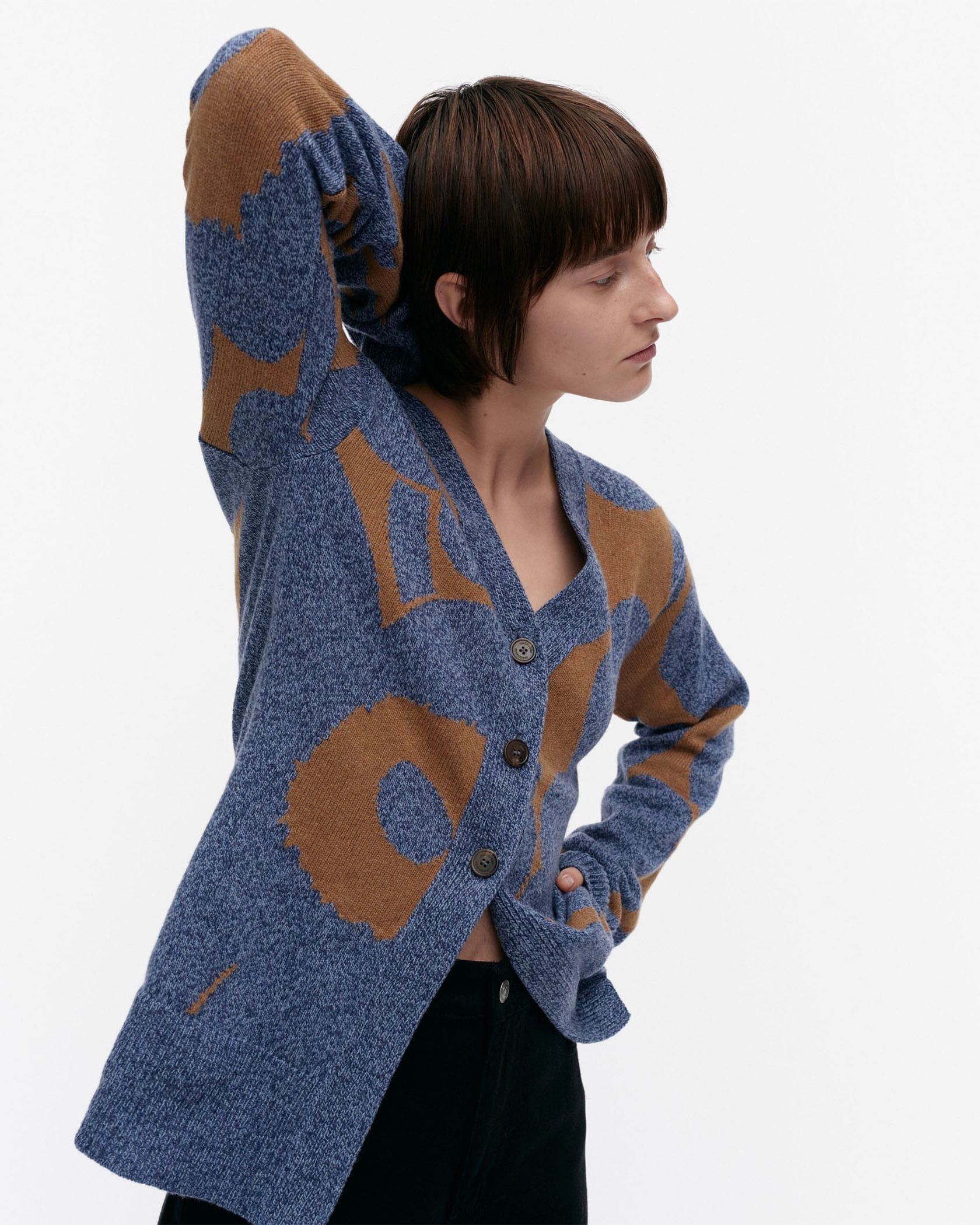 流れるように描かれたUnikko柄がラグジュアリーな表情のニットカーディガン。シャープなVネックやヒップにかかる着丈が、すっきりとしたボディラインを演出します。着こなしの主役としてはもちろん、便利な羽織りとしても活躍する一枚です。