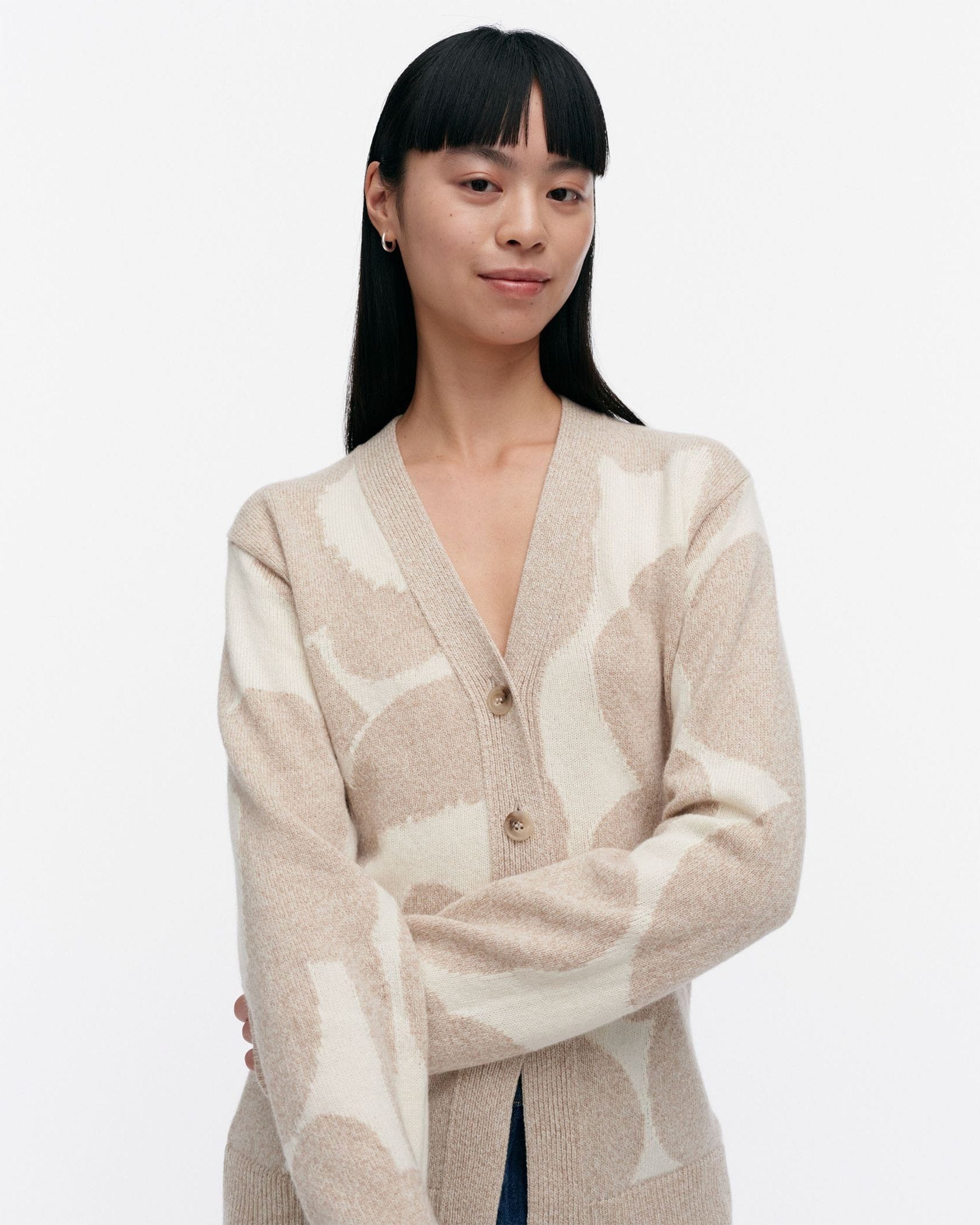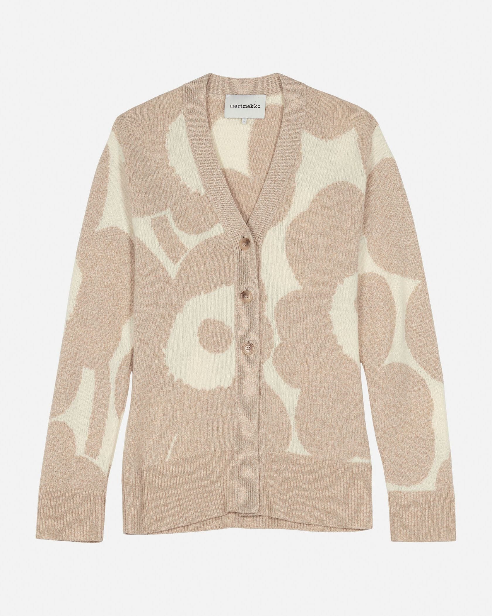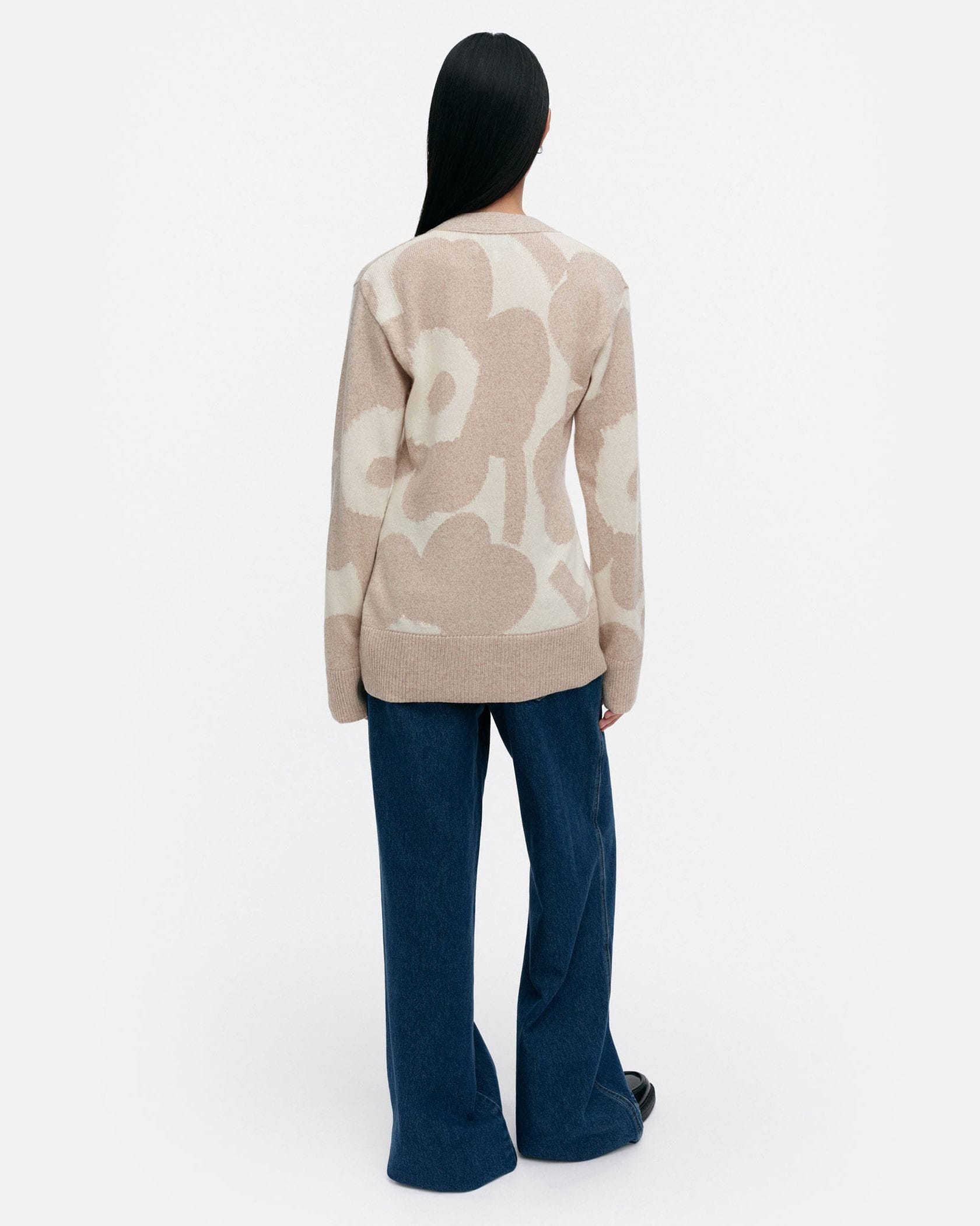 流れるように描かれたUnikko柄がラグジュアリーな表情のニットカーディガン。シャープなVネックやヒップにかかる着丈が、すっきりとしたボディラインを演出します。着こなしの主役としてはもちろん、便利な羽織りとしても活躍する一枚です。