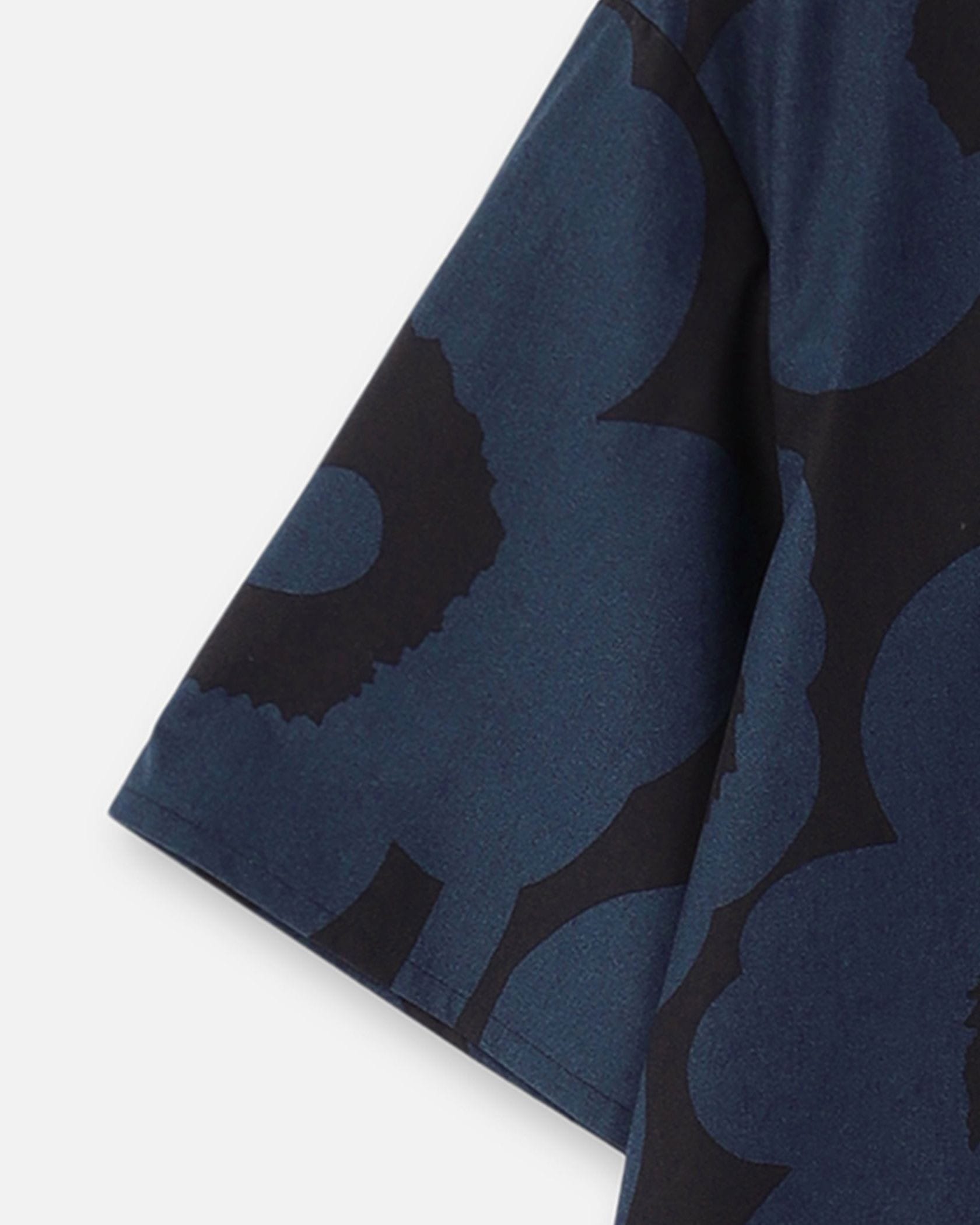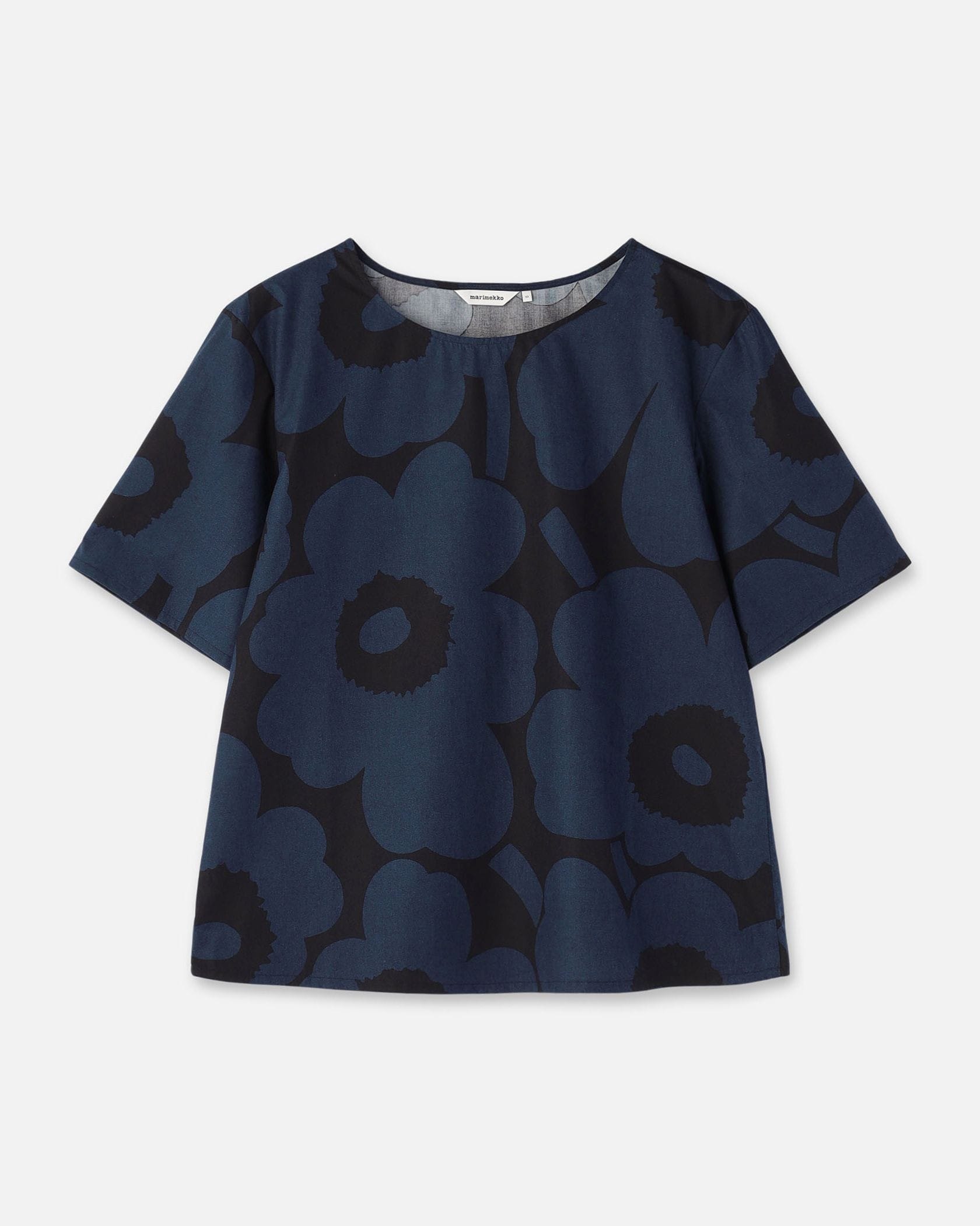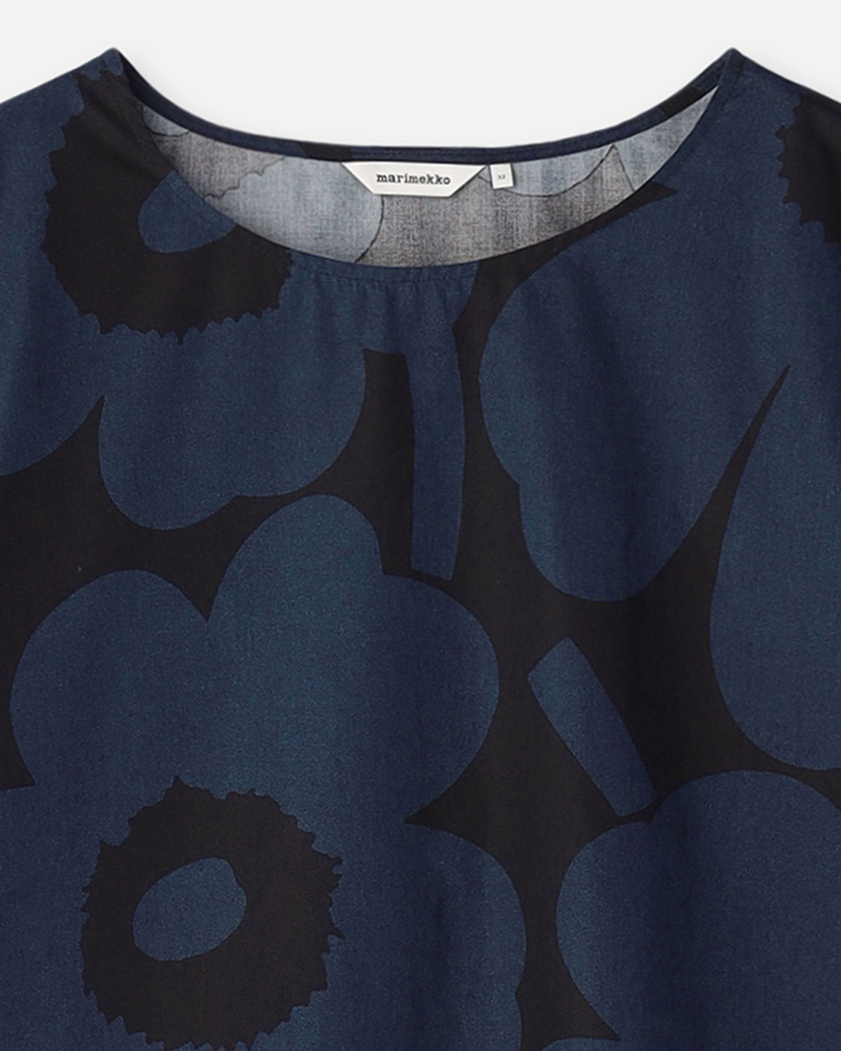 さらりと着こなせるUnikko柄のコットンブラウス。ややフレアになったシルエットは、リラックス感があって着痩せもするのがうれしい。やや広めの衿ぐりで、パンツを合わせても女性らしく着こなせます。