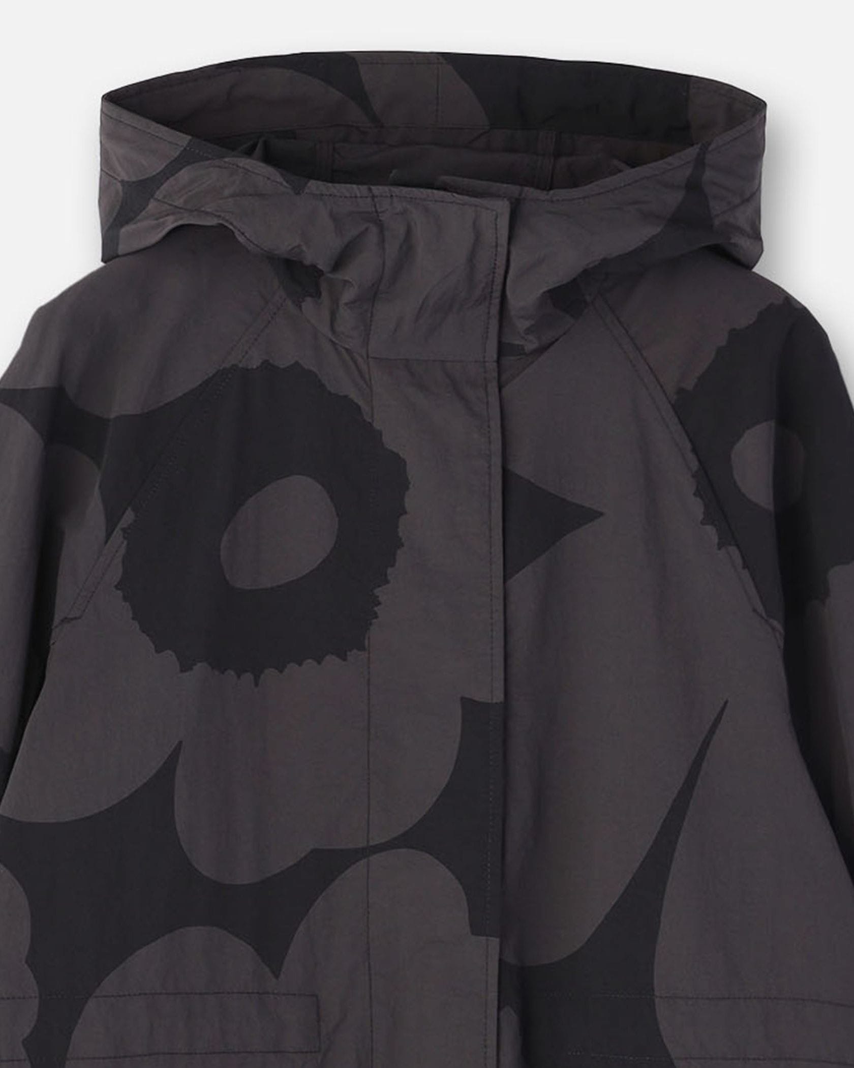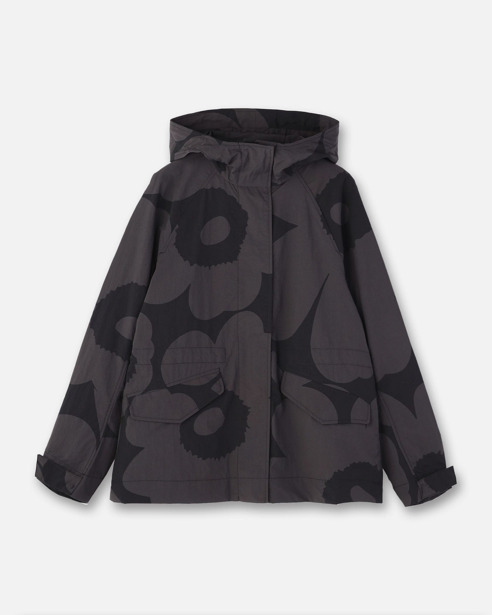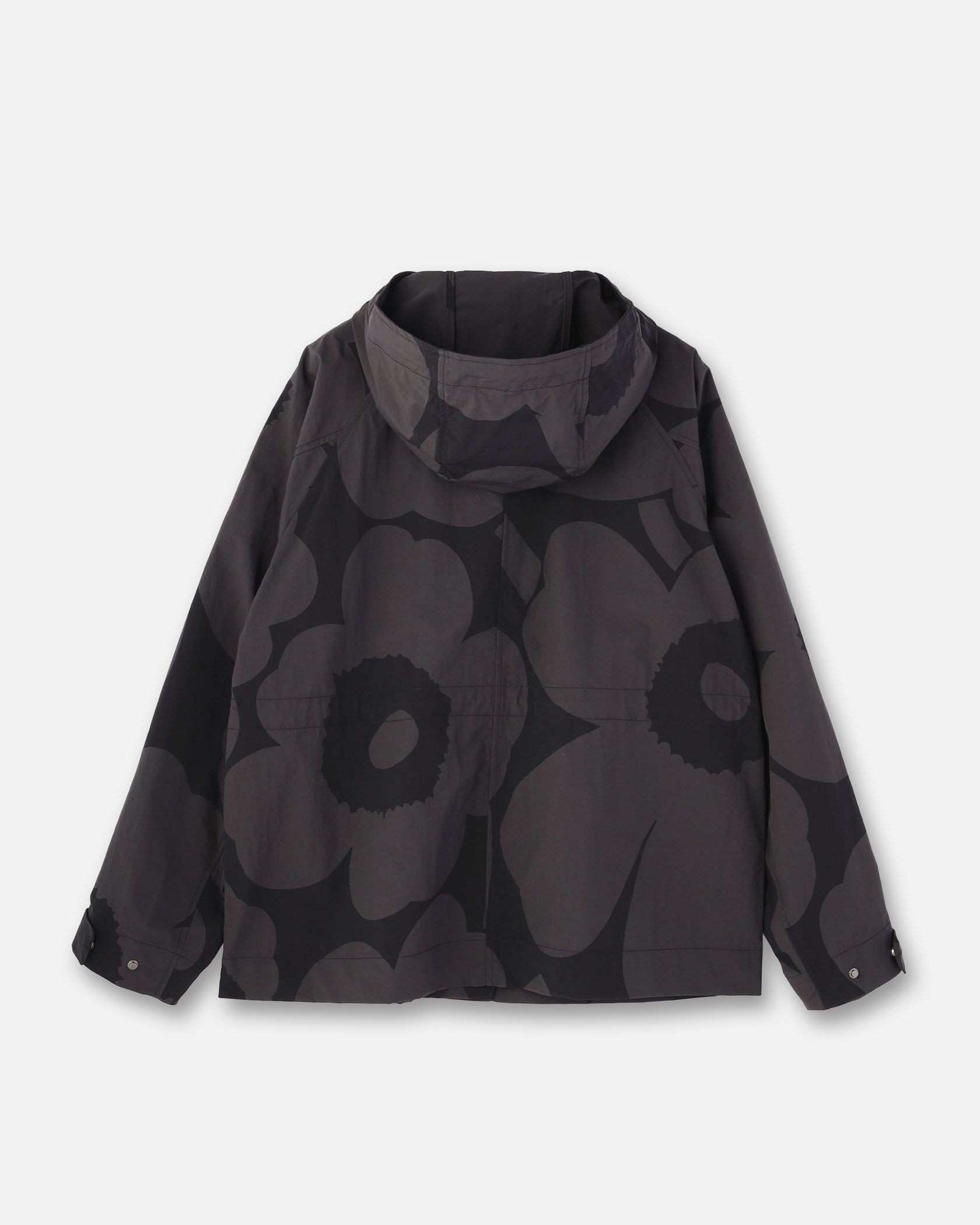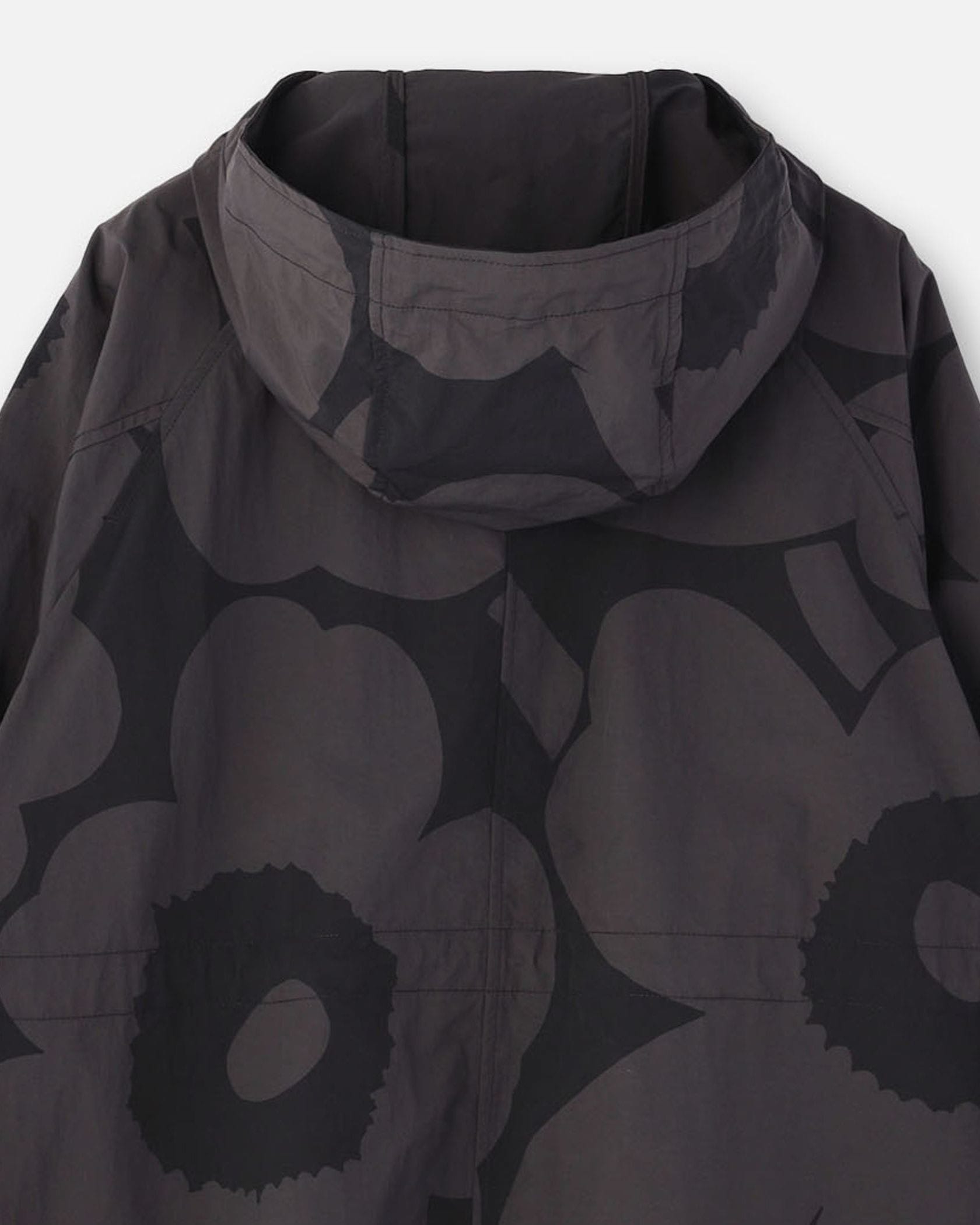 Marimekkoを代表するUnikko柄が大胆にプリントされたジャケットコート。フード、高めのスタンドカラー、袖口のスナップボタンのタブでちょっとした風雨にも対応。ウエストはドローストリング付きでゆったりとしたシルエットでもメリハリを演出します。毎日の着こなしで活躍する便利なアイテムです。