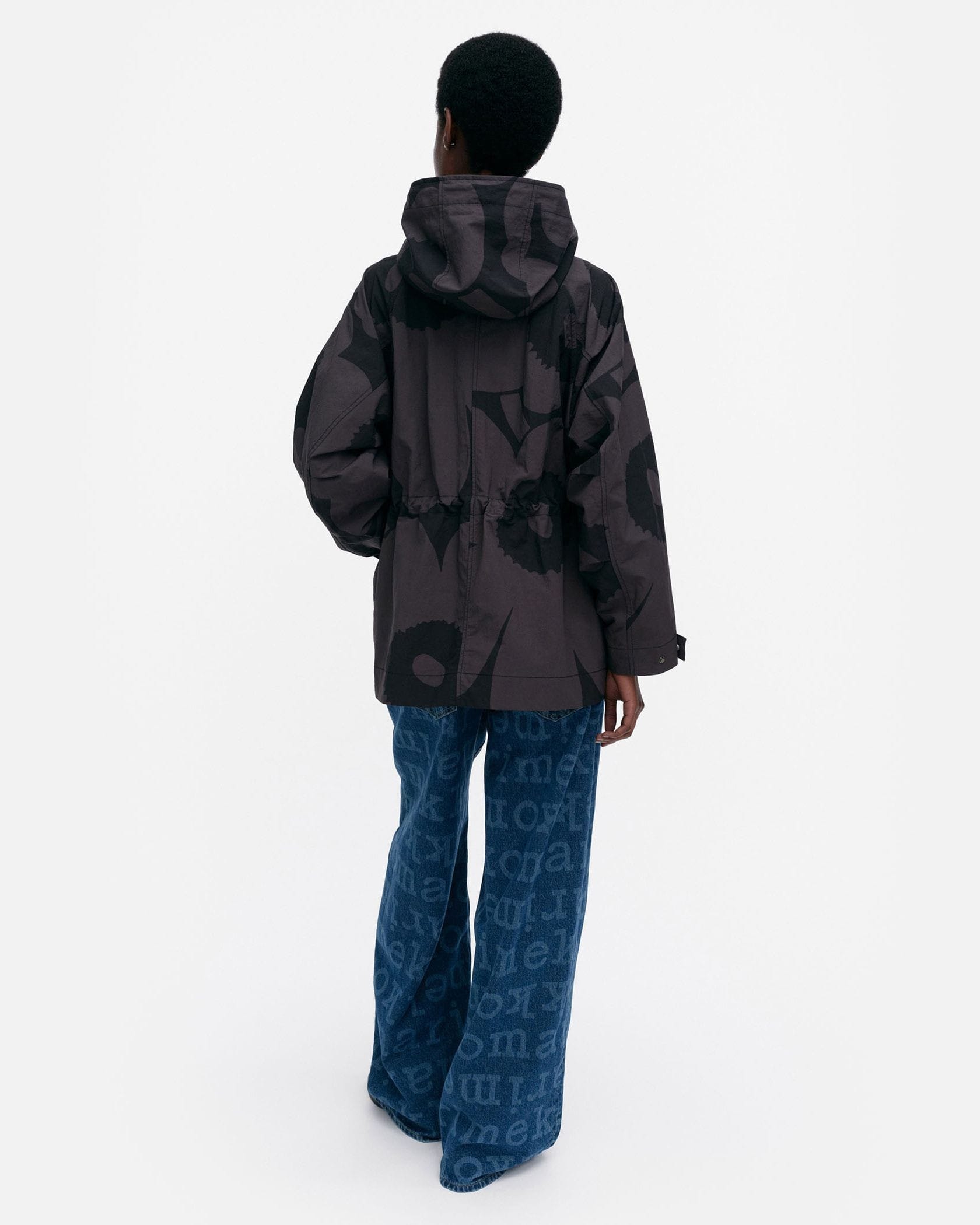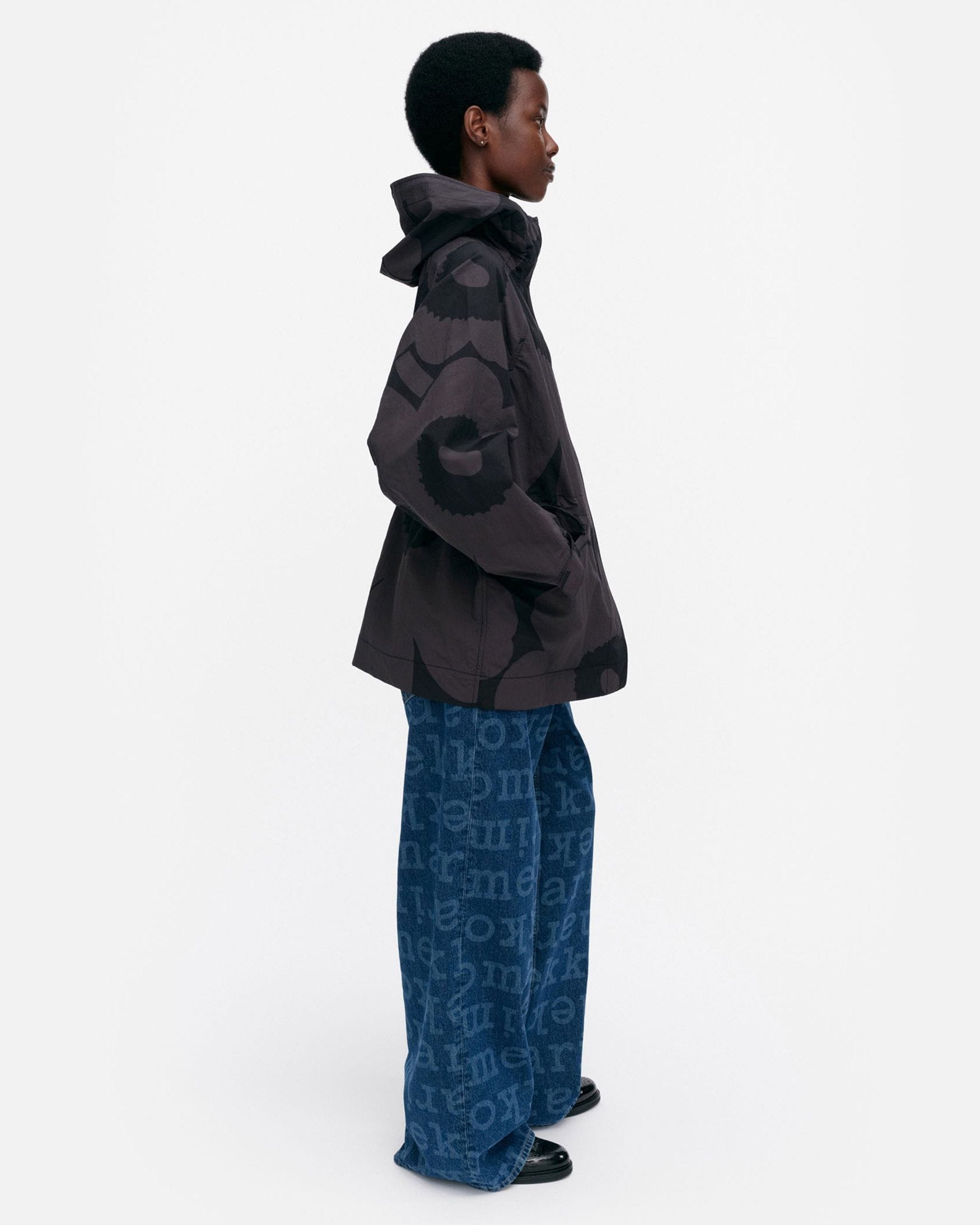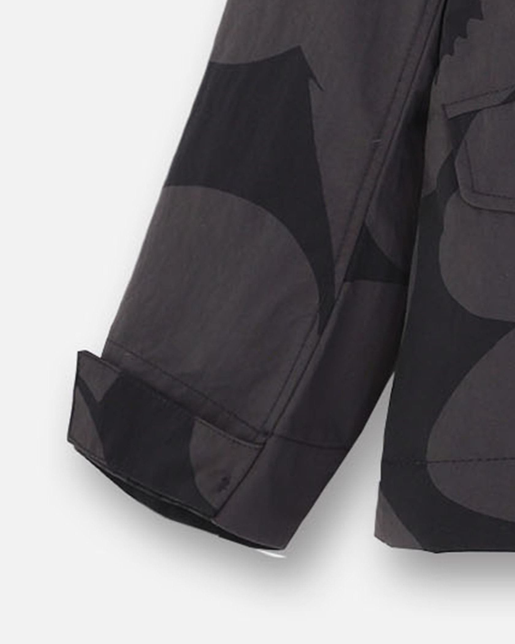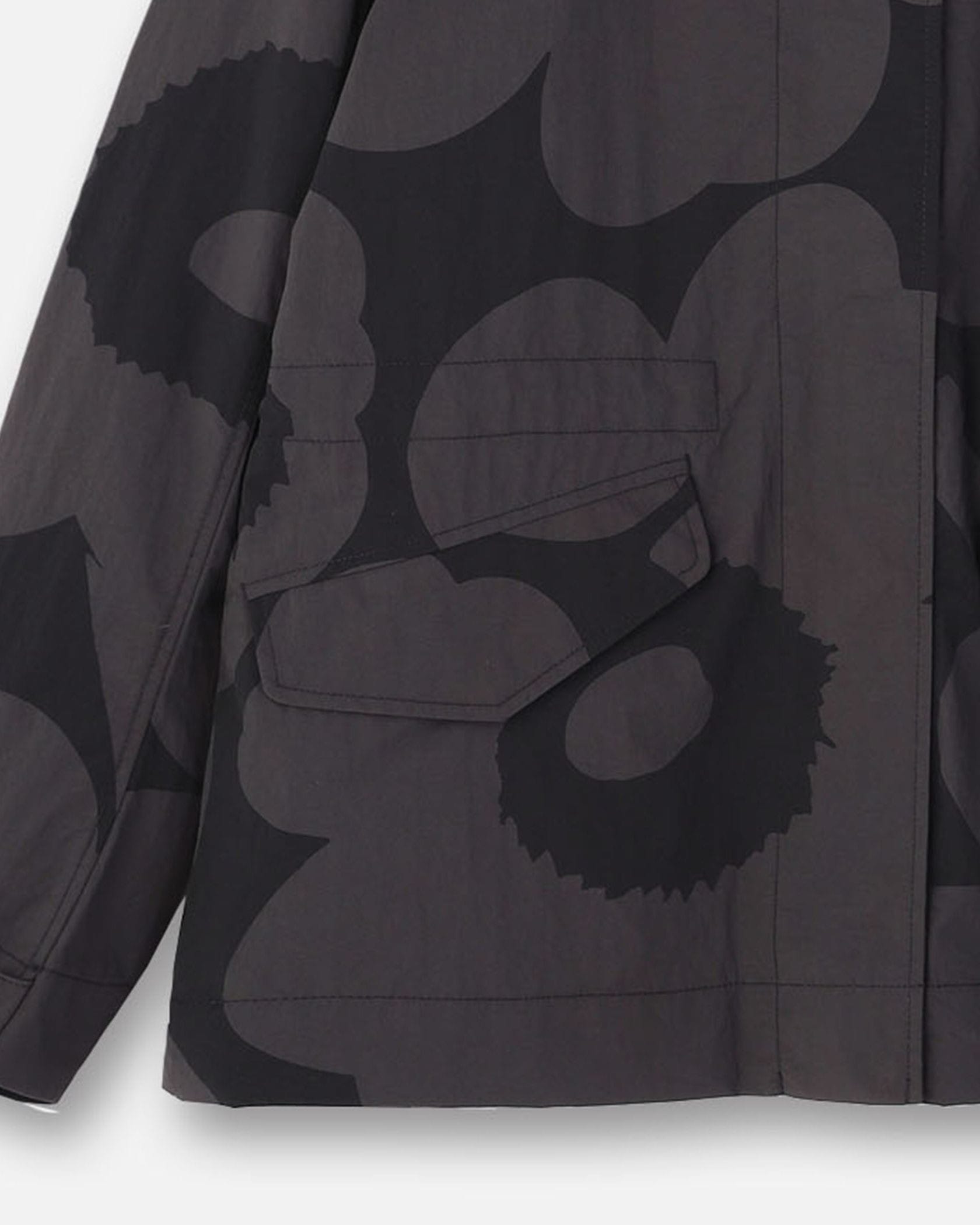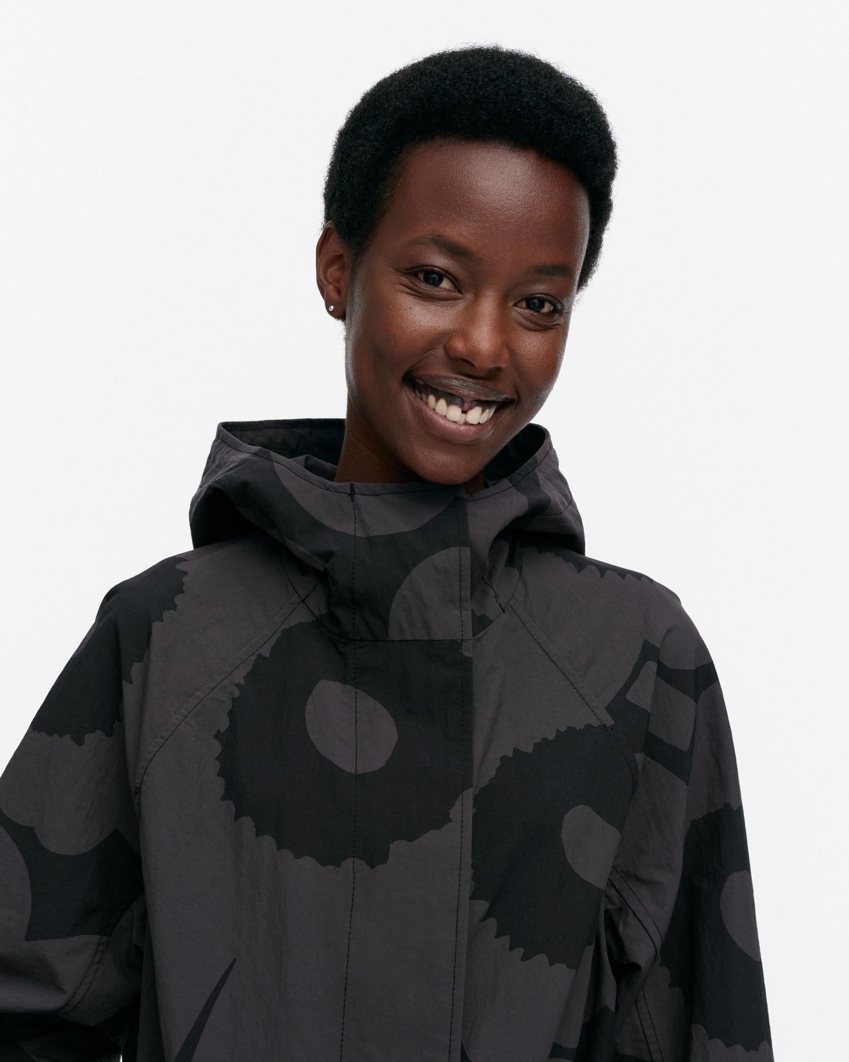 Marimekkoを代表するUnikko柄が大胆にプリントされたジャケットコート。フード、高めのスタンドカラー、袖口のスナップボタンのタブでちょっとした風雨にも対応。ウエストはドローストリング付きでゆったりとしたシルエットでもメリハリを演出します。毎日の着こなしで活躍する便利なアイテムです。