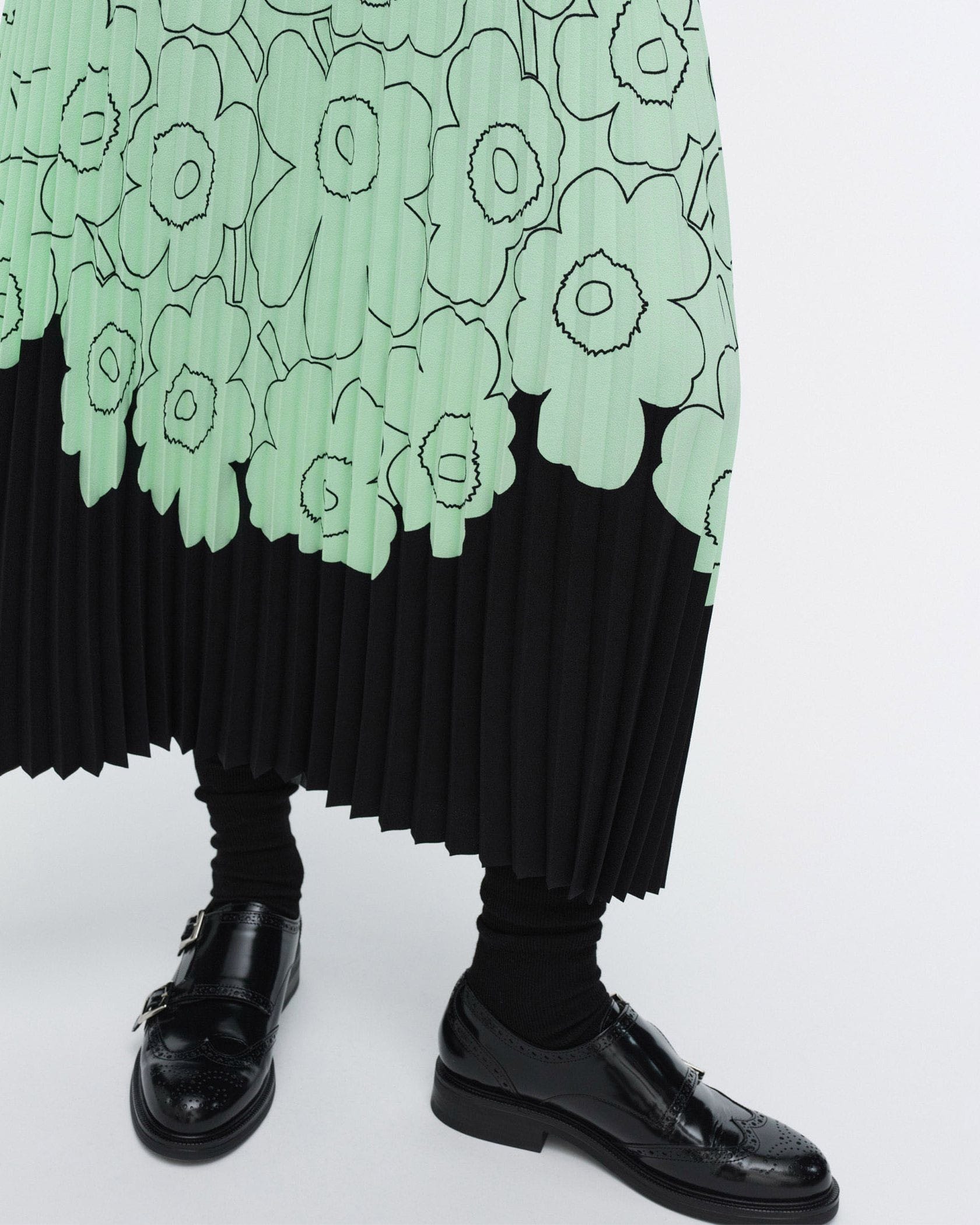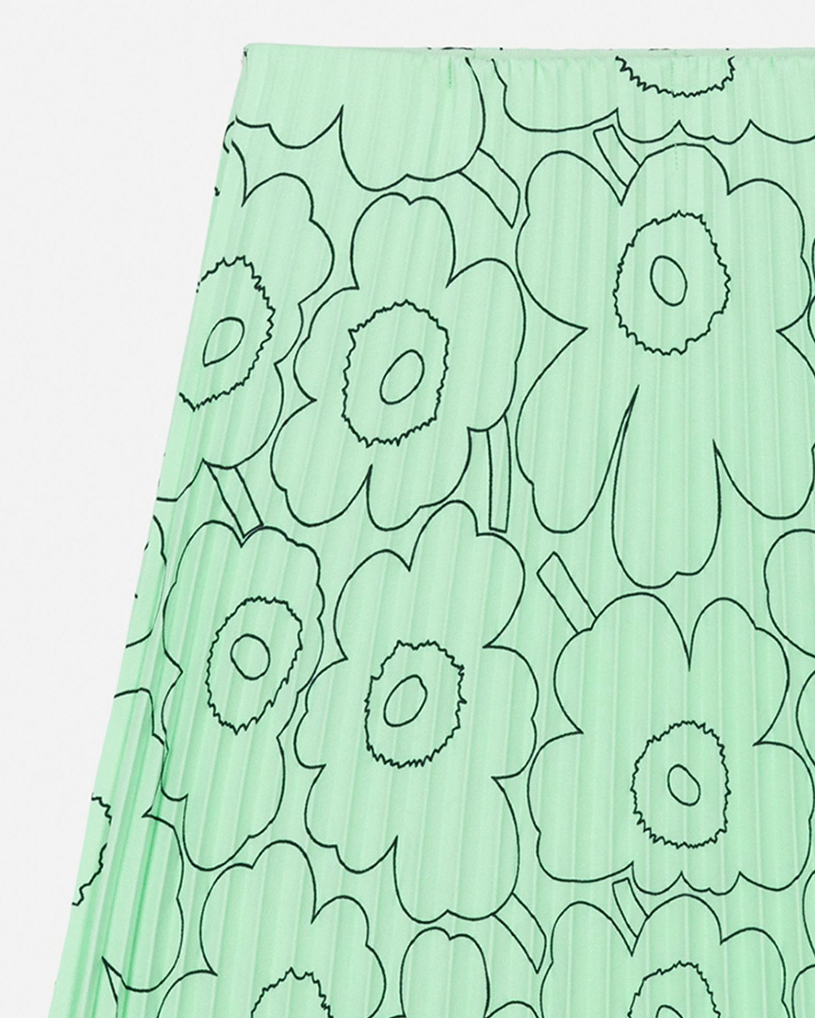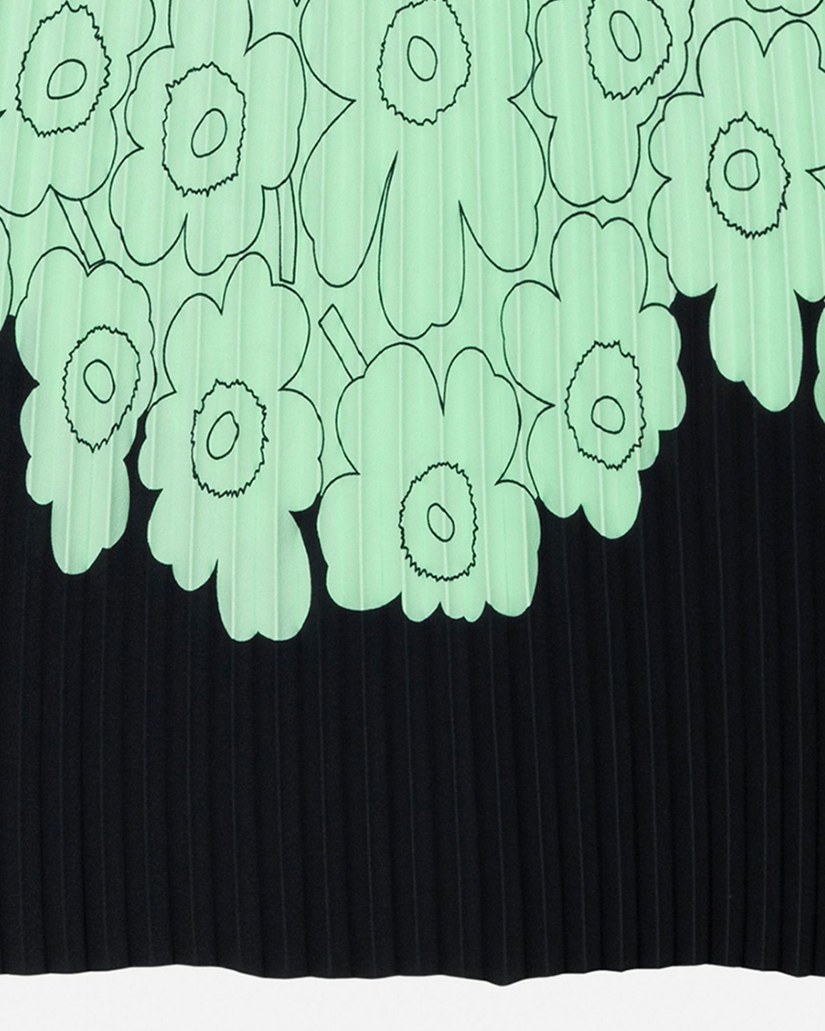 ライトターコイズとブラックのコントラストが際立つPiirto Unikkoパターンのロングプリーツスカート。裾に向かって広がるAラインシルエットがコンフォートなムードを誘います。ウエストにゴムバンドを採用したストレスフリーな着心地もポイントです。