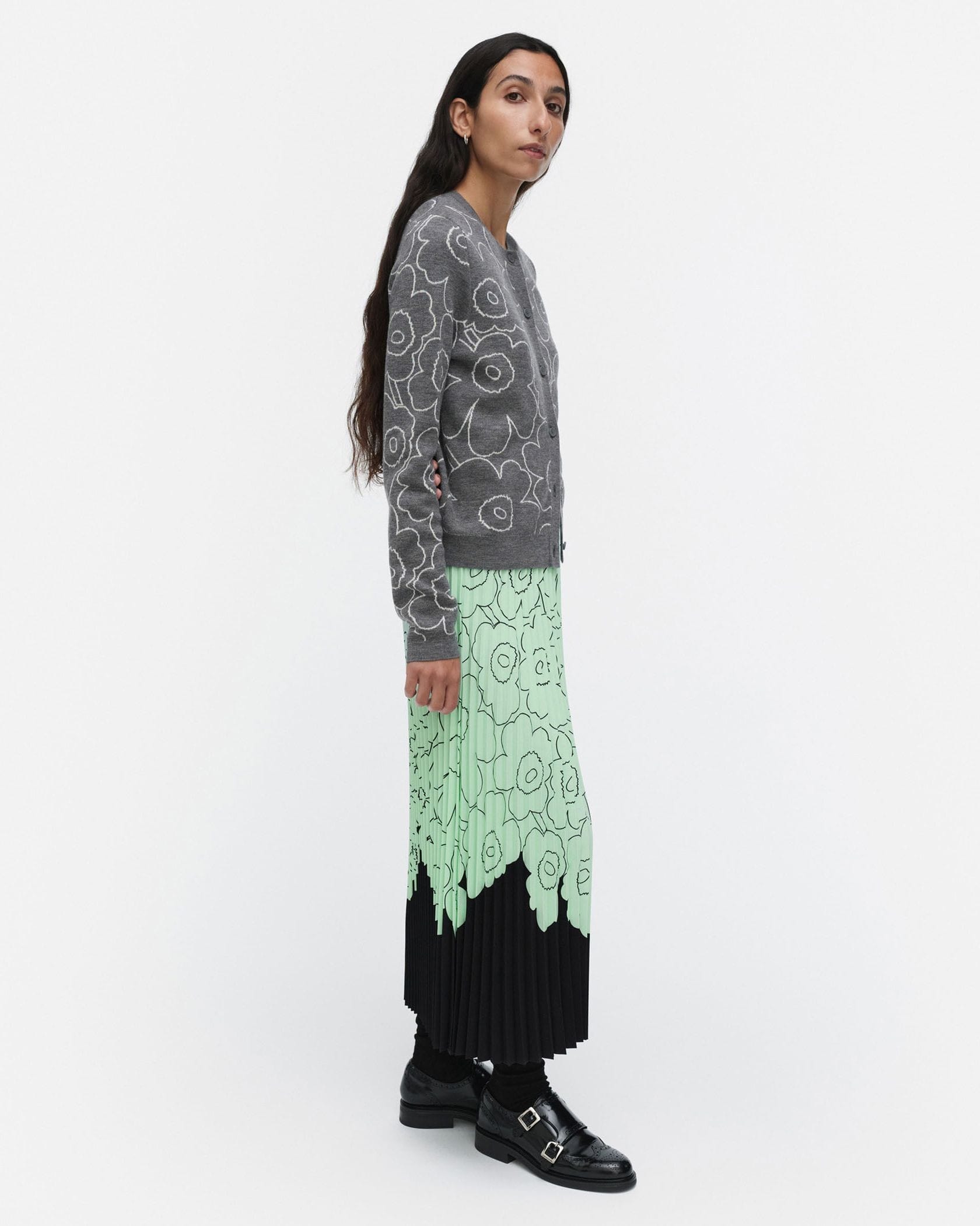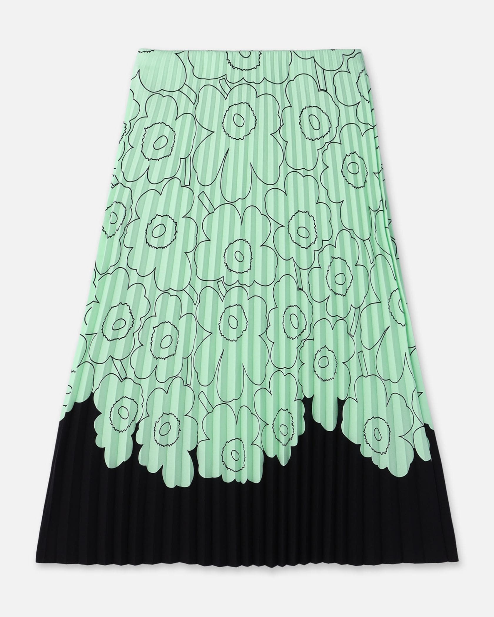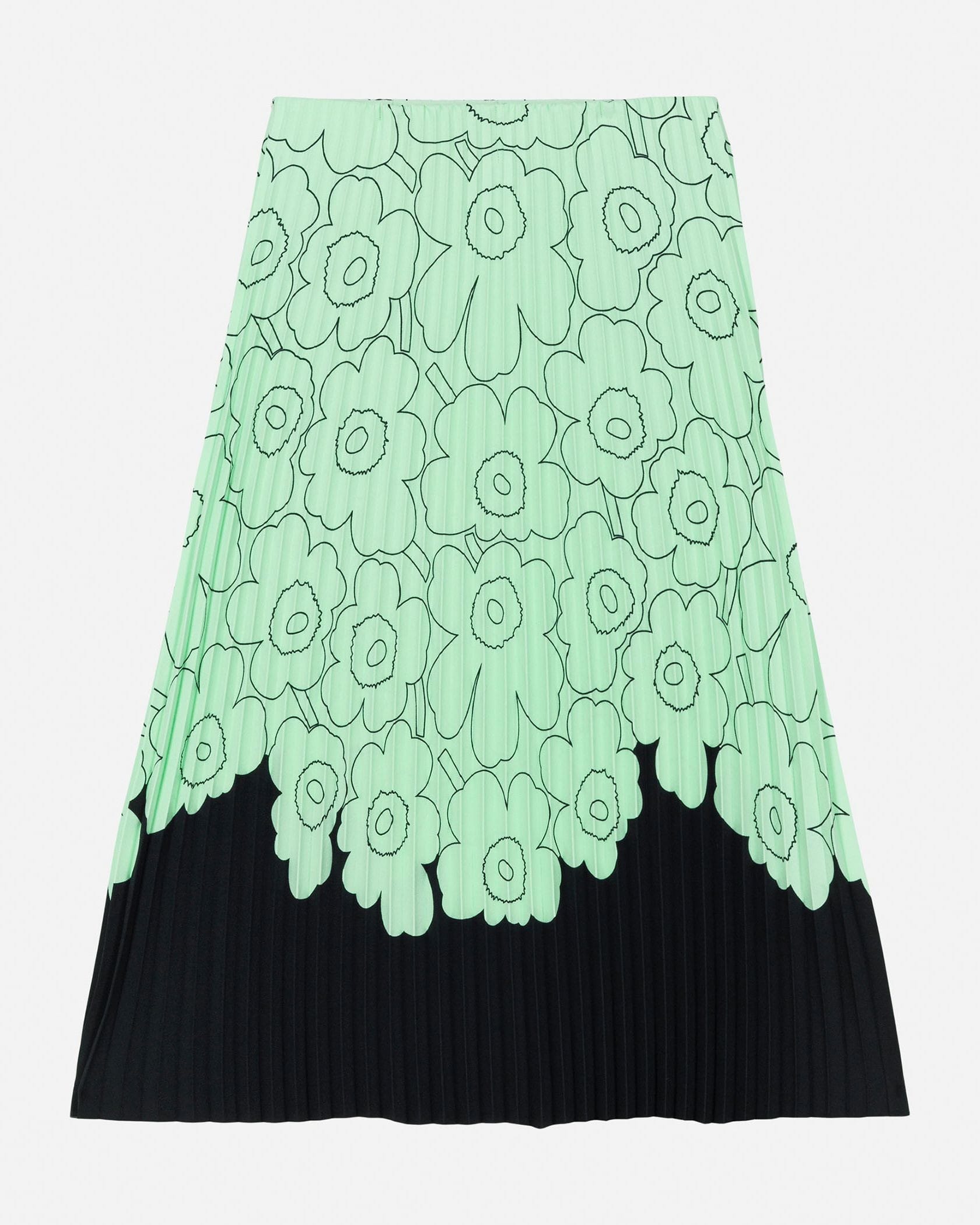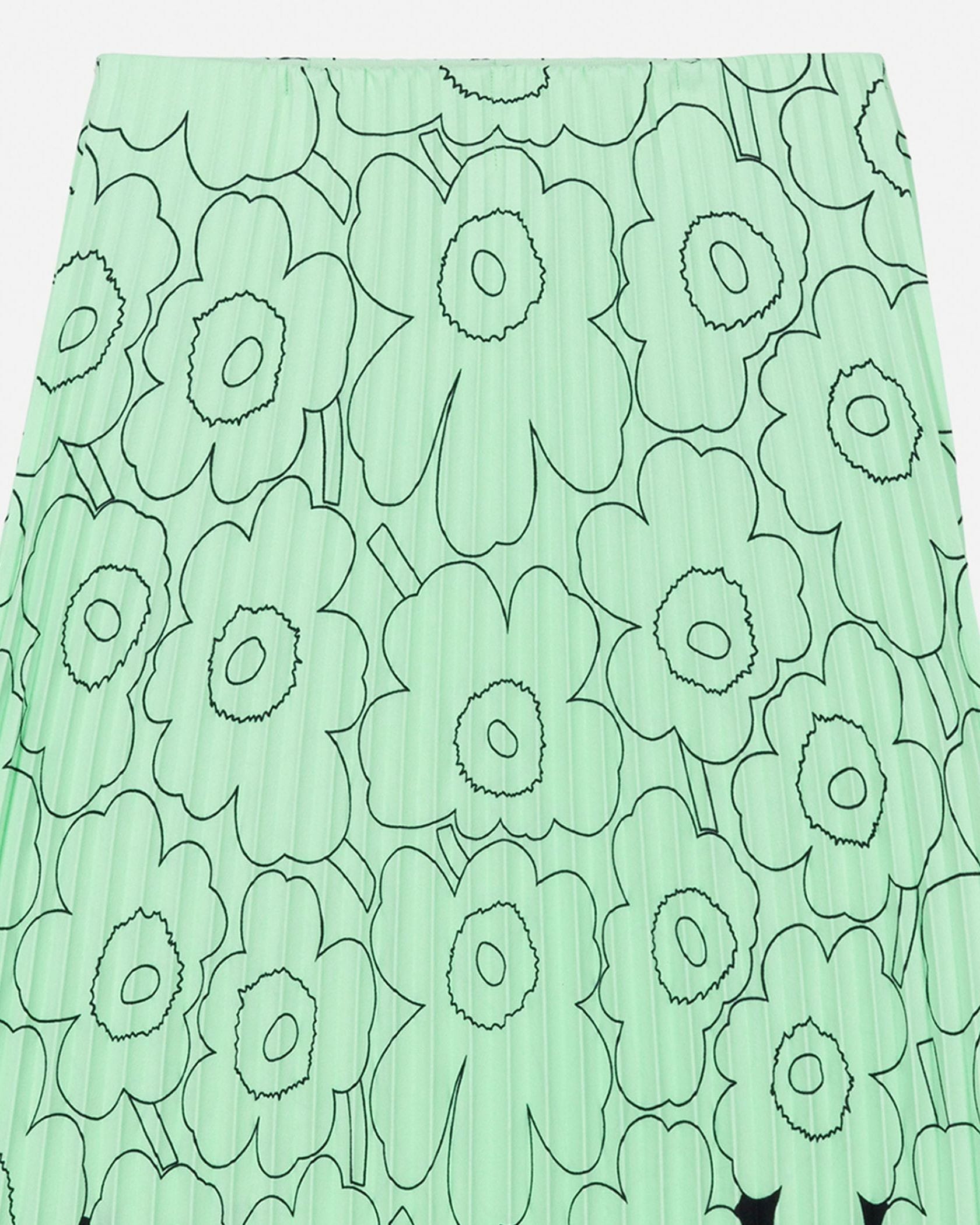 ライトターコイズとブラックのコントラストが際立つPiirto Unikkoパターンのロングプリーツスカート。裾に向かって広がるAラインシルエットがコンフォートなムードを誘います。ウエストにゴムバンドを採用したストレスフリーな着心地もポイントです。