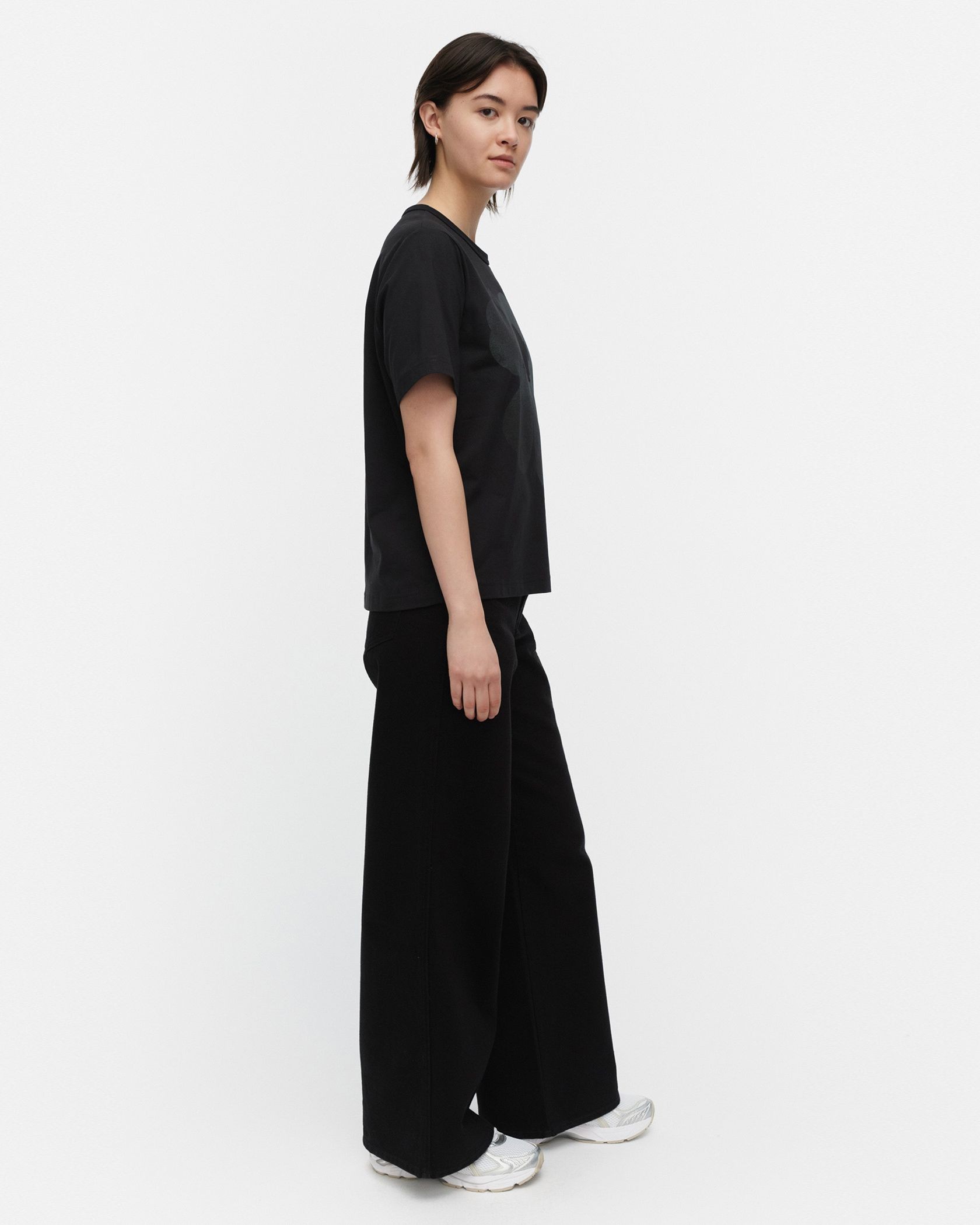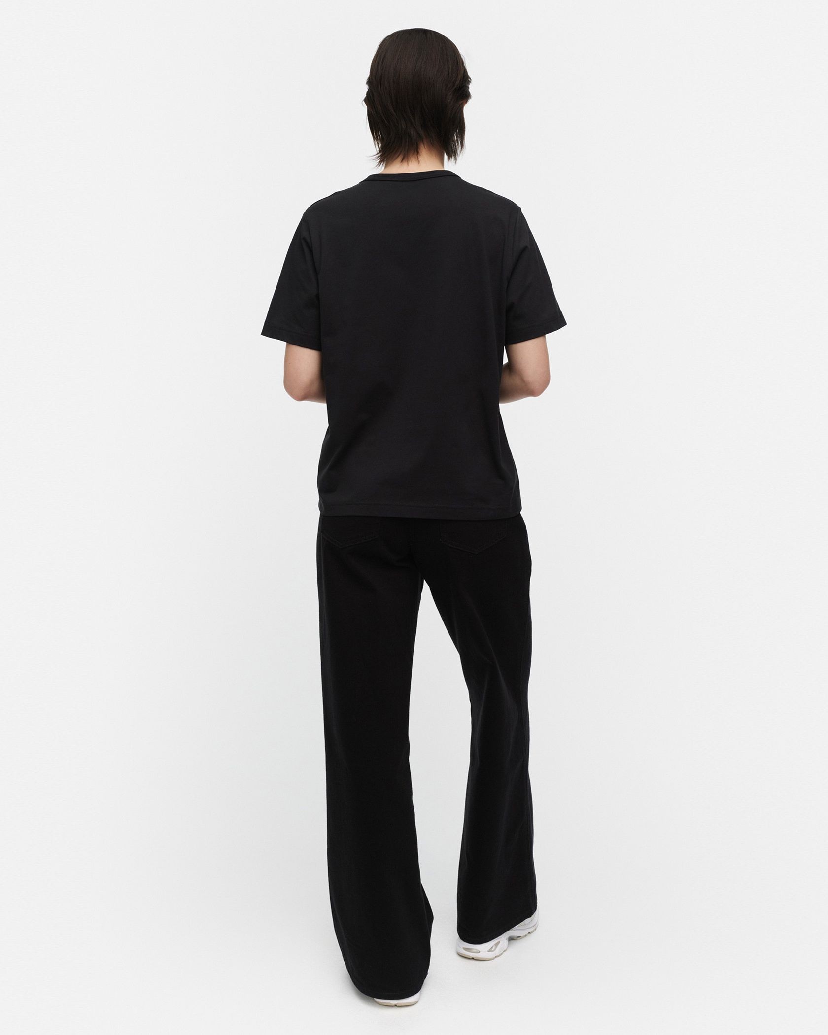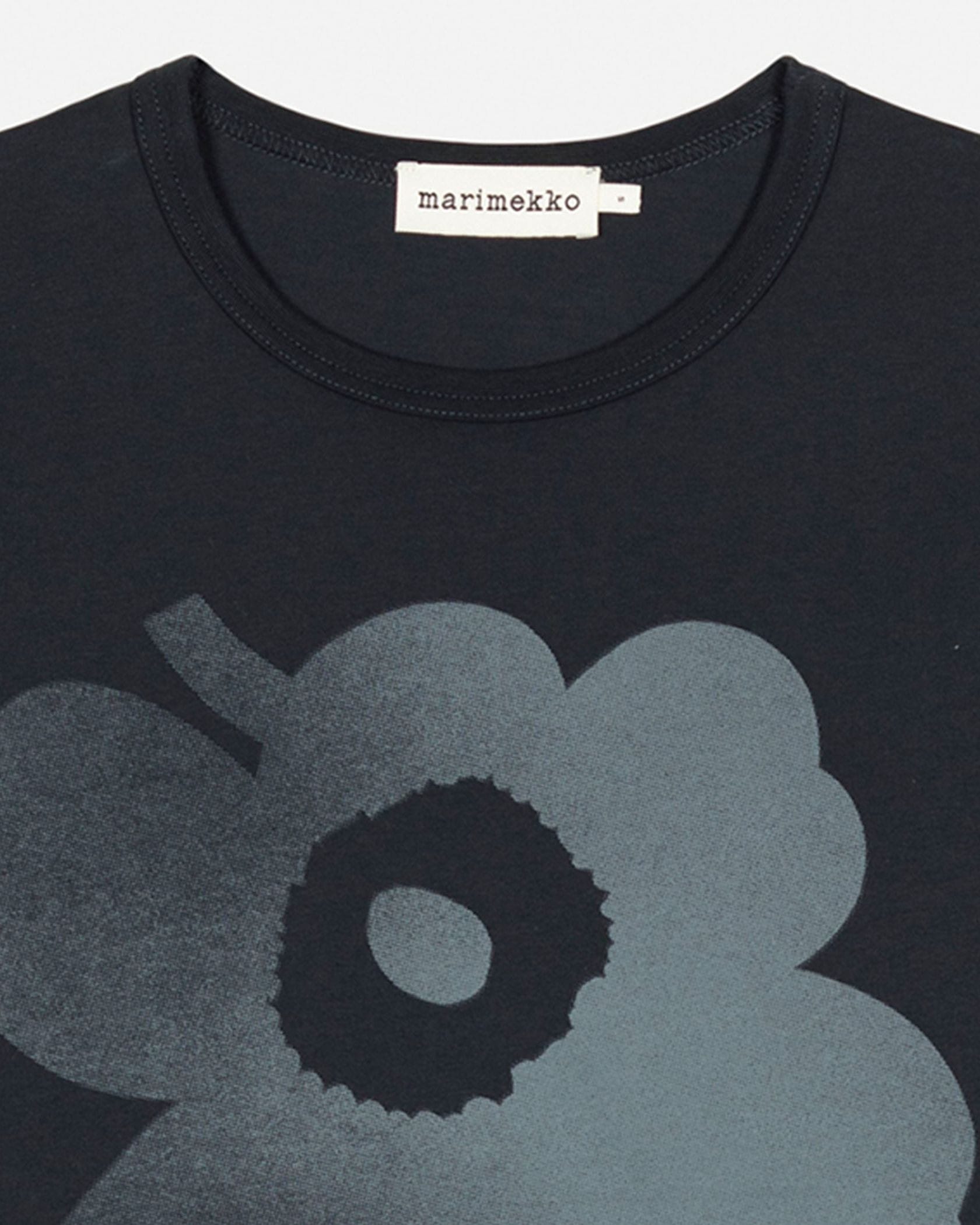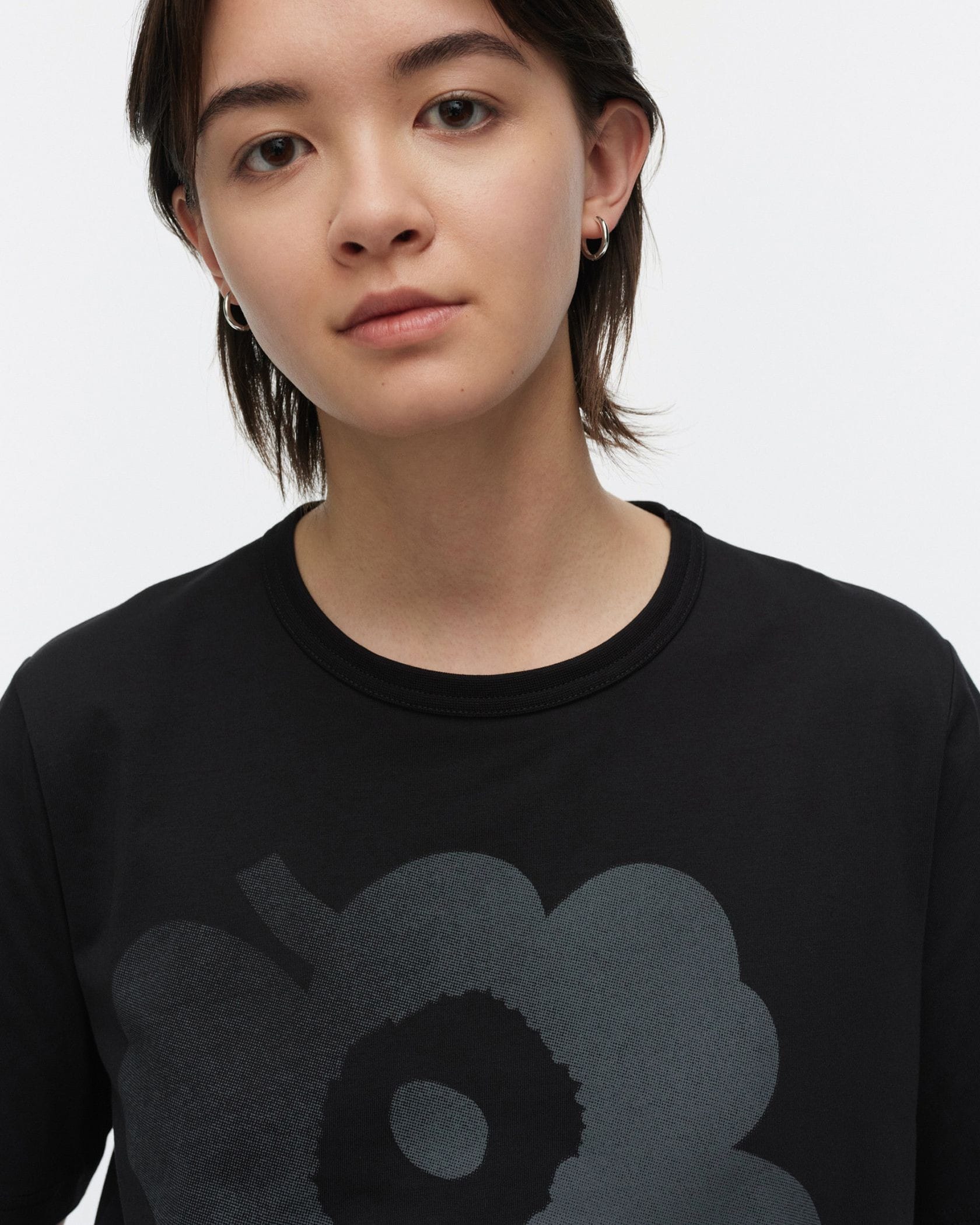 Unikkoのフラワーモチーフを大胆にプリントしたTシャツ。少しぼかしを加えることで、デザインにモダンなニュアンスをプラスしています。ゆったり着られるボックス型のリラックスフィットシルエットが、肩の力を程よく抜いた休日カジュアルを演出。裾はタックアウトでもバランスの良い着丈に調整しています。