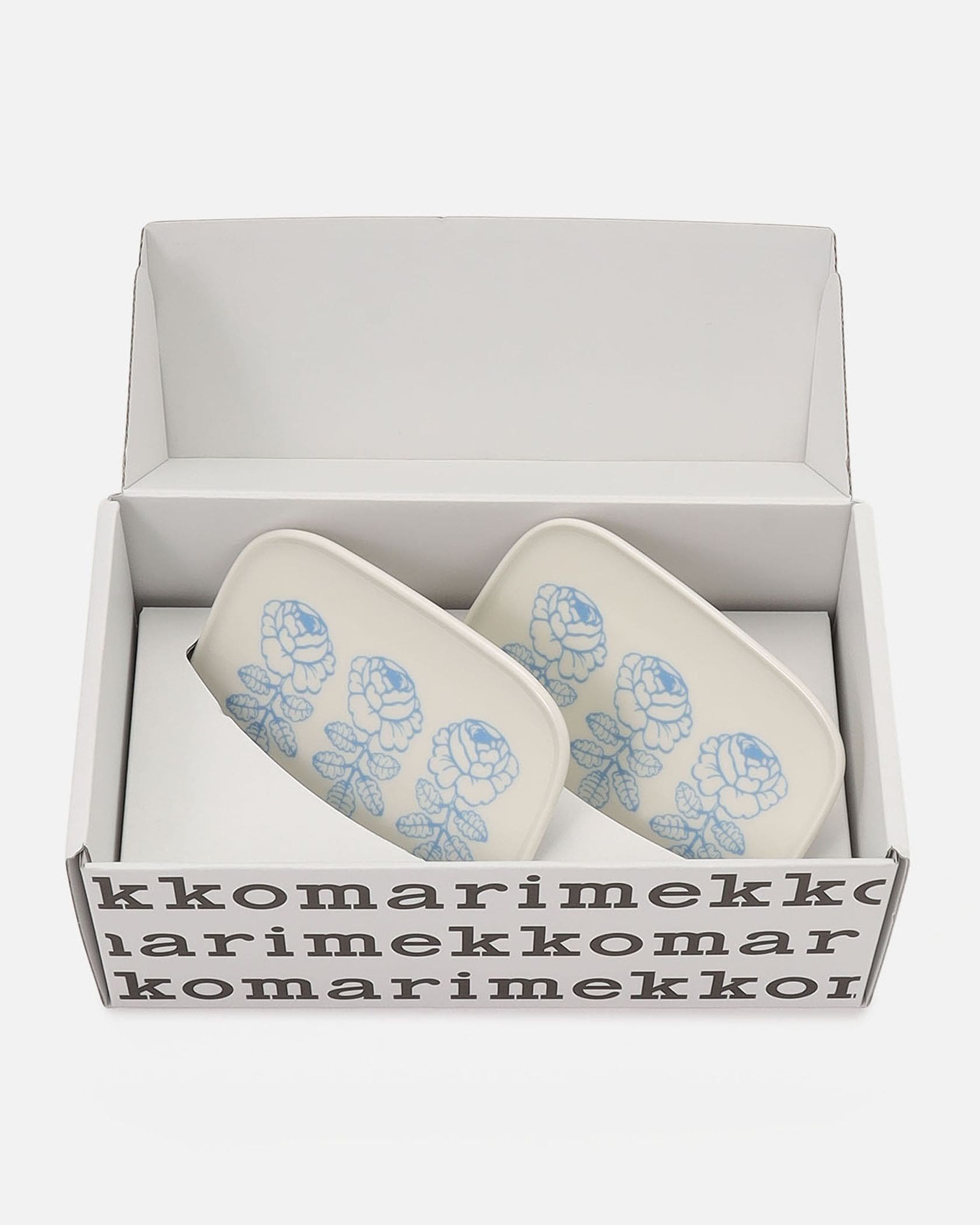 Marimekkoのロゴ入りボックスに収められた、特別感のあるギフトセットになります。中にはウェディングローズを意味する「Vihkiruusu」柄のプレートが2枚。結婚祝いの贈物選びに悩む人に、うってつけの一品です。美しく洗練された薔薇の花が、食卓に彩りを添えてくれます。