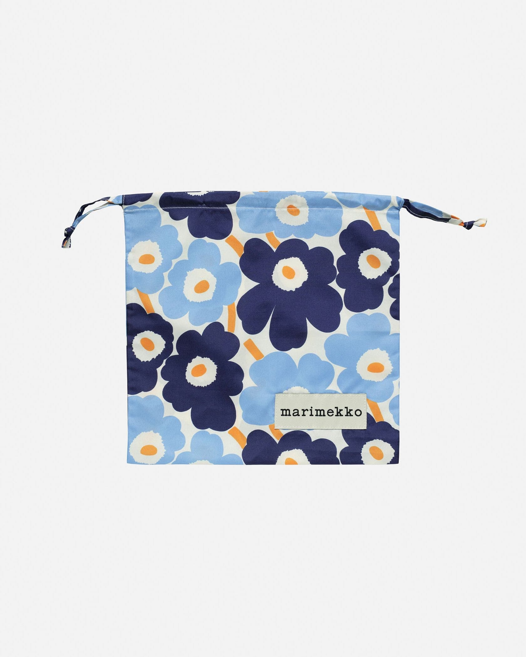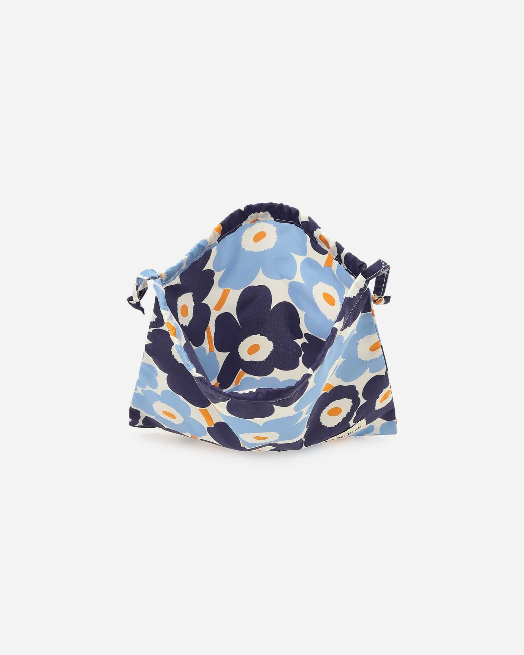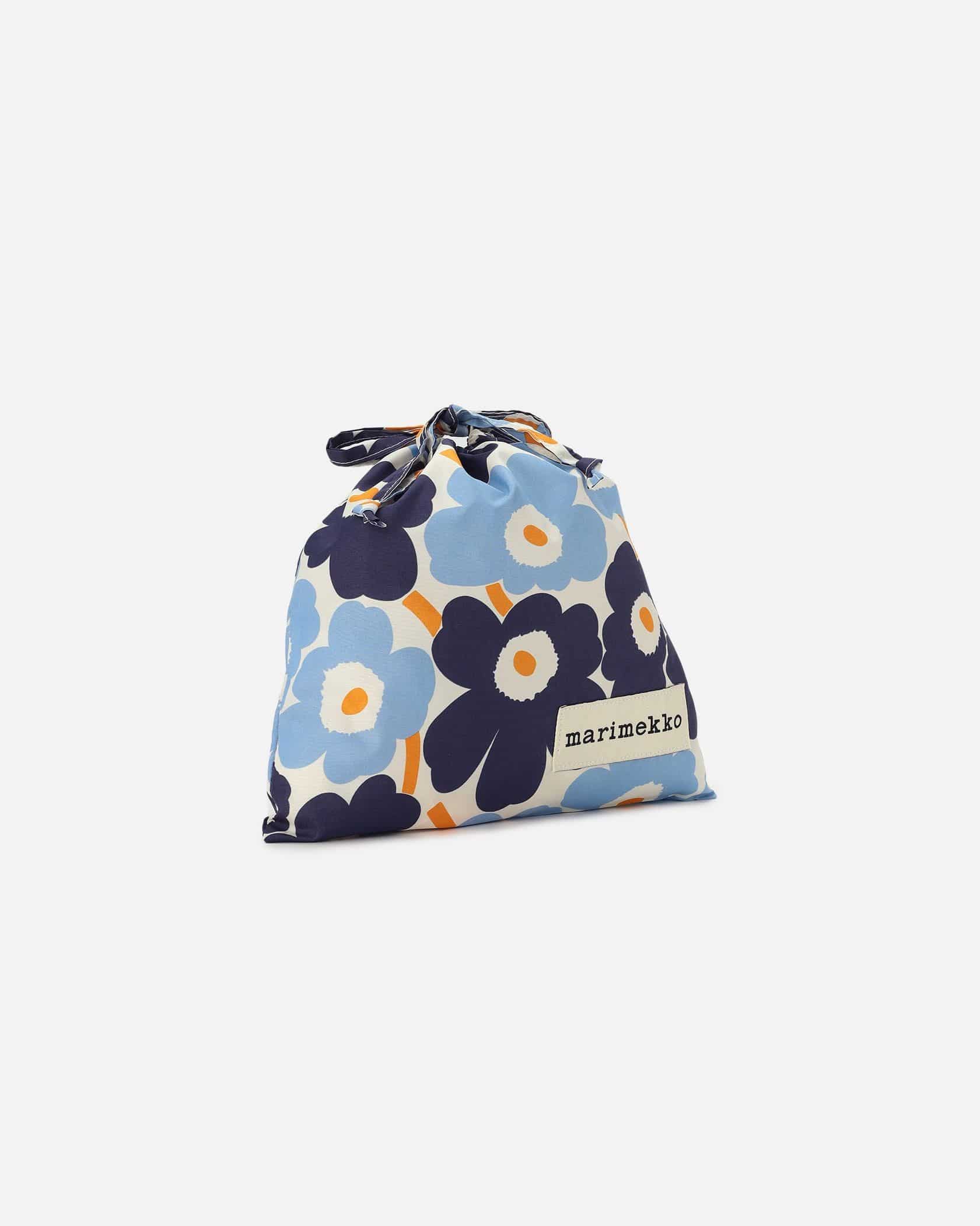 Marimekkoを代表するUnikko柄が華やかなデザインのミニ巾着バッグ。コロンとした丸みのあるフォルムが特徴。異なる2色のブルーのフラワーモチーフにオレンジのビビッドな差し色が印象的な色使い。大きめのロゴタグもスタイリッシュなデザインポイント。様々な用途で活躍する便利なアイテムです。