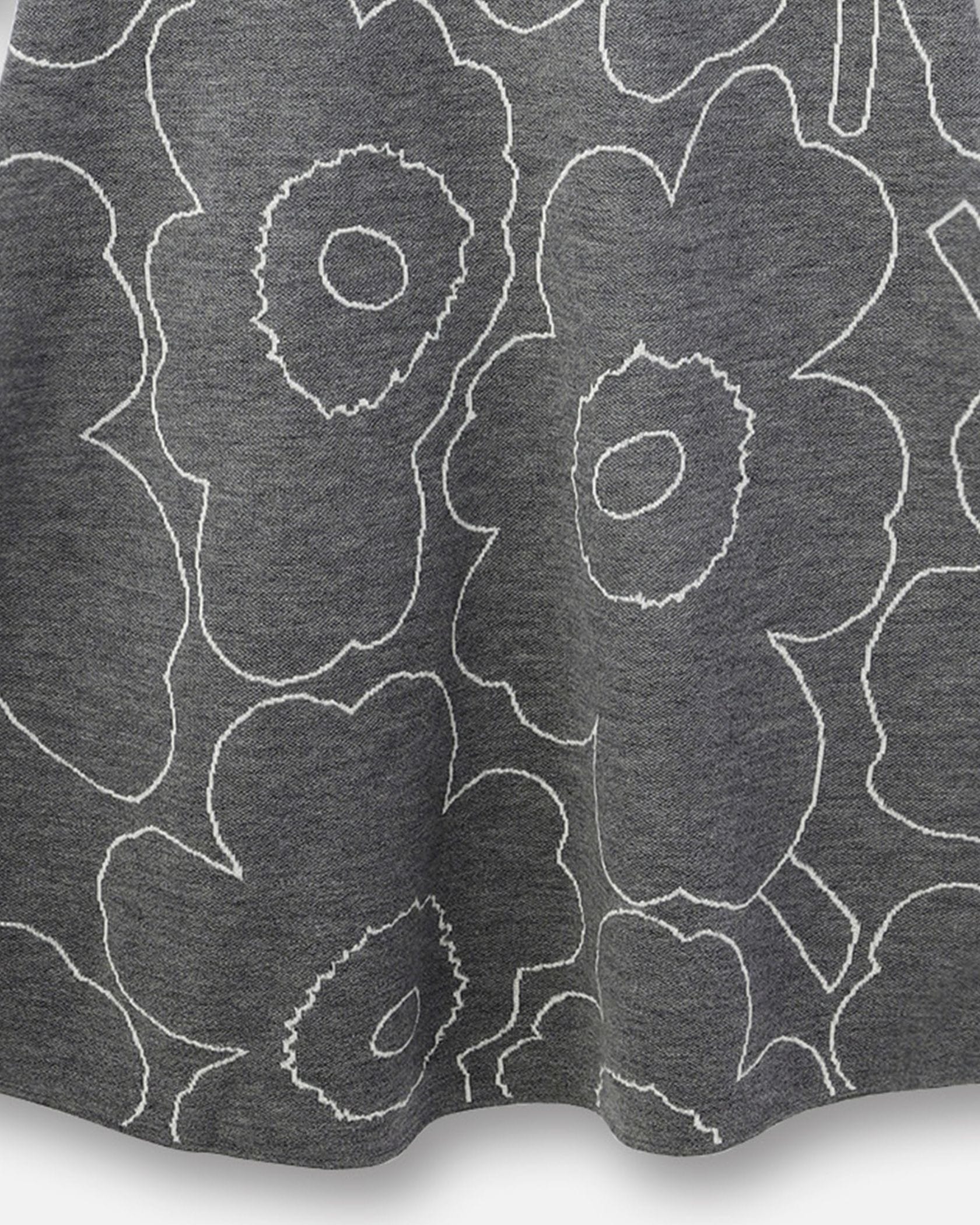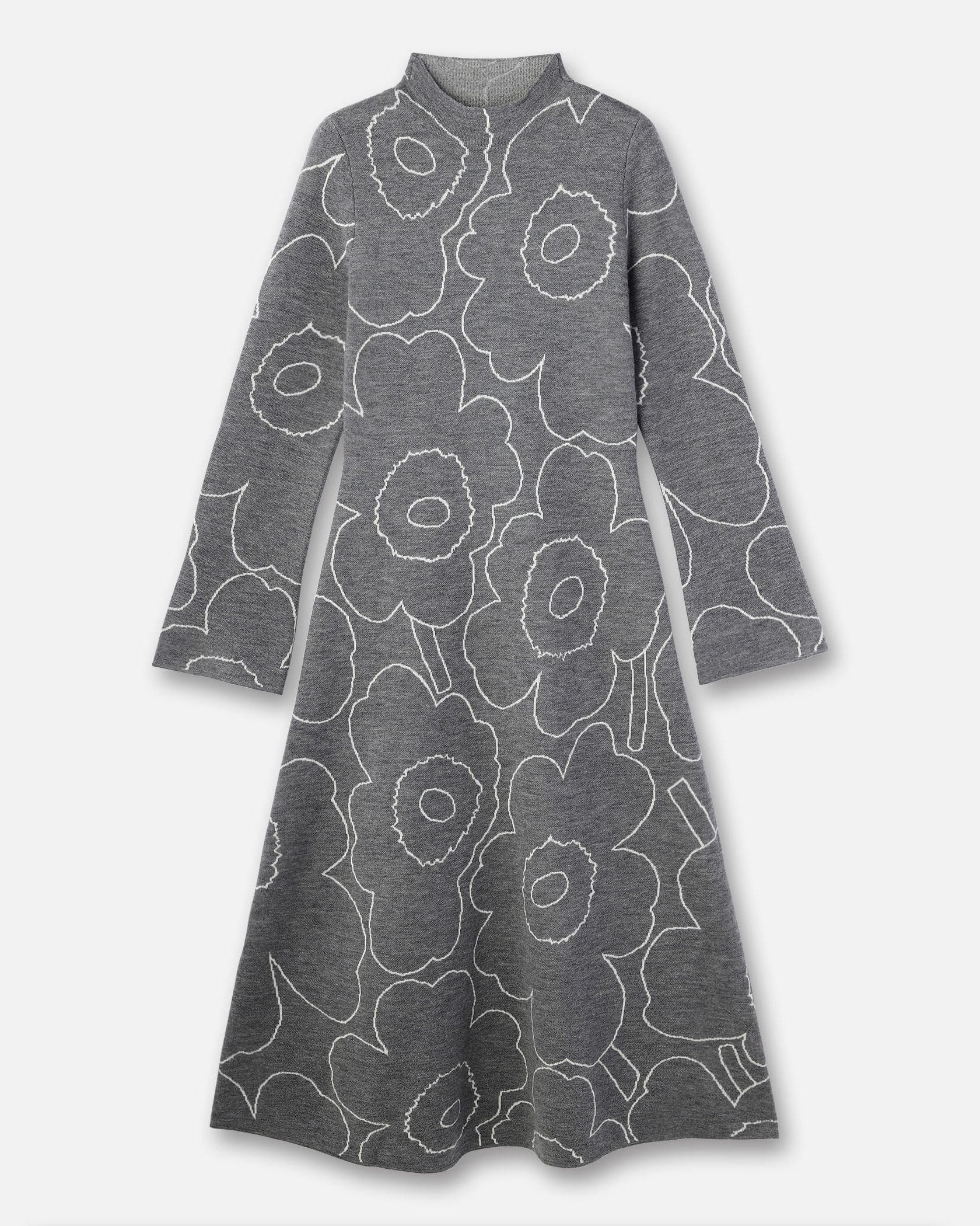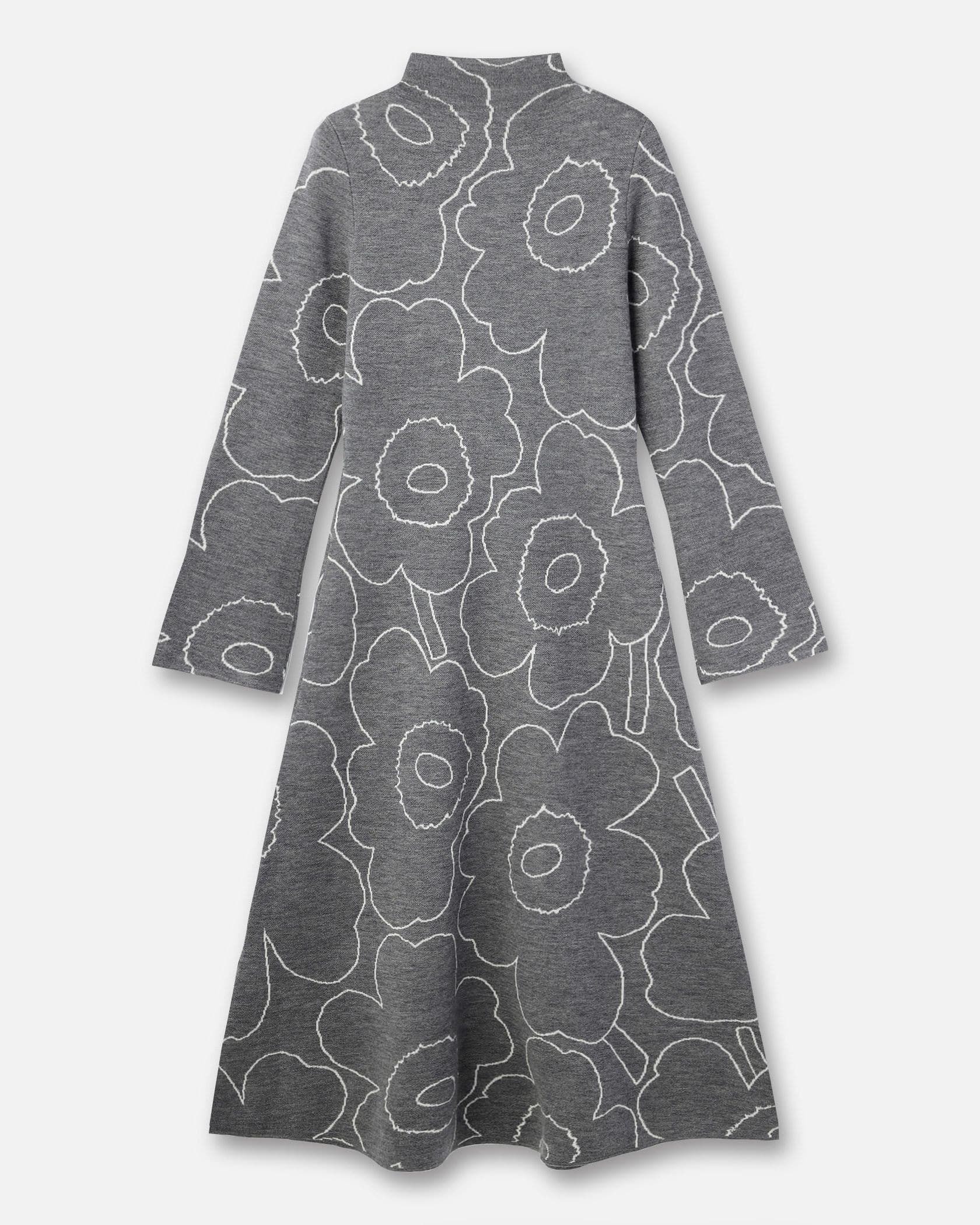Marimekkoを代表するUnikko柄をラインで表現したユニークなデザインのロング丈ワンピース。少し高めのネックライン、フレアな袖がスタイリッシュなデザインディティール。あたたかな毛混合ニット素材で秋冬らしいスタイリングにぴったり。一枚でエレガントなお出かけコーディネートが完成するアイテムです。