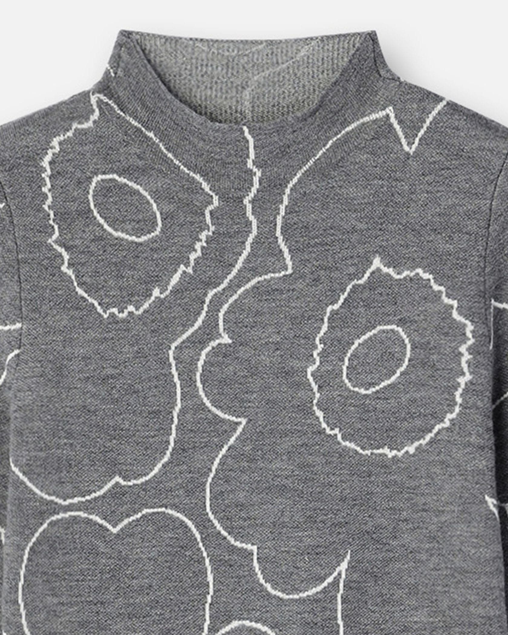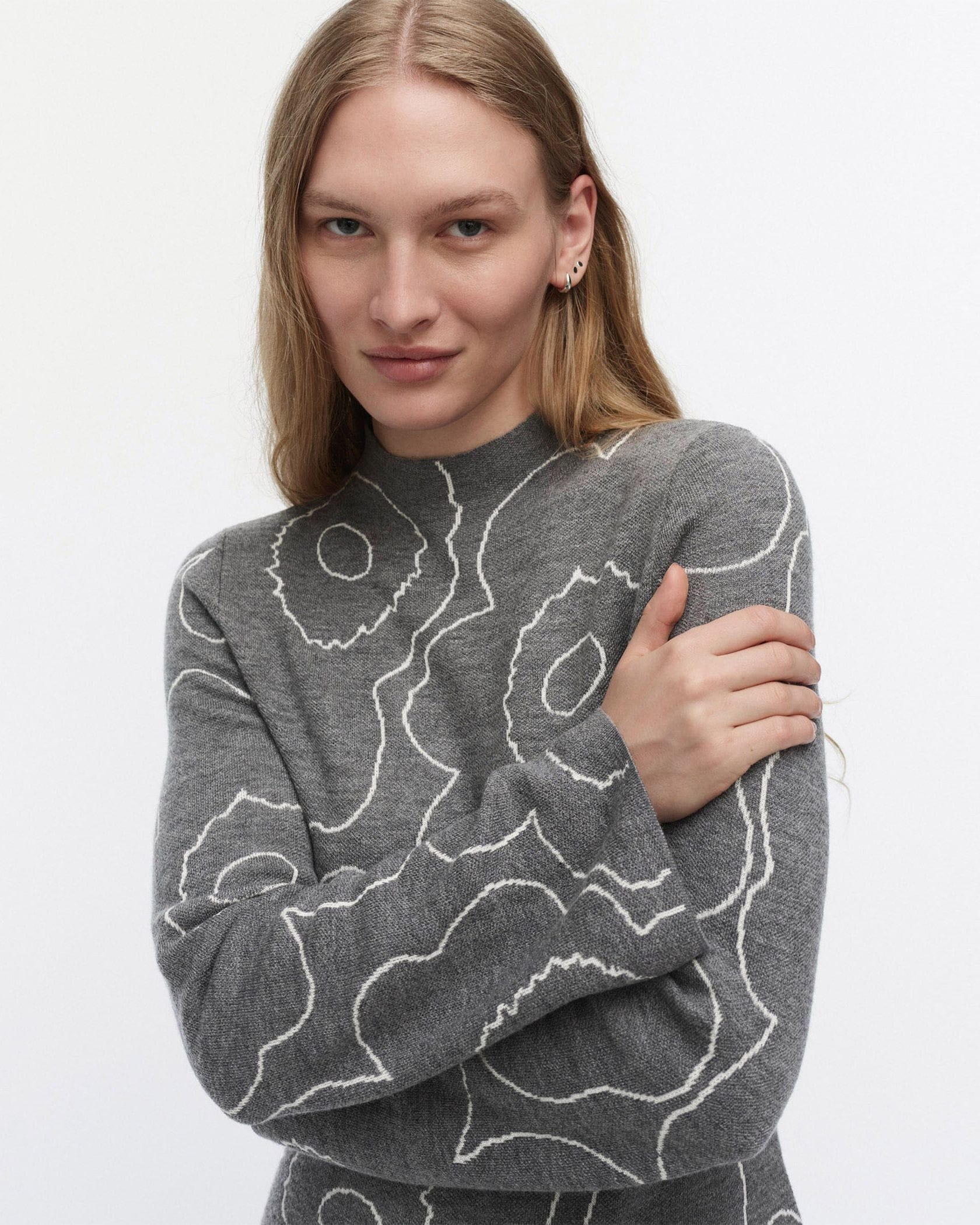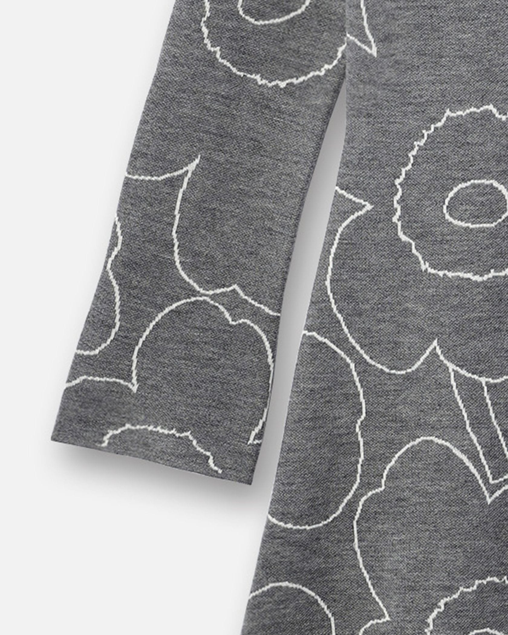Marimekkoを代表するUnikko柄をラインで表現したユニークなデザインのロング丈ワンピース。少し高めのネックライン、フレアな袖がスタイリッシュなデザインディティール。あたたかな毛混合ニット素材で秋冬らしいスタイリングにぴったり。一枚でエレガントなお出かけコーディネートが完成するアイテムです。