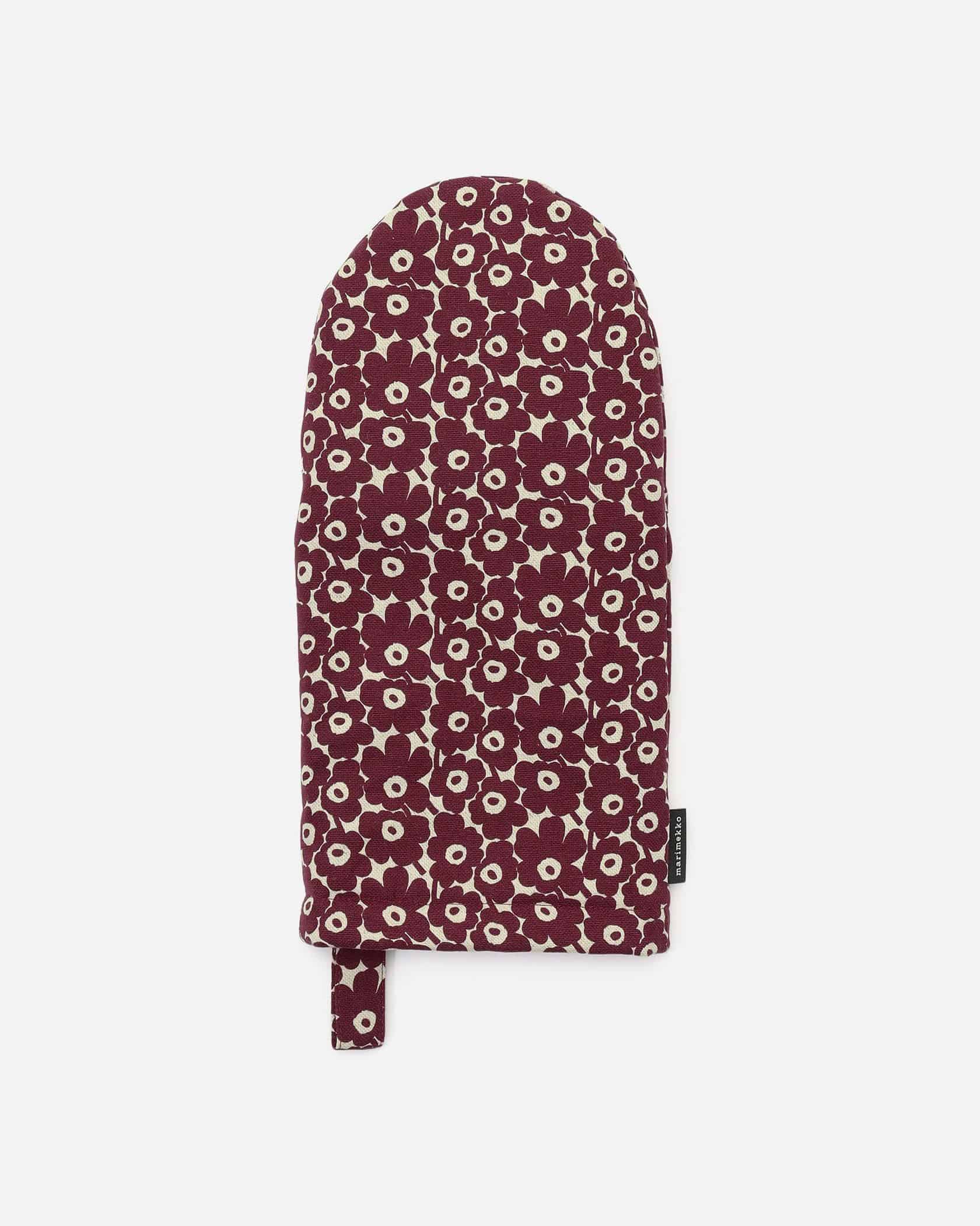Marimekkoを代表するUnikko柄のミトン。キッチンのインテリアが華やぐ細かなフラワーモチーフが魅力。サイドにはブランドタグのアクセントがさりげなくスタイリッシュなポイント。吊り下げに便利なループ付き、しっかりと熱を防ぐ中綿入りで実用面も抜群。デイリーに活躍するアイテムです。