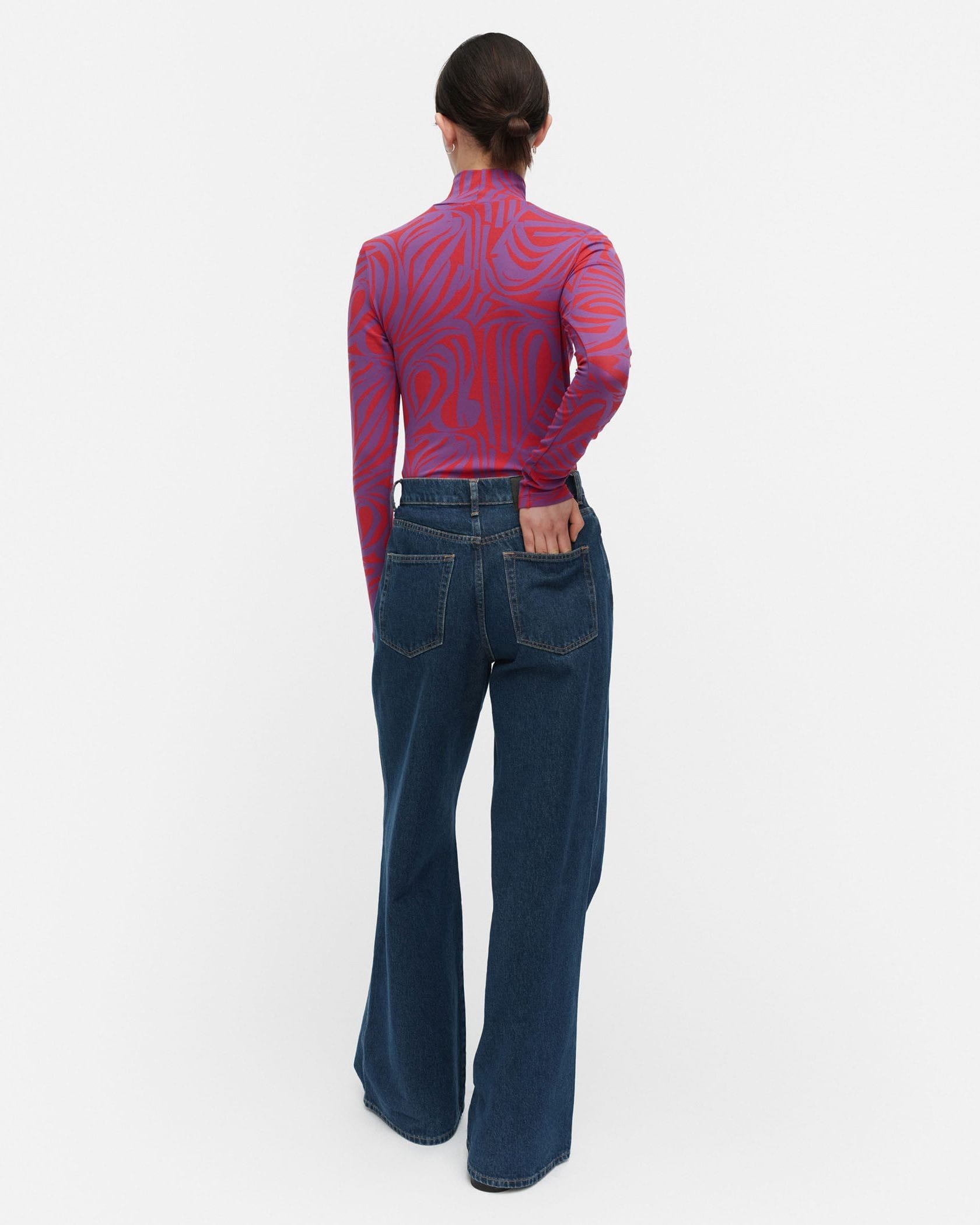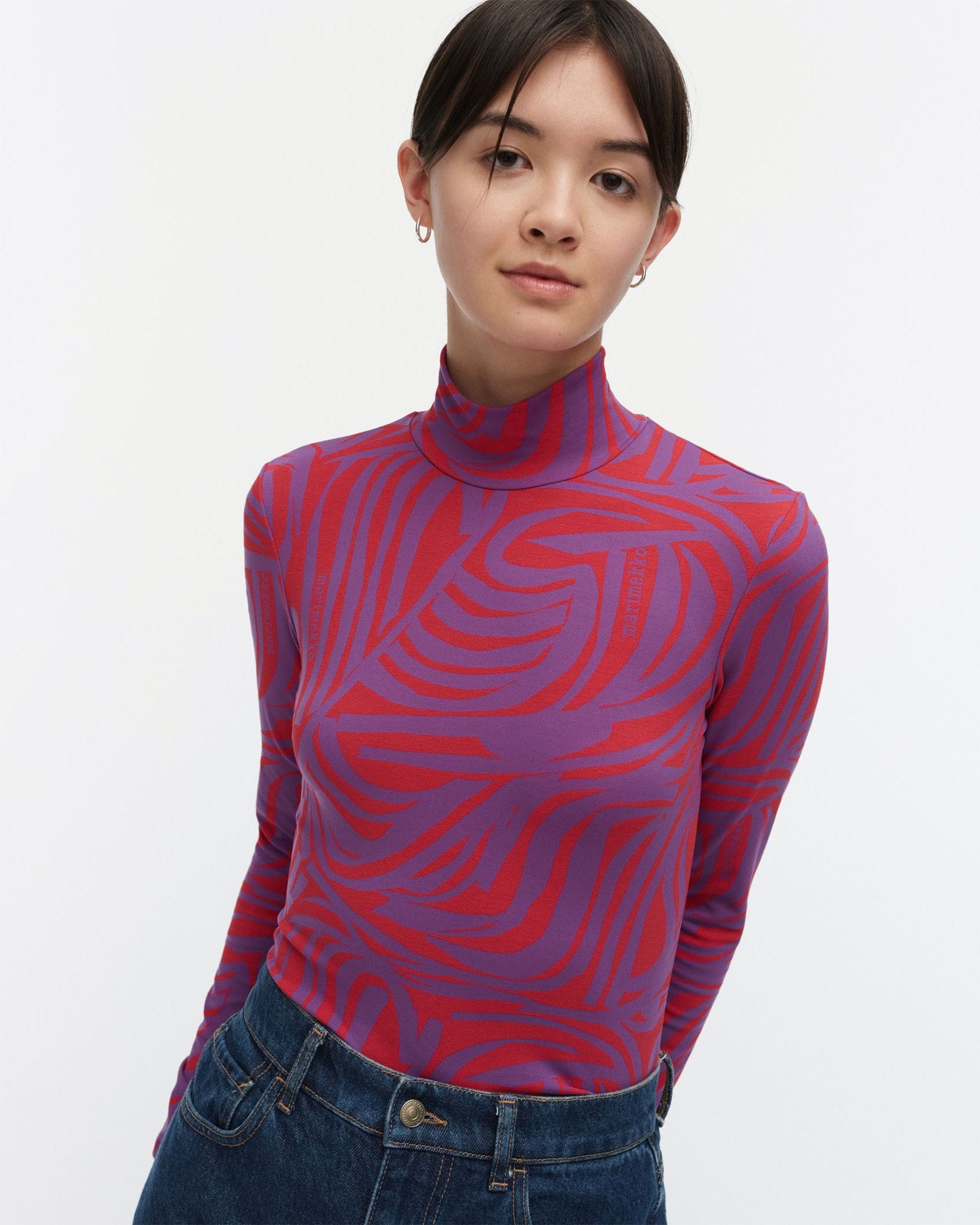 心地良いフィット感とストレッチ性で、快適さを実感できるハイネックの長袖シャツ。存在感のある「Jokuraita」柄は、いくつものストライプ柄を組み合わせたデザインです。意外性のある配色で、シンプルな一枚着にも最適。タイトフィットのため、ジャケットのインナーにはもちろん、ジレやジャンパースカートとのレイヤードなども楽しめます。