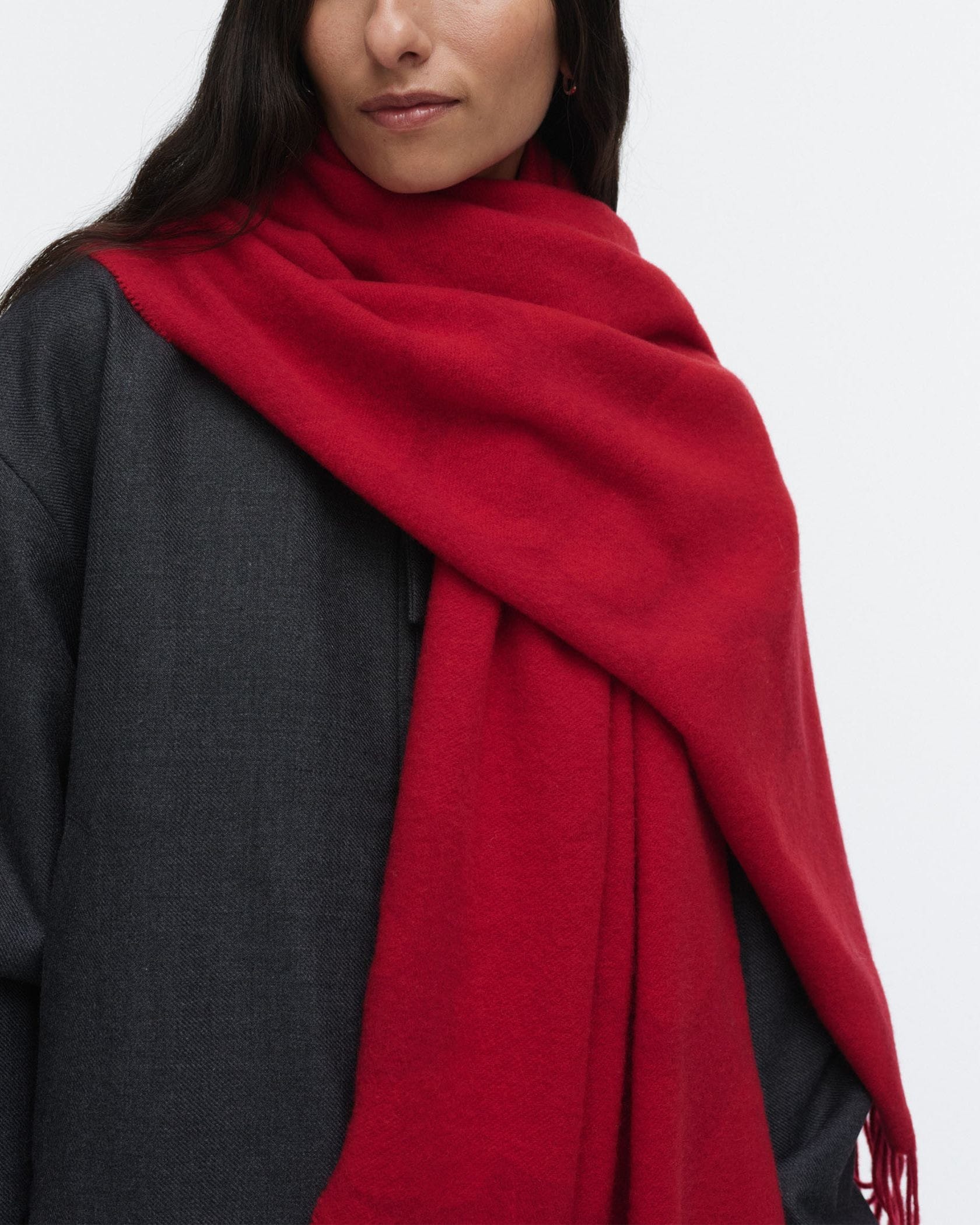 ふんわりとした質感で暖かい、大判サイズのスカーフ。サイドに施した長めのフリンジが、巻いたときに動きをプラスします。利便性に優れた大判サイズで、肩に掛けたり、首もとにボリュームたっぷりに巻いたり、自己流のアレンジで取り入れることのできるアイテムです。ユニセックスなアイテムは冬のギフトにも一押し。