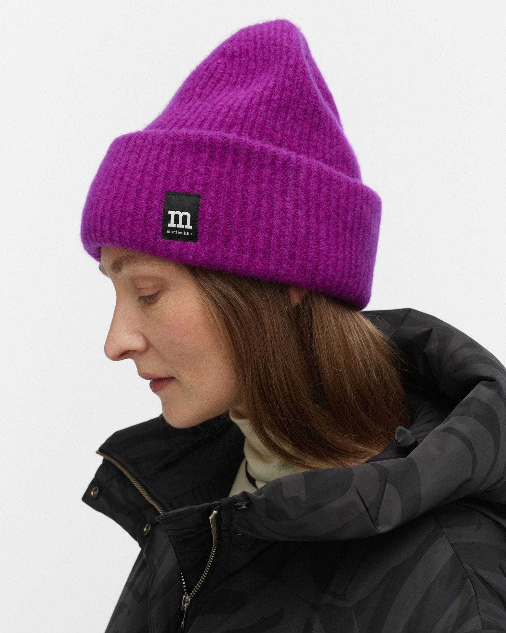 トレンドに左右されない、シンプル&ベーシックなニットビーニーです。ツンと角が立ったような長めのタイプで、折り返し部分にはアクセントのロゴラベルがあしらわれています。耳元まで目深にかぶれば、耳当て要らずに。Marimekkoならではの柄物ウェアにも合わせやすい一品です。