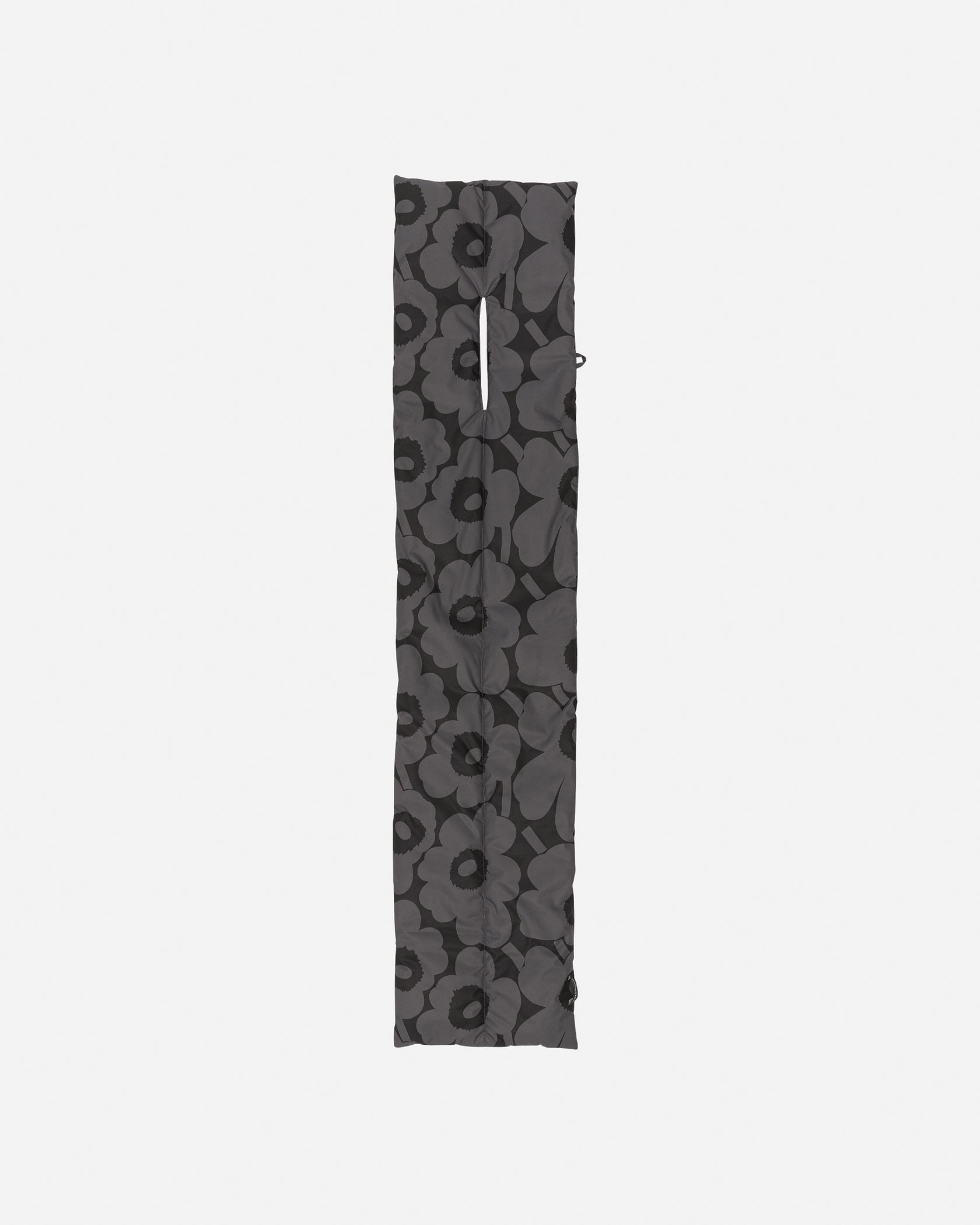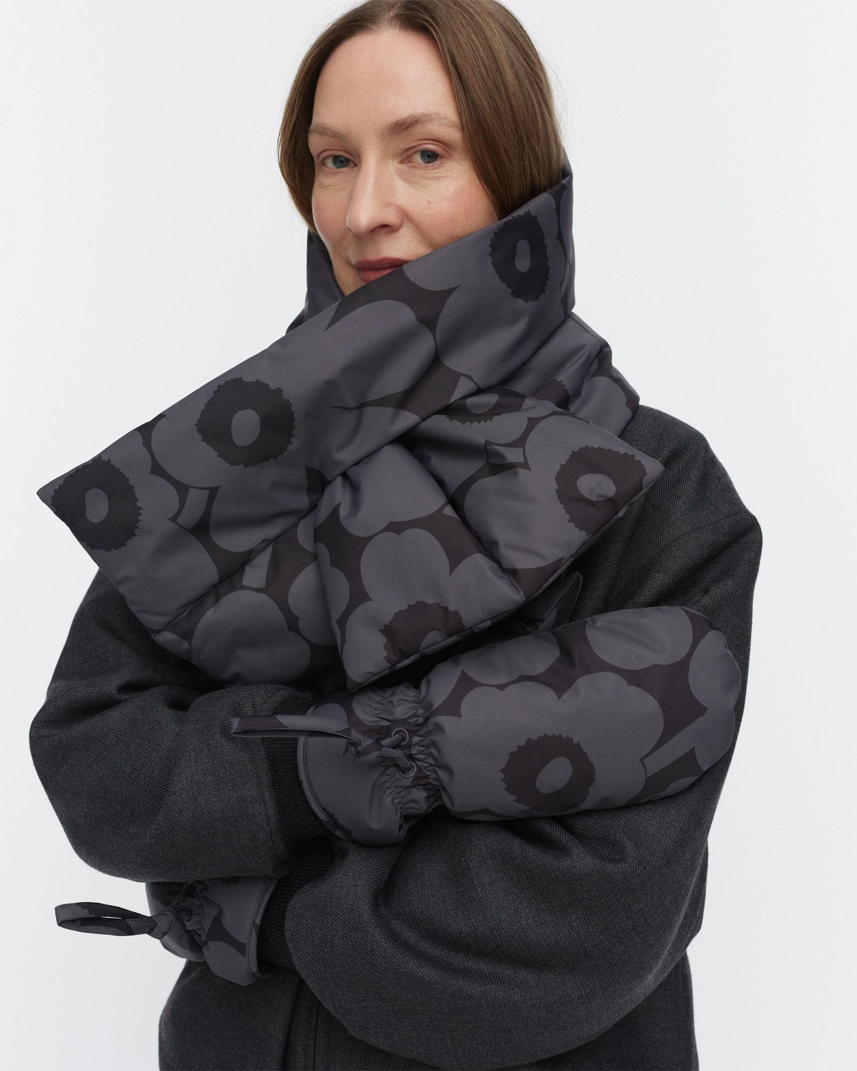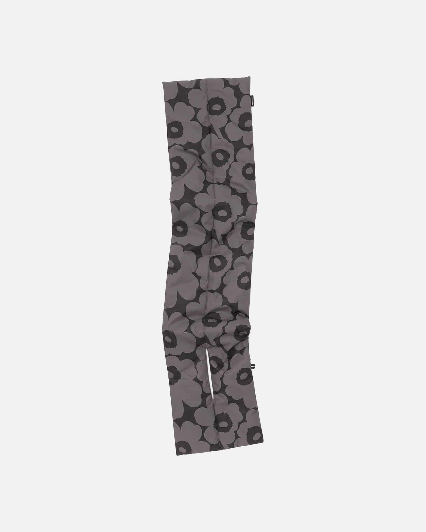 中わた入りのパデッドスカーフです。端を差し込むスリット入りで、着脱もスムーズなデザイン。軽くて暖かく、外出時の防寒具としてはもちろん、冷えの気になる室内でもシャツやニットの上から巻くことができます。落ち着いたカラートーンの「Unikko」柄です。ギフトとしてもおすすめの冬小物。