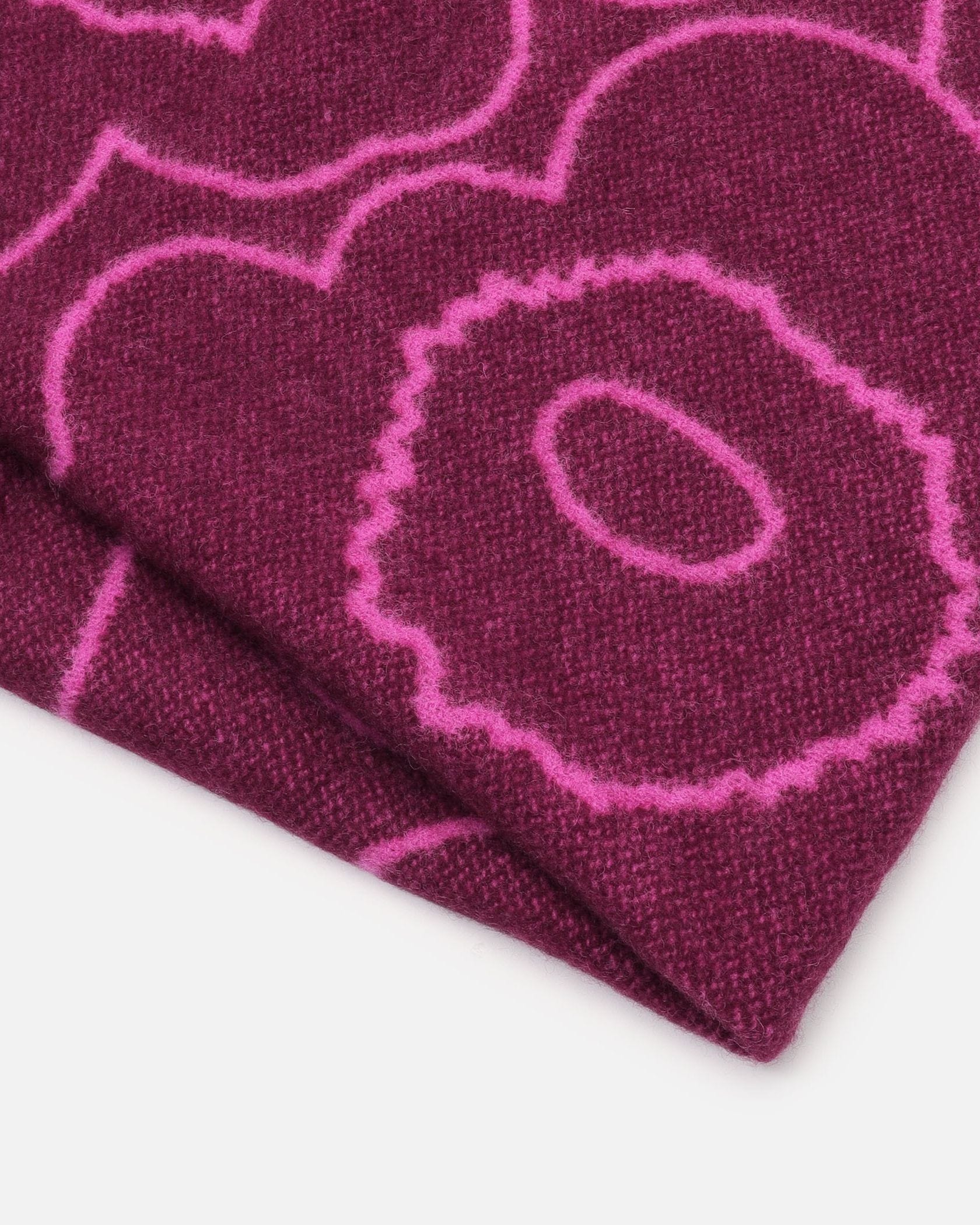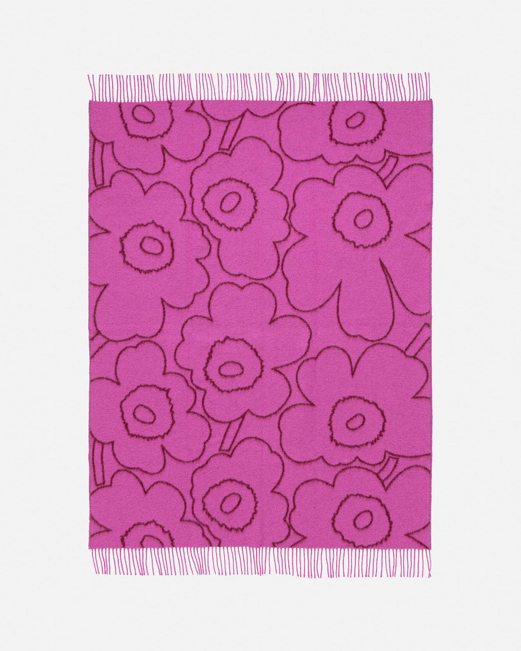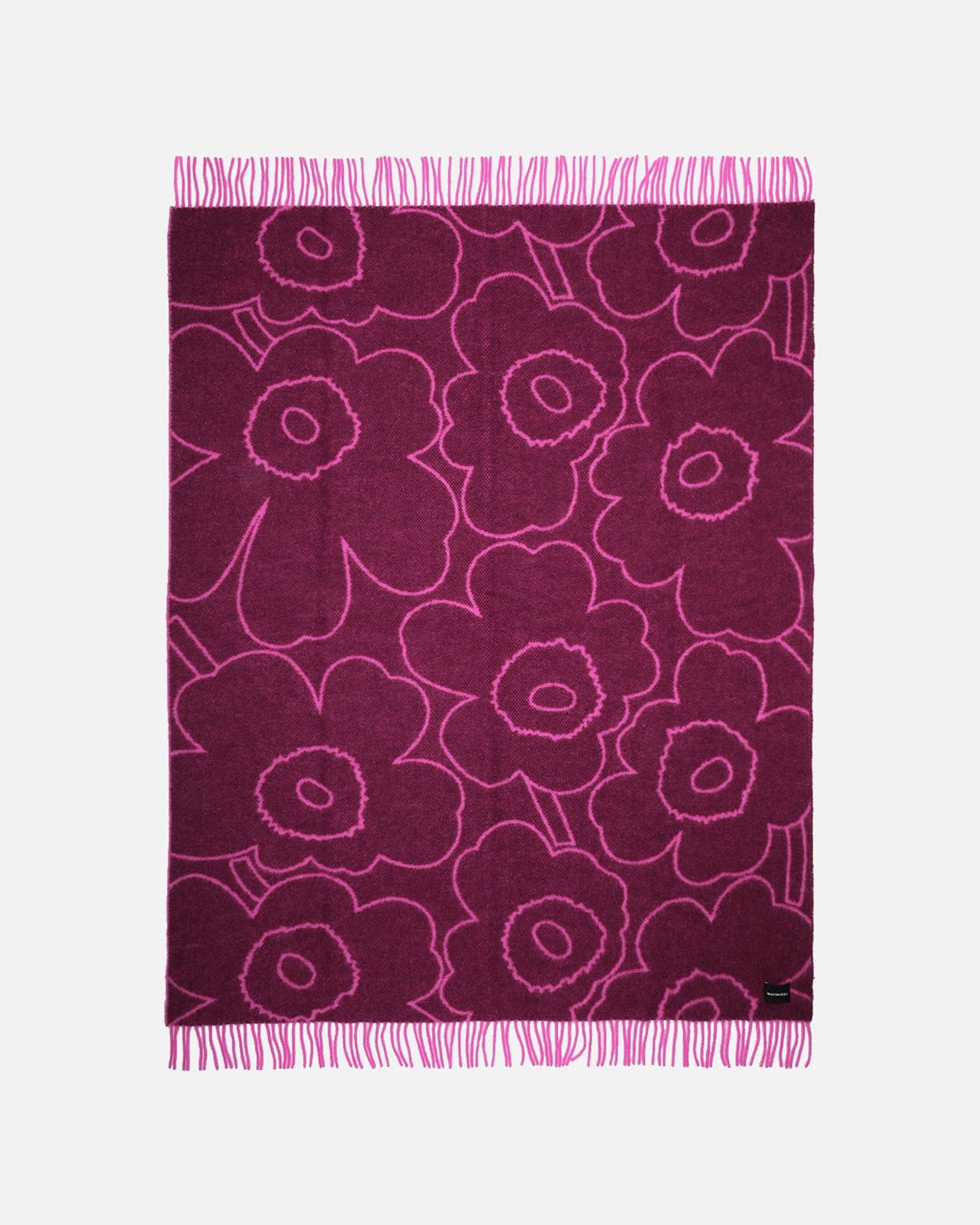 Unikko柄のブランケット (130×170cm)。フラワーモチーフをラインで表現したスタイリッシュなデザイン。毛100%のあたたかな生地感で秋冬シーズンにぴったり。表と裏の異なるカラーを楽しめるデザイン。裾のフリンジも華やかなデザインアクセント。インテリアコーディネートが明るくなるアイテムです。