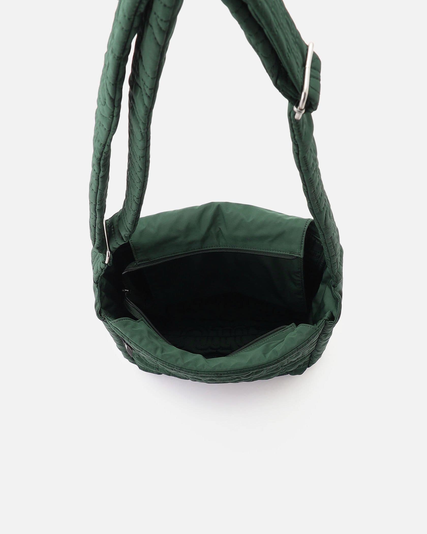 ブランドロゴをキルティングで表現した素材を用いたショルダーバッグ。ロゴのモダンさに呼応するようなスクエアフォルムで、中性的な空気感に仕上げています。マチがしっかりあるため、収納力も抜群。ジップで中身をしっかりガードできます。ストラップもキルト仕立てで優しい肌当たり。肩に優しくフィットします。