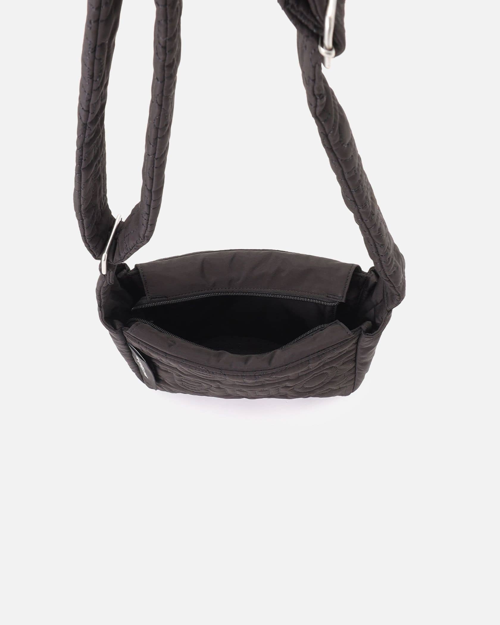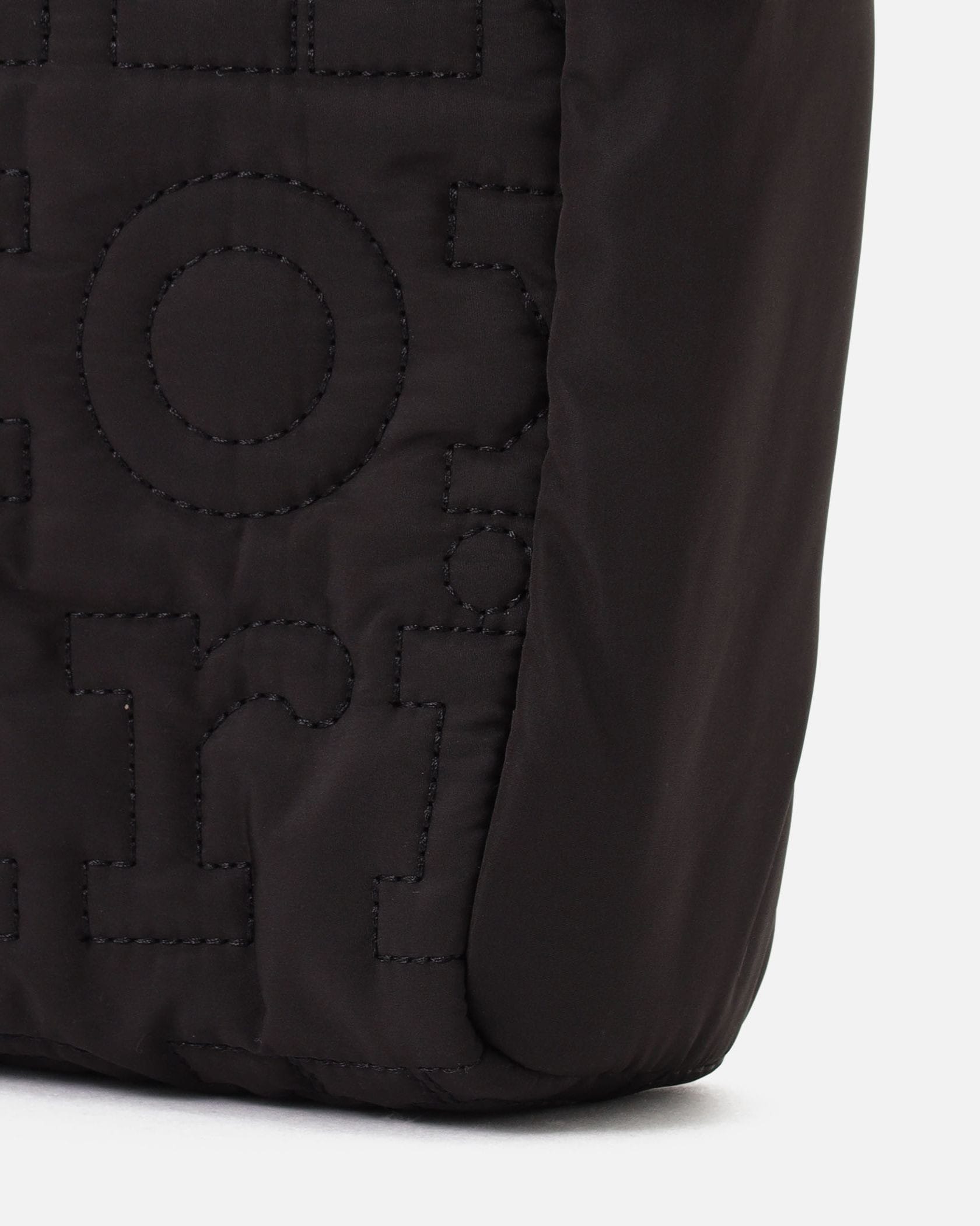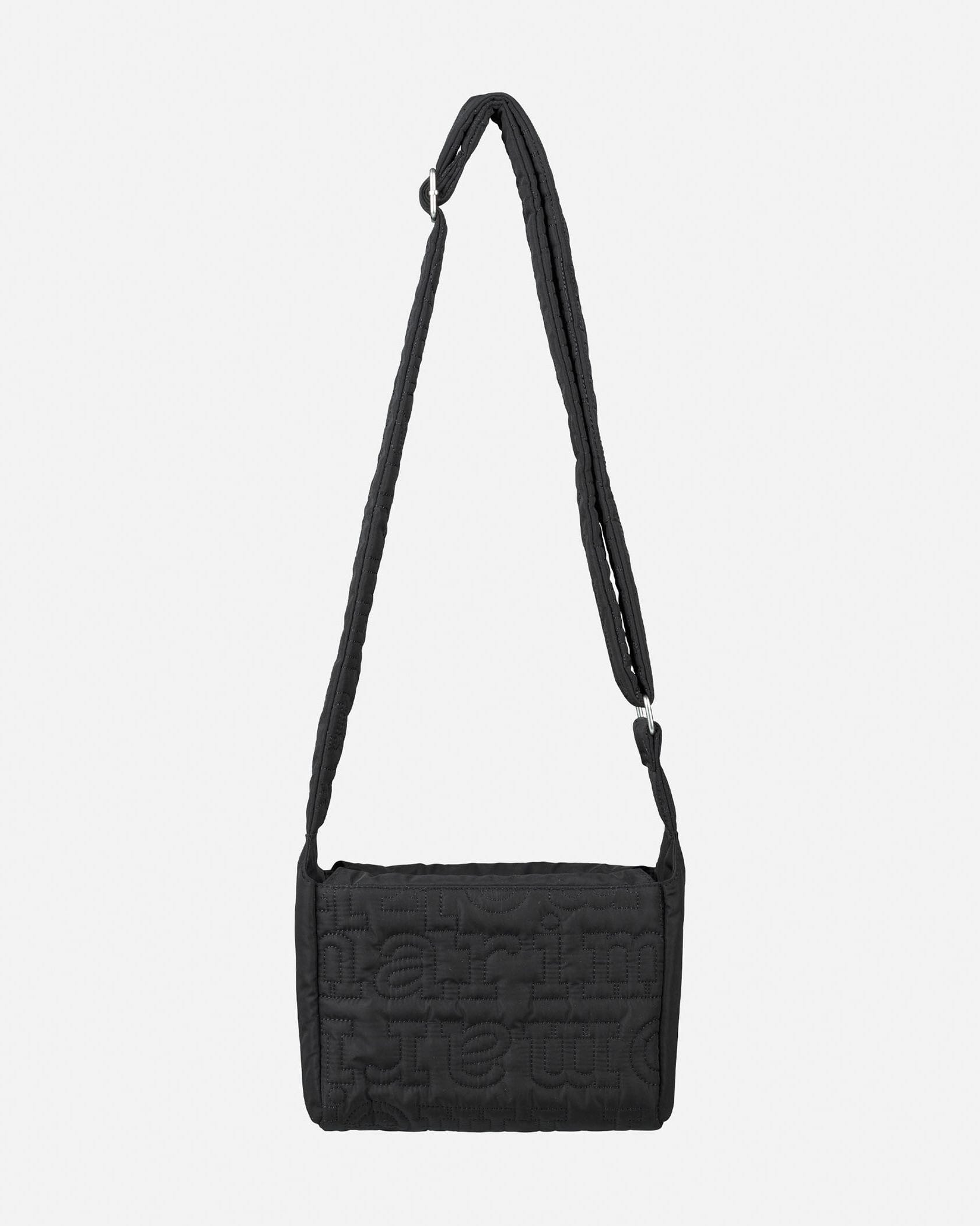 一目でそれとわかる、モダンなレタードロゴをキルティングで表現した、パファーな素材感のショルダーバッグ。コンパクトながらもしっかりとしたマチがあり、収納力の高さも満点です。斜め掛けできるストラップもキルティングになっており、肩に食い込みにくい仕様。旅行やレジャーにも活躍するアイテムです。