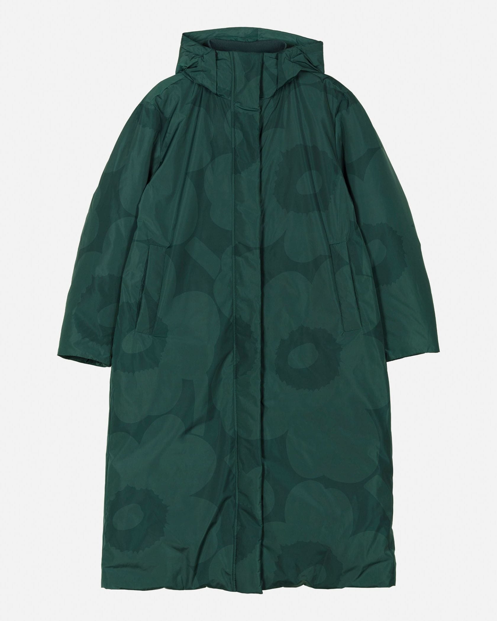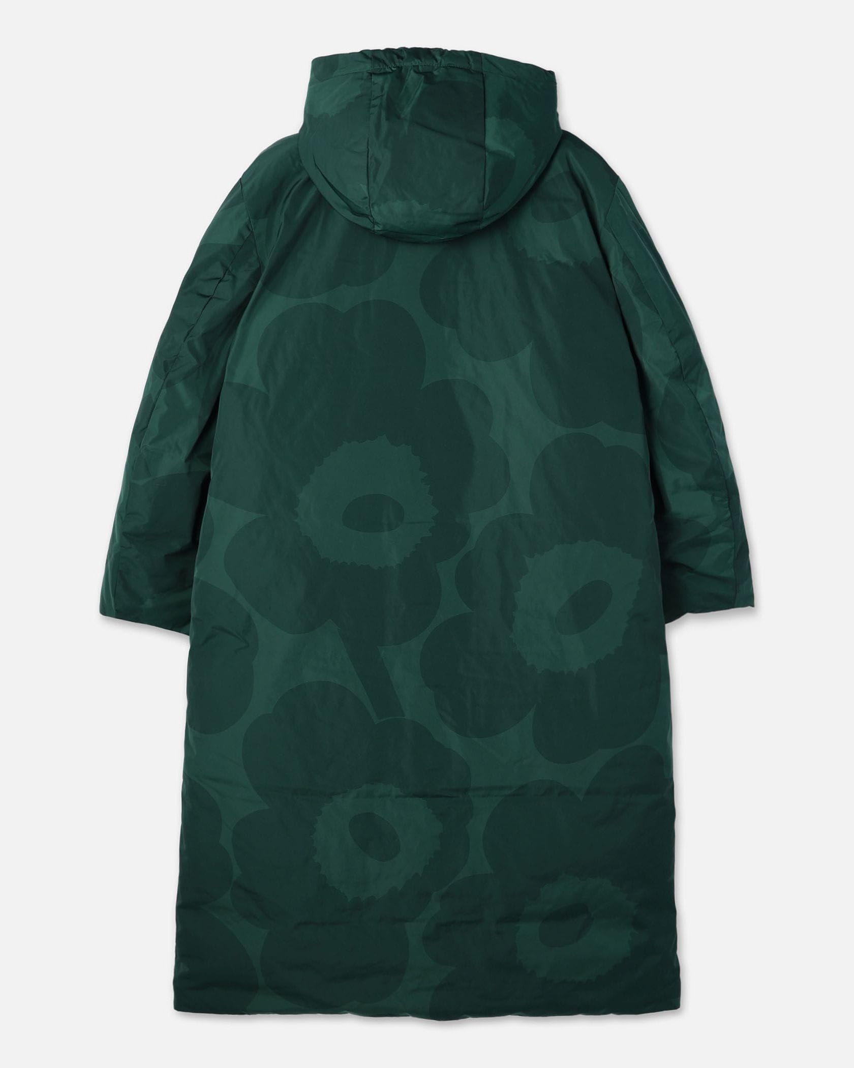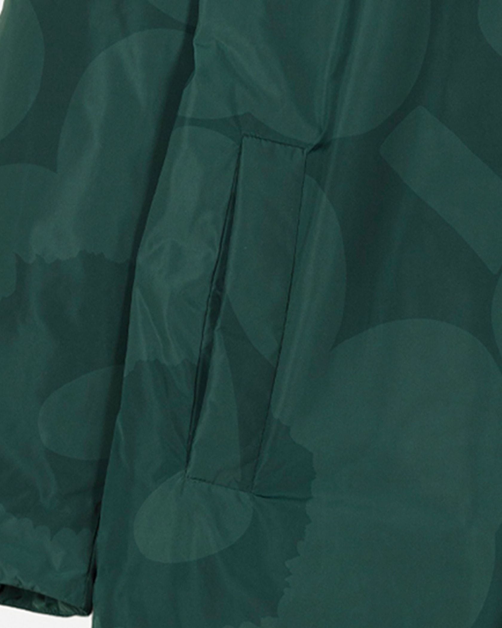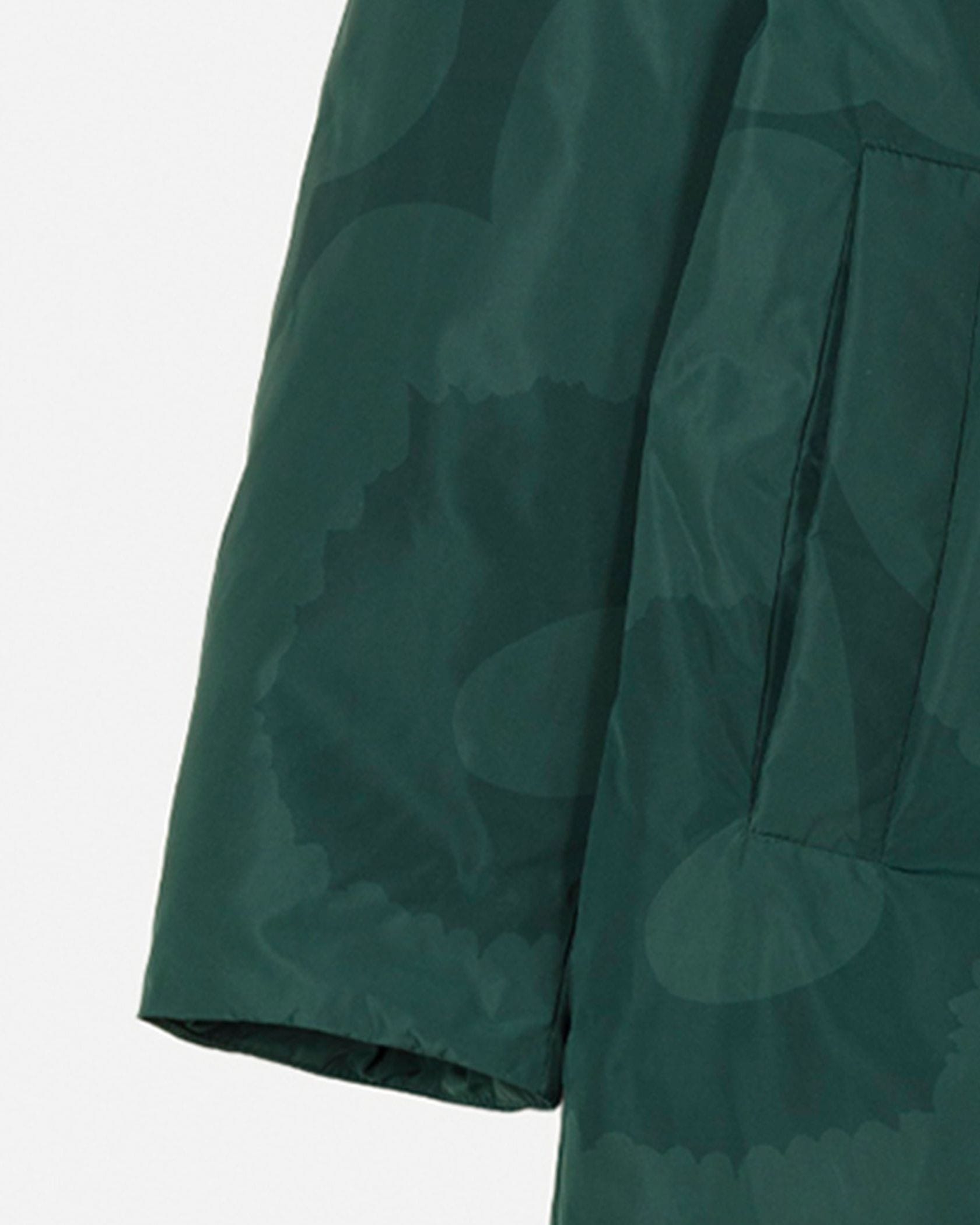 大ぶりなUnikko柄をあしらったフード付きダウンコート。たっぷりのダウン&フェザーを中に詰めており、保温性抜群のアイテムです。膝下までのロング丈と首まわりを覆うハイネックも体を寒さから守ります。装飾を抑えた大人らしいデザインで、カジュアルからキレイめまで様々な着こなしと好相性です。
