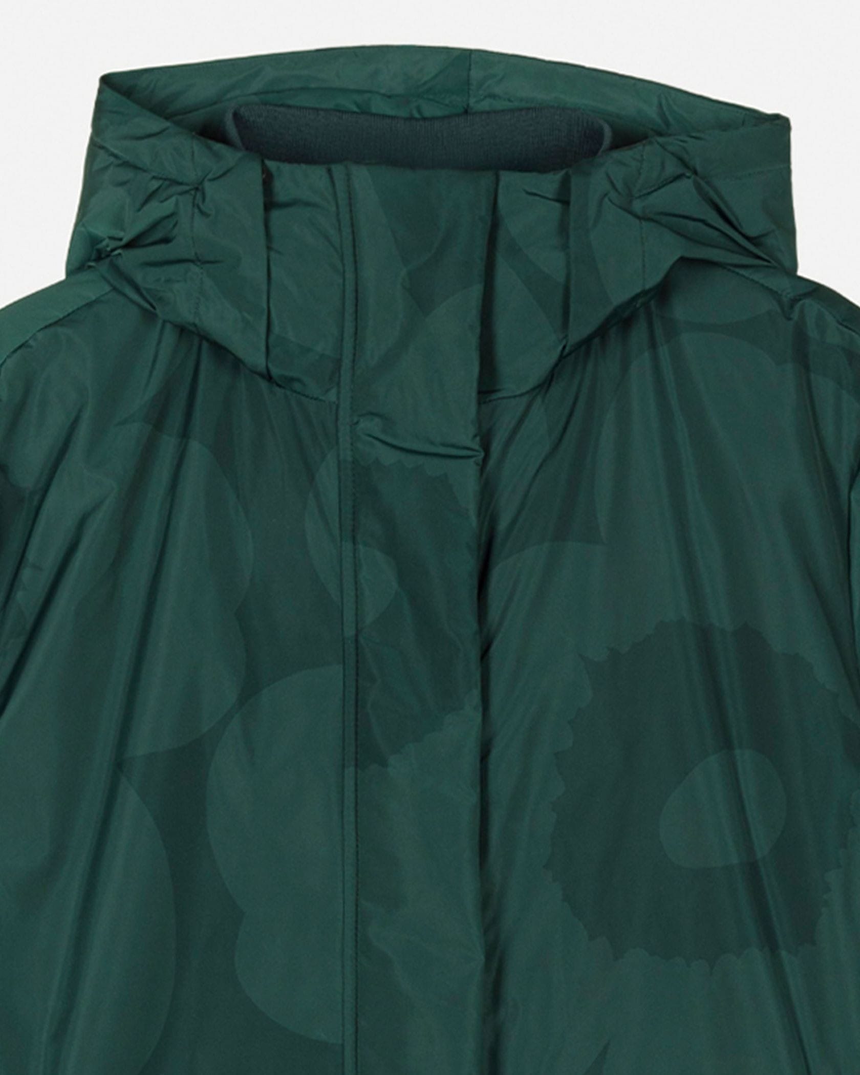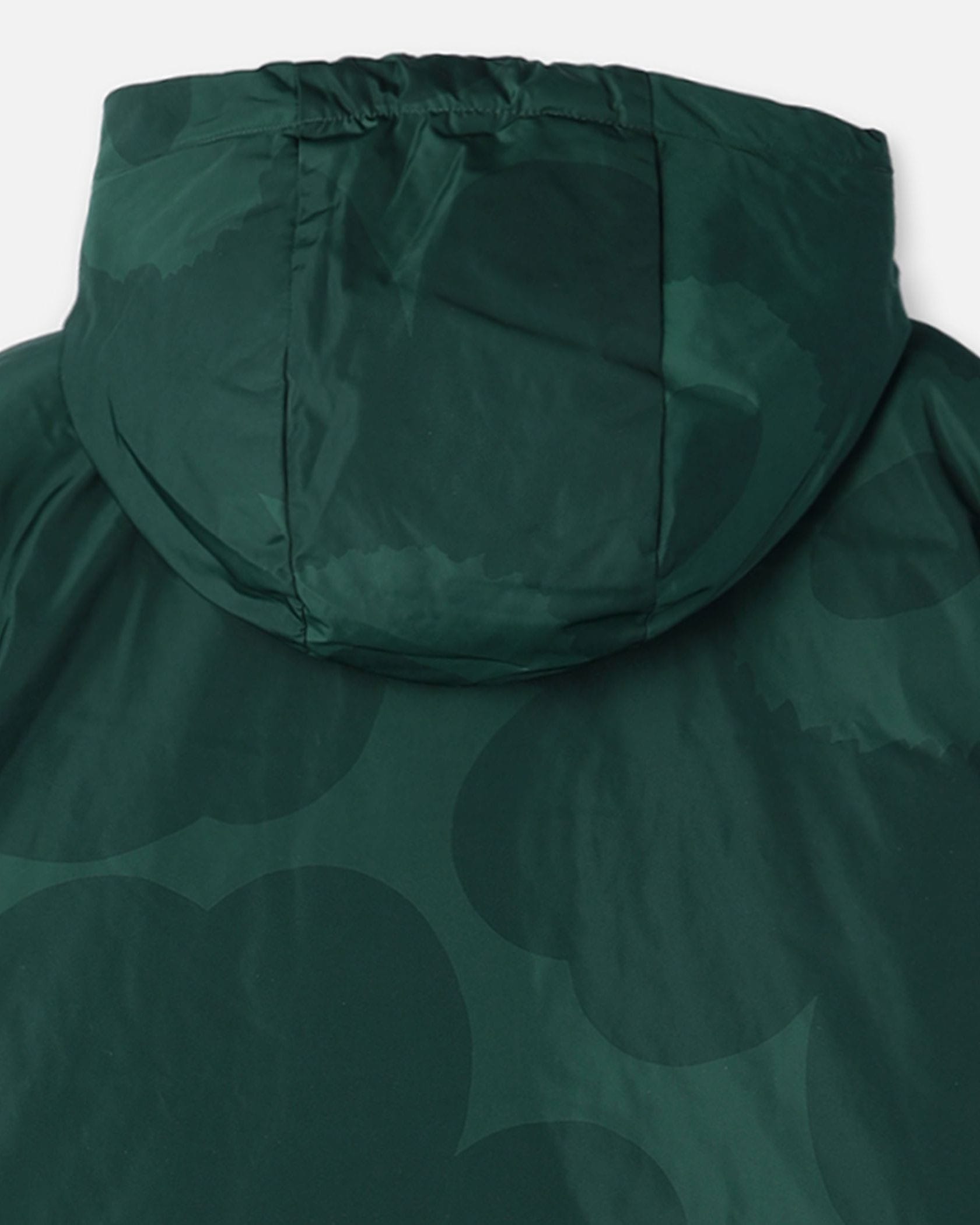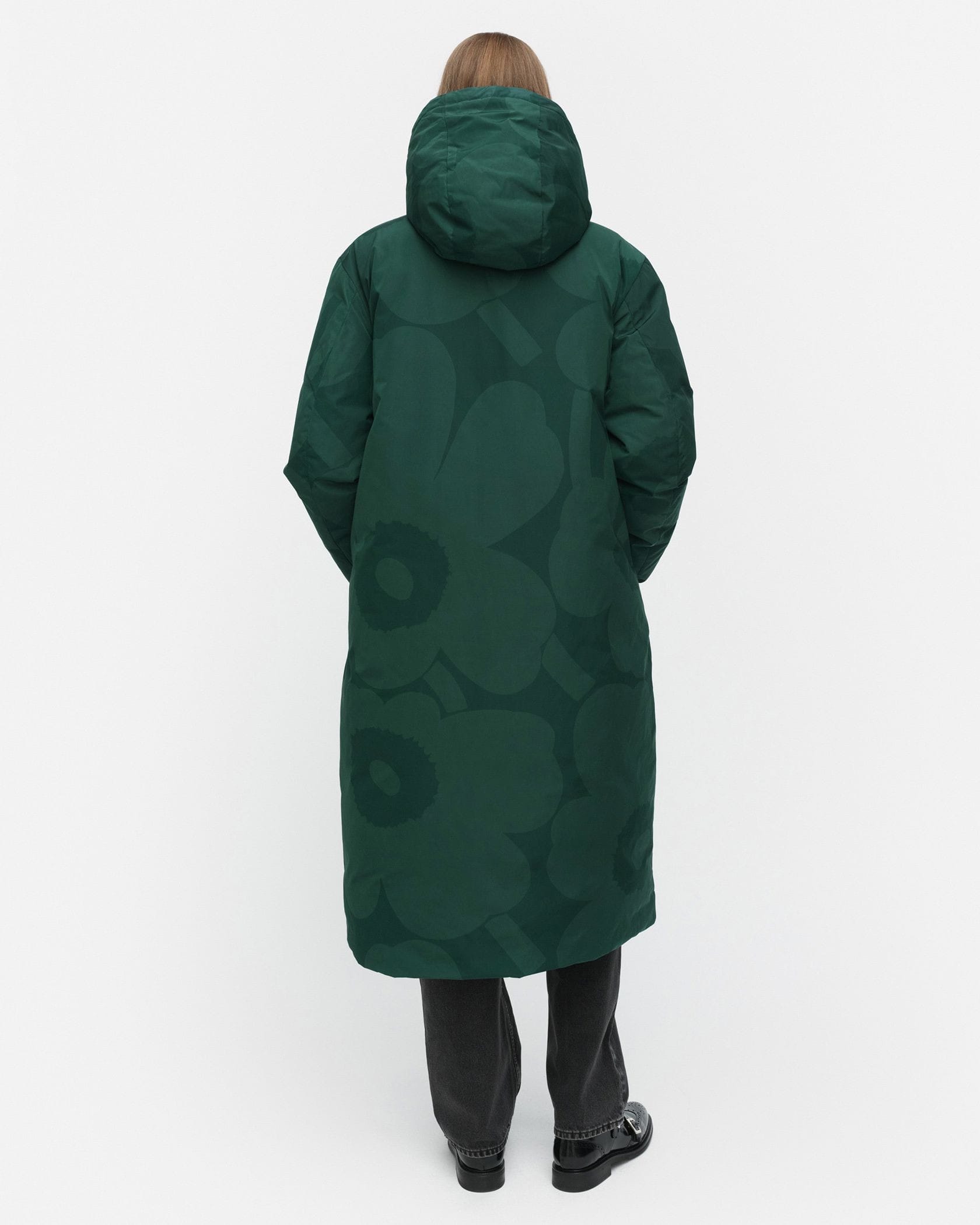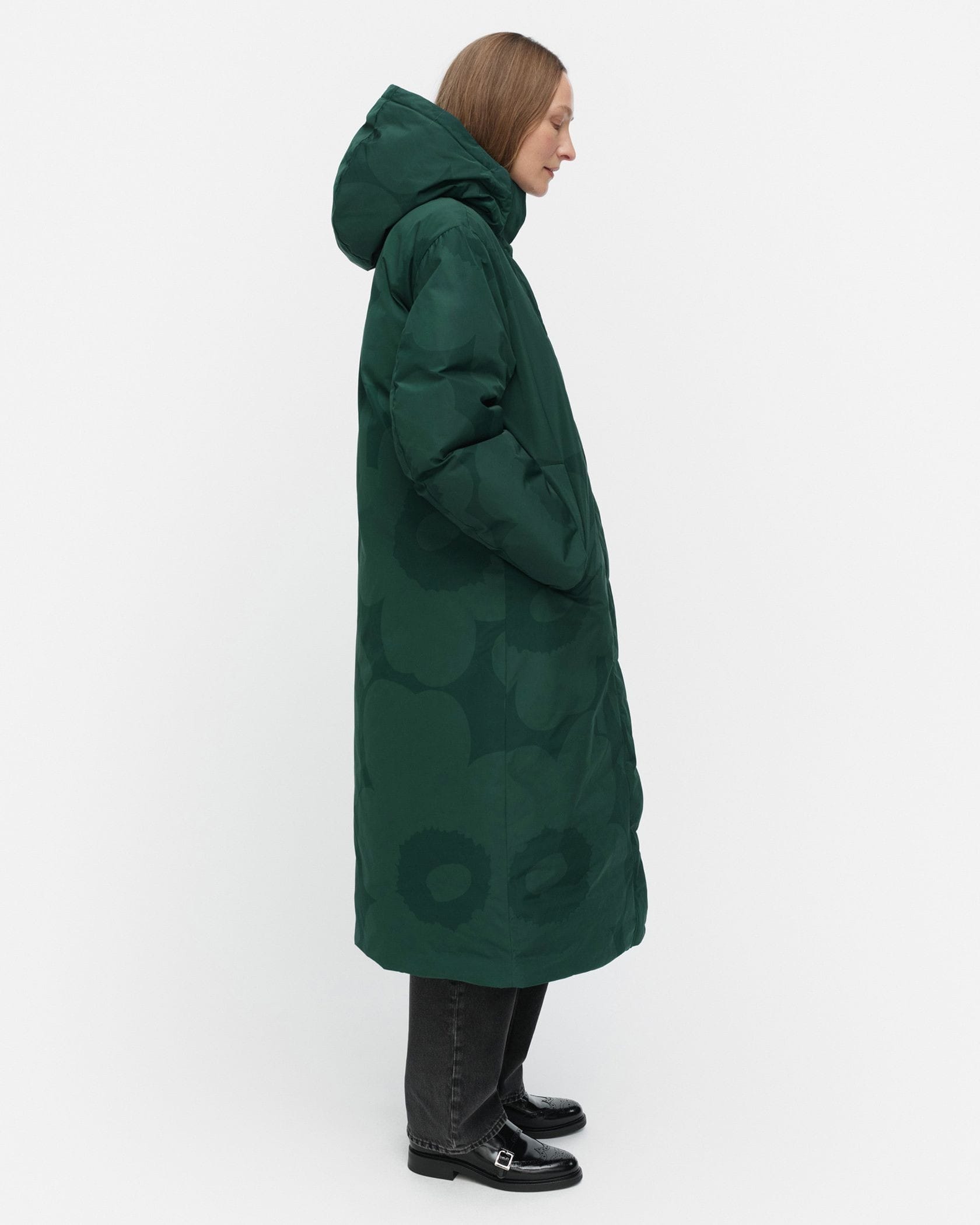大ぶりなUnikko柄をあしらったフード付きダウンコート。たっぷりのダウン&フェザーを中に詰めており、保温性抜群のアイテムです。膝下までのロング丈と首まわりを覆うハイネックも体を寒さから守ります。装飾を抑えた大人らしいデザインで、カジュアルからキレイめまで様々な着こなしと好相性です。