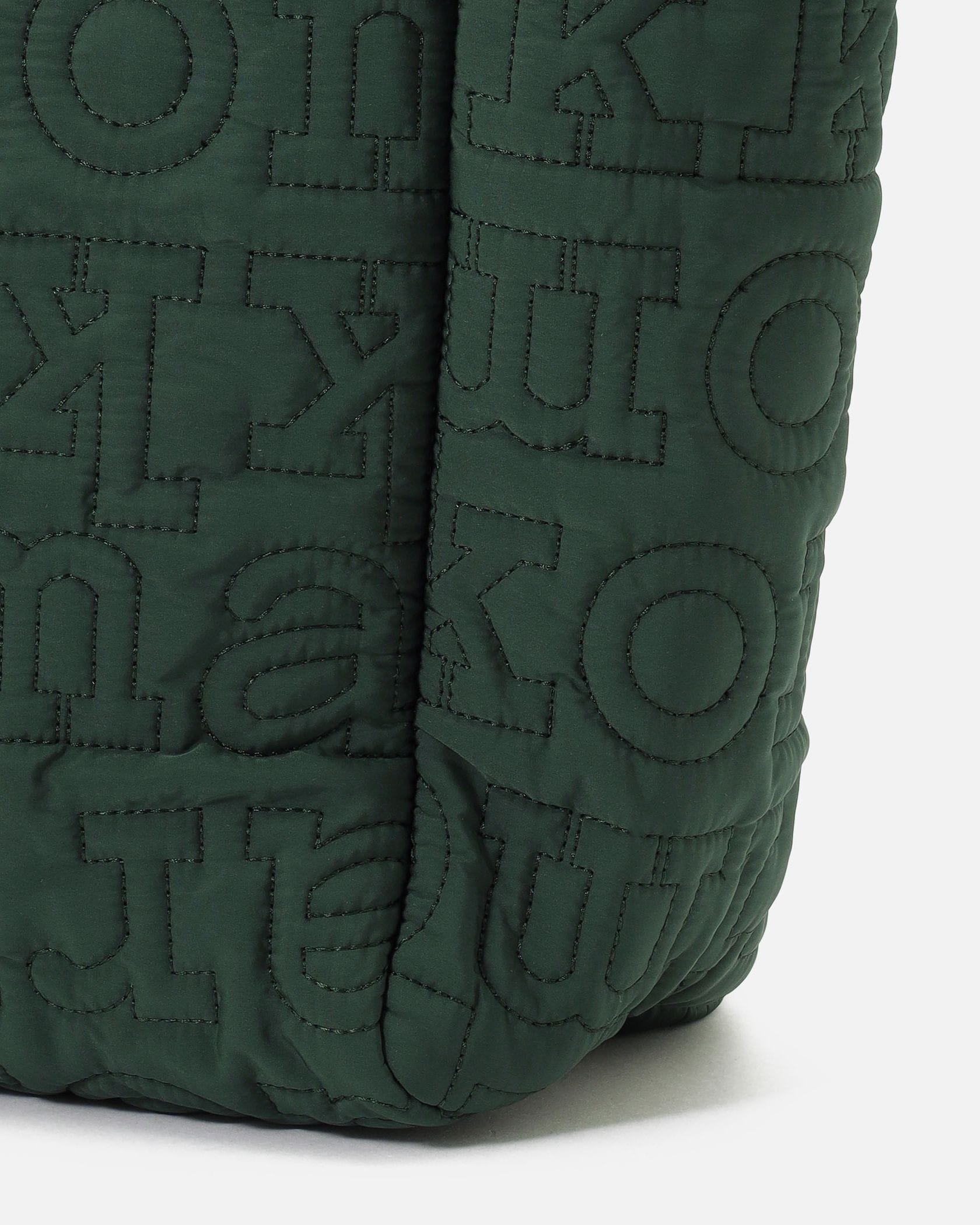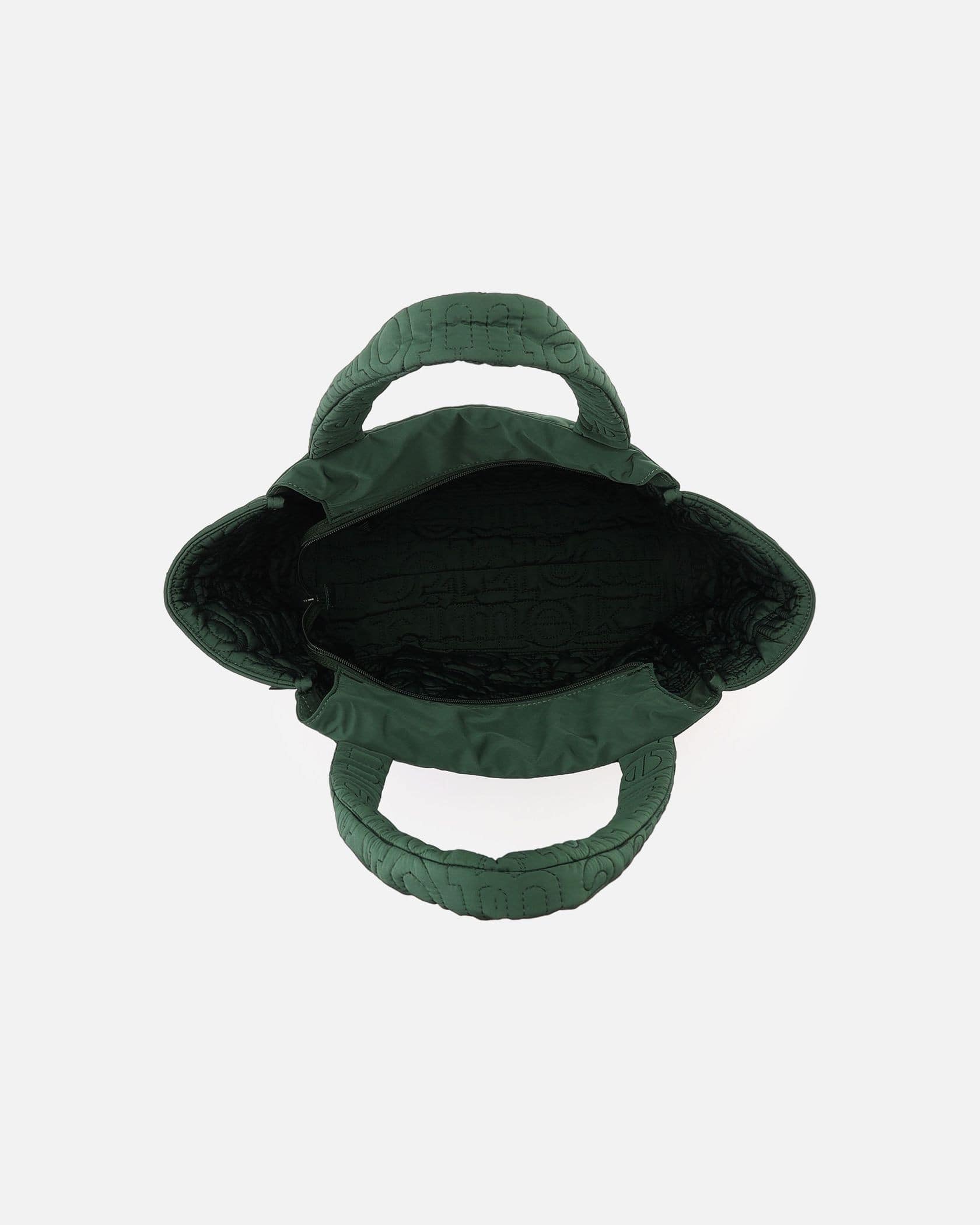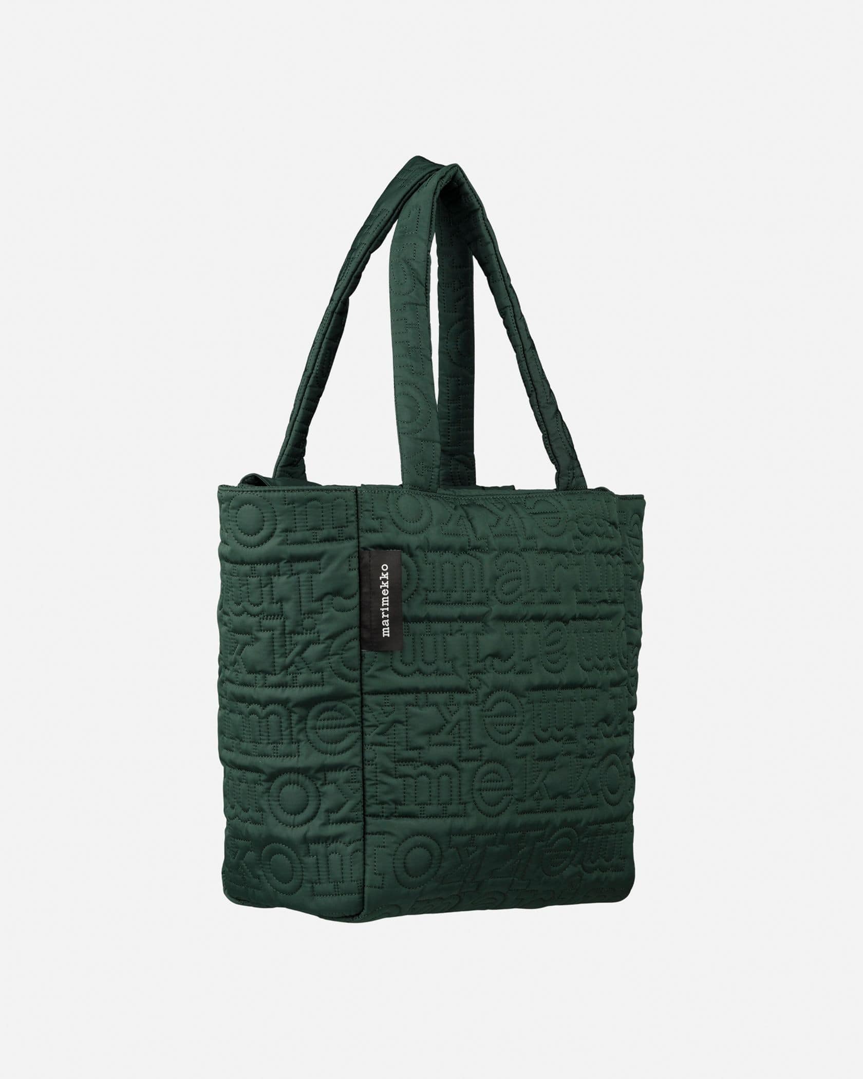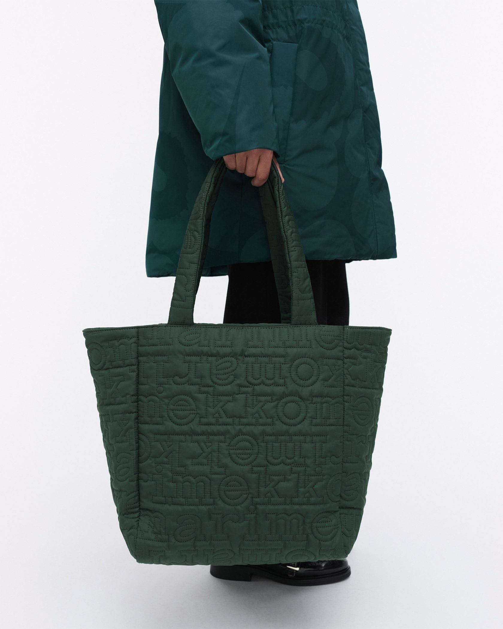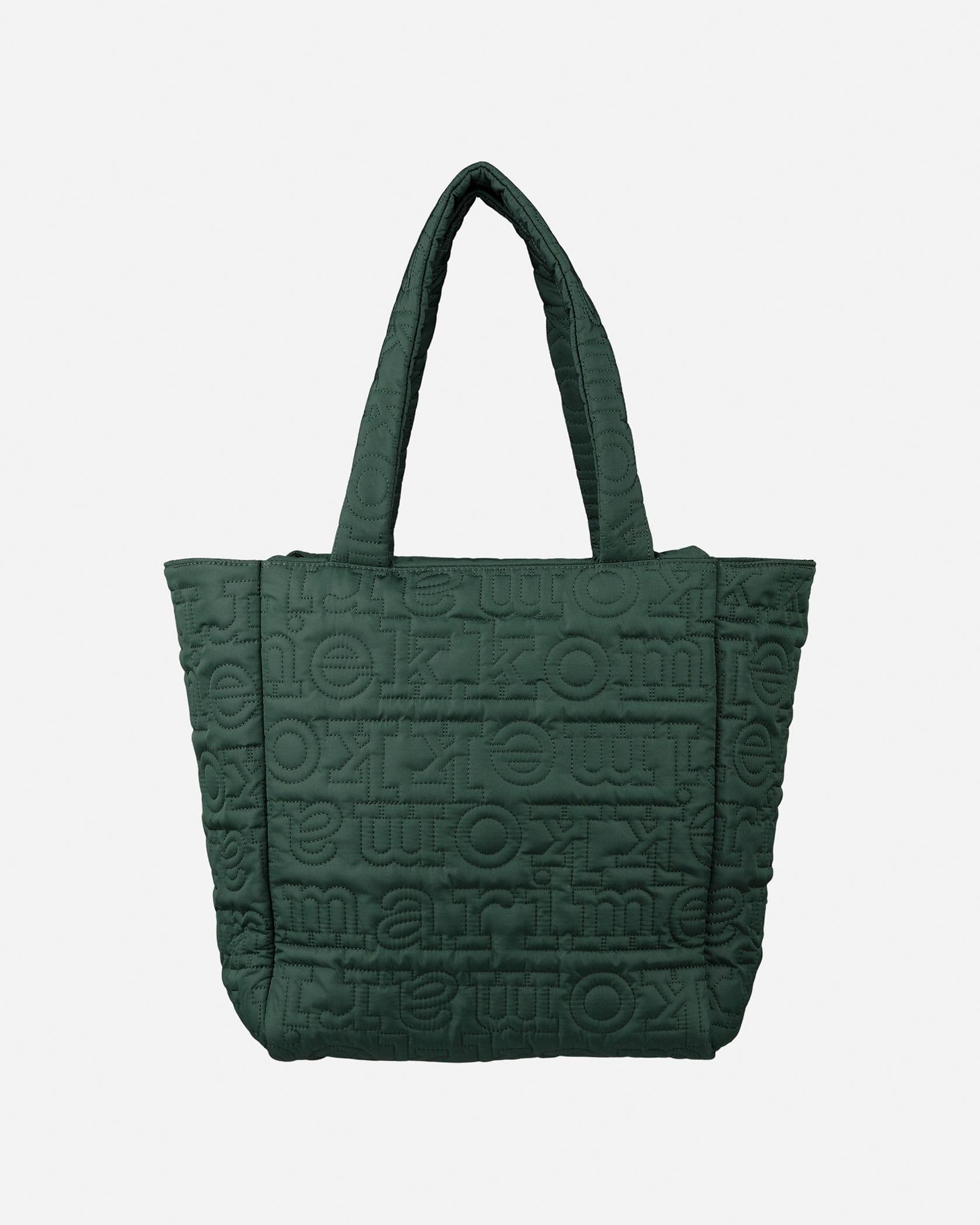 Marimekkoロゴを散りばめたキルティングトートバッグ。柔らかな質感やA4サイズが収まる大きさ、肩掛けしやすい長めのハンドル、ファスナー付きの間口など、細部まで使いやすさに配慮しています。大ぶりなピスタグも目をひくアクセント。シンプルな単色で合わせる服装を問わず、日常使いに最適なアイテムです。
