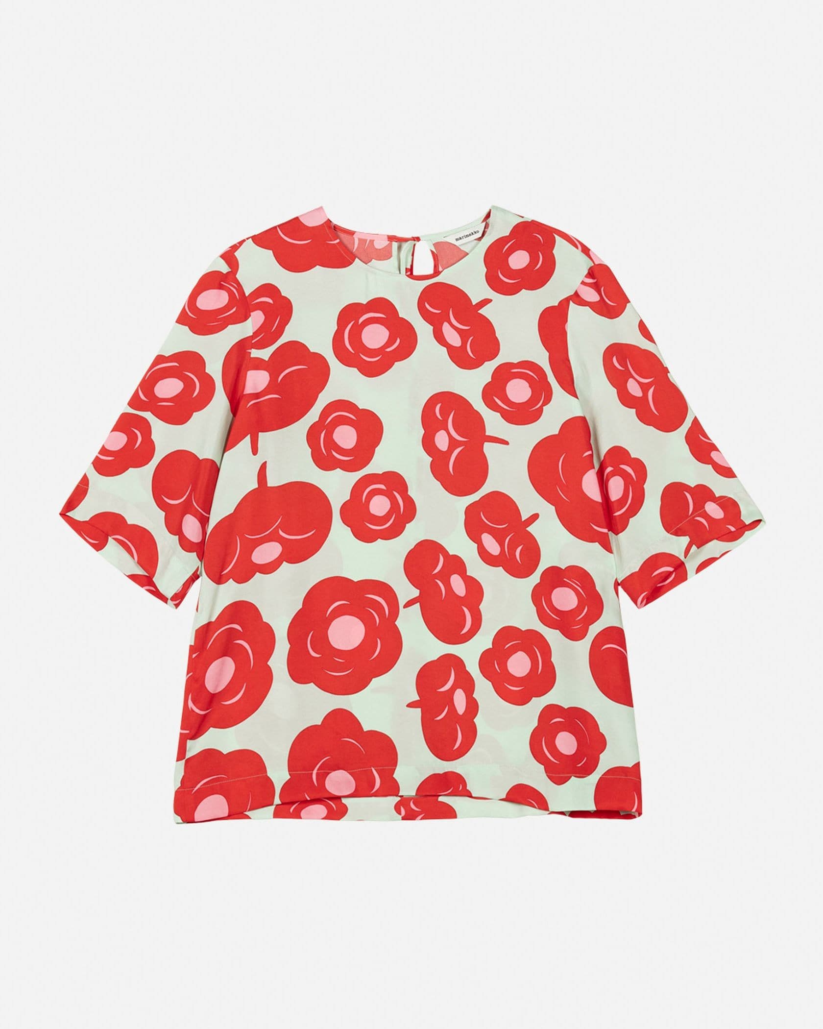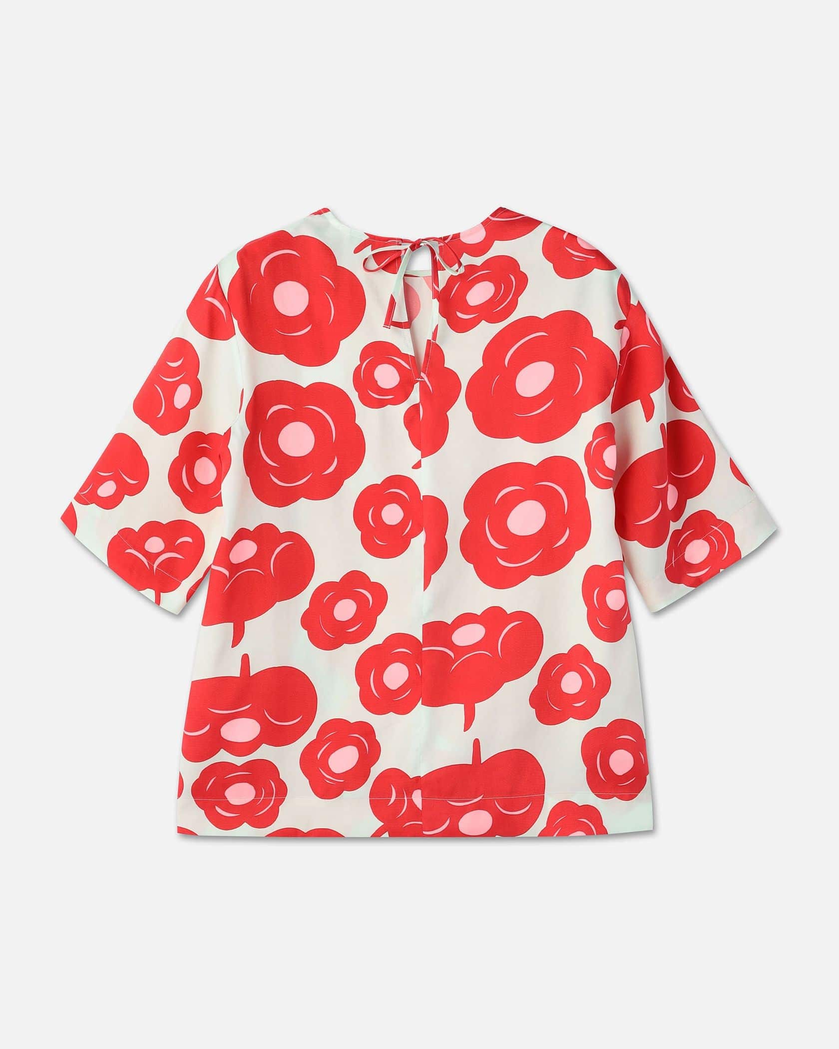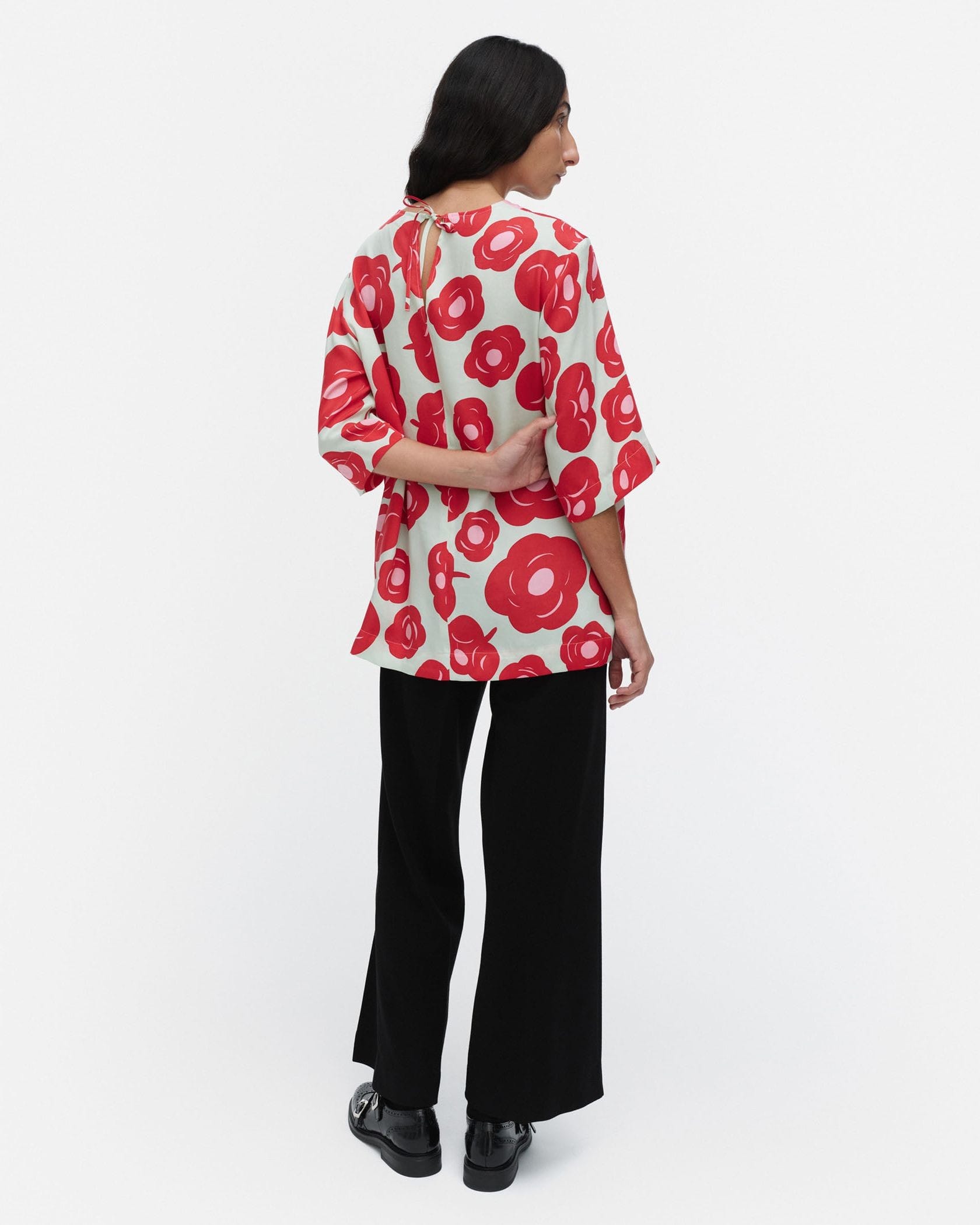 印象的なTumma柄のラウンドネックブラウス。フラワープリントが華やかなデザイン。ゆったりとした肘丈の袖、少し長めのストレートカットの裾、うなじのVスリットがモダンなデザインディテール。お手持ちのボトムに合わせて、スタイリッシュなお出かけコーディネートが実現するアイテムです。