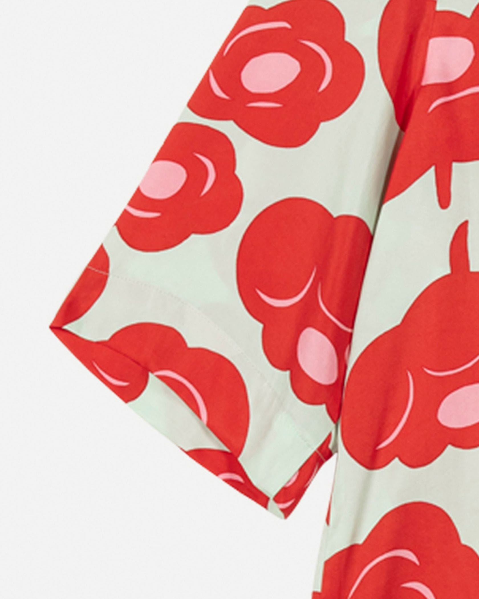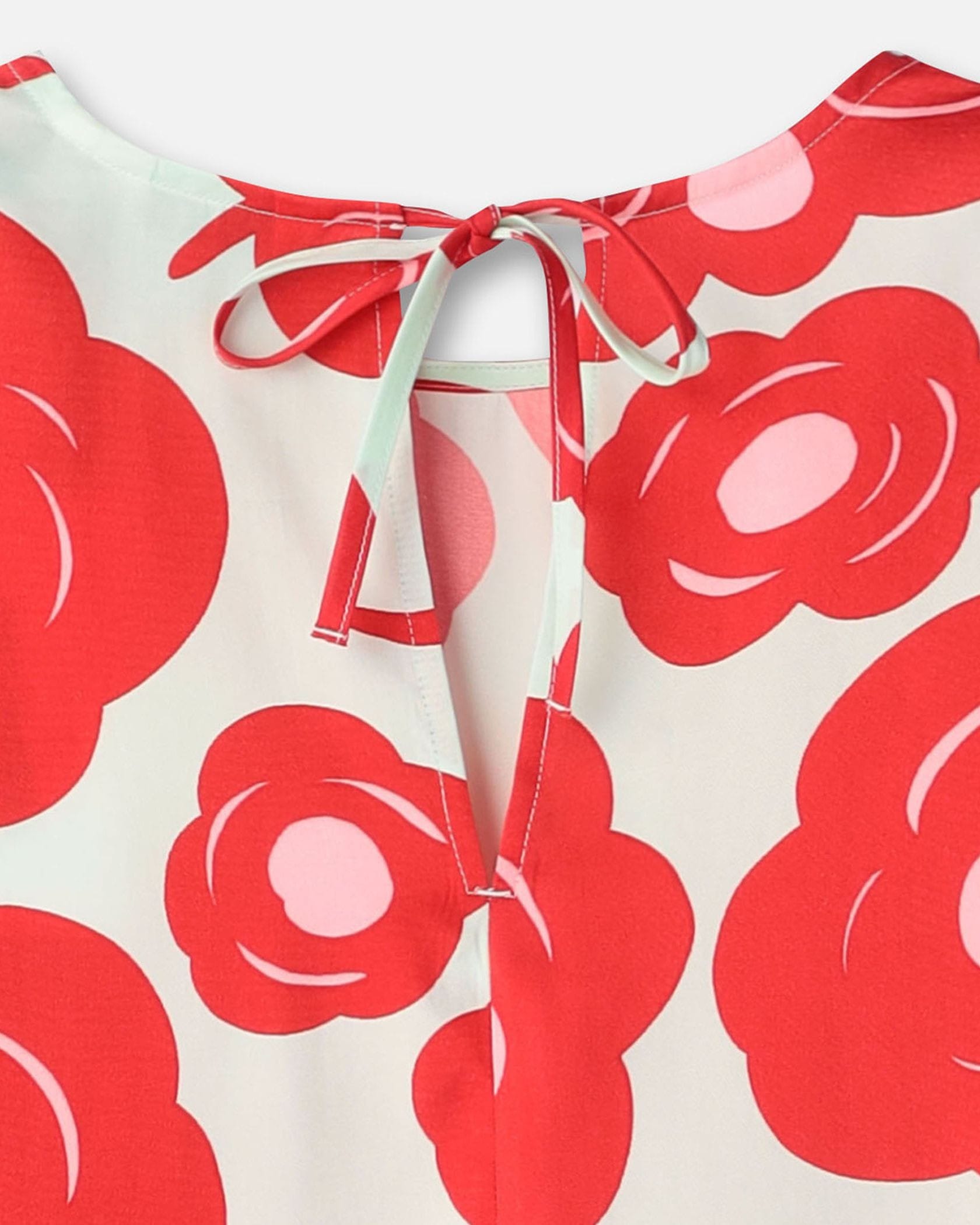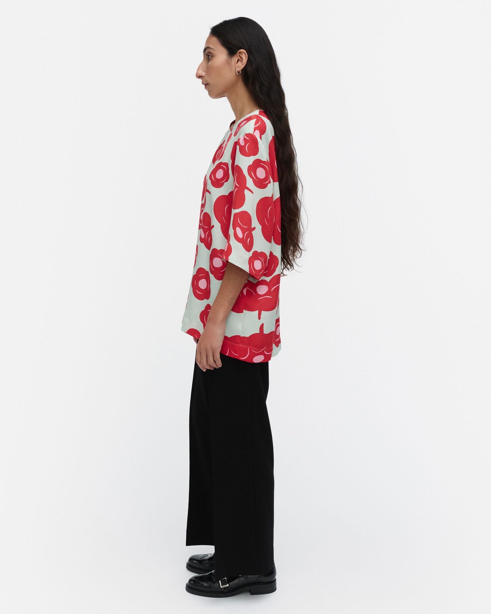 印象的なTumma柄のラウンドネックブラウス。フラワープリントが華やかなデザイン。ゆったりとした肘丈の袖、少し長めのストレートカットの裾、うなじのVスリットがモダンなデザインディテール。お手持ちのボトムに合わせて、スタイリッシュなお出かけコーディネートが実現するアイテムです。