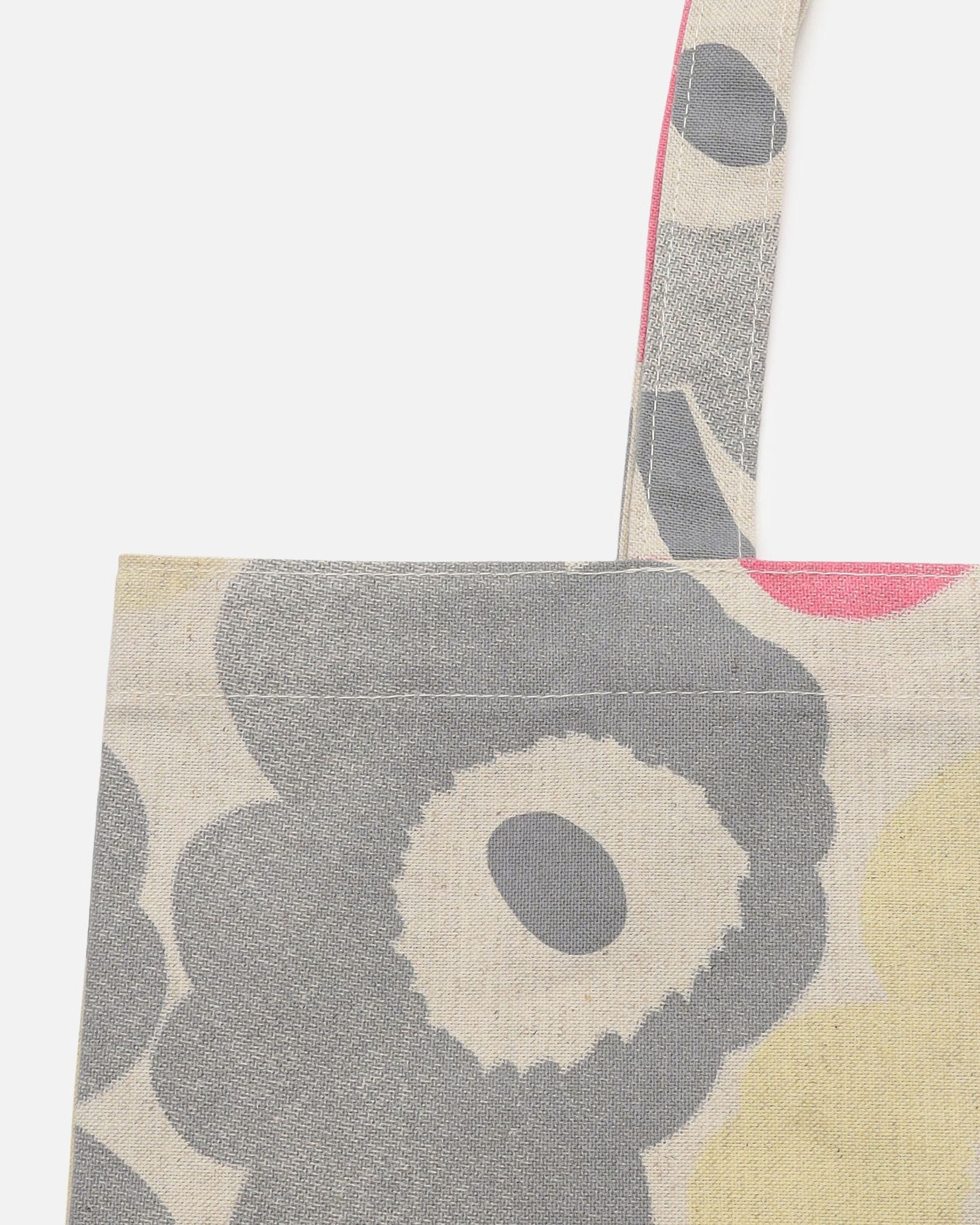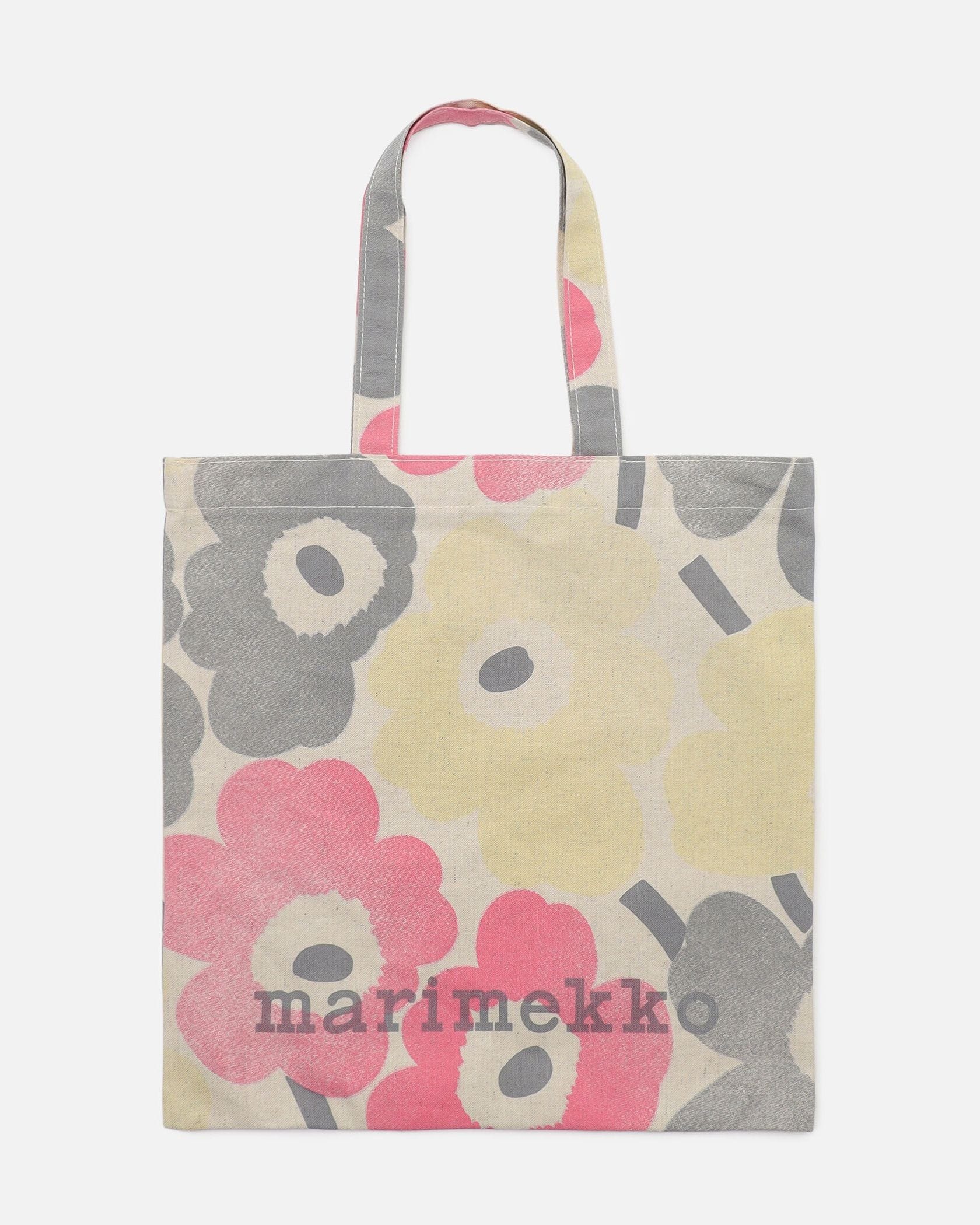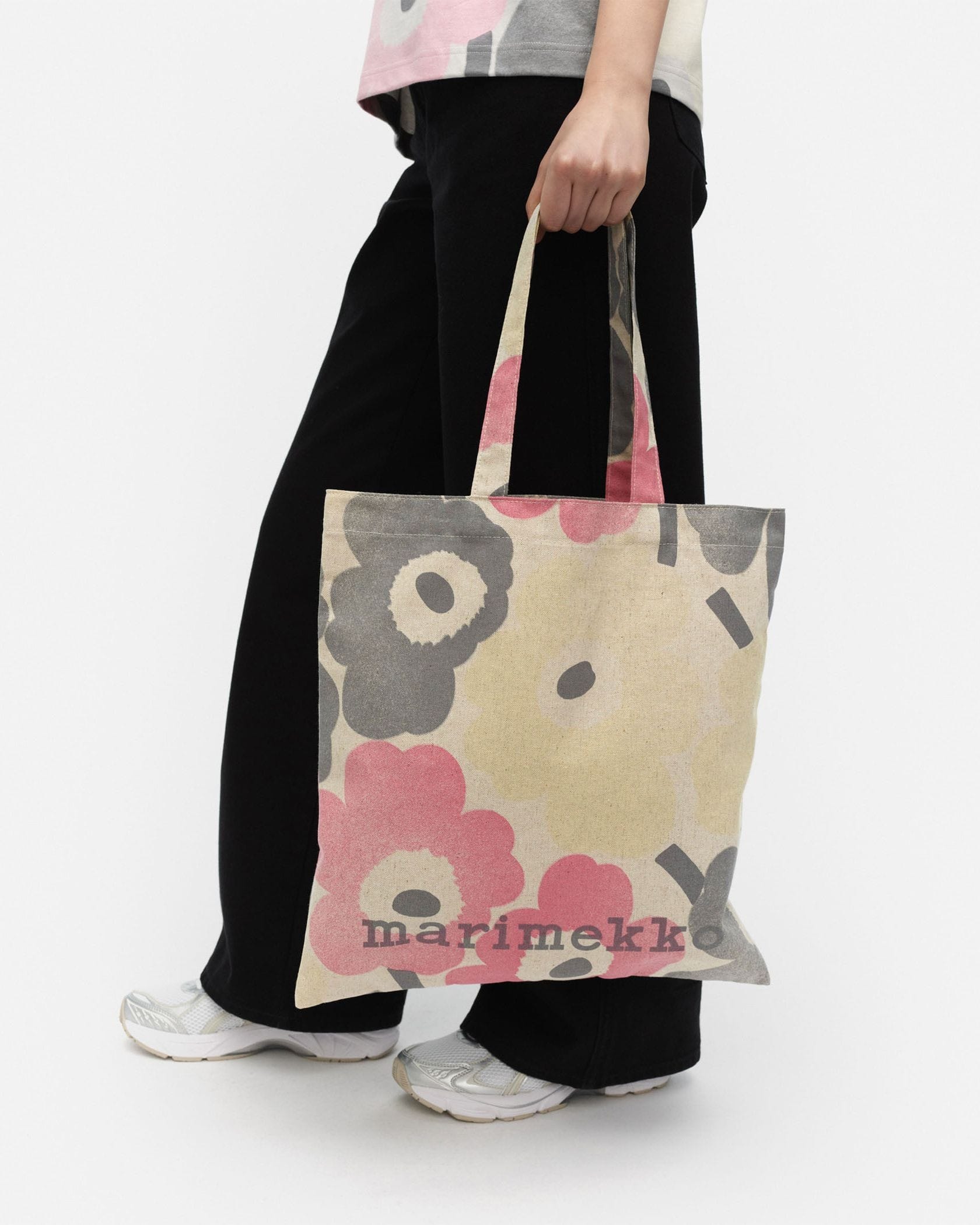 Unikko柄が華やかなデザインのトートバッグ。カラフルなフラワーモチーフの掠れ風プリントがスタイリッシュなデザイン。大きめのブランドロゴもアクセント。使いやすいサイズ感とコンパクトに畳める布製で、メインバッグからセカンドバッグまで様々な使い方が可能。デイリーに活躍するアイテムです。