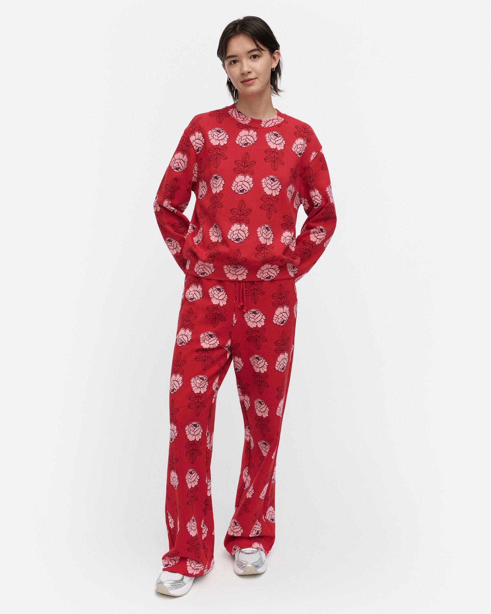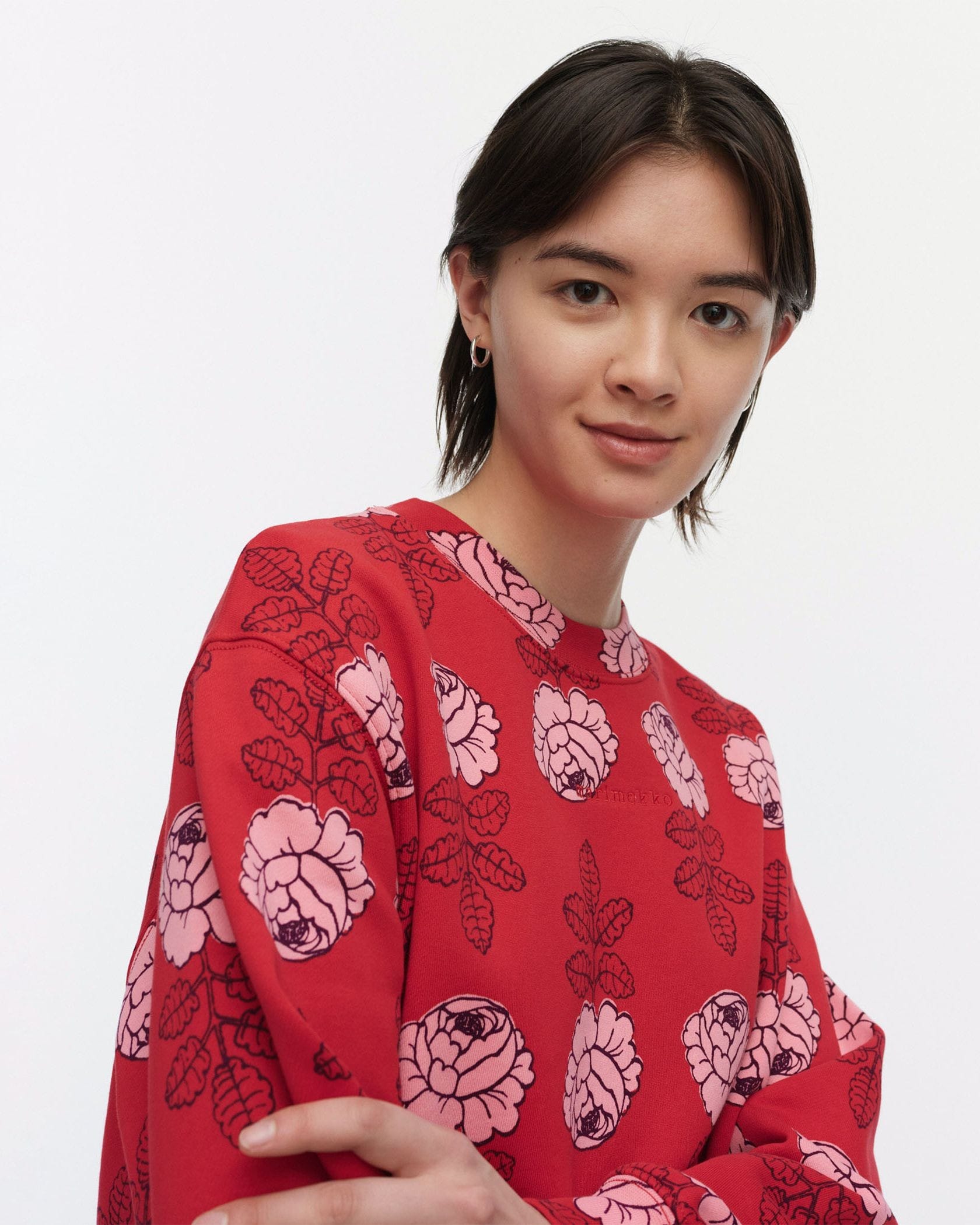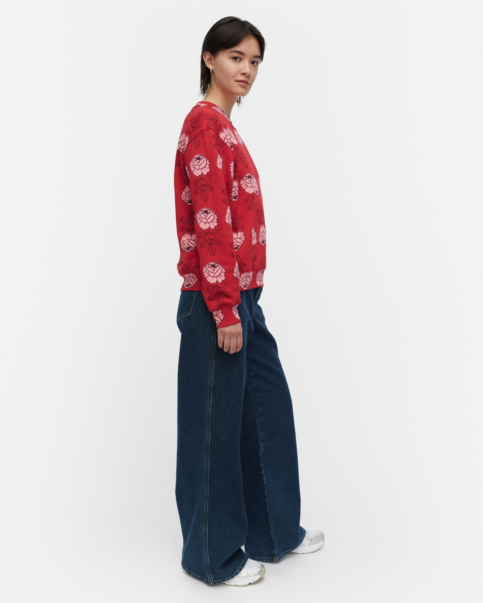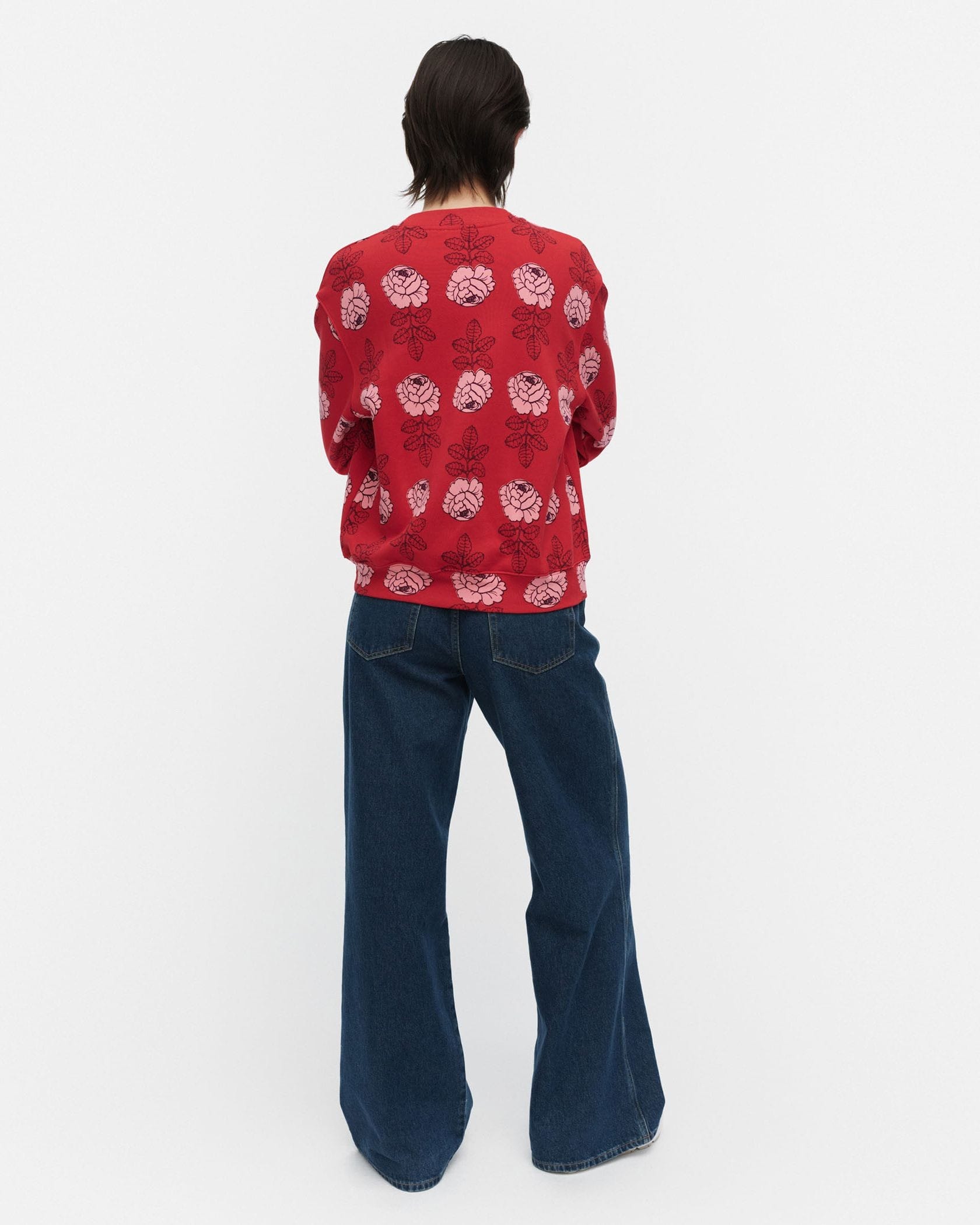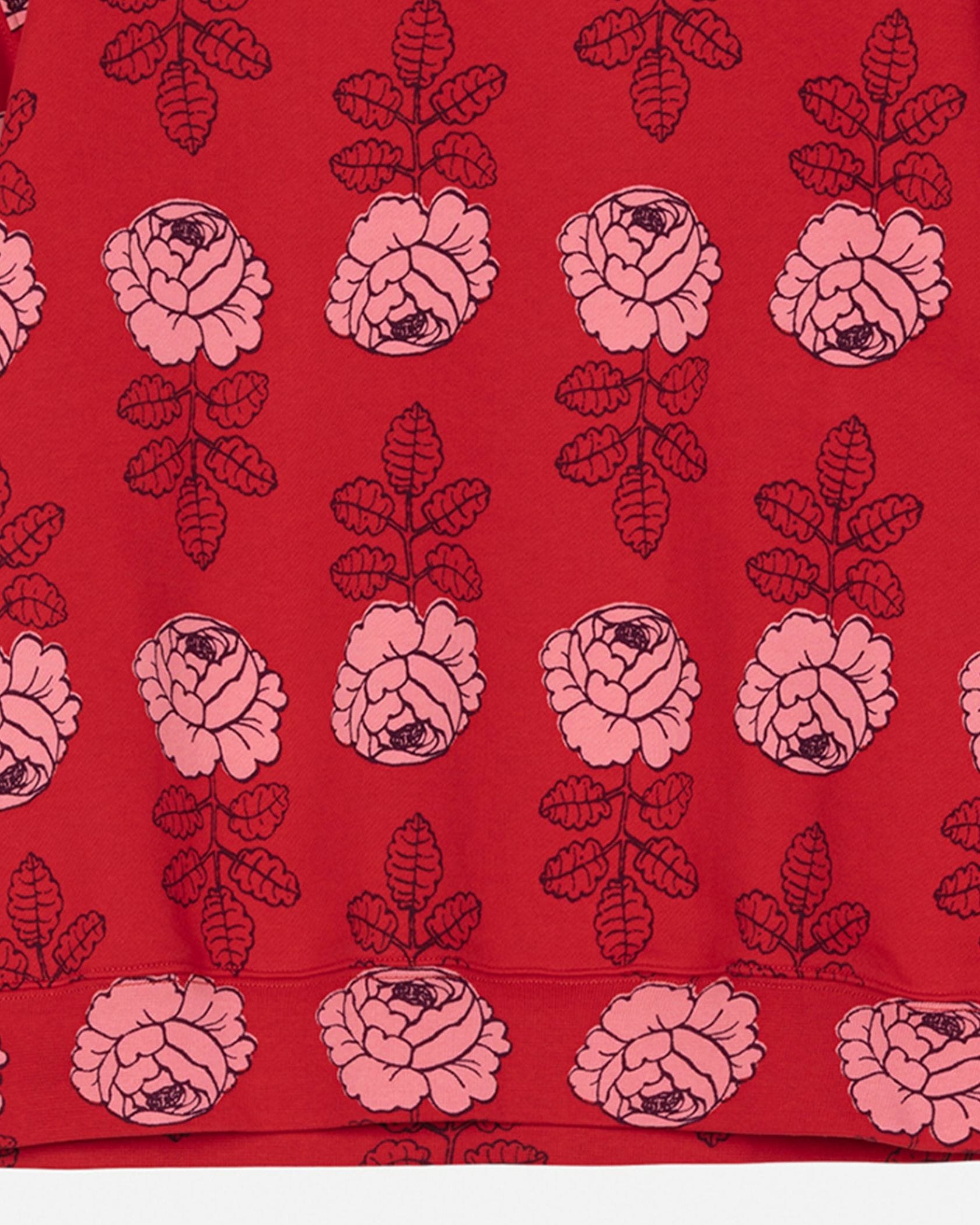 バラの総柄がユニークで愛らしいスウェットトップス。ベーシックなシルエットは、ボトムを選ばずにスタイリングできます。気負わずさらりと着こなせてモードにきまる一枚です。