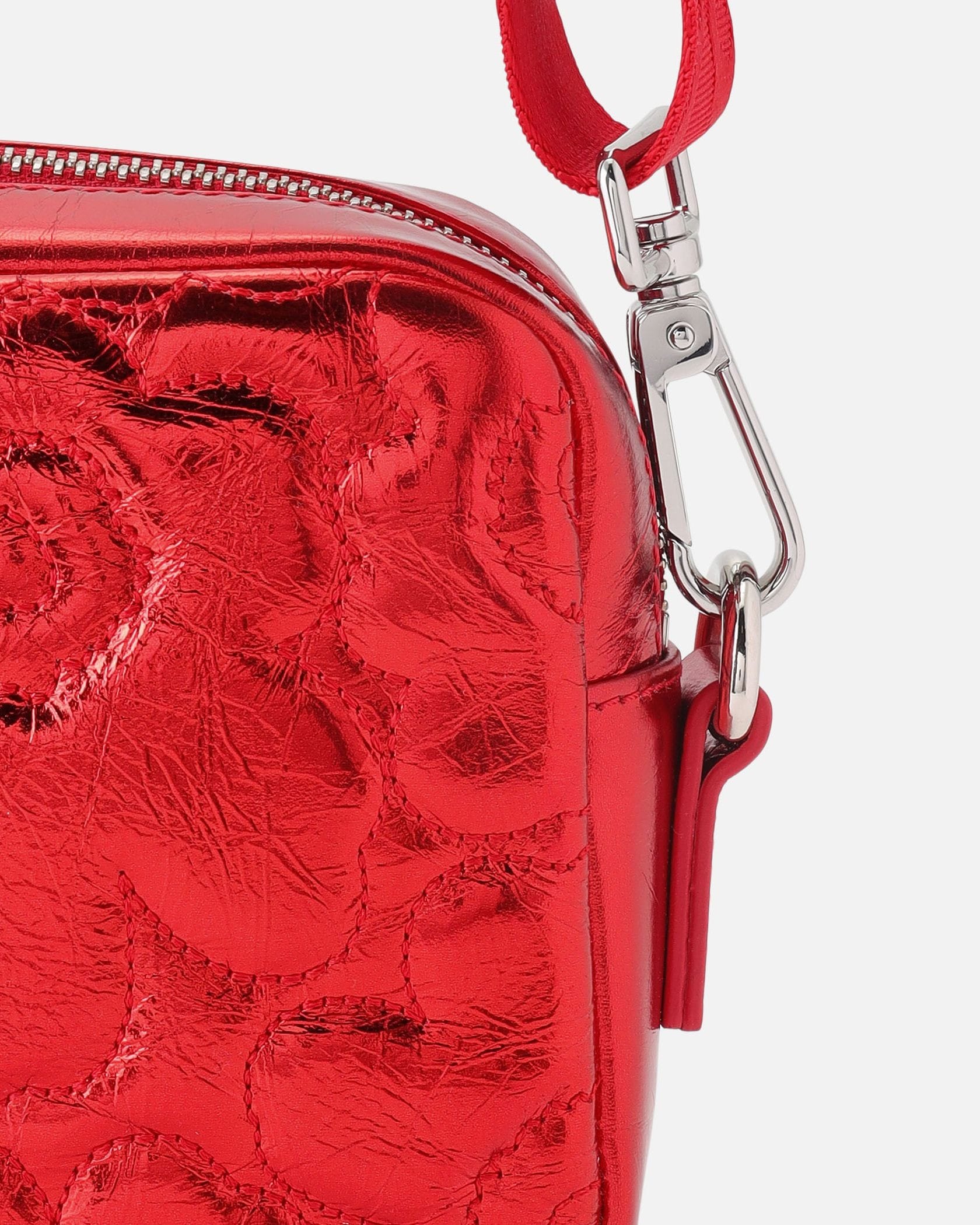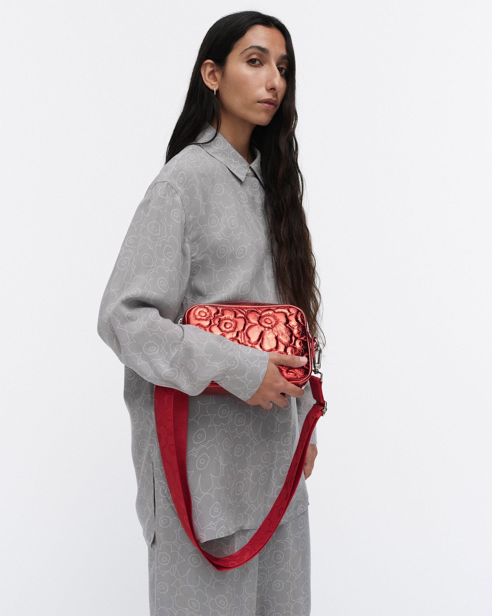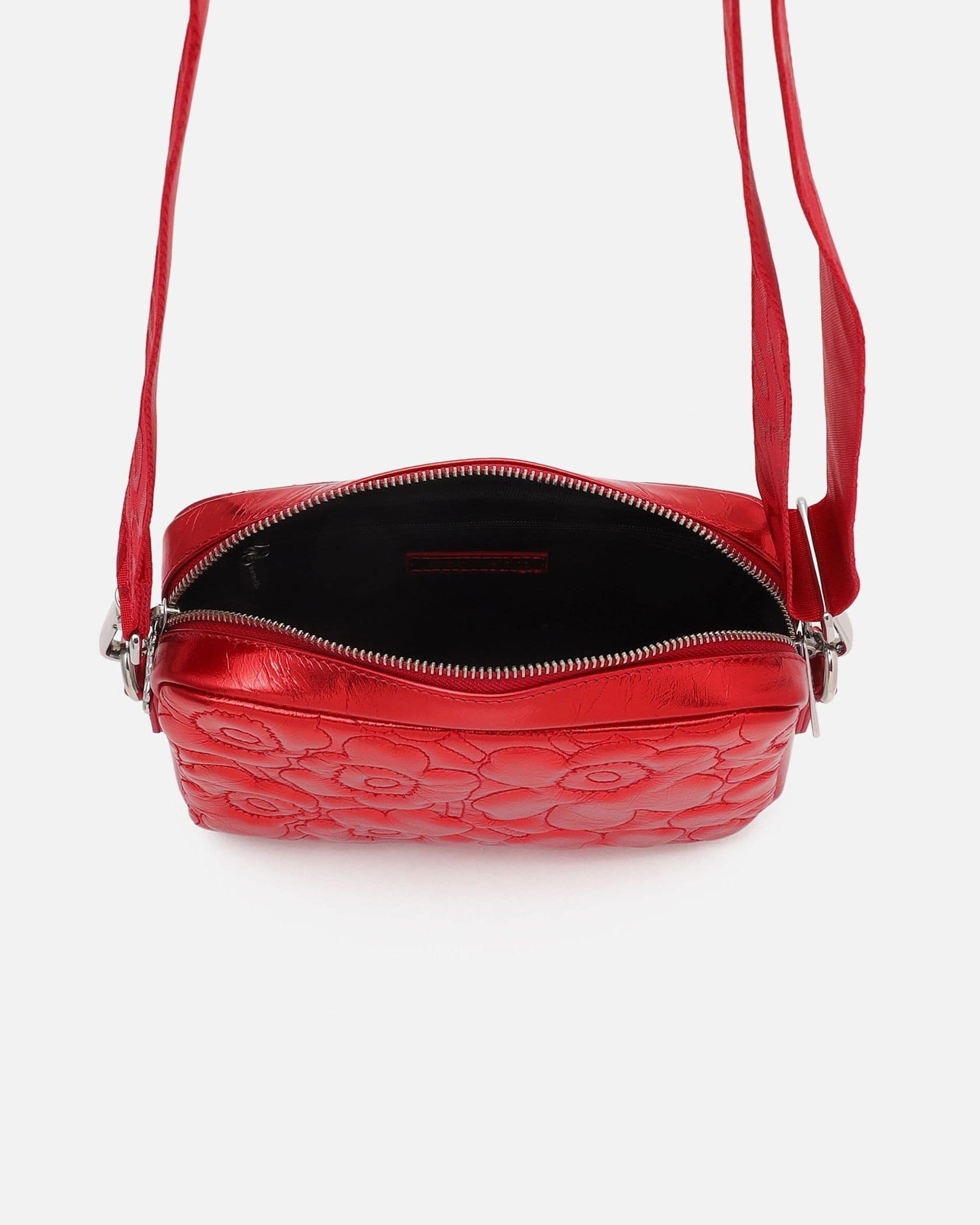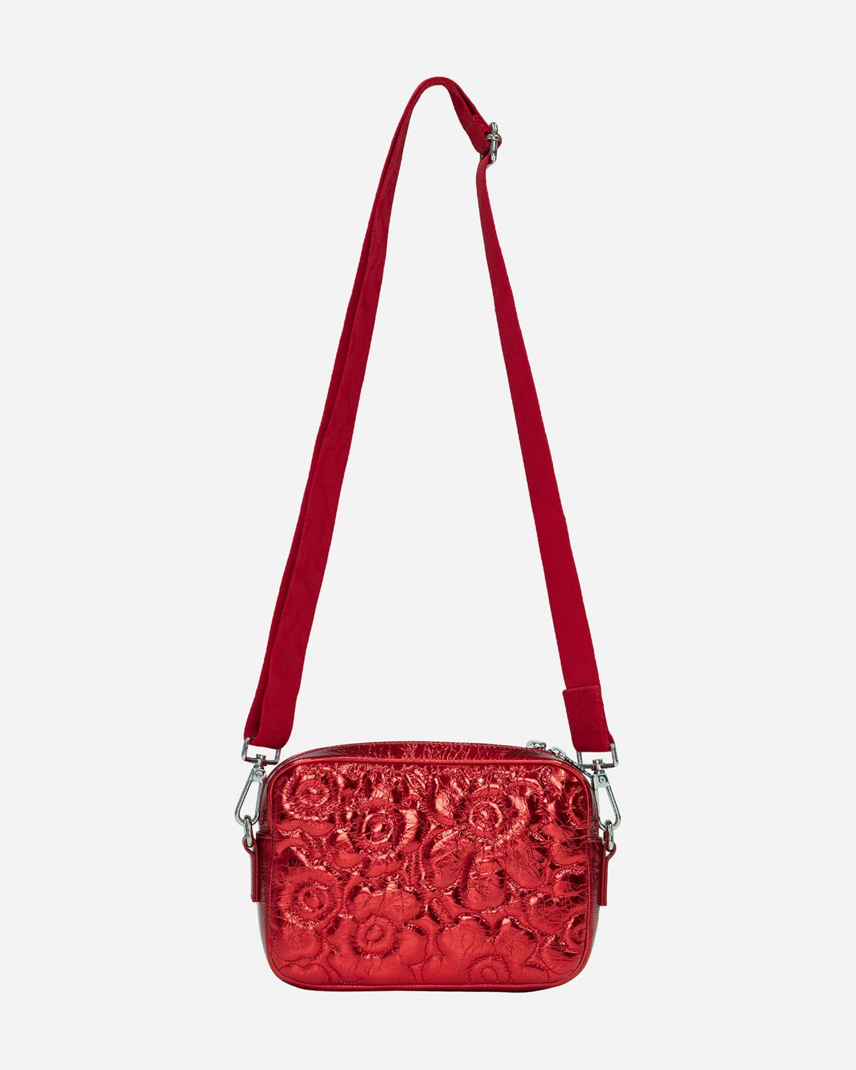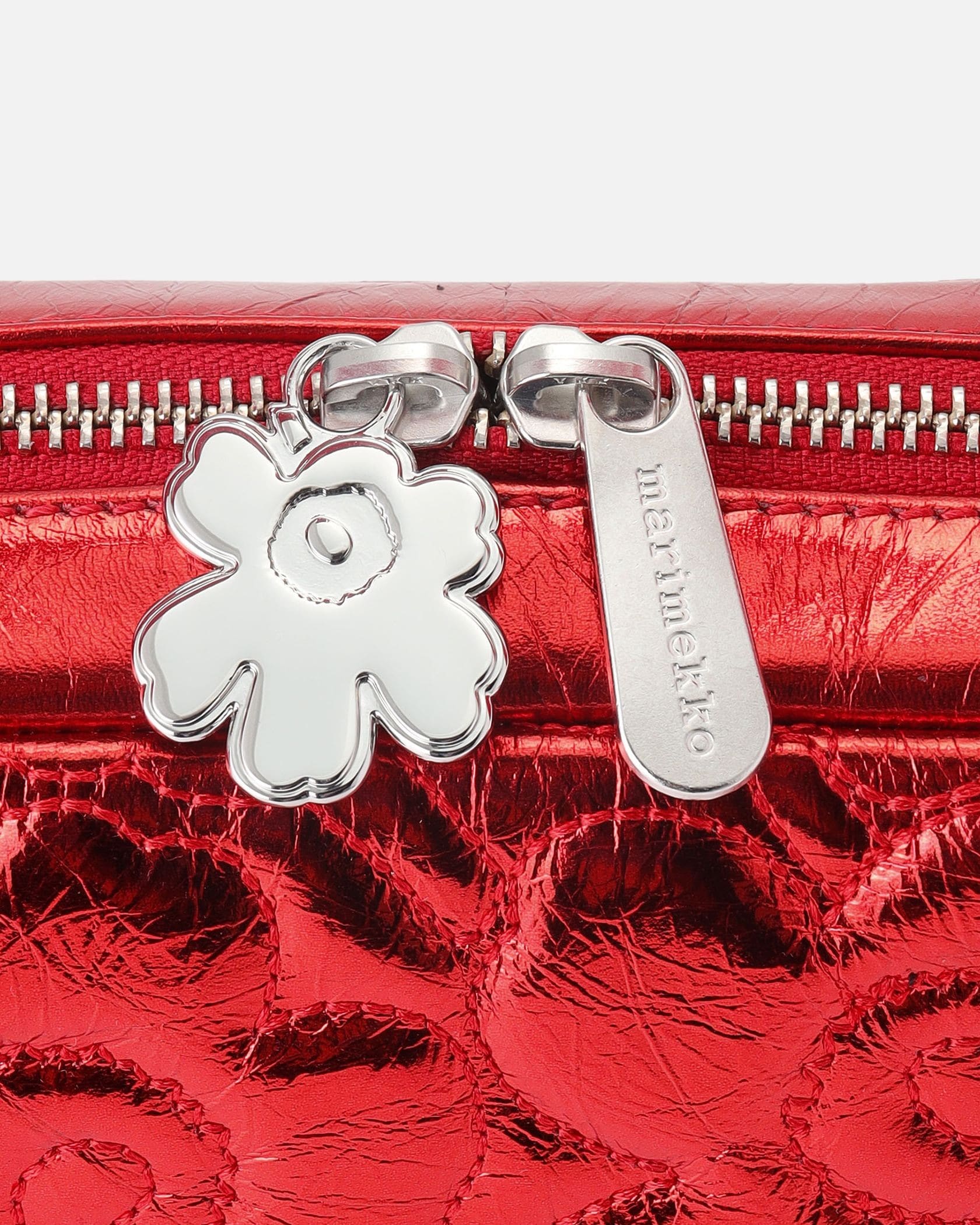 光沢感が美しいレザーにUnikko柄の型押しが配されたショルダーバッグ。どんなスタイルにも合わせやすく、いつもの装いもワンランク、エレガントな表情に。ジップについたチャームもさりげなく可愛いポイントです。