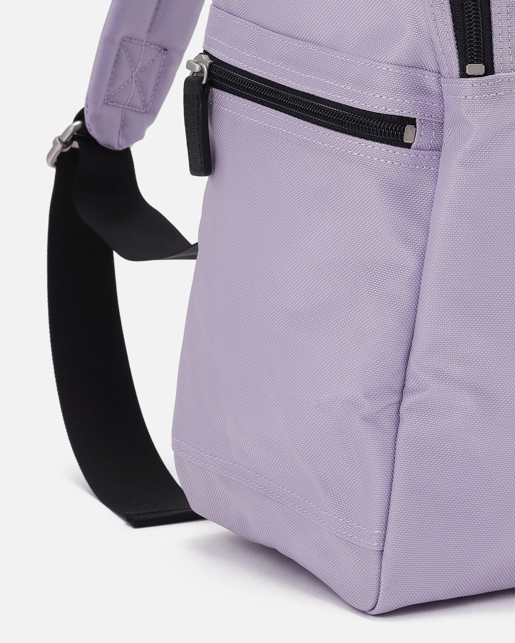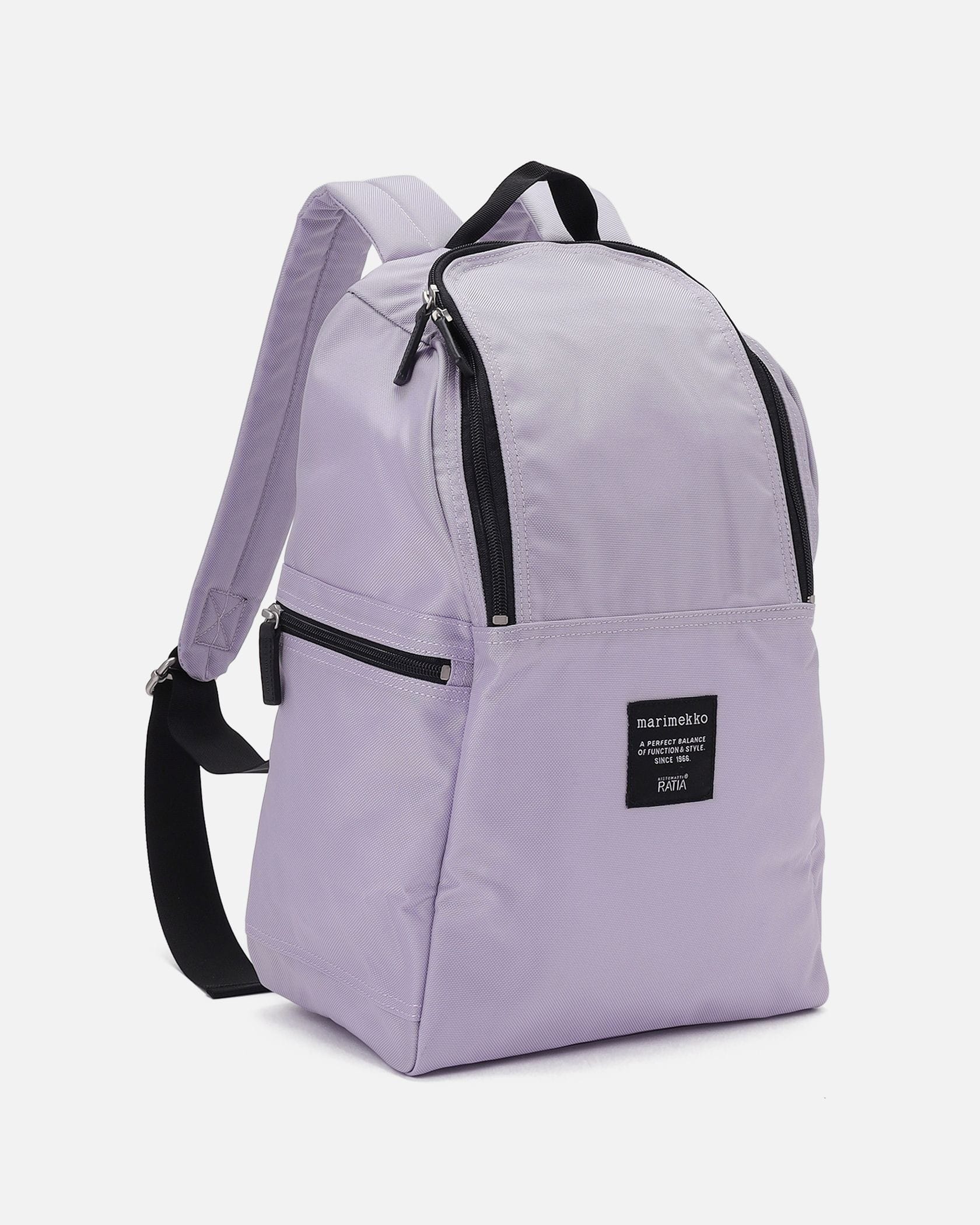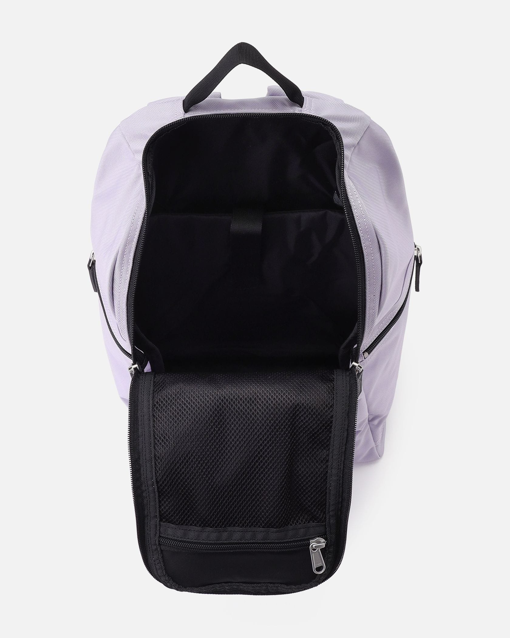 フロントのブランドロゴタグがスタイリッシュなアクセントのバックパック。上部の開口部が広く、ダブルジップで使い勝手抜群。インナーポケット、両サイドにもジップ付きポケットで充実の収納力。肩に優しい調整可能なパッド入りのショルダーストラップで背負いやすいのも魅力。デイリーに活躍するアイテムです。