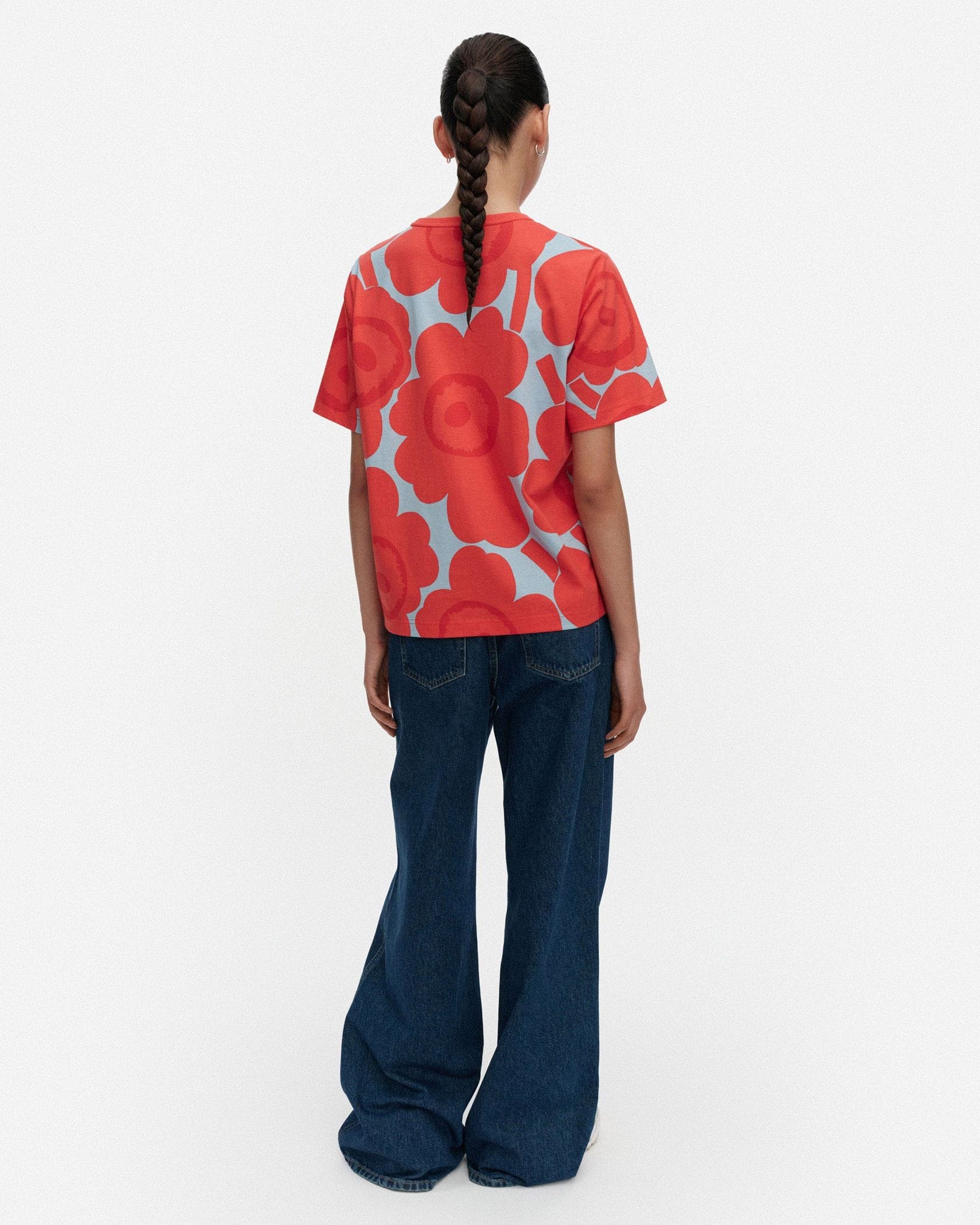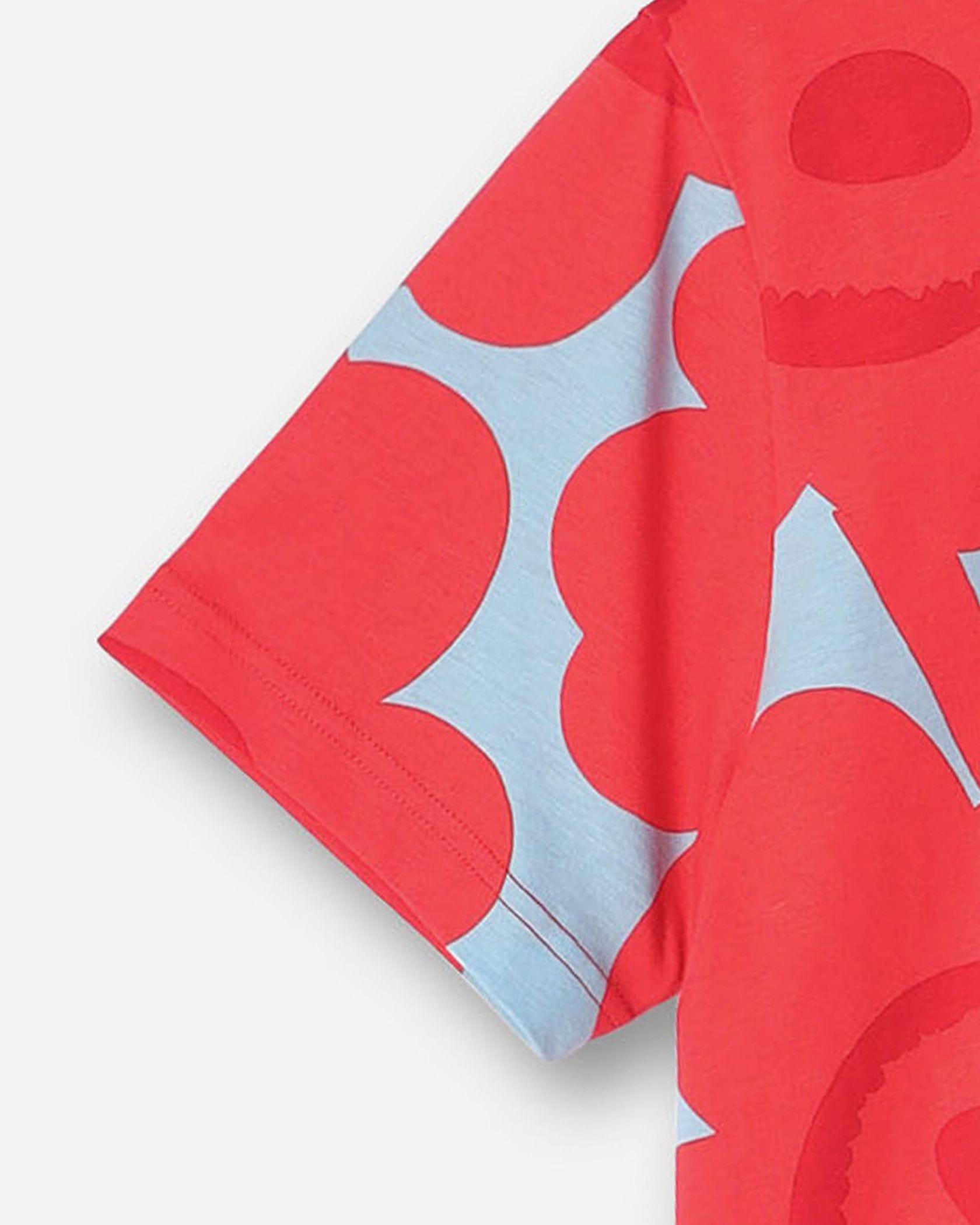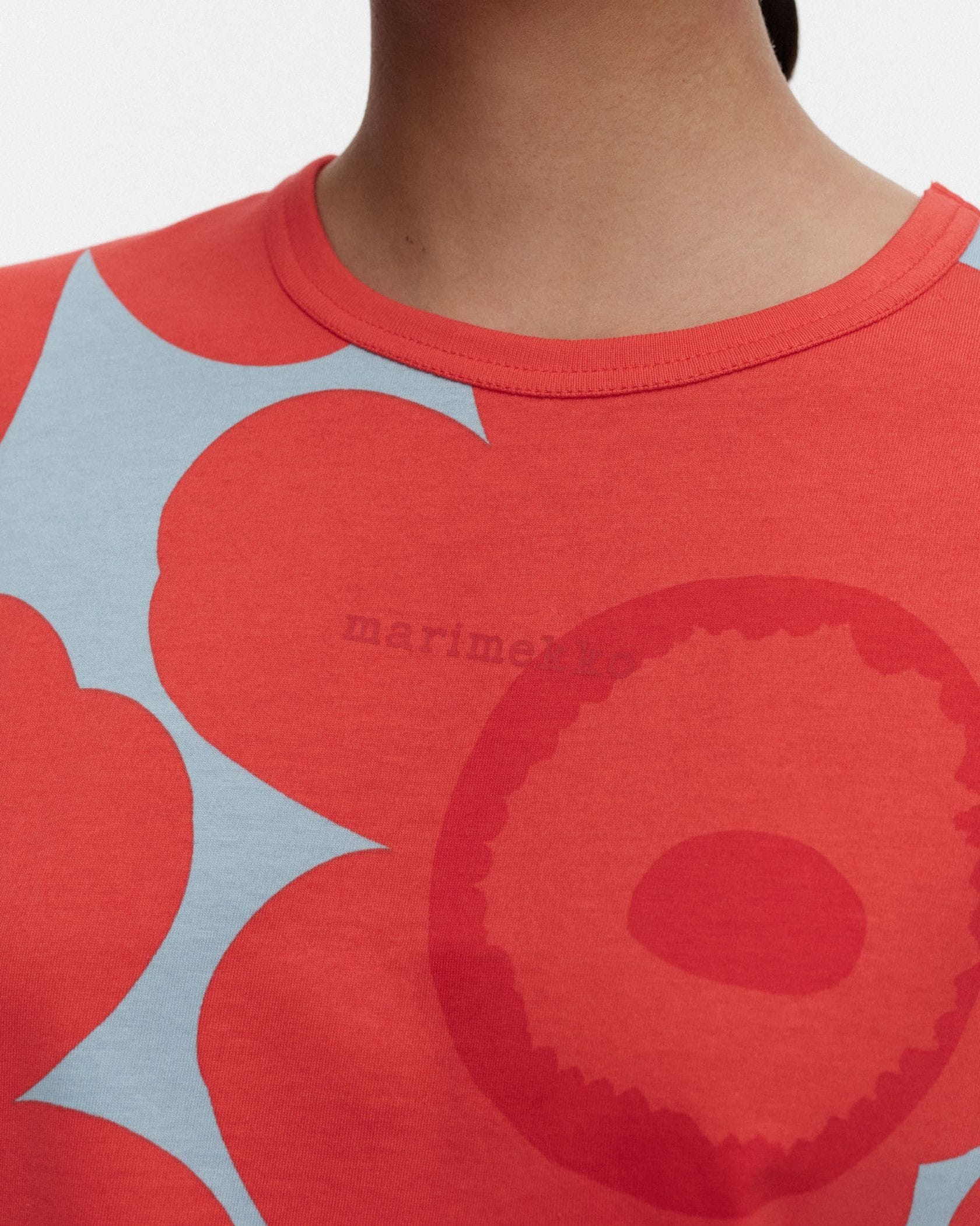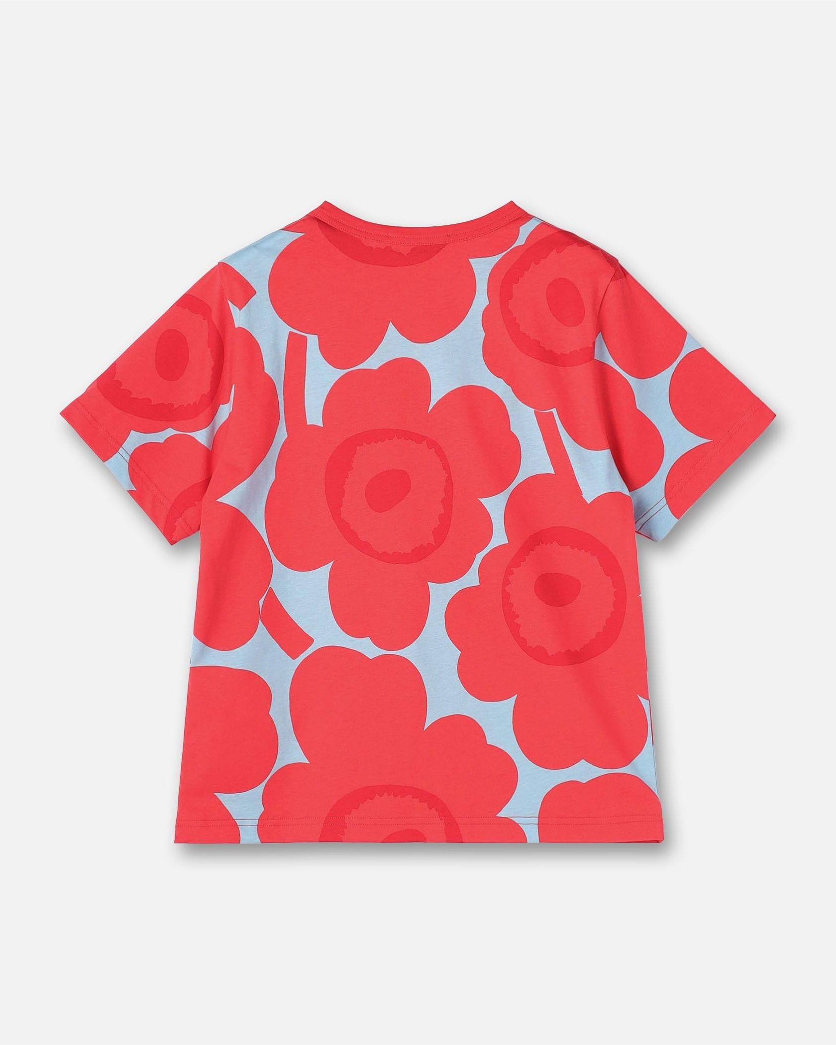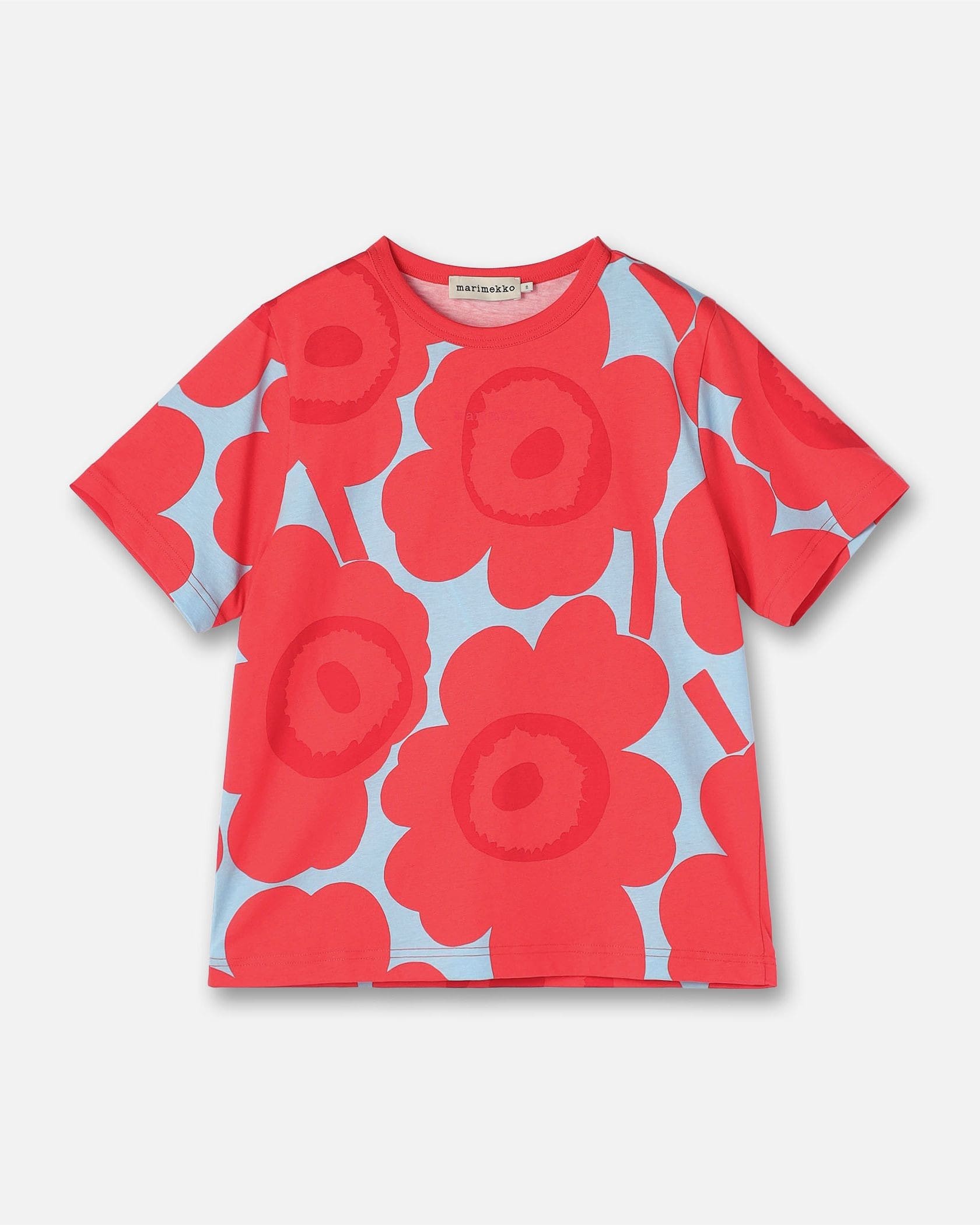 Marimekkoの人気プリント柄、Unikko(ウニッコ)のTシャツです。遠目にもインパクト抜群な配色プリント柄で、1枚着はもちろんインナーとしても存在感たっぷりにお使いいただけます。毎日のカジュアルシーンから、アクティブに動きたい日まで幅広いシーンで活躍間違いなしのアイテムです。