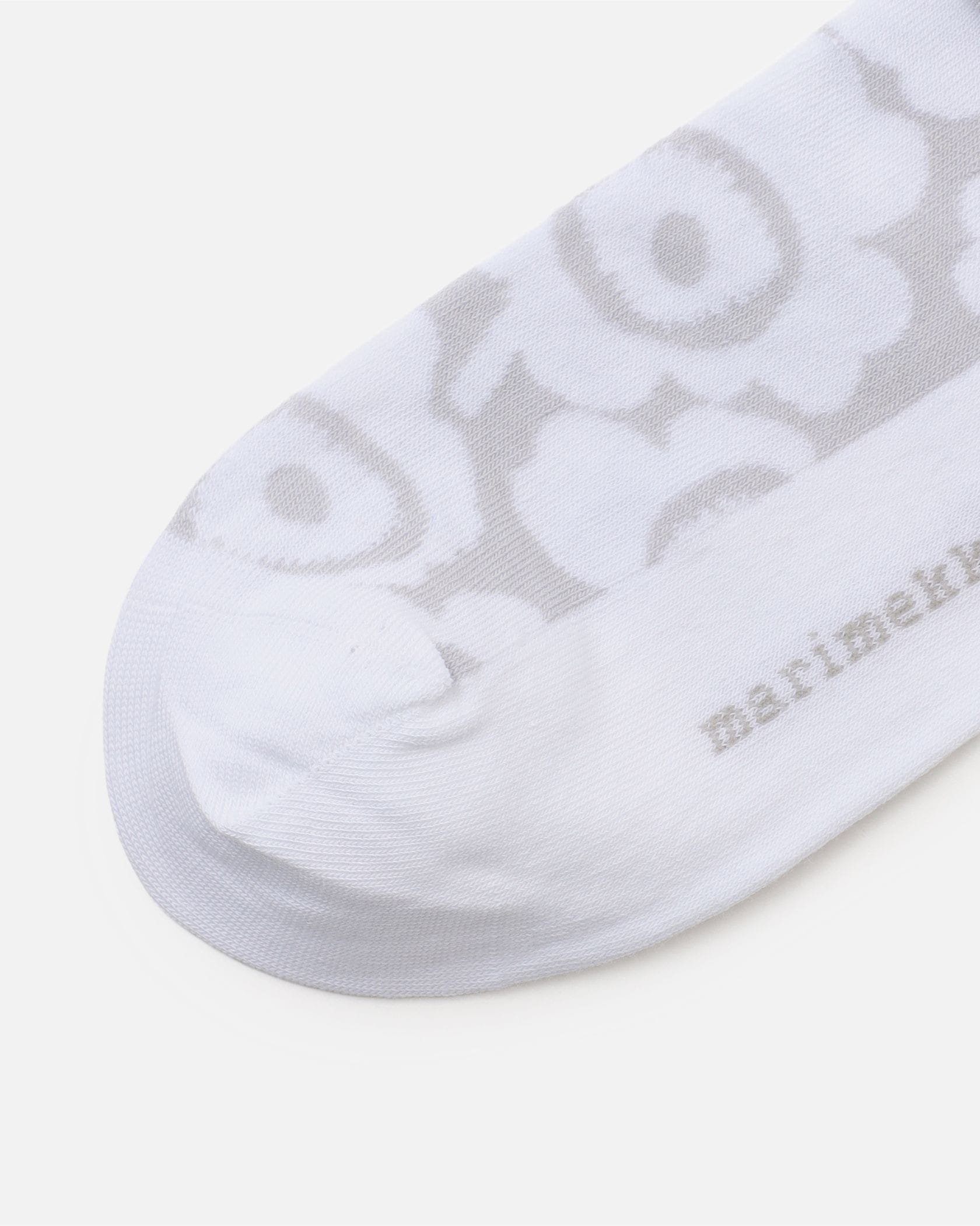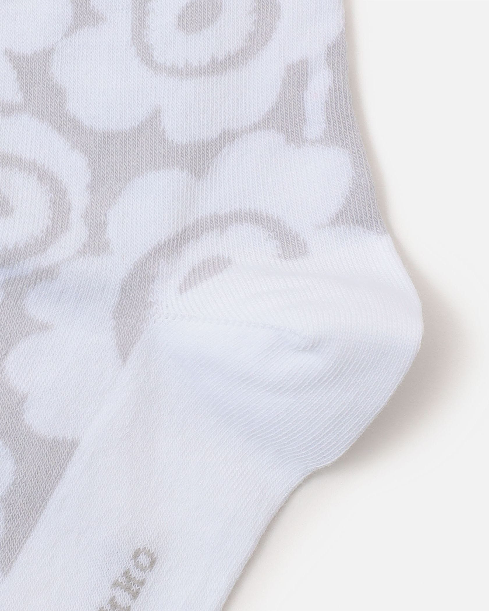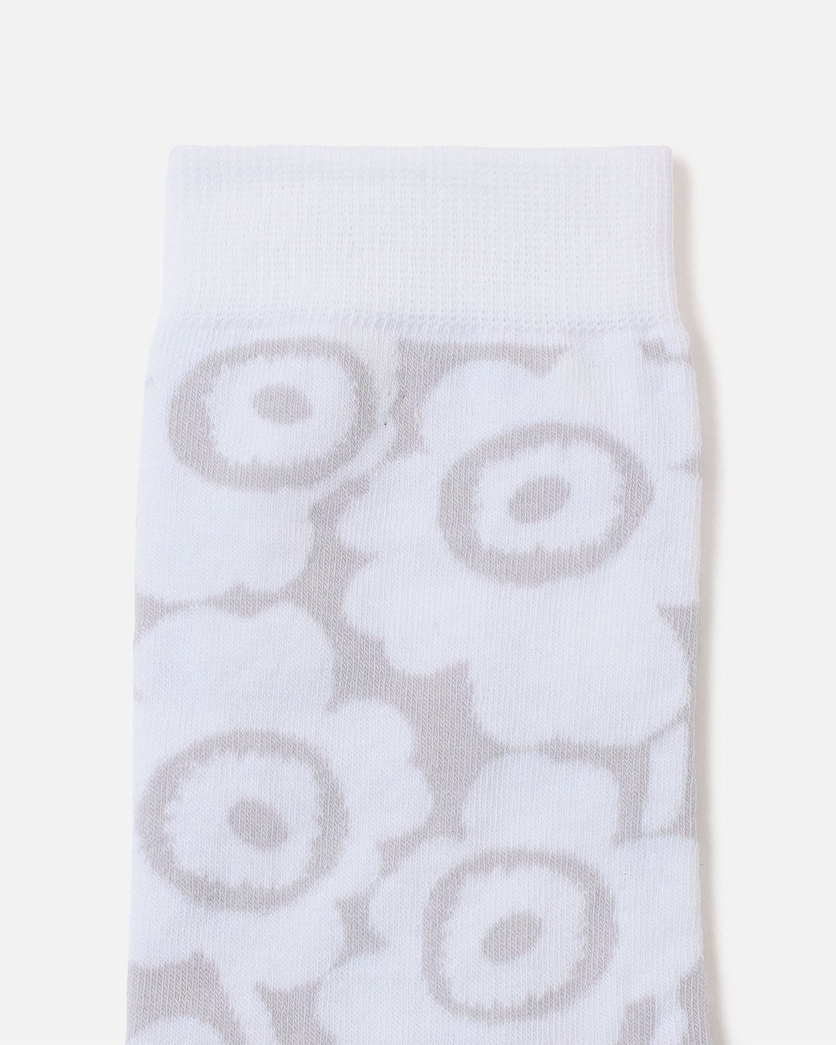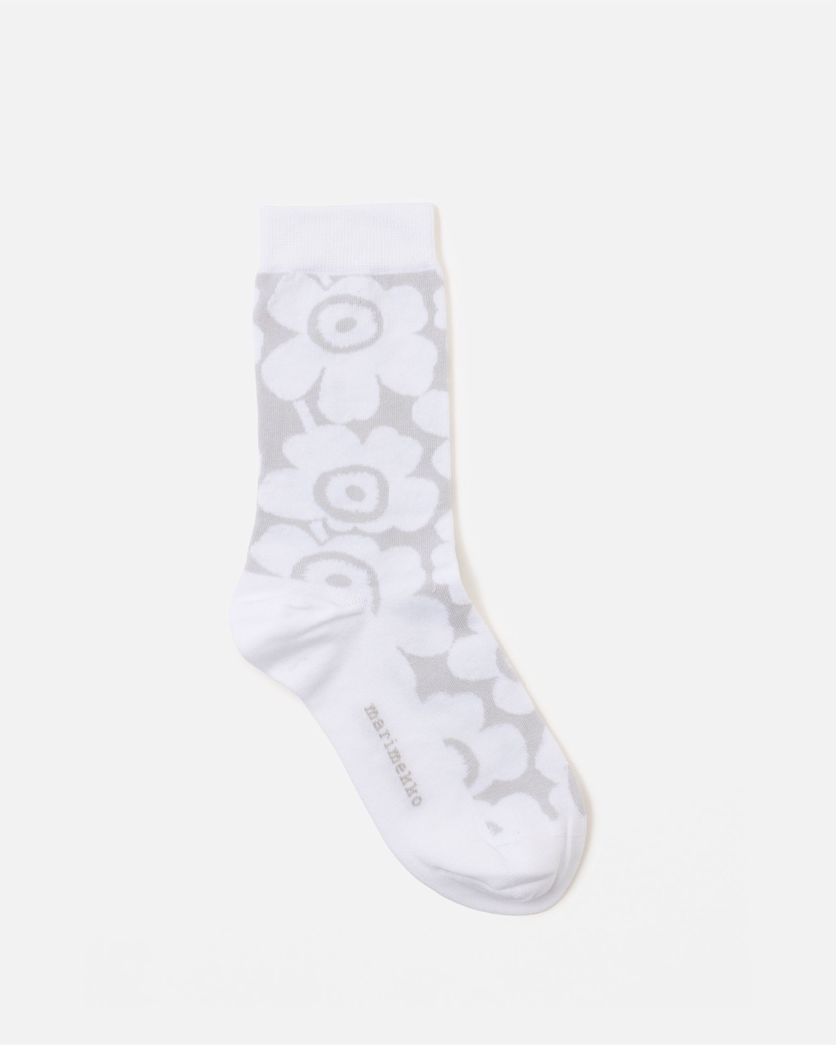 Marimekkoを代表するUnikko柄のミディ丈ソックス。大きめのフラワーモチーフが華やかなデザイン。履き口はリブ仕様で、ずれ落ちにくくメリハリのあるシルエット。Marimekkoらしいカラーバランスのスタイリッシュな配色も魅力。いつものコーディネートにアクセントを与えてくれるアイテムです。