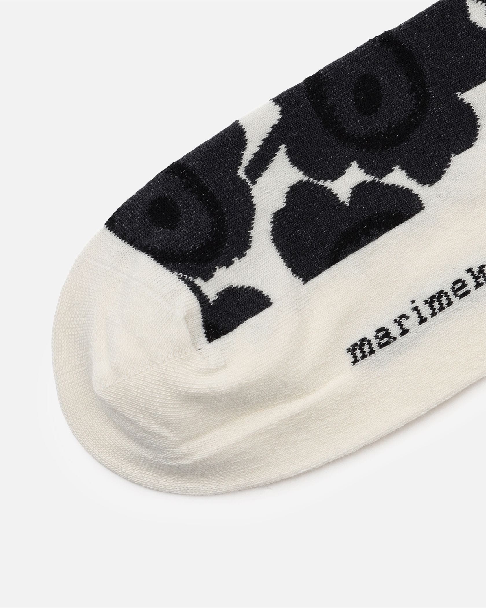 Marimekkoを代表するUnikko柄のミディ丈ソックス。大きめのフラワーモチーフが華やかなデザイン。履き口はリブ仕様で、ずれ落ちにくくメリハリのあるシルエット。Marimekkoらしいカラーバランスのスタイリッシュな配色も魅力。いつものコーディネートにアクセントを与えてくれるアイテムです。