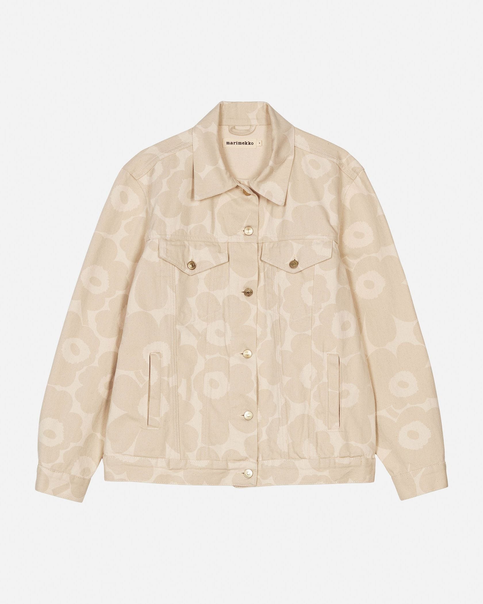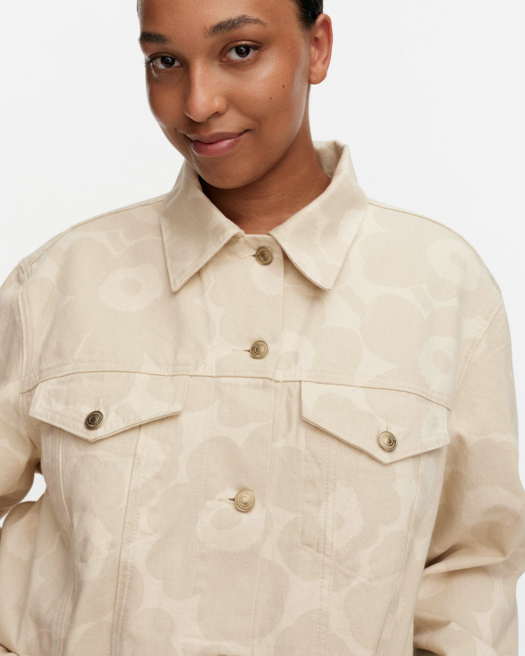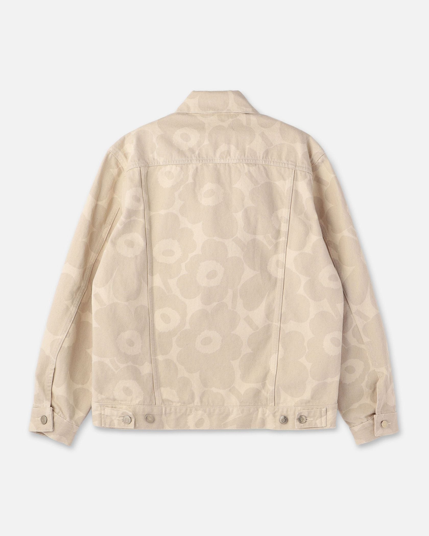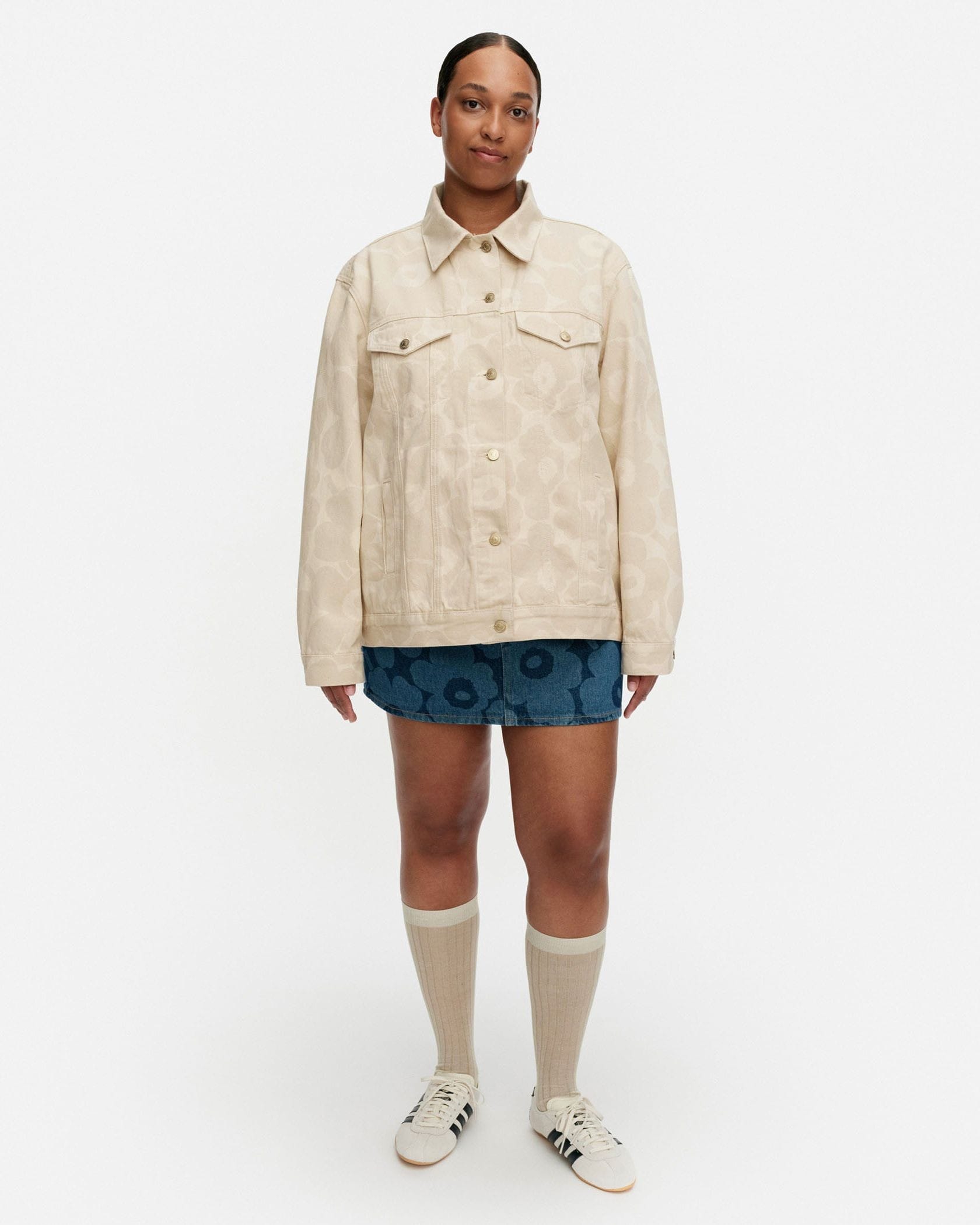着るたびに心華やぐ、Unikko柄のデニムジャケット。メンズライクなイメージのデニムジャケットも、ぐっと新鮮なムードにきまるのがうれしい。明るいベージュカラーが顔まわりをトーンアップしてくれるのもポイントです。