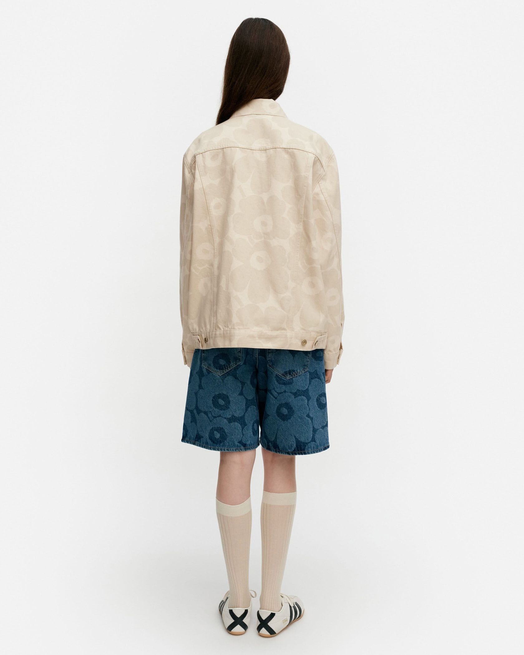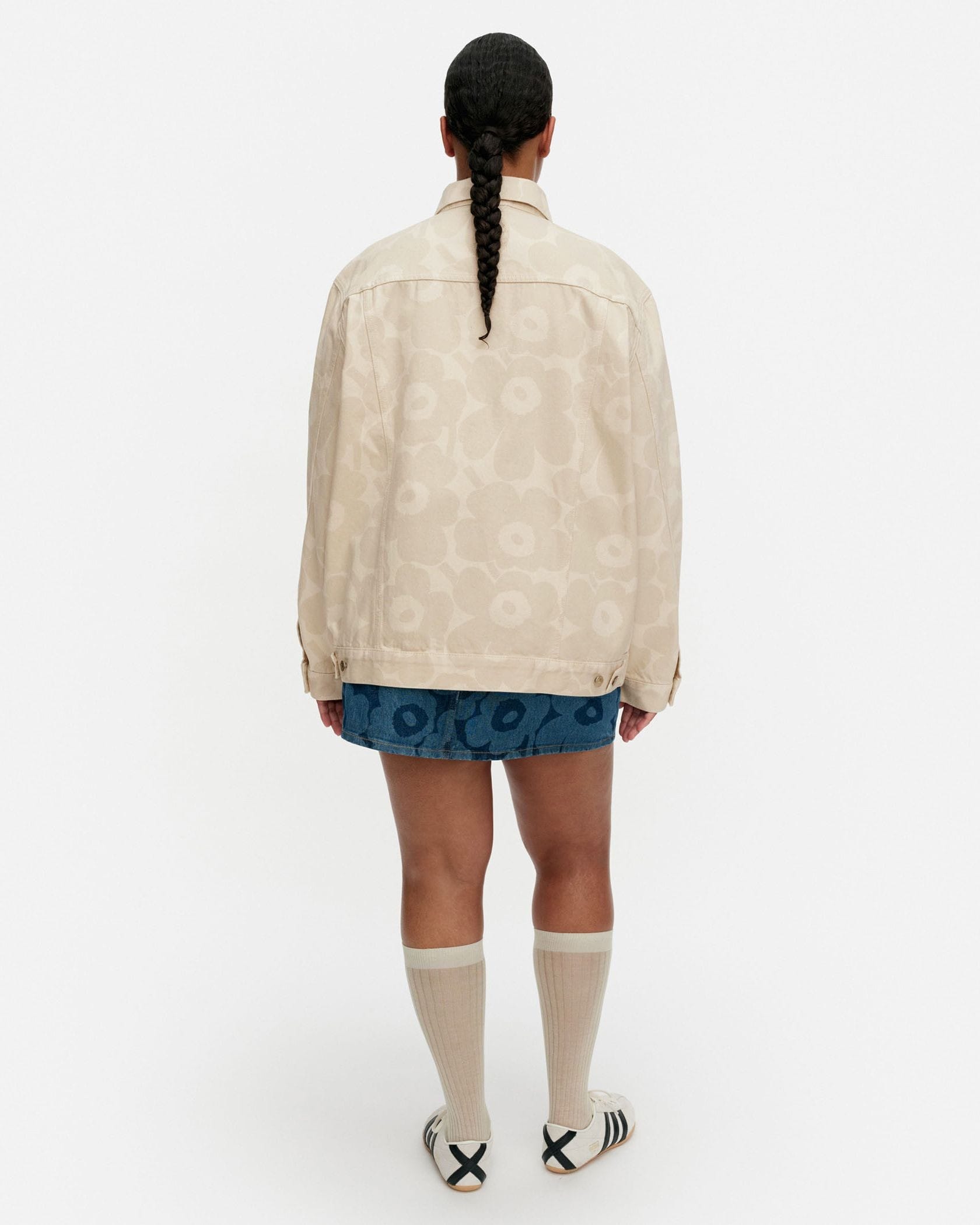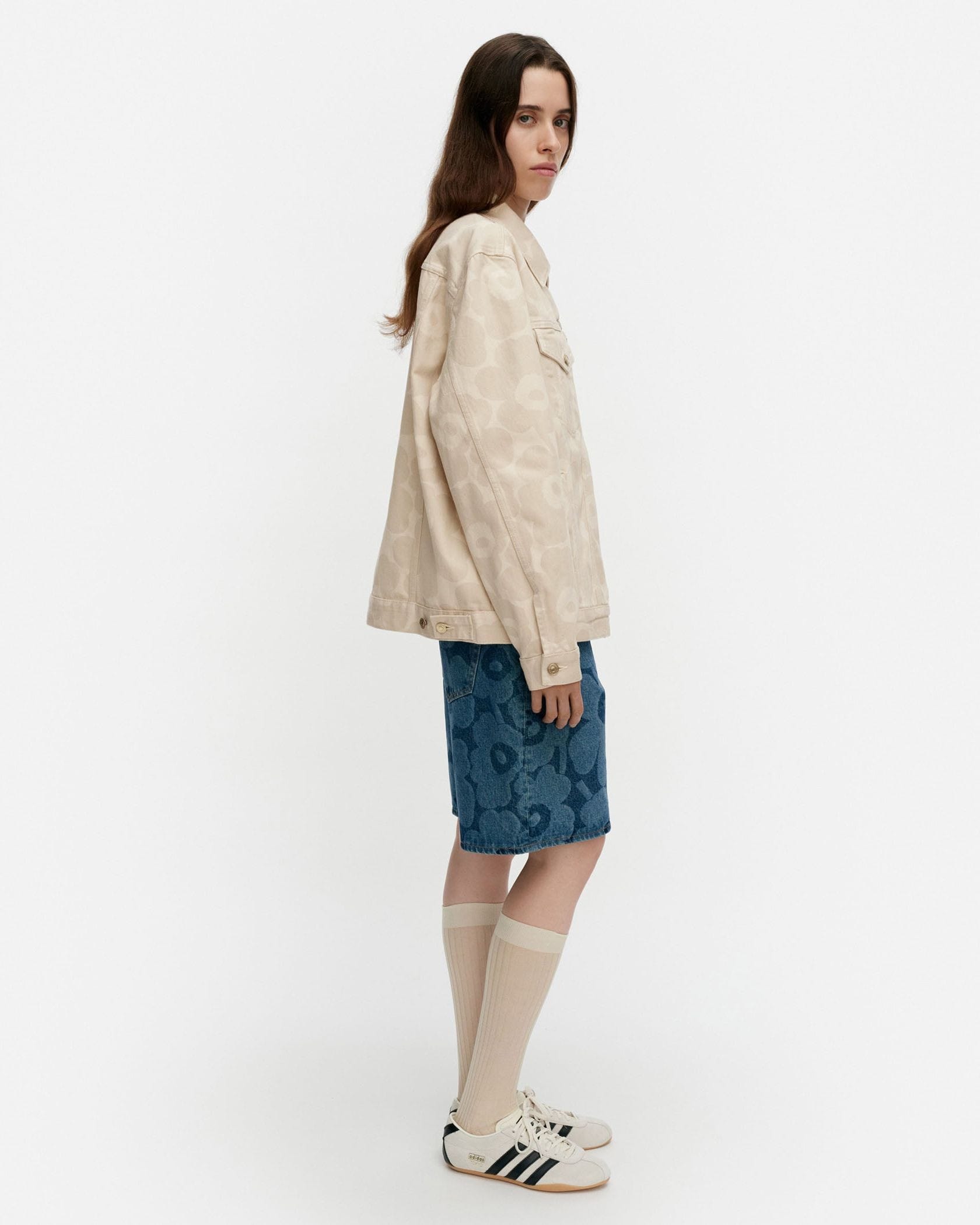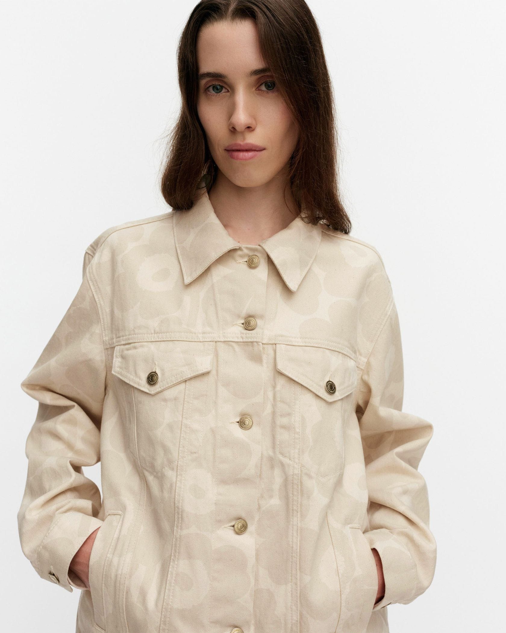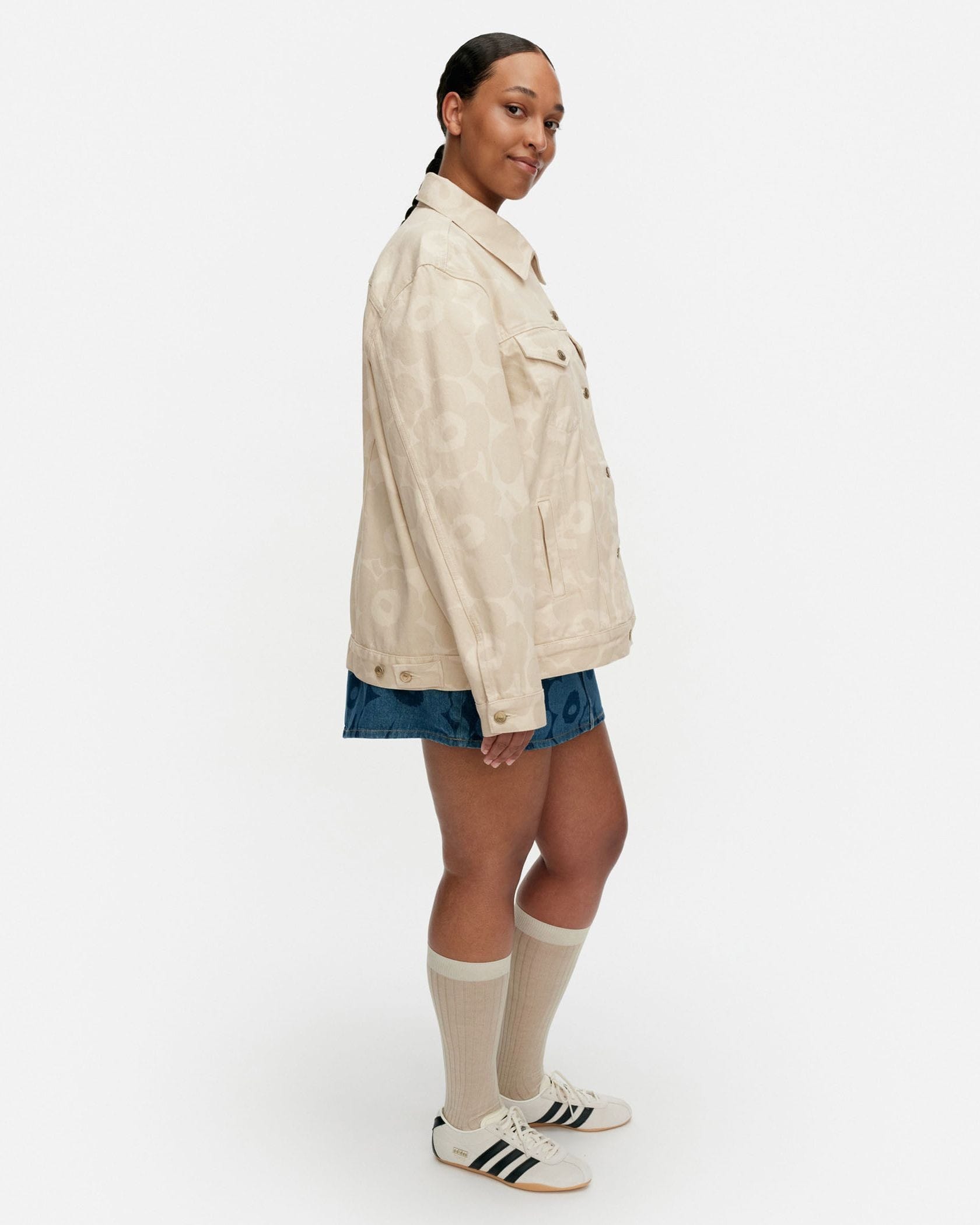 着るたびに心華やぐ、Unikko柄のデニムジャケット。メンズライクなイメージのデニムジャケットも、ぐっと新鮮なムードにきまるのがうれしい。明るいベージュカラーが顔まわりをトーンアップしてくれるのもポイントです。