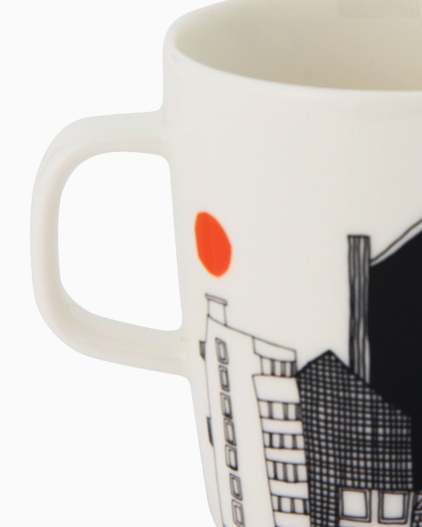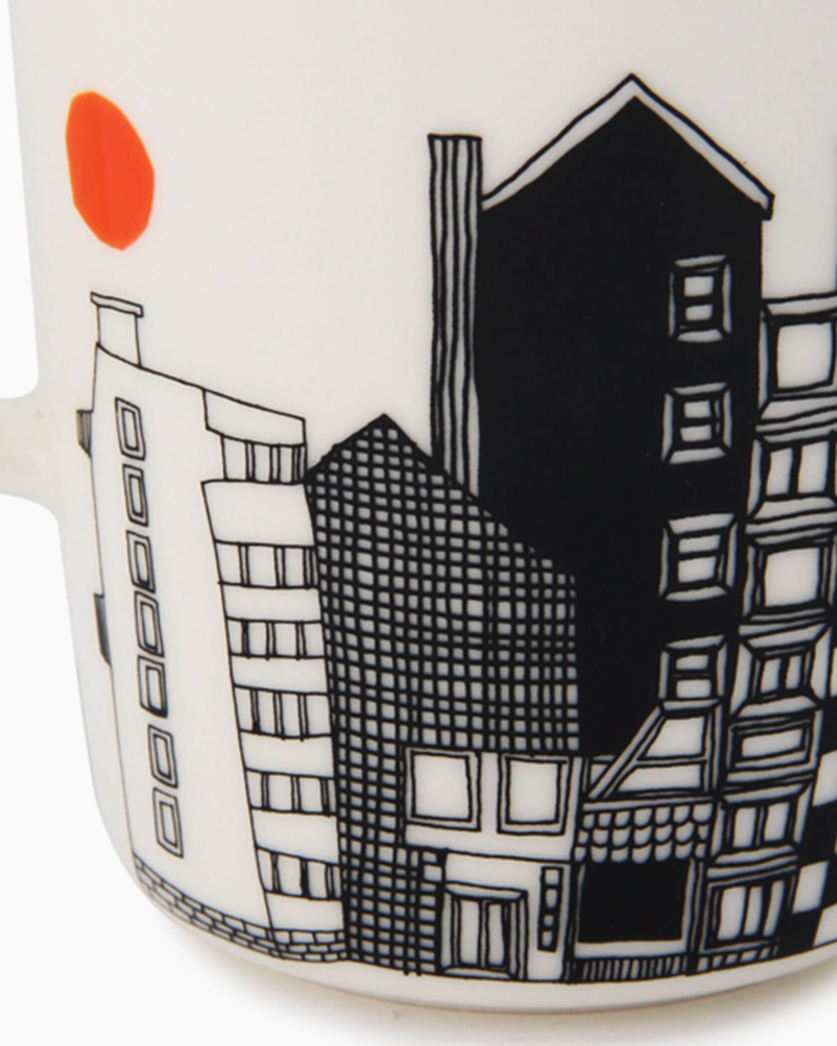 Sami Ruotsalainenによるテーブルウェア、Oivaシリーズのマグカップ。手書き風の町並みのイラストが見るだけで心温まる、Siirtolapuutarhaのプリントが全面に施されています。手のひらサイズに広がるどこかノスタルジックな風景は、ティータイムが楽しみになりそうです。